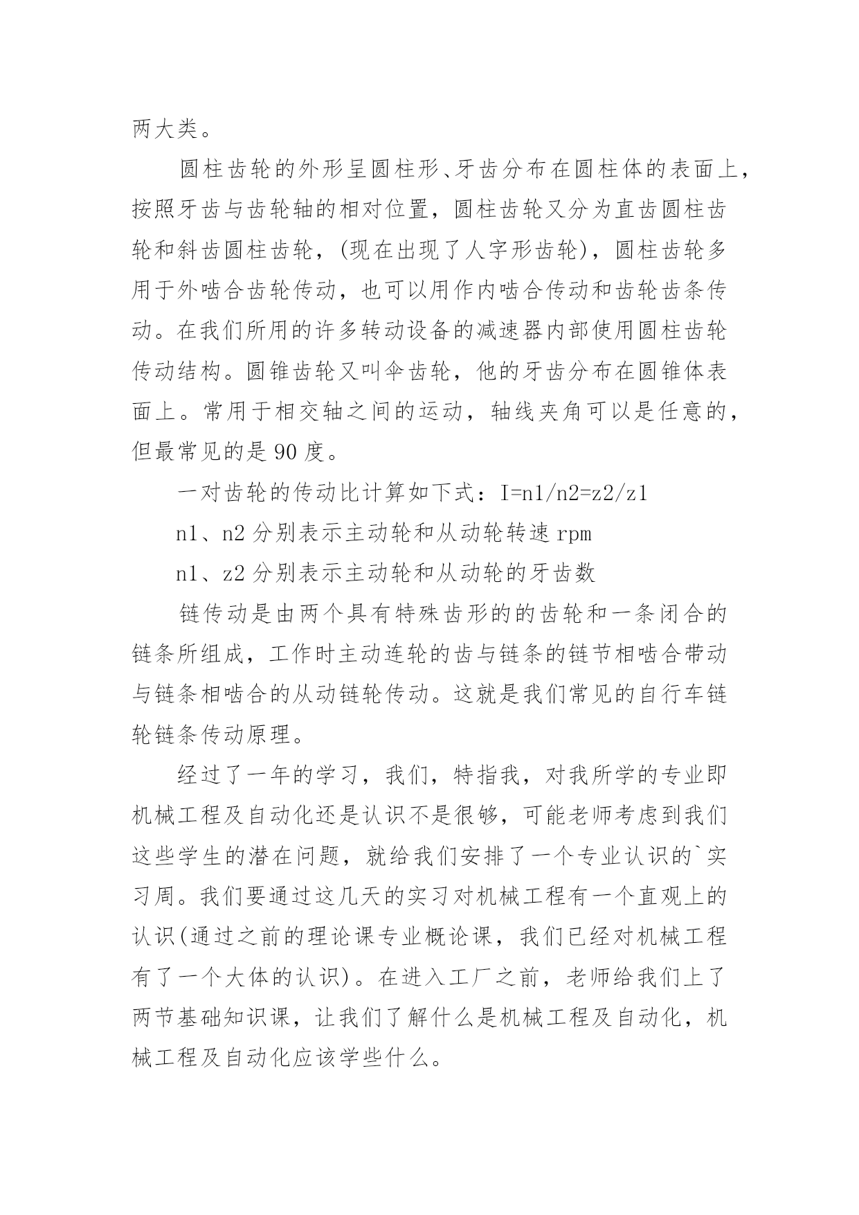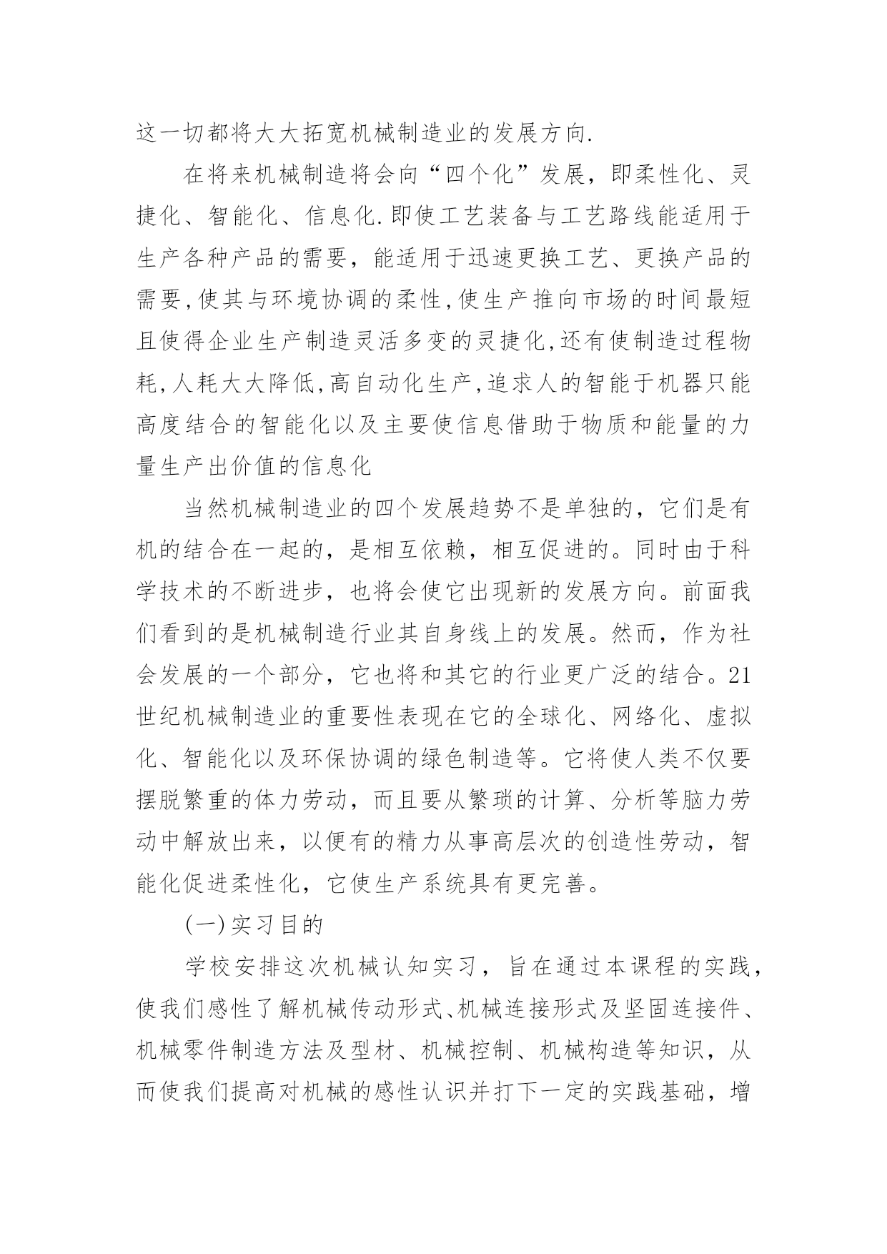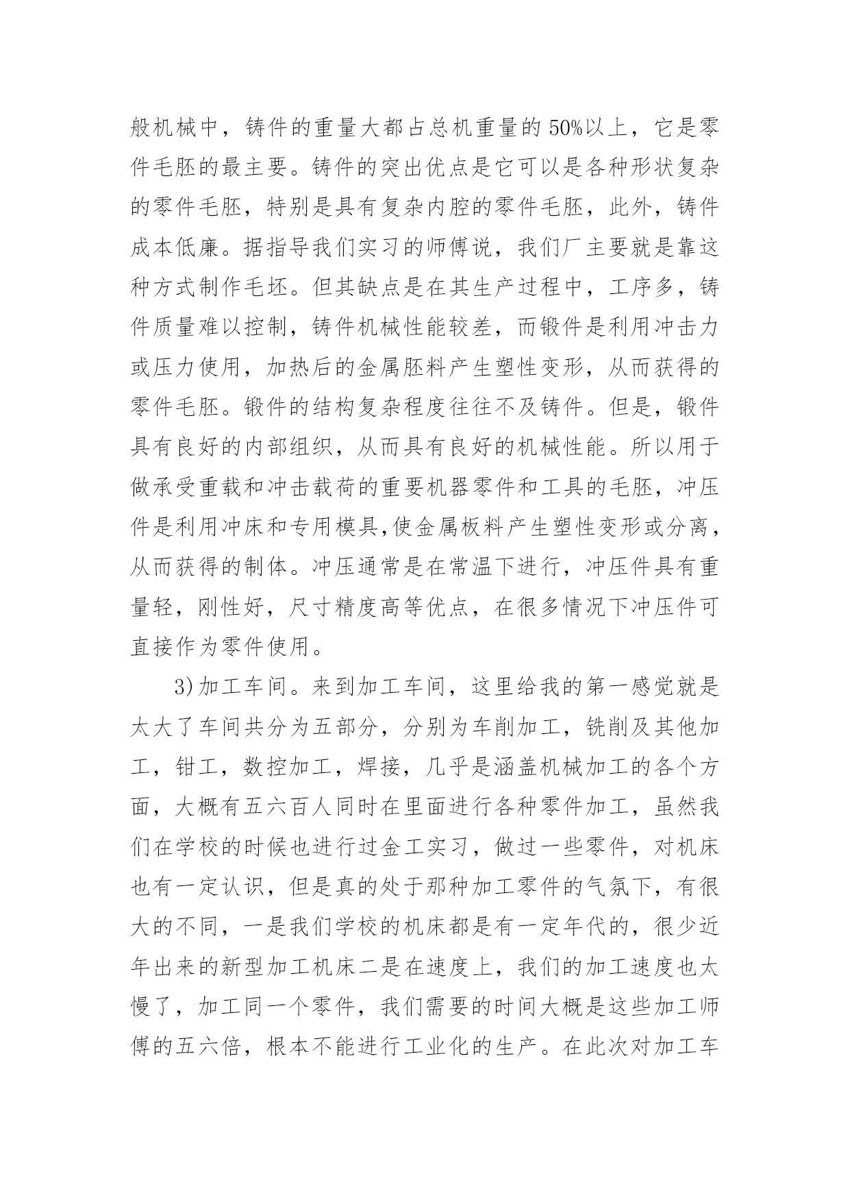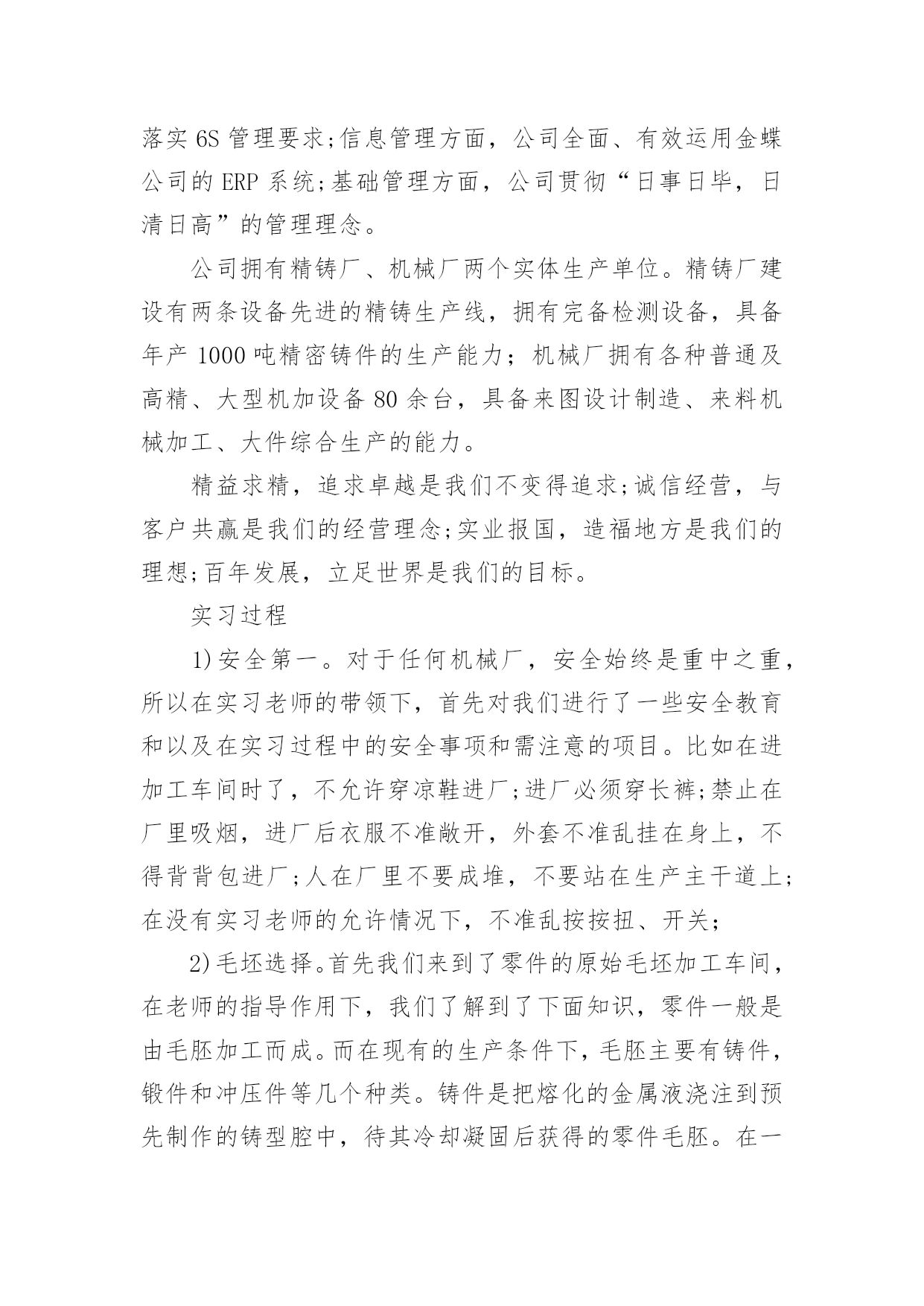 机械认识实习报告机械认识实习报告集锦15篇随着个人素质的提升,报告与我们的生活紧密相连,我们在写报告的时候要注意涵盖报告的基本要素。我敢肯定,大部分人都对写报告很是头疼的,以下是小编整理的机械认识实习报告,仅供参考,大家一起来看看吧。机械认识实习报告1实习目的将所学的理论知识与实践结合起来,培养勇于探索的创新精神、提高动手能力,加强社会活动能力,严肃认真的学习态度,为以后专业实习和走上工作岗位打下坚实的基础。单位简介X市XX机械制造有限公司,是一家集熔模精密铸造和数控机械加工为一体的股份制企业。公司创建于1988年,位于XX市XXXX工业区,占地面积15000平方米,建筑面积8500平方米,固定资产5000余万元,拥有各种中高级技术、管理人员260余人。目前,公司已具备模具设计制造、熔模精密铸造、产品高精加工等生产能力。公司始终贯彻“科技创新,诚信为本,顾客至尊,追求卓越”的管理理念,建立起了完善、科学的管理体系。质量管理方面,公司严格贯彻执行ISO9001:20xx体系;生产管理方面,公司全面推行Lean的管理思想并坚定不移的有效落实6S管理要求;信息管理方面,公司全面、有效运用金蝶公司的ERP系统;基础管理方面,公司贯彻“日事日毕,日清日高”的管理理念。公司拥有精铸厂、机械厂两个实体生产单位。精铸厂建设有两条设备先进的精铸生产线,拥有完备检测设备,具备年产1000吨精密铸件的生产能力;机械厂拥有各种普通及高精、大型机加设备80余台,具备来图设计制造、来料机械加工、大件综合生产的能力。精益求精,追求卓越是我们不变得追求;诚信经营,与客户共赢是我们的经营理念;实业报国,造福地方是我们的理想;百年发展,立足世界是我们的目标。实习过程1)安全第一。对于任何机械厂,安全始终是重中之重,所以在实习老师的带领下,首先对我们进行了一些安全教育和以及在实习过程中的安全事项和需注意的项目。比如在进加工车间时了,不允许穿凉鞋进厂;进厂必须穿长裤;禁止在厂里吸烟,进厂后衣服不准敞开,外套不准乱挂在身上,不得背背包进厂;人在厂里不要成堆,不要站在生产主干道上;在没有实习老师的允许情况下,不准乱按按扭、开关;2)毛坯选择。首先我们来到了零件的原始毛坯加工车间,在老师的指导作用下,我们了解到了下面知识,零件一般是由毛胚加工而成。而在现有的生产条件下,毛胚主要有铸件,锻件和冲压件等几个种类。铸件是把熔化的金属液浇注到预先制作的铸型腔中,待其冷却凝固后获得的零件毛胚。在一般机械中,铸件的重量大都占总机重量的50%以上,它是零件毛胚的最主要。铸件的突出优点是它可以是各种形状复杂的零件毛胚,特别是具有复杂内腔的零件毛胚,此外,铸件成本低廉。据指导我们实习的师傅说,我们厂主要就是靠这种方式制作毛坯。但其缺点是在其生产过程中,工序多,铸件质量难以控制,铸件机械性能较差,而锻件是利用冲击力或压力使用,加热后的金属胚料产生塑性变形,从而获得的零件毛胚。锻件的结构复杂程度往往不及铸件。但是,锻件具有良好的内部组织,从而具有良好的机械性能。所以用于做承受重载和冲击载荷的重要机器零件和工具的毛胚,冲压件是利用冲床和专用模具,使金属板料产生塑性变形或分离,从而获得的制体。冲压通常是在常温下进行,冲压件具有重量轻,刚性好,尺寸精度高等优点,在很多情况下冲压件可直接作为零件使用。3)加工车间。来到加工车间,这里给我的第一感觉就是太大了车间共分为五部分,分别为车削加工,铣削及其他加工,钳工,数控加工,焊接,几乎是涵盖机械加工的各个方面,大概有五六百人同时在里面进行各种零件加工,虽然我们在学校的时候也进行过金工实习,做过一些零件,对机床也有一定认识,但是真的处于那种加工零件的气氛下,有很大的不同,一是我们学校的机床都是有一定年代的,很少近年出来的新型加工机床二是在速度上,我们的加工速度也太慢了,加工同一个零件,我们需要的时间大概是这些加工师傅的五六倍,根本不能进行工业化的生产。在此次对加工车间的认识过程中,我更加明白了机械加工一些流程;胚料-划线-刨床(工艺上留加工余量)粗车热处理,调质车床半精加工磨齿轮加工淬火(齿面)磨面;齿轮零件加工工艺:粗车热处理精车磨内孔磨芯,轴端面磨另一端面滚齿钳齿剃齿铡键槽钳工完工。4)装配车间。任何机器都是有一个又一个零件装配而来,在装配车间,这里大概有接近一百多人在进行零件的收集和装配,以及包装,再发送至储货厂,在这个车间,工人师傅首先将起所收集的零件进行飞类,一便于进行组装,确定装配方法,装配顺序,所需工具;再进行清洗零件,去除油污,锈蚀,涂油,确保机器组装以后,表面整洁美观。在产品装配完成以后,还要对零件各方面进行调试,检查运动件的灵活性,密封性等性能,再转箱入库。5)质保,销售和售后处理最后,我们来到质检部门,他们主要是对所生产出来的产品进