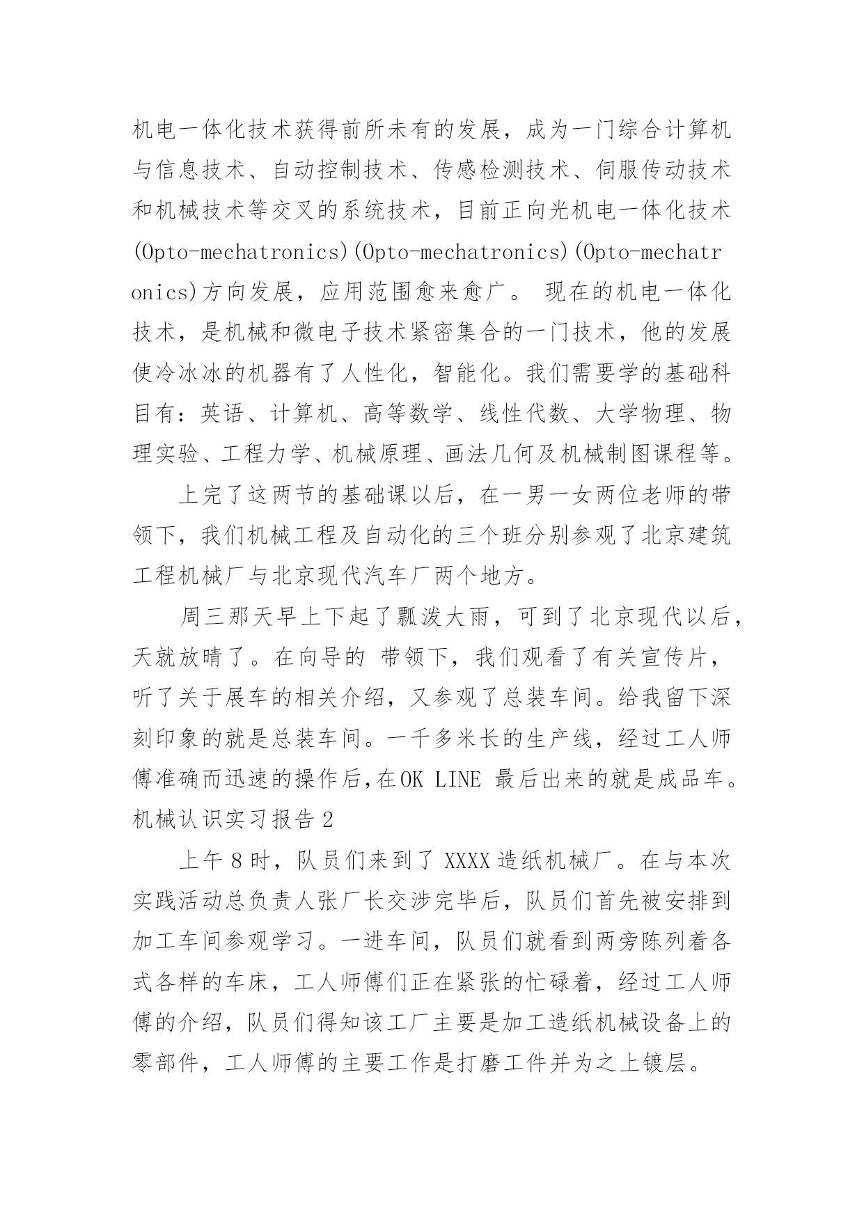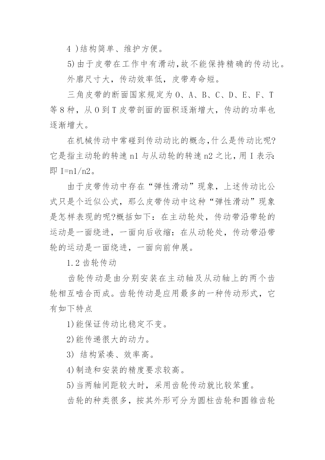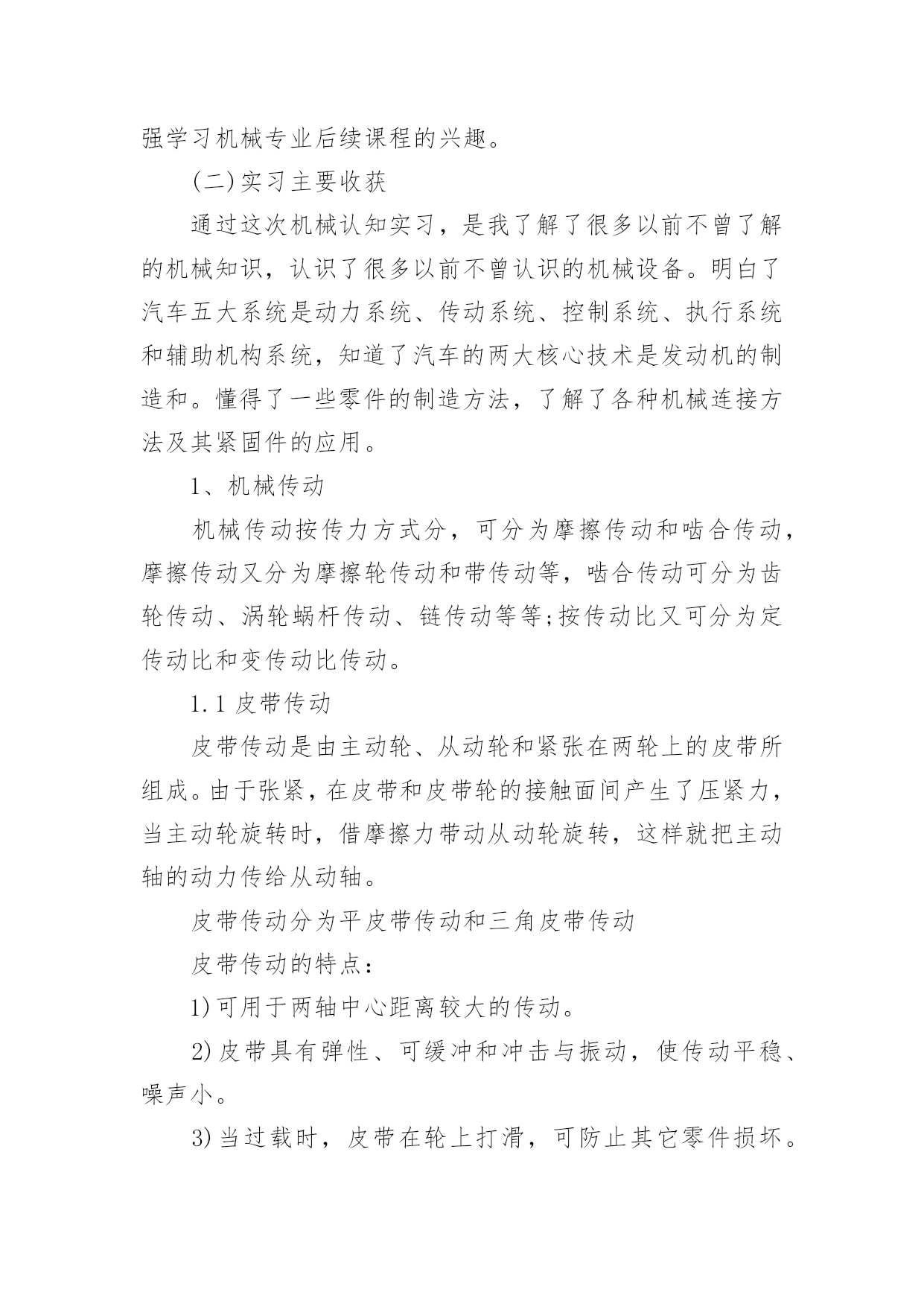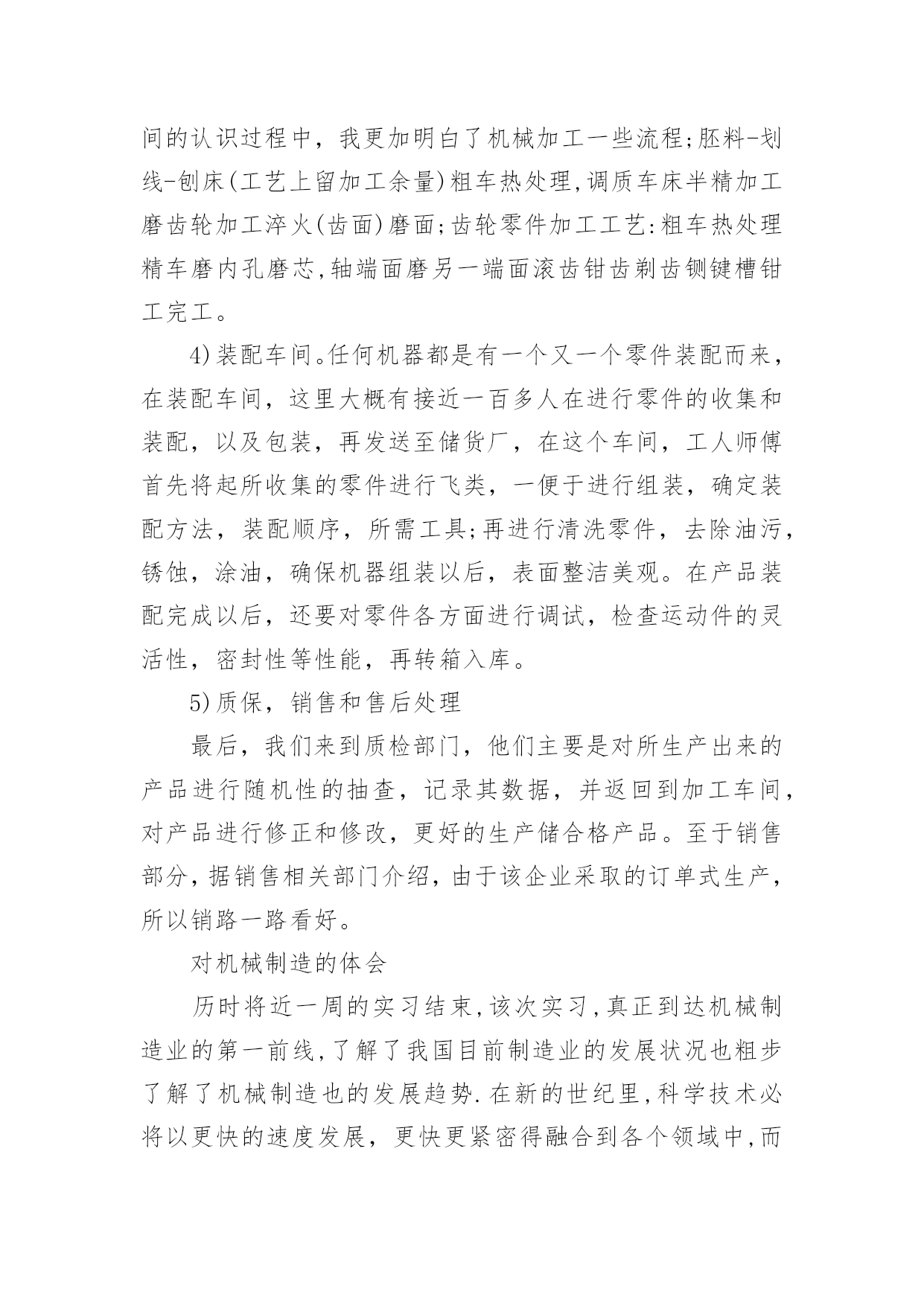 机械认识实习报告机械认识实习报告集锦15篇随着个人素质的提升,报告与我们的生活紧密相连,我们在写报告的时候要注意涵盖报告的基本要素。我敢肯定,大部分人都对写报告很是头疼的,以下是小编整理的机械认识实习报告,仅供参考,大家一起来看看吧。机械认识实习报告1实习目的将所学的理论知识与实践结合起来,培养勇于探索的创新精神、提高动手能力,加强社会活动能力,严肃认真的学习态度,为以后专业实习和走上工作岗位打下坚实的基础。单位简介X市XX机械制造有限公司,是一家集熔模精密铸造和数控机械加工为一体的股份制企业。公司创建于1988年,位于XX市XXXX工业区,占地面积15000平方米,建筑面积8500平方米,固定资产5000余万元,拥有各种中高级技术、管理人员260余人。目前,公司已具备模具设计制造、熔模精密铸造、产品高精加工等生产能力。公司始终贯彻“科技创新,诚信为本,顾客至尊,追求卓越”的管理理念,建立起了完善、科学的管理体系。质量管理方面,公司严格贯彻执行ISO9001:20xx体系;生产管理方面,公司全面推行Lean的管理思想并坚定不移的有效落实6S管理要求;信息管理方面,公司全面、有效运用金蝶公司的ERP系统;基础管理方面,公司贯彻“日事日毕,日清日高”的管理理念。公司拥有精铸厂、机械厂两个实体生产单位。精铸厂建设有两条设备先进的精铸生产线,拥有完备检测设备,具备年产1000吨精密铸件的生产能力;机械厂拥有各种普通及高精、大型机加设备80余台,具备来图设计制造、来料机械加工、大件综合生产的能力。精益求精,追求卓越是我们不变得追求;诚信经营,与客户共赢是我们的经营理念;实业报国,造福地方是我们的理想;百年发展,立足世界是我们的目标。实习过程1)安全第一。对于任何机械厂,安全始终是重中之重,所以在实习老师的带领下,首先对我们进行了一些安全教育和以及在实习过程中的安全事项和需注意的项目。比如在进加工车间时了,不允许穿凉鞋进厂;进厂必须穿长裤;禁止在厂里吸烟,进厂后衣服不准敞开,外套不准乱挂在身上,不得背背包进厂;人在厂里不要成堆,不要站在生产主干道上;在没有实习老师的允许情况下,不准乱按按扭、开关;2)毛坯选择。首先我们来到了零件的原始毛坯加工车间,在老师的指导作用下,我们了解到了下面知识,零件一般是由毛胚加工而成。而在现有的生产条件下,毛胚主要有铸件,锻件和冲压件等几个种类。铸件是把熔化的金属液浇注到预先制作的铸型腔中,待其冷却凝固后获得的零件毛胚。在一般机械中,铸件的重量大都占总机重量的50%以上,它是零件毛胚的最主要。铸件的突出优点是它可以是各种形状复杂的零件毛胚,特别是具有复杂内腔的零件毛胚,此外,铸件成本低廉。据指导我们实习的师傅说,我们厂主要就是靠这种方式制作毛坯。但其缺点是在其生产过程中,工序多,铸件质量难以控制,铸件机械性能较差,而锻件是利用冲击力或压力使用,加热后的金属胚料产生塑性变形,从而获得的零件毛胚。锻件的结构复杂程度往往不及铸件。但是,锻件具有良好的内部组织,从而具有良好的机械性能。所以用于做承受重载和冲击载荷的重要机器零件和工具的毛胚,冲压件是利用冲床和专用模具,使金属板料产生塑性变形或分离,从而获得的制体。冲压通常是在常温下进行,冲压件具有重量轻,刚性好,尺寸精度高等优点,在很多情况下冲压件可直接作为零件使用。3)加工车间。来到加工车间,这里给我的第一感觉就是太大了车间共分为五部分,分别为车削加工,铣削及其他加工,钳工,数控加工,焊接,几乎是涵盖机械加工的各个方面,大概有五六百人同时在里面进行各种零件加工,虽然我们在学校的时候也进行过金工实习,做过一些零件,对机床也有一定认识,但是真的处于那种加工零件的气氛下,有很大的不同,一是我们学校的机床都是有一定年代的,很少近年出来的新型加工机床二是在速度上,我们的加工速度也太慢了,加工同一个零件,我们需要的时间大概是这些加工师傅的五六倍,根本不能进行工业化的生产。在此次对加工车间的认识过程中,我更加明白了机械加工一些流程;胚料-划线-刨床(工艺上留加工余量)粗车热处理,调质车床半精加工磨齿轮加工淬火(齿面)磨面;齿轮零件加工工艺:粗车热处理精车磨内孔磨芯,轴端面磨另一端面滚齿钳齿剃齿铡键槽钳工完工。4)装配车间。任何机器都是有一个又一个零件装配而来,在装配车间,这里大概有接近一百多人在进行零件的收集和装配,以及包装,再发送至储货厂,在这个车间,工人师傅首先将起所收集的零件进行飞类,一便于进行组装,确定装配方法,装配顺序,所需工具;再进行清洗零件,去除油污,锈蚀,涂油,确保机器组装以后,表面整洁美观。在产品装配完成以后,还要对零件各方面进行调试,检查运动件的灵活性,密封性等性能,再转箱入库。5)质保,销售和售后处理最后,我们来到质检部门,他们主要是对所生产出来的产品进