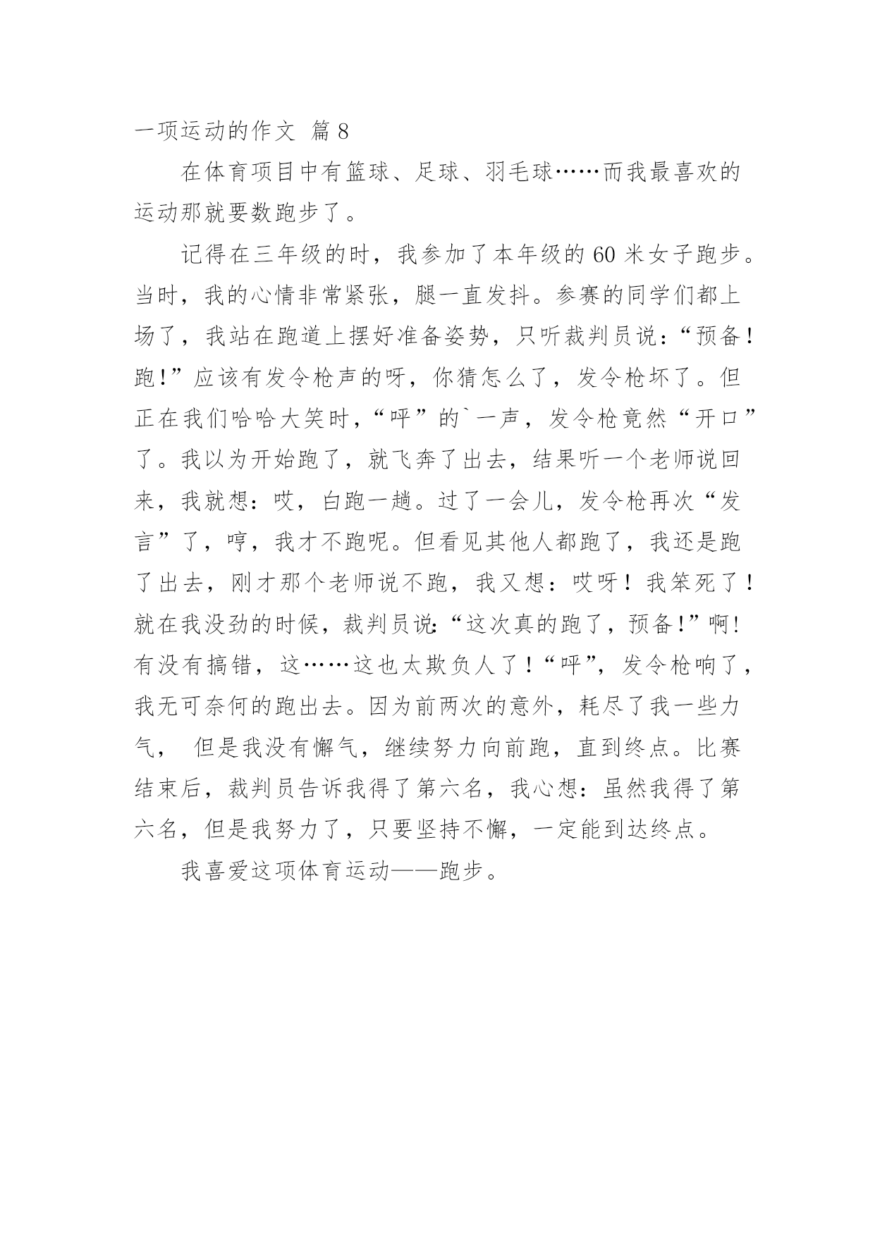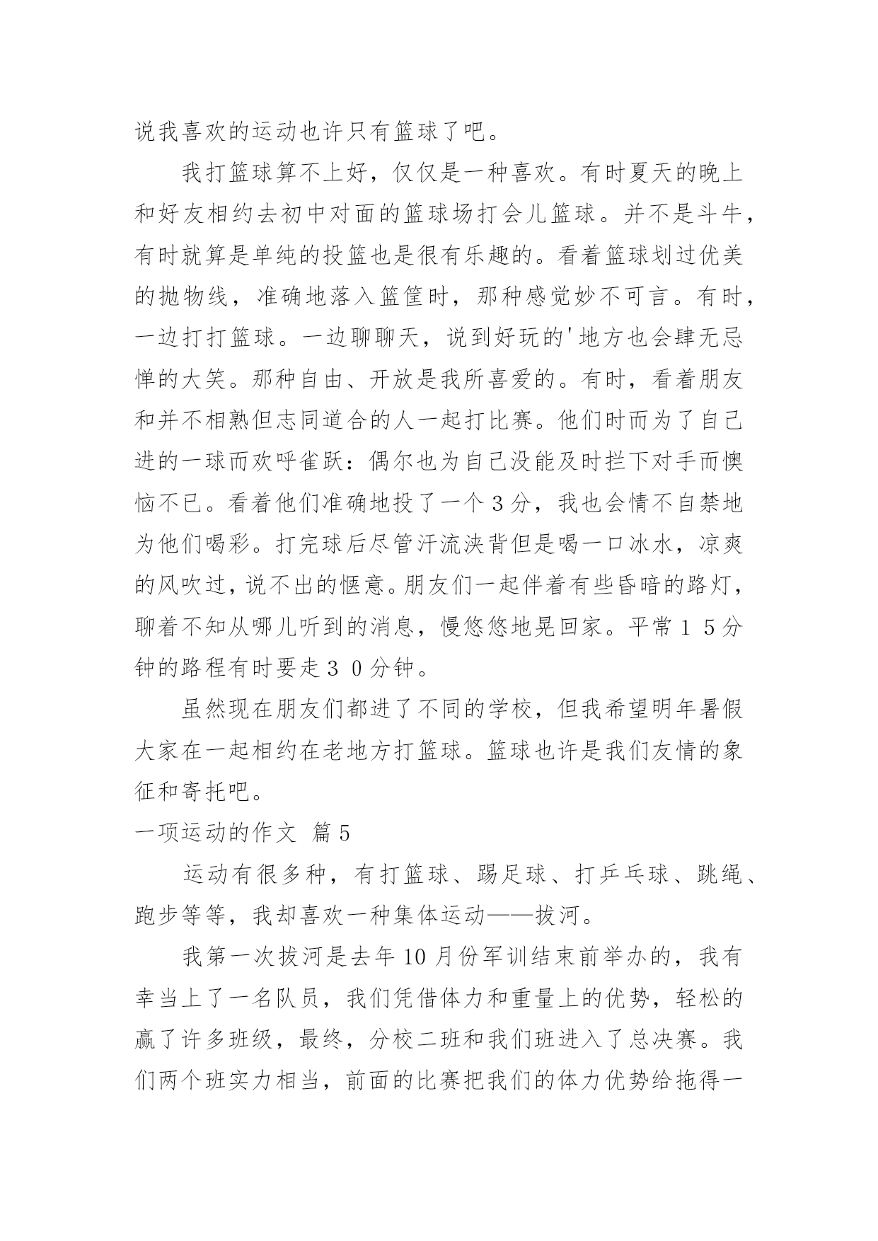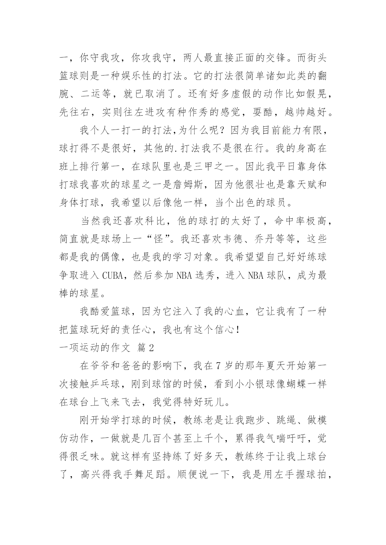 一项运动的作文关于一项运动的作文八篇在平平淡淡的日常中,大家都写过作文吧,借助作文人们可以实现文化交流的目的。那么,怎么去写作文呢?以下是小编为大家整理的一项运动的作文8篇,欢迎阅读与收藏。一项运动的作文篇1篮球是在我们班最吃香的一项运动。因为男生女生都爱这项运动,我们的体育课简直成了NBA的赛场,各路女生,各路男生,都八仙过海——各显神通。青春的活力与动感,我已经先在篮球场上体会了,我从小就喜欢篮球,对篮球有很深的迷恋之情,节奏活泼而欢快,紧张却又刺激,让你很快就能全情投入,初中的青春生涯,谁与争锋?这就是我最喜欢的一项体育运动——篮球。在我日常娱乐生活中,篮球起了及其重要的作用,也有多种打法,一般而言,我们将之分为三种:五打五;三对三;单挑。五打五,意味着有两支队伍,每支队伍均有五人,中锋、大前锋、小前锋、得分后卫、控球后卫。中锋的职责是抢板、传球;前锋负责外线、上篮;得分后卫则主控投篮;控球后卫是左右变相,起组织功能。NBA正式的比赛都是采用这种打法。其余两种是五打五的简化版,三对三,则两队须有中锋、前锋、后卫,打球原则与五打五相同。而单挑,即一对一,你守我攻,你攻我守,两人最直接正面的交锋。而街头篮球则是一种娱乐性的打法。它的打法很简单诸如此类的翻腕、二运等,就已取消了。还有好多虚假的动作比如假晃,先往右,实则往左进攻有种作秀的感觉,耍酷,越帅越好。我个人一打一的打法,为什么呢?因为我目前能力有限,球打得不是很好,其他的.打法我不是很在行。我的身高在班上排行第一,在球队里也是三甲之一。因此我平日靠身体打球我喜欢的球星之一是詹姆斯,因为他很壮也是靠天赋和身体打球,我希望以后像他一样,当个出色的球员。当然我还喜欢科比,他的球打的太好了,命中率极高,简直就是球场上一“怪”。我还喜欢韦德、乔丹等等,这些都是我的偶像,也是我的学习对象。我希望望自己好好练球争取进入CUBA,然后参加NBA选秀,进入NBA球队,成为最棒的球星。我酷爱篮球,因为它注入了我的心血,它让我有了一种把篮球玩好的责任心,我也有这个信心!一项运动的作文篇2在爷爷和爸爸的影响下,我在7岁的那年夏天开始第一次接触乒乓球,刚到球馆的时候,看到小小银球像蝴蝶一样在球台上飞来飞去,我觉得特好玩儿。刚开始学打球的时候,教练老是让我跑步、跳绳、做模仿动作,一做就是几百个甚至上千个,累得我气喘吁吁,觉得很乏味。就这样有坚持练了好多天,教练终于让我上球台了,高兴得我手舞足蹈。顺便说一下,我是用左手握球拍,因为我从小就是左撇子。刚开始的时候,教练先让我打多球,小小银球好像故意捣乱似的,就不按我的目标打,我很着急,心里想:“原来打球是那么不容易呀!”教练仿佛看穿了我的心思,和蔼可亲的对我说:“打球不能着急,要一步一步来,练好基本功,比赛时才能取得好成绩。”我按着教练教我的`动作要领,刻苦训练,每天练得汗流夹背。就这样经过一年多的刻苦训练,在今年暑假,我参加了第六届山东省少年儿童“鲁盛杯”乒乓球比赛。在比赛中,我汲取经验,取长补短,打出了比较理想的成绩。经过连年的刻苦训练,我喜欢上了打乒乓球,它给我带来了很多快乐,我一定要再接再厉,争取更好的成绩!一项运动的作文篇3在很多体育活动中,我最喜欢的是跳绳。跳绳有很多种跳法,有反跳、跳着走、跳花绳、还有单脚跳,等等。但我只能反跳、跳着走、单脚跳、别的`我不会。记得有一次,我放学回家时,看见妈妈和阿姨们在跳绳,我也跑到家里拿了一根跳绳,跑到院子里跳了起来大约过去了二分钟,我竟然跳了300多下,妈妈和阿姨们为我鼓起了掌,我心里比喝了蜜还要甜。啊,我爱这项体育活动——跳绳!一项运动的作文篇4要说最喜欢的体育活动,也许真的没什么。我天生并不喜欢跑步、羽毛球等等。上体育课也是有些反感。若是真要说我喜欢的运动也许只有篮球了吧。我打篮球算不上好,仅仅是一种喜欢。有时夏天的晚上和好友相约去初中对面的篮球场打会儿篮球。并不是斗牛,有时就算是单纯的投篮也是很有乐趣的。看着篮球划过优美的抛物线,准确地落入篮筐时,那种感觉妙不可言。有时,一边打打篮球。一边聊聊天,说到好玩的'地方也会肆无忌惮的大笑。那种自由、开放是我所喜爱的。有时,看着朋友和并不相熟但志同道合的人一起打比赛。他们时而为了自己进的一球而欢呼雀跃:偶尔也为自己没能及时拦下对手而懊恼不已。看着他们准确地投了一个3分,我也会情不自禁地为他们喝彩。打完球后尽管汗流浃背但是喝一口冰水,凉爽的风吹过,说不出的惬意。朋友们一起伴着有些昏暗的路灯,聊着不知从哪儿听到的消息,慢悠悠地晃回家。平常15分钟的路程有时要走30分钟。虽然现在朋友们都进了不同的学校,但我希望明年暑假大家在一起相约在老地方打篮球。篮球也许是我们友情的象征和寄托吧。一项运动的作文篇5运动有很多种,有打篮球、踢足球、打乒乓球、跳绳、跑步等等,我