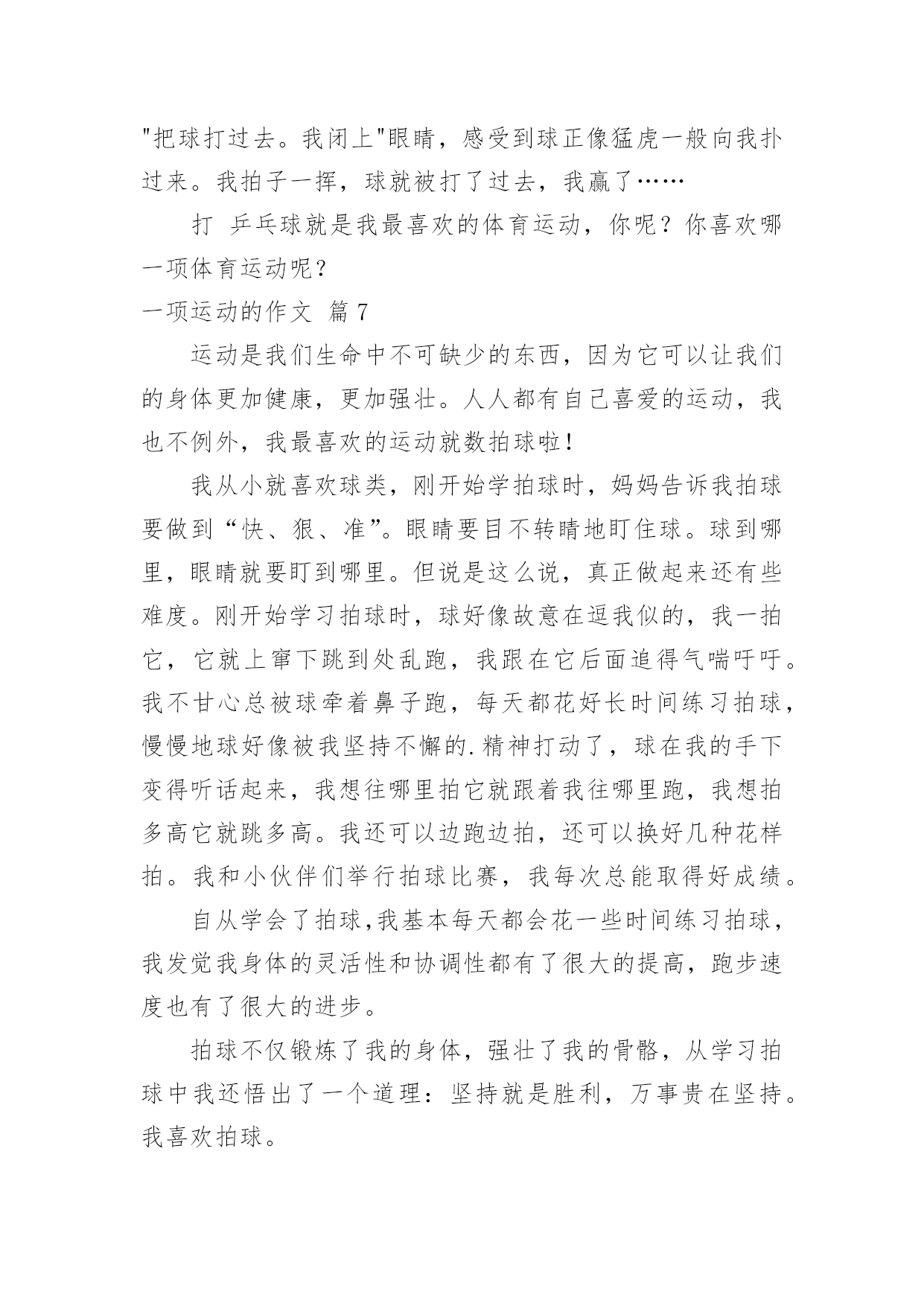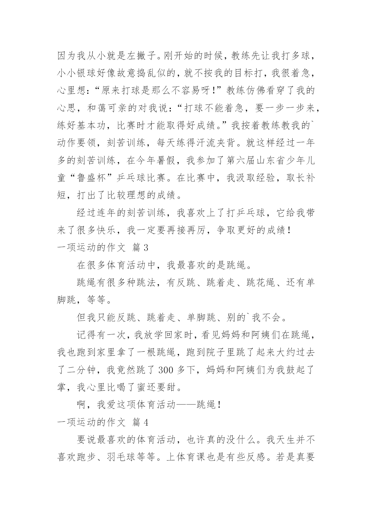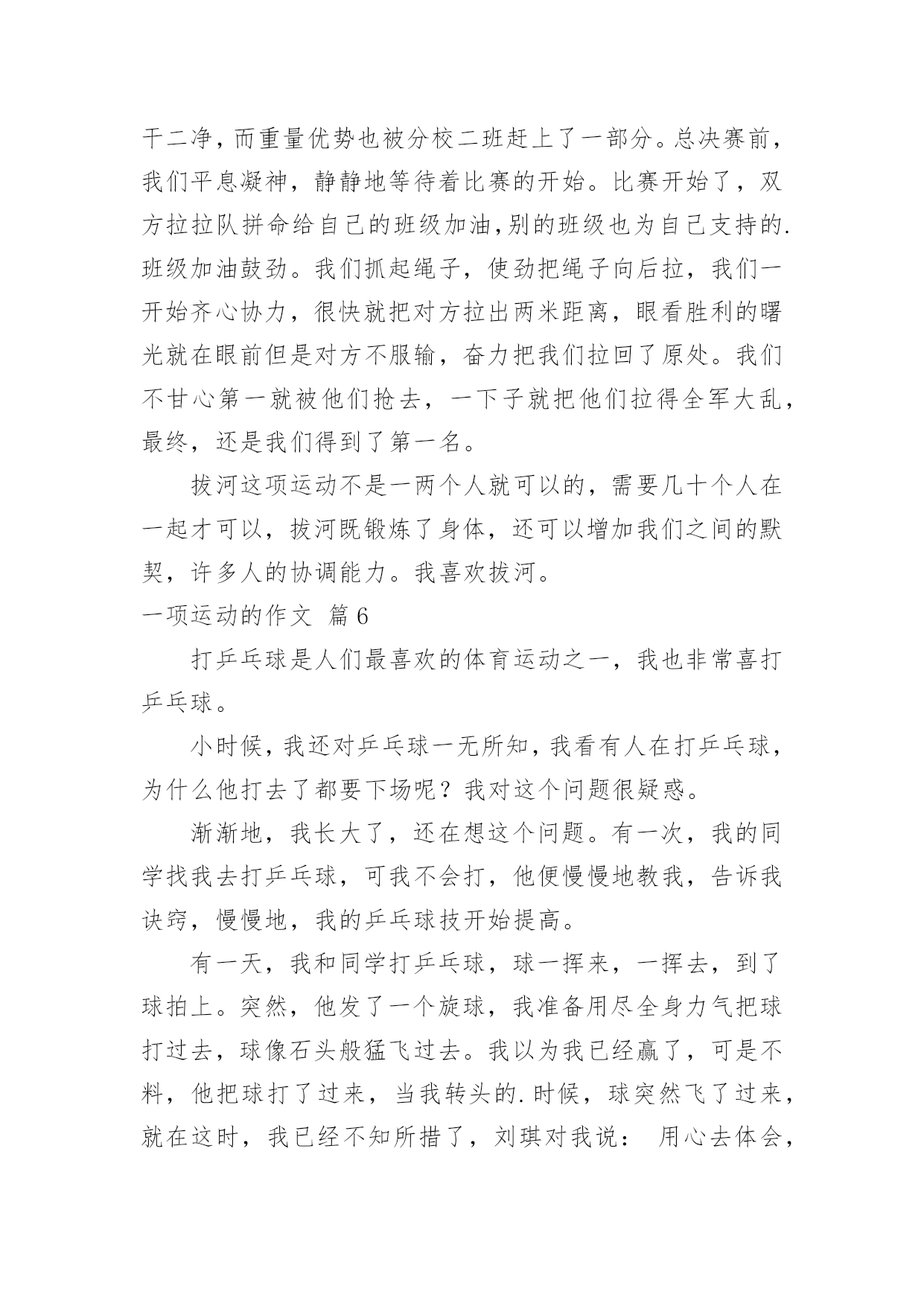 一项运动的作文关于一项运动的作文八篇在平平淡淡的日常中,大家都写过作文吧,借助作文人们可以实现文化交流的目的。那么,怎么去写作文呢?以下是小编为大家整理的一项运动的作文8篇,欢迎阅读与收藏。一项运动的作文篇1篮球是在我们班最吃香的一项运动。因为男生女生都爱这项运动,我们的体育课简直成了NBA的赛场,各路女生,各路男生,都八仙过海——各显神通。青春的活力与动感,我已经先在篮球场上体会了,我从小就喜欢篮球,对篮球有很深的迷恋之情,节奏活泼而欢快,紧张却又刺激,让你很快就能全情投入,初中的青春生涯,谁与争锋?这就是我最喜欢的一项体育运动——篮球。在我日常娱乐生活中,篮球起了及其重要的作用,也有多种打法,一般而言,我们将之分为三种:五打五;三对三;单挑。五打五,意味着有两支队伍,每支队伍均有五人,中锋、大前锋、小前锋、得分后卫、控球后卫。中锋的职责是抢板、传球;前锋负责外线、上篮;得分后卫则主控投篮;控球后卫是左右变相,起组织功能。NBA正式的比赛都是采用这种打法。其余两种是五打五的简化版,三对三,则两队须有中锋、前锋、后卫,打球原则与五打五相同。而单挑,即一对一,你守我攻,你攻我守,两人最直接正面的交锋。而街头篮球则是一种娱乐性的打法。它的打法很简单诸如此类的翻腕、二运等,就已取消了。还有好多虚假的动作比如假晃,先往右,实则往左进攻有种作秀的感觉,耍酷,越帅越好。我个人一打一的打法,为什么呢?因为我目前能力有限,球打得不是很好,其他的.打法我不是很在行。我的身高在班上排行第一,在球队里也是三甲之一。因此我平日靠身体打球我喜欢的球星之一是詹姆斯,因为他很壮也是靠天赋和身体打球,我希望以后像他一样,当个出色的球员。当然我还喜欢科比,他的球打的太好了,命中率极高,简直就是球场上一“怪”。我还喜欢韦德、乔丹等等,这些都是我的偶像,也是我的学习对象。我希望望自己好好练球争取进入CUBA,然后参加NBA选秀,进入NBA球队,成为最棒的球星。我酷爱篮球,因为它注入了我的心血,它让我有了一种把篮球玩好的责任心,我也有这个信心!一项运动的作文篇2在爷爷和爸爸的影响下,我在7岁的那年夏天开始第一次接触乒乓球,刚到球馆的时候,看到小小银球像蝴蝶一样在球台上飞来飞去,我觉得特好玩儿。刚开始学打球的时候,教练老是让我跑步、跳绳、做模仿动作,一做就是几百个甚至上千个,累得我气喘吁吁,觉得很乏味。就这样有坚持练了好多天,教练终于让我上球台了,高兴得我手舞足蹈。顺便说一下,我是用左手握球拍,因为我从小就是左撇子。刚开始的时候,教练先让我打多球,小小银球好像故意捣乱似的,就不按我的目标打,我很着急,心里想:“原来打球是那么不容易呀!”教练仿佛看穿了我的心思,和蔼可亲的对我说:“打球不能着急,要一步一步来,练好基本功,比赛时才能取得好成绩。”我按着教练教我的`动作要领,刻苦训练,每天练得汗流夹背。就这样经过一年多的刻苦训练,在今年暑假,我参加了第六届山东省少年儿童“鲁盛杯”乒乓球比赛。在比赛中,我汲取经验,取长补短,打出了比较理想的成绩。经过连年的刻苦训练,我喜欢上了打乒乓球,它给我带来了很多快乐,我一定要再接再厉,争取更好的成绩!一项运动的作文篇3在很多体育活动中,我最喜欢的是跳绳。跳绳有很多种跳法,有反跳、跳着走、跳花绳、还有单脚跳,等等。但我只能反跳、跳着走、单脚跳、别的`我不会。记得有一次,我放学回家时,看见妈妈和阿姨们在跳绳,我也跑到家里拿了一根跳绳,跑到院子里跳了起来大约过去了二分钟,我竟然跳了300多下,妈妈和阿姨们为我鼓起了掌,我心里比喝了蜜还要甜。啊,我爱这项体育活动——跳绳!一项运动的作文篇4要说最喜欢的体育活动,也许真的没什么。我天生并不喜欢跑步、羽毛球等等。上体育课也是有些反感。若是真要说我喜欢的运动也许只有篮球了吧。我打篮球算不上好,仅仅是一种喜欢。有时夏天的晚上和好友相约去初中对面的篮球场打会儿篮球。并不是斗牛,有时就算是单纯的投篮也是很有乐趣的。看着篮球划过优美的抛物线,准确地落入篮筐时,那种感觉妙不可言。有时,一边打打篮球。一边聊聊天,说到好玩的'地方也会肆无忌惮的大笑。那种自由、开放是我所喜爱的。有时,看着朋友和并不相熟但志同道合的人一起打比赛。他们时而为了自己进的一球而欢呼雀跃:偶尔也为自己没能及时拦下对手而懊恼不已。看着他们准确地投了一个3分,我也会情不自禁地为他们喝彩。打完球后尽管汗流浃背但是喝一口冰水,凉爽的风吹过,说不出的惬意。朋友们一起伴着有些昏暗的路灯,聊着不知从哪儿听到的消息,慢悠悠地晃回家。平常15分钟的路程有时要走30分钟。虽然现在朋友们都进了不同的学校,但我希望明年暑假大家在一起相约在老地方打篮球。篮球也许是我们友情的象征和寄托吧。一项运动的作文篇5运动有很多种,有打篮球、踢足球、打乒乓球、跳绳、跑步等等,我