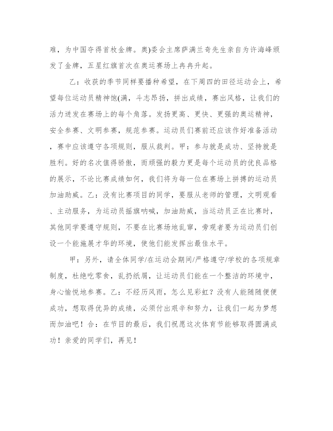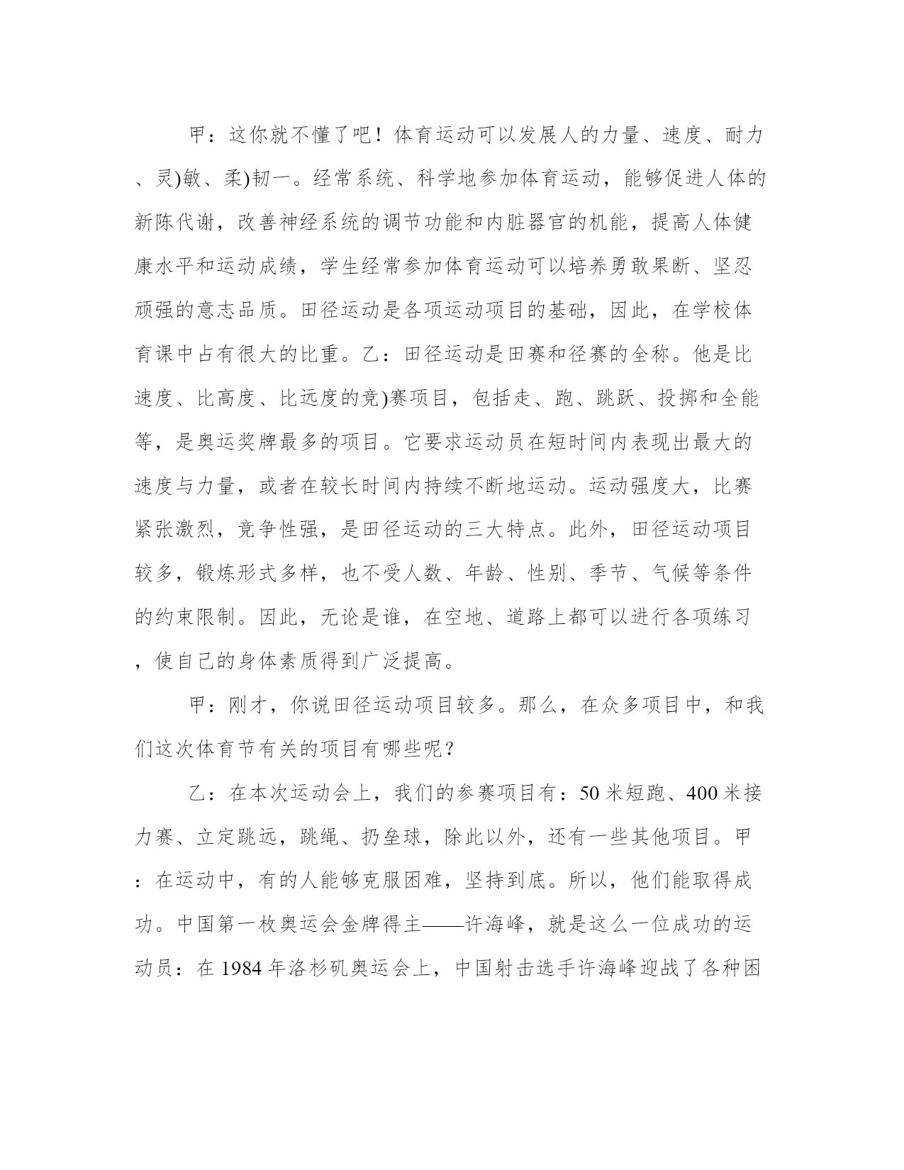 最新运动与健康广播稿甲:很高兴能和你们相识在红领巾小广播,我是一年三班主持人#。乙:我是一年三班主持人#。甲:我们常常会听到这样一句话:生命在于运动!的确如此!有了强健的身体,才会有完美的生活。乙:我们学校的“体育节”系列活动已轰轰烈烈地开始了。下周四,我们将迎来激动人心的体育节各种比赛活动。在这场体育盛宴上,我们的运动员将会有更多精彩呈现在我们面前。甲:说起田径运动会,我倒要考考你,你知道田径运动是怎么产生的吗?乙:这可难不倒我!田径运动是在社会发展中渐渐产生和发展起来的。远在古代,人们为了生活,在和大自然以及野兽作斗争中,经常出没于崇山峻岭、沼泽平原,跨溪流,越障碍,在日常生活劳动中,由于他们不断地重复这些动作,就逐步形成了走、跑、跳跃和投掷等各种运动技能。随着社会的发展,人们有意识地把这些技能传授给下一代,并经常进行练习和比赛,从而逐渐形成了现今的田径运动。甲:哦,原来田径运动的产生是人们不断适应社会的结果!乙:可是,令我感到奇怪的是:为什么在社会高度发展的今天,人们仍旧要坚持体育锻炼呢?甲:这你就不懂了吧!体育运动可以发展人的力量、速度、耐力、灵)敏、柔)韧一。经常系统、科学地参加体育运动,能够促进人体的新陈代谢,改善神经系统的调节功能和内脏器官的机能,提高人体健康水平和运动成绩,学生经常参加体育运动可以培养勇敢果断、坚忍顽强的意志品质。田径运动是各项运动项目的基础,因此,在学校体育课中占有很大的比重。乙:田径运动是田赛和径赛的全称。他是比速度、比高度、比远度的竞)赛项目,包括走、跑、跳跃、投掷和全能等,是奥运奖牌最多的项目。它要求运动员在短时间内表现出最大的速度与力量,或者在较长时间内持续不断地运动。运动强度大,比赛紧张激烈,竞争性强,是田径运动的三大特点。此外,田径运动项目较多,锻炼形式多样,也不受人数、年龄、性别、季节、气候等条件的约束限制。因此,无论是谁,在空地、道路上都可以进行各项练习,使自己的身体素质得到广泛提高。甲:刚才,你说田径运动项目较多。那么,在众多项目中,和我们这次体育节有关的项目有哪些呢?乙:在本次运动会上,我们的参赛项目有:50米短跑、400米接力赛、立定跳远,跳绳、扔垒球,除此以外,还有一些其他项目。甲:在运动中,有的人能够克服困难,坚持到底。所以,他们能取得成功。中国第一枚奥运会金牌得主——许海峰,就是这么一位成功的运动员:在1984年洛杉矶奥运会上,中国射击选手许海峰迎战了各种困难,为中国夺得首枚金牌。奥)委会主席萨满兰奇先生亲自为许海峰颁发了金牌,五星红旗首次在奥运赛场上冉冉升起。乙:收获的季节同样要播种希望,在下周四的田径运动会上,希望每位运动员精神饱(满,斗志昂扬,拼出成绩,赛出风格,让我们的活力迸发在赛场上的每个角落。发扬更高、更快、更强的奥运精神,安全参赛、文明参赛,规范参赛。运动员们赛前还应该作好准备活动,赛中应该遵守各项规则,服从裁判。甲:参与就是成功、坚持就是胜利。好的名次值得骄傲,而顽强的毅力更是每个运动员的优良品格的展示,不论比赛成绩如何,我们将为每一位在赛场上拼搏的运动员加油助威。乙:没有比赛项目的同学,要服从老师的管理,文明观看、主动服务,为运动员摇旗呐喊,加油助威,当运动员正在比赛时,其他同学要遵守规则,不要在比赛场地乱窜,旁观者要为运动员们创设一个能施展才华的环境,使他们能发挥出最佳水平。甲:另外,请全体同学/在运动会期间/严格遵守/学校的各项规章制度,杜绝吃零食,乱扔纸屑,让运动员们能在一个整洁的环境中,身心愉悦地参赛。乙:不经历风雨,怎么见彩虹?没有人能随随便便成功,想取得优异的成绩,必须付出艰辛和努力,让我们一起为梦想而加油吧!合:在节目的最后,我们祝愿这次体育节能够取得圆满成功!亲爱的同学们,再见!