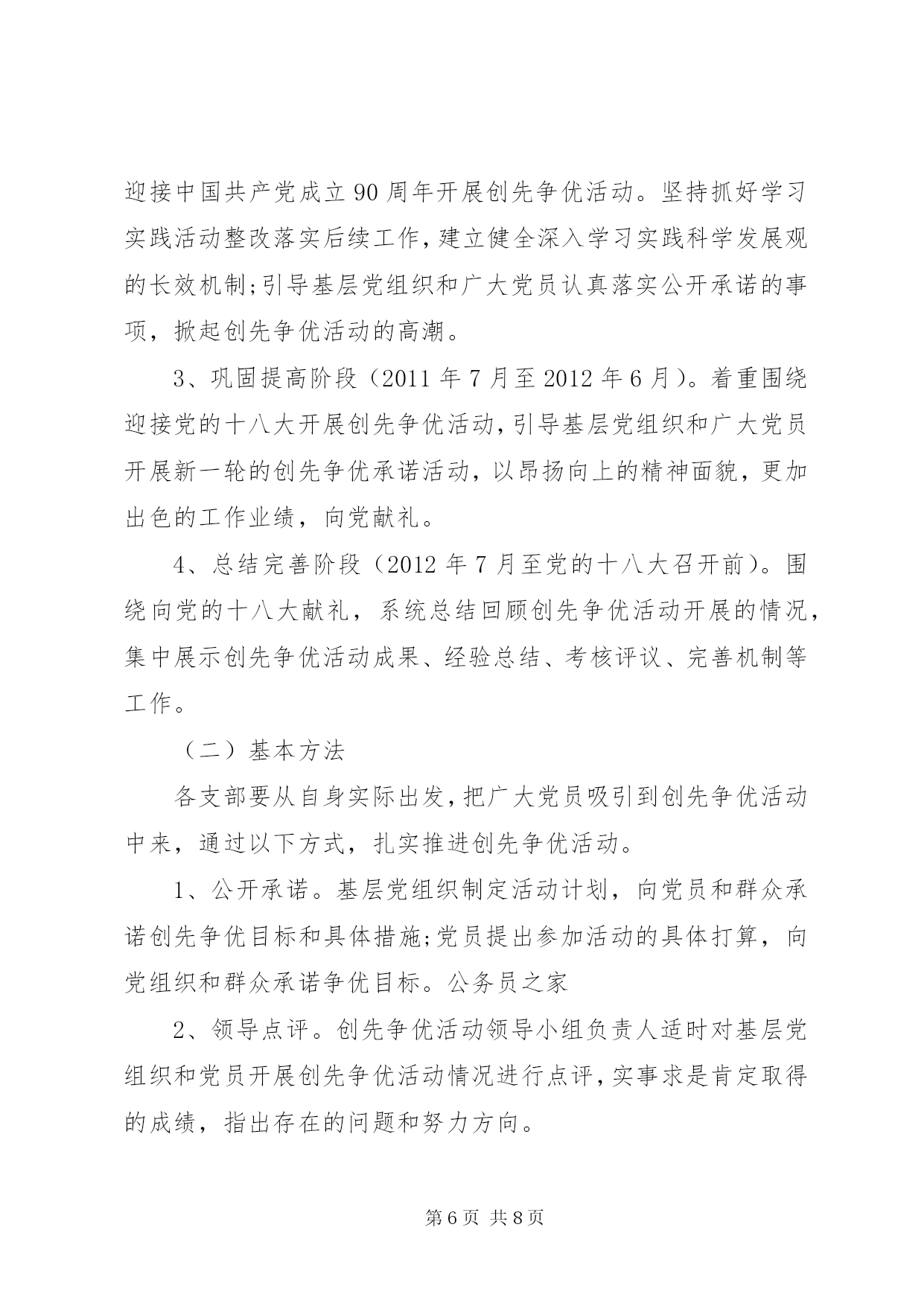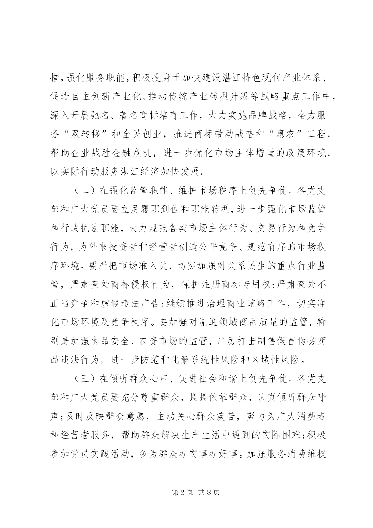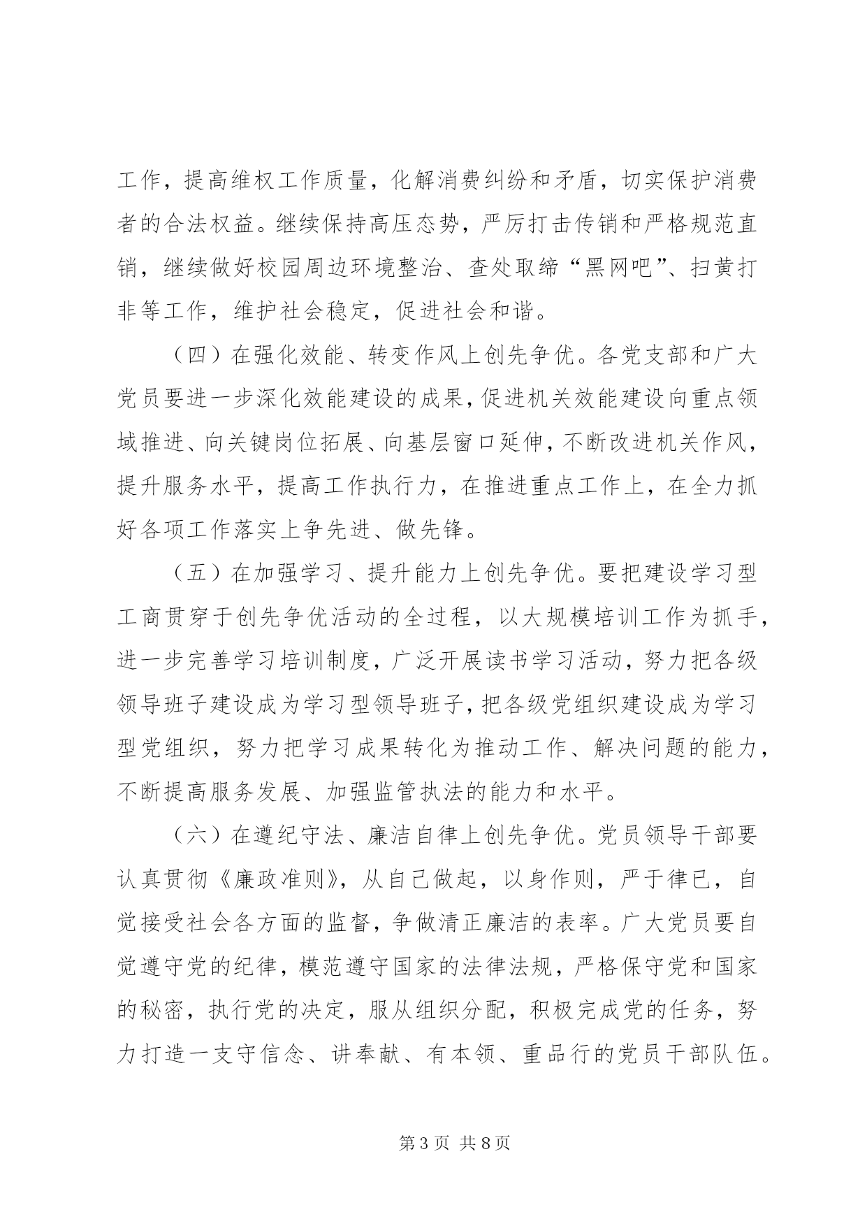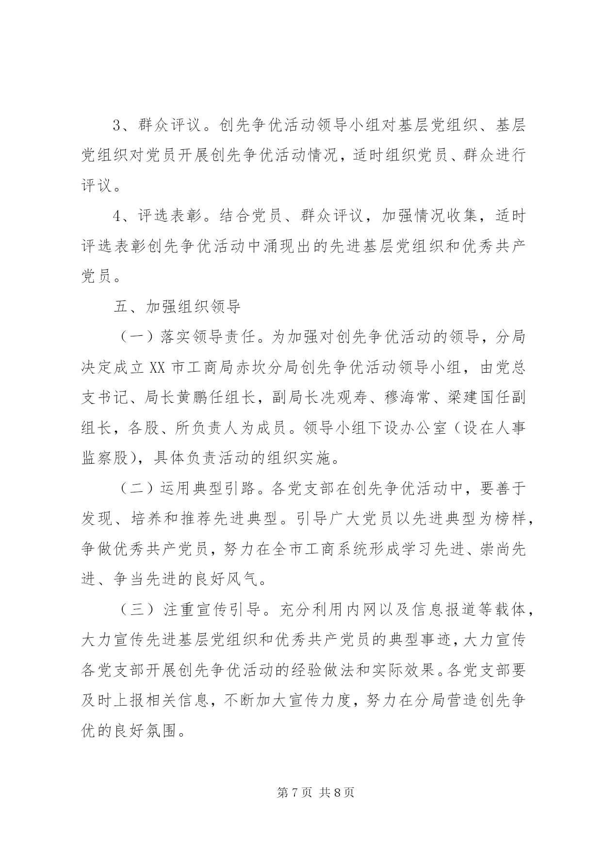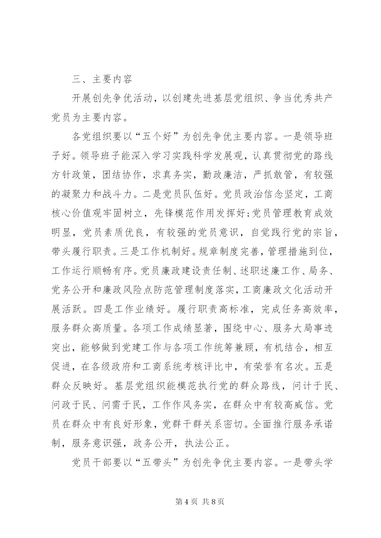 第PAGE\*Arabic\*MERGEFORMAT8页共NUMPAGES\*MERGEFORMAT8页工商分局开展创先争优活动方案为深入贯彻落实党的十七大和十七届三中、四中全会精神,进一步巩固和拓展深入学习实践科学发展观活动成果,充分发挥赤坎分局党组织的战斗堡垒作用和广大党员的骨干带头作用,激发广大党员干部的生机活力,推动工商服务发展上水平、履行监管执法职能上台阶、树立良好社会形象。根据市委有关文件精神,结合分局工作实际,制定如下实施方案。一、指导思想开展创先争优活动,要认真贯彻落实党的十七大和十七届三中、四中全会以及市委九届九次、十次全会精神,以邓--理论和“三个代表”重要思想为指导,深入贯彻落实科学发展观,从实际出发,改革创新,务求实效,统筹推进党的建设其他经常性工作,充分发挥基层党组织的战斗堡垒作用和共产党员的先锋模范作用,为赤坎工商转型升级、争当工商标兵提供坚强的组织保障。二、目标要求基层党组织和广大党员要围绕“强化提高执行力,提升服务水平”主题,通过开展创先争优活动,认真履行职责,始终牢记全心全意为人民服务的宗旨,在推动科学发展、促进社会和谐、服务人民群众、加强基层组织的实践中建功立业。(一)在强化服务职能、推动转变经济增长方式上创先争优。广大党员要立足本职,以“三促进一保持”为重点,创优服务举措,强化服务职能,积极投身于加快建设湛江特色现代产业体系、促进自主创新产业化、推动传统产业转型升级等战略重点工作中,深入开展驰名、著名商标培育工作,大力实施品牌战略,全力服务“双转移”和全民创业,推进商标带动战略和“惠农”工程,帮助企业战胜金融危机,进一步优化市场主体增量的政策环境,以实际行动服务湛江经济加快发展。(二)在强化监管职能、维护市场秩序上创先争优。各党支部和广大党员要立足履职到位和职能转型,进一步强化市场监管和行政执法职能,大力规范各类市场主体行为、交易行为和竞争行为,为外来投资者和经营者创造公平竞争、规范有序的市场秩序环境。要严把市场准入关,切实加强对关系民生的重点行业监管,严肃查处商标侵权行为,保护注册商标专用权;严肃查处不正当竞争和虚假违法广告;继续推进治理商业贿赂工作,切实净化市场环境及竞争秩序。要加强对流通领域商品质量的监管,特别是加强食品安全、农资市场的监管,严厉打击制售假冒伪劣商品违法行为,进一步防范和化解系统性风险和区域性风险。(三)在倾听群众心声、促进社会和谐上创先争优。各党支部和广大党员要充分尊重群众,紧紧依靠群众,认真倾听群众呼声;及时反映群众意愿,主动关心群众疾苦,努力为广大消费者和经营者服务,帮助群众解决生产生活中遇到的实际困难;积极参加党员实践活动,多为群众办实事办好事。加强服务消费维权工作,提高维权工作质量,化解消费纠纷和矛盾,切实保护消费者的合法权益。继续保持高压态势,严厉打击传销和严格规范直销,继续做好校园周边环境整治、查处取缔“黑网吧”、扫黄打非等工作,维护社会稳定,促进社会和谐。(四)在强化效能、转变作风上创先争优。各党支部和广大党员要进一步深化效能建设的成果,促进机关效能建设向重点领域推进、向关键岗位拓展、向基层窗口延伸,不断改进机关作风,提升服务水平,提高工作执行力,在推进重点工作上,在全力抓好各项工作落实上争先进、做先锋。(五)在加强学习、提升能力上创先争优。要把建设学习型工商贯穿于创先争优活动的全过程,以大规模培训工作为抓手,进一步完善学习培训制度,广泛开展读书学习活动,努力把各级领导班子建设成为学习型领导班子,把各级党组织建设成为学习型党组织,努力把学习成果转化为推动工作、解决问题的能力,不断提高服务发展、加强监管执法的能力和水平。(六)在遵纪守法、廉洁自律上创先争优。党员领导干部要认真贯彻《廉政准则》,从自己做起,以身作则,严于律已,自觉接受社会各方面的监督,争做清正廉洁的表率。广大党员要自觉遵守党的纪律,模范遵守国家的法律法规,严格保守党和国家的秘密,执行党的决定,服从组织分配,积极完成党的任务,努力打造一支守信念、讲奉献、有本领、重品行的党员干部队伍。三、主要内容开展创先争优活动,以创建先进基层党组织、争当优秀共产党员为主要内容。各党组织要以“五个好”为创先争优主要内容。一是领导班子好。领导班子能深入学习实践科学发展观,认真贯彻党的路线方针政策,团结协作,求真务实,勤政廉洁,严抓敢管,有较强的凝聚力和战斗力。二是党员队伍好。党员政治信念坚定,工商核心价值观牢固树立,先锋模范作用发挥好;党员管理教育成效明显,党员素质优良,有较强的党员意识,自觉践行党的宗旨,带头履行职责。三是工作机制好。规章制度完善,管理措施到位,工作运行顺畅有序。党员廉政建设责任制、述职述廉工作、局务、党务公开和廉政风险点防范管理制度落实,工商廉政文化活动开展活跃。四