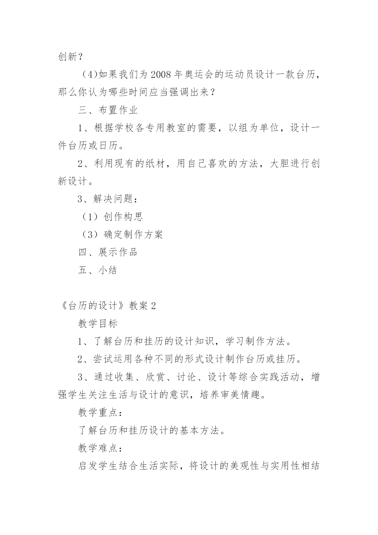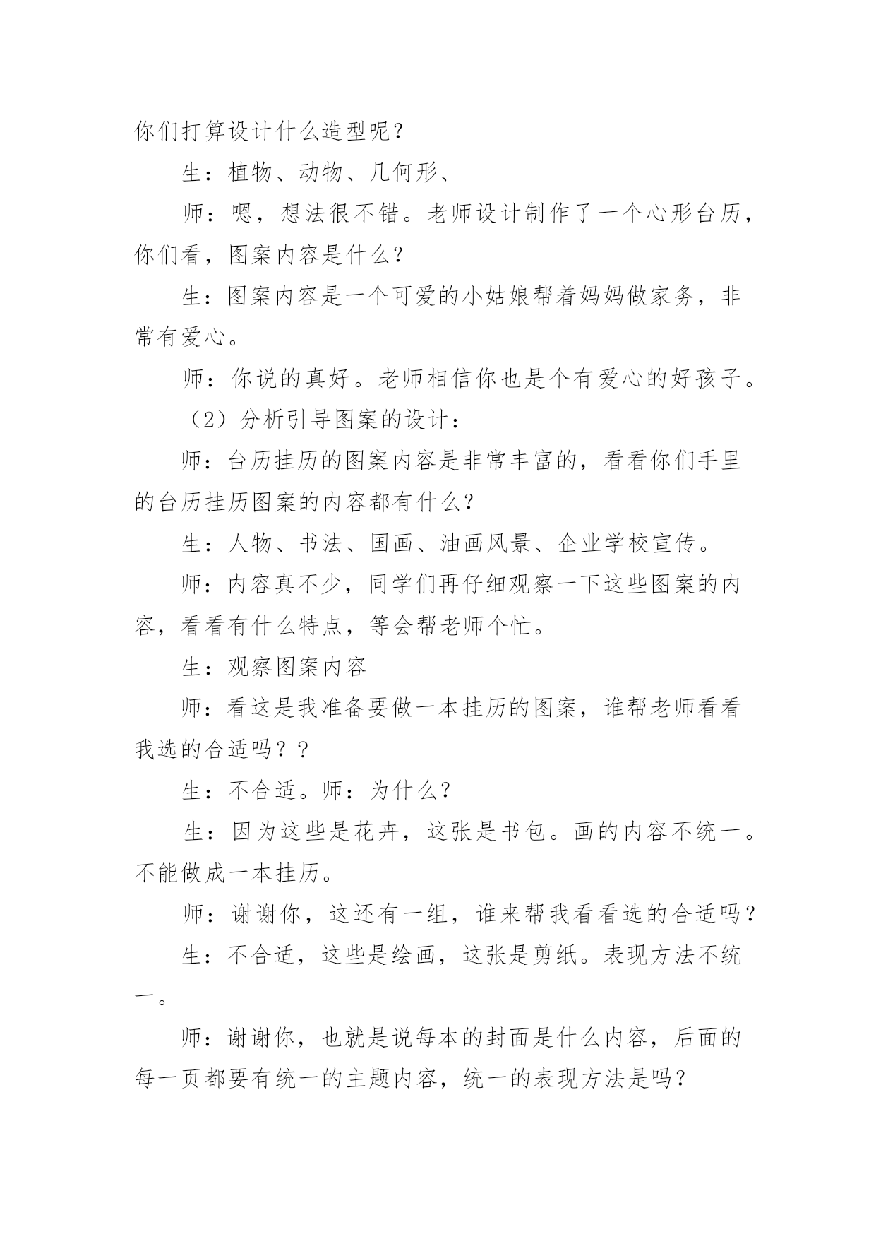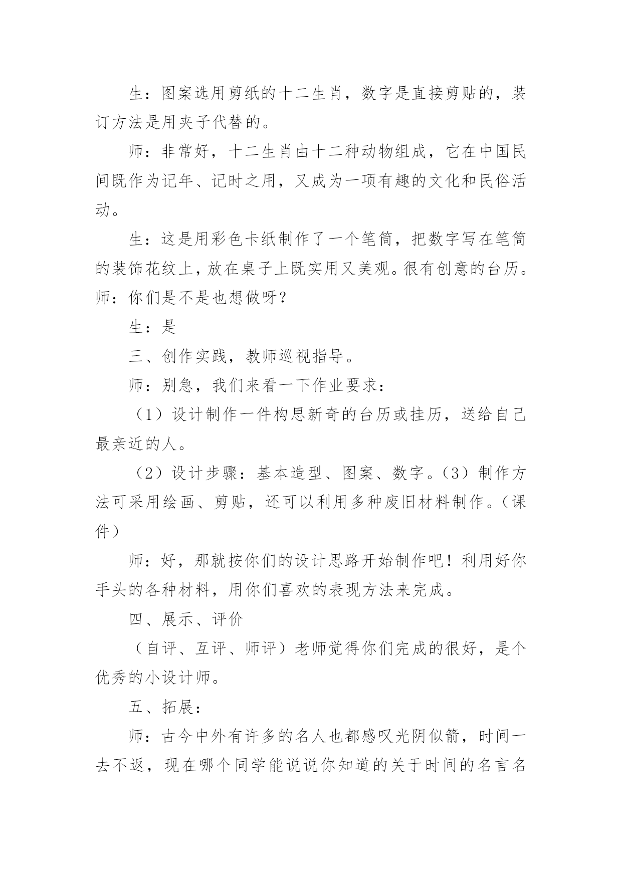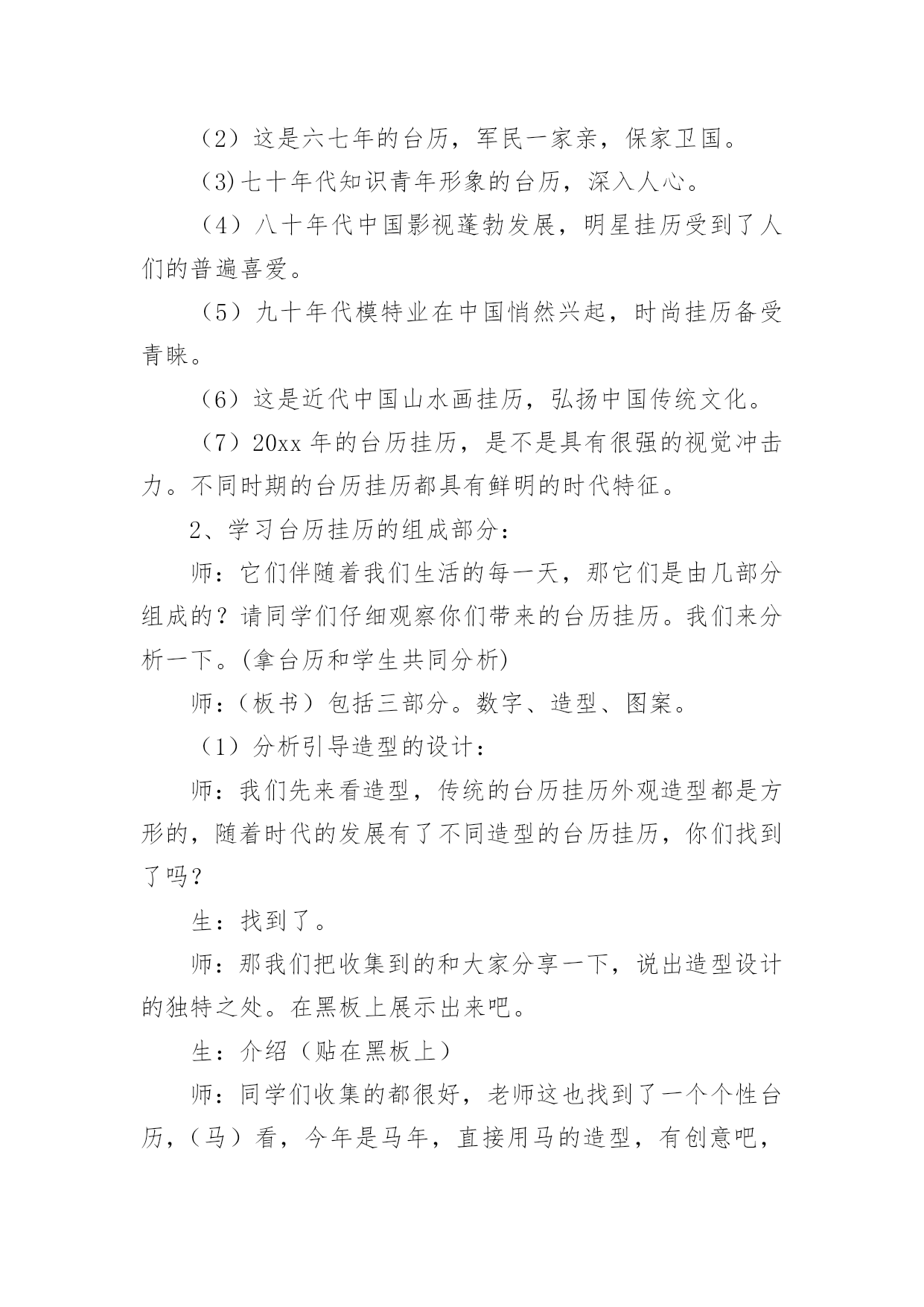 《台历的设计》教案(热)《台历的设计》教案作为一名辛苦耕耘的教育工作者,就有可能用到教案,教案是备课向课堂教学转化的关节点。写教案需要注意哪些格式呢?下面是小编收集整理的《台历的设计》教案,仅供参考,大家一起来看看吧。《台历的设计》教案1教学目标1、了解台历和挂历设计方面的知识,学习制作方法。2、尝试运用各种不同的形式设计制作台历或挂历。3、通过收集、欣赏、讨论、设计等综合实践活动,增强学生关注生活与设计的意识,培养审美情趣。教学重点了解台历和挂历设计的基本方法教学难点启发学生结合生活实际,将设计的美观性与实用性相结合教学过程:第一课时:一、导入新课展示一款挂历,提出问题:这是什么?它的作用是什么?出示课题二、讲授新课1、小组探究学习演示或对比观看各种新旧挂历。2、通过新旧台历、挂历的对比,你从它们的造型设计、色彩、功能和选用的.材料方面发现有什么不同?学生观看,以组为单位探究学习,并回答问题。总之,随着生活的不断进步,台历和挂历的外观设计装饰性越来越强,在功能上也越来越讲究多用性,表达了人们对美好生活的追求。3、深入研究以组为单位,把本组学生带来的最有特色的挂历或台历介绍给大家。小结:从以上同学们的介绍中。我们了解到,挂历和台历不仅是记录时间的工具,而且还能美化我们的生活,为我们的生活增添乐趣。4、作业:根据自己组的研究,制作一份关于人们过去和现在利用台历和挂历的研究报告第二课时:1、提问:通过上节课的研究,你了解到:(1)台历和挂历最基本的。结构包括哪些?(2)仔细观察你们带来的日历,看看在日期的设定上有什么不一样?(3)如果让你们在日历上来注明时间,你们会有哪些创新?(4)如果我们为2008年奥运会的运动员设计一款台历,那么你认为哪些时间应当强调出来?三、布置作业1、根据学校各专用教室的需要,以组为单位,设计一件台历或日历。2、利用现有的纸材,用自己喜欢的方法,大胆进行创新设计。3、解决问题:(1)创作构思(3)确定制作方案四、展示作品五、小结《台历的设计》教案2教学目标1、了解台历和挂历的设计知识,学习制作方法。2、尝试运用各种不同的形式设计制作台历或挂历。3、通过收集、欣赏、讨论、设计等综合实践活动,增强学生关注生活与设计的意识,培养审美情趣。教学重点:了解台历和挂历设计的基本方法。教学难点:启发学生结合生活实际,将设计的美观性与实用性相结合。教学准备:课件、彩纸、各种工具和材料。教学过程:一、引导阶段师:课前放音乐。生:静静聆听王铮亮的《时间都去哪了》师:你们都听过这首歌吧?生:《时间都去哪了》师:是的,这是今年春晚上唱的一首歌曲,这份浓浓的亲情让我们动容,你们听了有什么感受呢?生:1、我们总是感叹时间过得太快,不经意地从我们身边溜走。2、我们不要浪费时间。3、时间就是生命,时间就是财富。4、我们要珍惜亲情,孝敬我们的父母。师:说的真好,时间是我们人类最珍贵的礼物。但在久远的人类早期人们却只有通过观看太阳的升起、降落来辨别时间的早晚,随着时间的发展,人们发明了许多关于记录时间的方法。台历挂历就是其中的计时方法,它们记录下我们成长的岁月,今天我们就一起学习探讨台历和挂历的设计。(张贴课题)二、新授:1、了解台历挂历的由来发展:师:老师让你们课前查阅记时的方法,谁找到了和大家分享一下。生:记时的方法有很多,早在我国古代就有了,我国始有历法大约在四千多年以前。根据甲骨文中的一页甲骨历,证明殷代的历法已具有相当的水平,这一页甲骨历是全人类最古老的历书实物,这页甲骨历也就叫日历。师:噢,甲骨历是全人类最古老的历书实物,也叫日历。谢谢你。还有谁查到了?(放课件)生:日历在我国历史悠久,早在1200多年前的唐德宗贞元21年就已在宫中使用。又称皇历。那时的日历分为十二册,每月一册,每册的页数和每月的天数相等,每一页的上半部有月日、干支、节令等内容,下半部空白处供记载皇帝言行用。师:日历除了记时还可以记事,真不错。这是清朝的日历。历史够悠久吧。好,你说。(放课件)生:印刷术发明以后,日历花样不断翻新,逐渐发展成为挂历、台历等多个品种,台历、挂历是将摄影、书法、美术、印刷等技术融为一体的艺术品。它们美观大方,一上市就受到人们的喜爱。成为人们工作、学习和日常生活中重要的物品。师:台历挂历有记时的实用功能,还有美化生活环境的装饰功能。太好了,我们一起来看一下台历挂历的发展。(课件展示不同时期的台历挂历图片。)(1)这是中华民国的台式日历,记录故宫的历史。(2)这是六七年的台历,军民一家亲,保家卫国。(3)七十年代知识青年形象的台历,深入人心。(4)八十年代中国影视蓬勃发展,明星挂历受到了人们的普遍喜爱。(5)九十年代模特业在中国悄然兴起,时尚挂历备受青睐。(6)这是近代中国山水画挂历,弘扬中国传统文化。(7)20xx年的台历挂历,是不