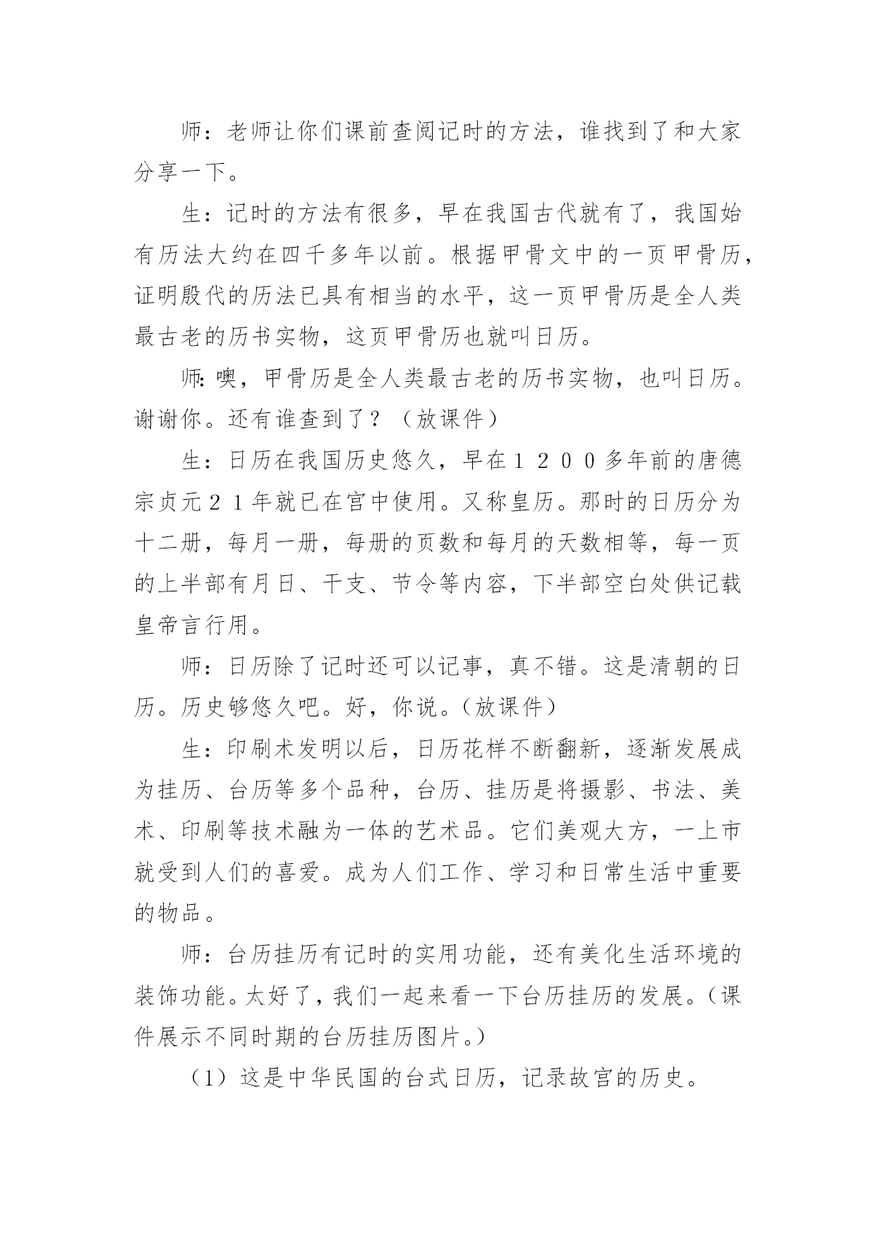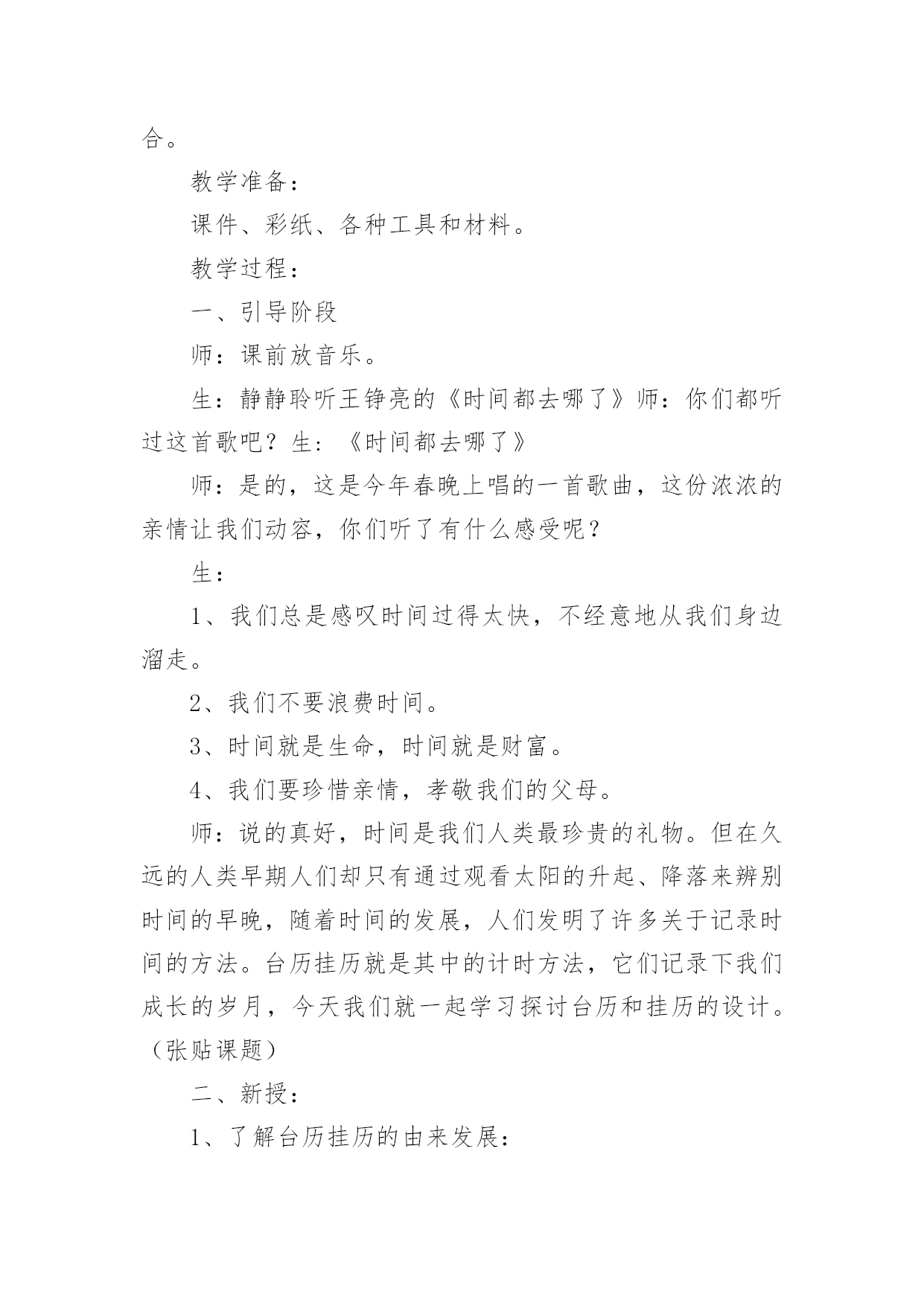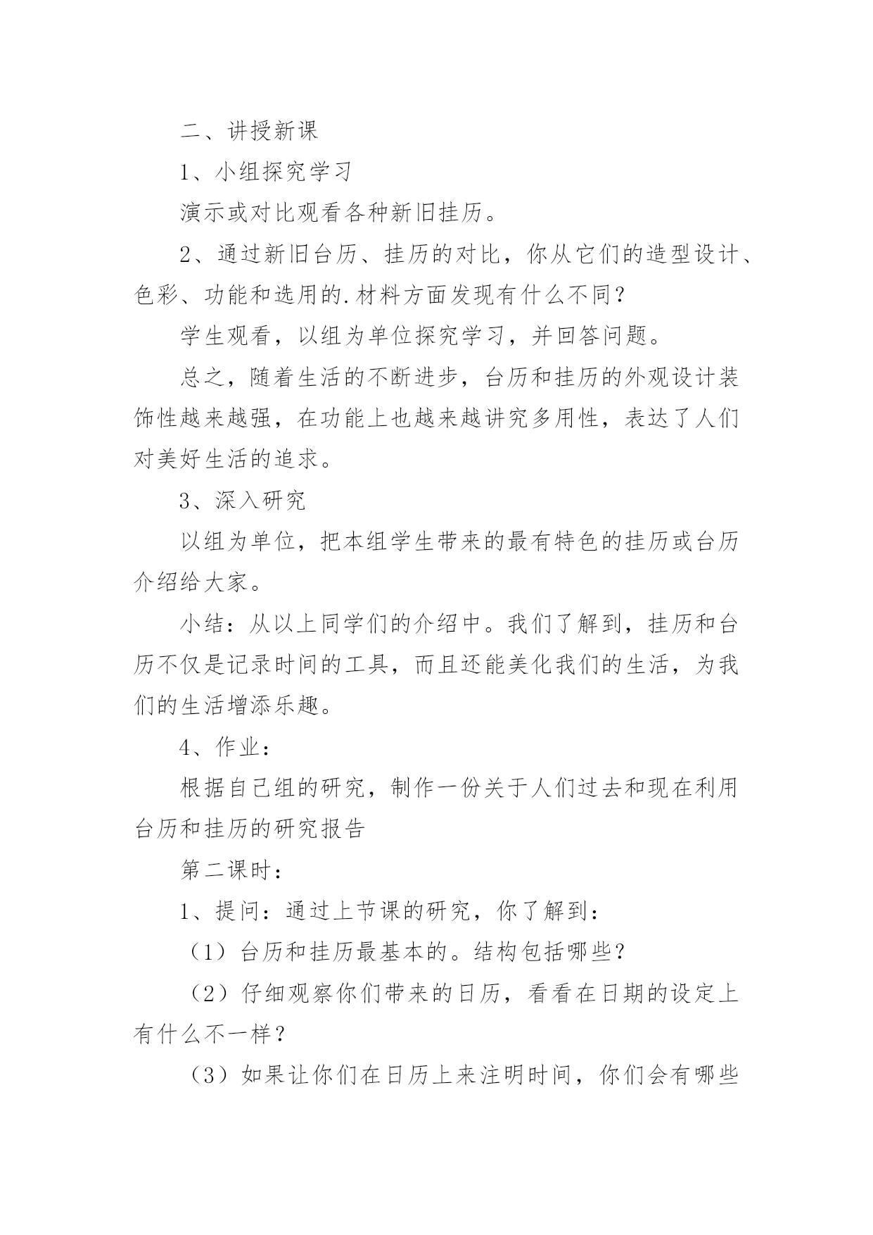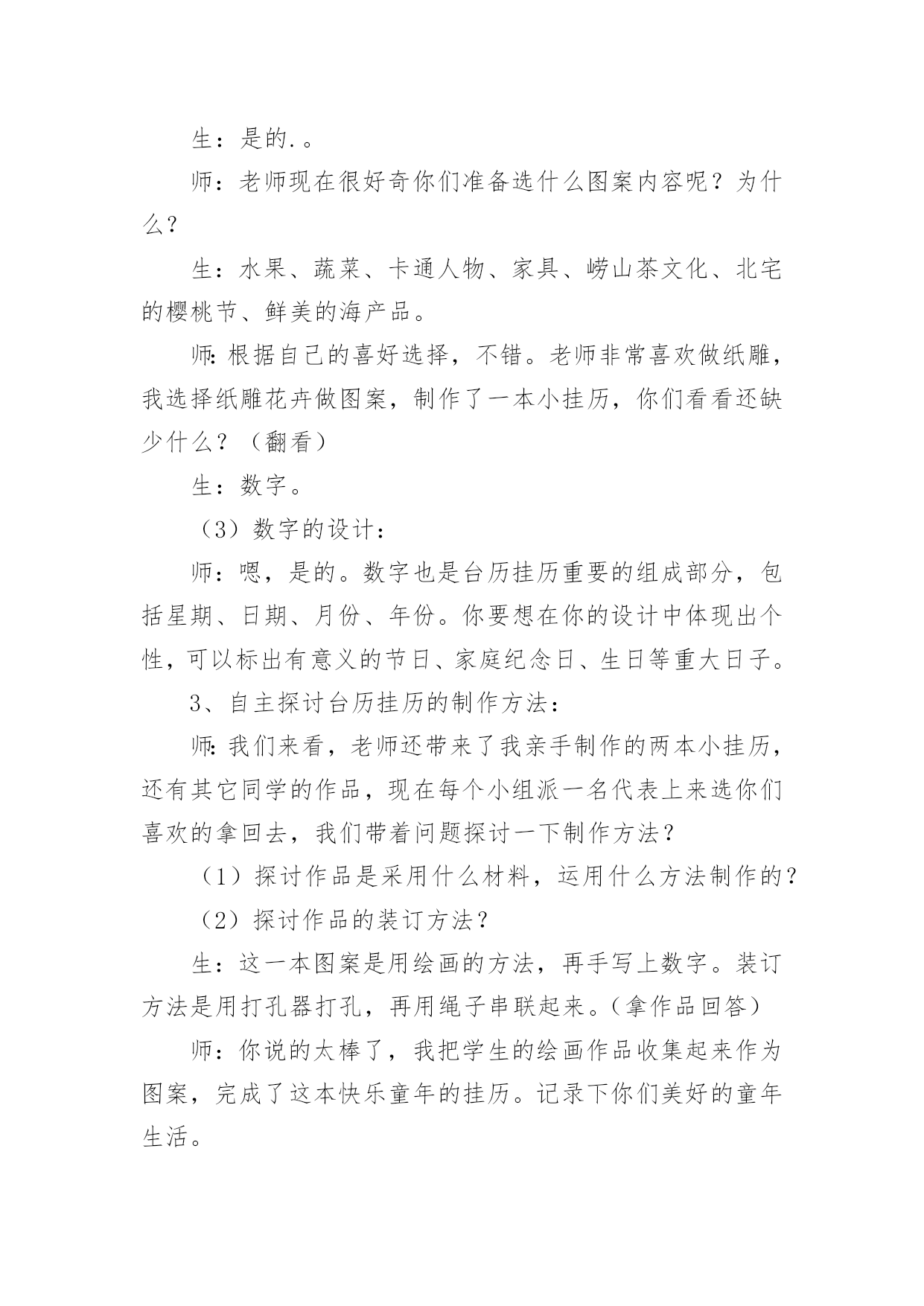 《台历的设计》教案(热)《台历的设计》教案作为一名辛苦耕耘的教育工作者,就有可能用到教案,教案是备课向课堂教学转化的关节点。写教案需要注意哪些格式呢?下面是小编收集整理的《台历的设计》教案,仅供参考,大家一起来看看吧。《台历的设计》教案1教学目标1、了解台历和挂历设计方面的知识,学习制作方法。2、尝试运用各种不同的形式设计制作台历或挂历。3、通过收集、欣赏、讨论、设计等综合实践活动,增强学生关注生活与设计的意识,培养审美情趣。教学重点了解台历和挂历设计的基本方法教学难点启发学生结合生活实际,将设计的美观性与实用性相结合教学过程:第一课时:一、导入新课展示一款挂历,提出问题:这是什么?它的作用是什么?出示课题二、讲授新课1、小组探究学习演示或对比观看各种新旧挂历。2、通过新旧台历、挂历的对比,你从它们的造型设计、色彩、功能和选用的.材料方面发现有什么不同?学生观看,以组为单位探究学习,并回答问题。总之,随着生活的不断进步,台历和挂历的外观设计装饰性越来越强,在功能上也越来越讲究多用性,表达了人们对美好生活的追求。3、深入研究以组为单位,把本组学生带来的最有特色的挂历或台历介绍给大家。小结:从以上同学们的介绍中。我们了解到,挂历和台历不仅是记录时间的工具,而且还能美化我们的生活,为我们的生活增添乐趣。4、作业:根据自己组的研究,制作一份关于人们过去和现在利用台历和挂历的研究报告第二课时:1、提问:通过上节课的研究,你了解到:(1)台历和挂历最基本的。结构包括哪些?(2)仔细观察你们带来的日历,看看在日期的设定上有什么不一样?(3)如果让你们在日历上来注明时间,你们会有哪些创新?(4)如果我们为2008年奥运会的运动员设计一款台历,那么你认为哪些时间应当强调出来?三、布置作业1、根据学校各专用教室的需要,以组为单位,设计一件台历或日历。2、利用现有的纸材,用自己喜欢的方法,大胆进行创新设计。3、解决问题:(1)创作构思(3)确定制作方案四、展示作品五、小结《台历的设计》教案2教学目标1、了解台历和挂历的设计知识,学习制作方法。2、尝试运用各种不同的形式设计制作台历或挂历。3、通过收集、欣赏、讨论、设计等综合实践活动,增强学生关注生活与设计的意识,培养审美情趣。教学重点:了解台历和挂历设计的基本方法。教学难点:启发学生结合生活实际,将设计的美观性与实用性相结合。教学准备:课件、彩纸、各种工具和材料。教学过程:一、引导阶段师:课前放音乐。生:静静聆听王铮亮的《时间都去哪了》师:你们都听过这首歌吧?生:《时间都去哪了》师:是的,这是今年春晚上唱的一首歌曲,这份浓浓的亲情让我们动容,你们听了有什么感受呢?生:1、我们总是感叹时间过得太快,不经意地从我们身边溜走。2、我们不要浪费时间。3、时间就是生命,时间就是财富。4、我们要珍惜亲情,孝敬我们的父母。师:说的真好,时间是我们人类最珍贵的礼物。但在久远的人类早期人们却只有通过观看太阳的升起、降落来辨别时间的早晚,随着时间的发展,人们发明了许多关于记录时间的方法。台历挂历就是其中的计时方法,它们记录下我们成长的岁月,今天我们就一起学习探讨台历和挂历的设计。(张贴课题)二、新授:1、了解台历挂历的由来发展:师:老师让你们课前查阅记时的方法,谁找到了和大家分享一下。生:记时的方法有很多,早在我国古代就有了,我国始有历法大约在四千多年以前。根据甲骨文中的一页甲骨历,证明殷代的历法已具有相当的水平,这一页甲骨历是全人类最古老的历书实物,这页甲骨历也就叫日历。师:噢,甲骨历是全人类最古老的历书实物,也叫日历。谢谢你。还有谁查到了?(放课件)生:日历在我国历史悠久,早在1200多年前的唐德宗贞元21年就已在宫中使用。又称皇历。那时的日历分为十二册,每月一册,每册的页数和每月的天数相等,每一页的上半部有月日、干支、节令等内容,下半部空白处供记载皇帝言行用。师:日历除了记时还可以记事,真不错。这是清朝的日历。历史够悠久吧。好,你说。(放课件)生:印刷术发明以后,日历花样不断翻新,逐渐发展成为挂历、台历等多个品种,台历、挂历是将摄影、书法、美术、印刷等技术融为一体的艺术品。它们美观大方,一上市就受到人们的喜爱。成为人们工作、学习和日常生活中重要的物品。师:台历挂历有记时的实用功能,还有美化生活环境的装饰功能。太好了,我们一起来看一下台历挂历的发展。(课件展示不同时期的台历挂历图片。)(1)这是中华民国的台式日历,记录故宫的历史。(2)这是六七年的台历,军民一家亲,保家卫国。(3)七十年代知识青年形象的台历,深入人心。(4)八十年代中国影视蓬勃发展,明星挂历受到了人们的普遍喜爱。(5)九十年代模特业在中国悄然兴起,时尚挂历备受青睐。(6)这是近代中国山水画挂历,弘扬中国传统文化。(7)20xx年的台历挂历,是不
