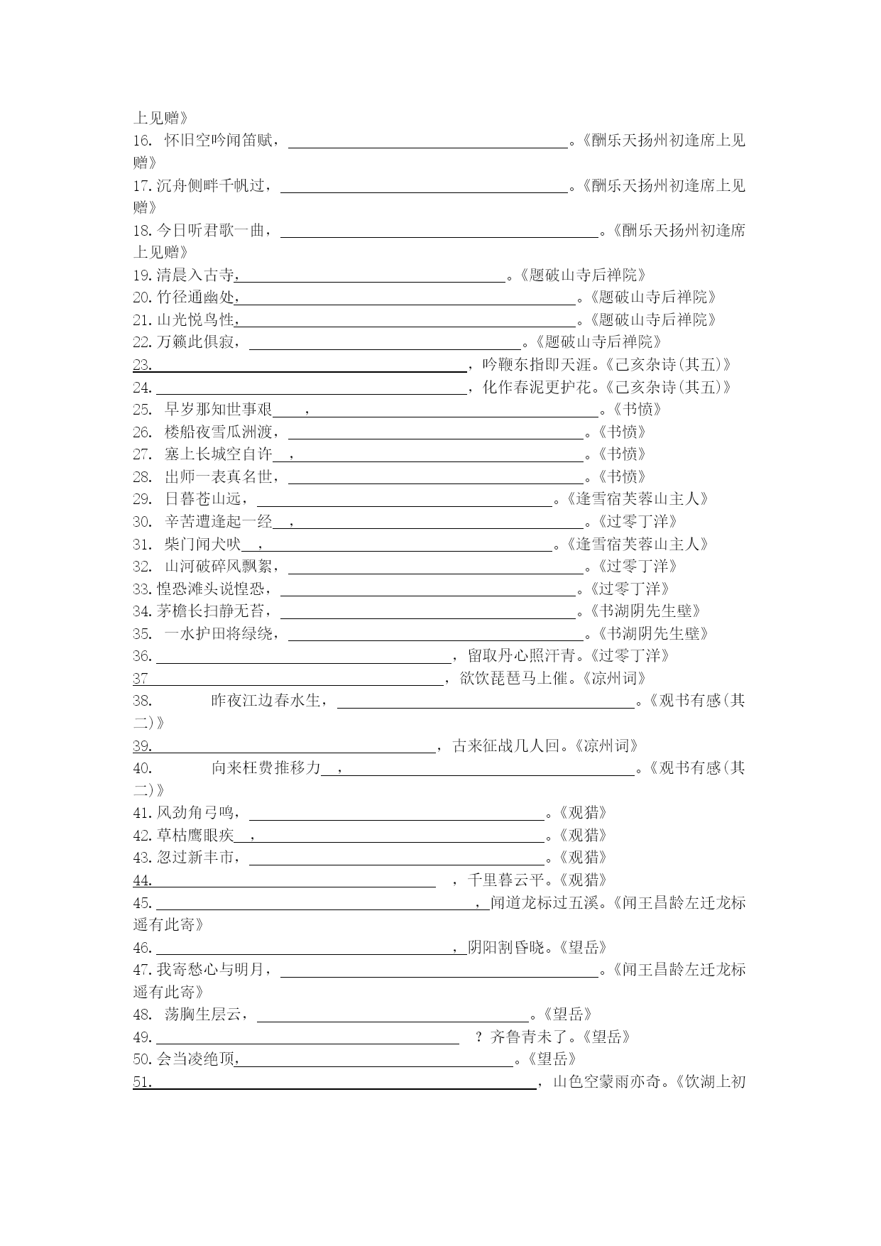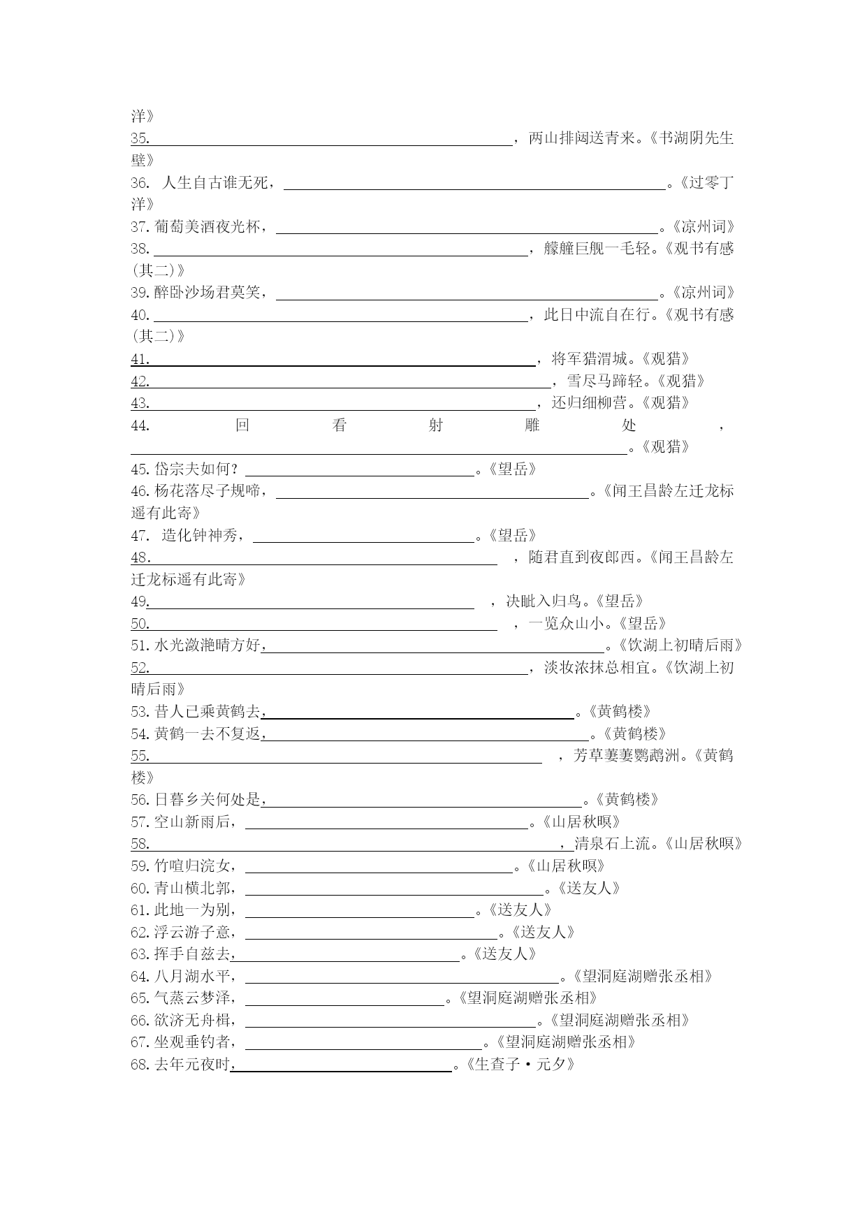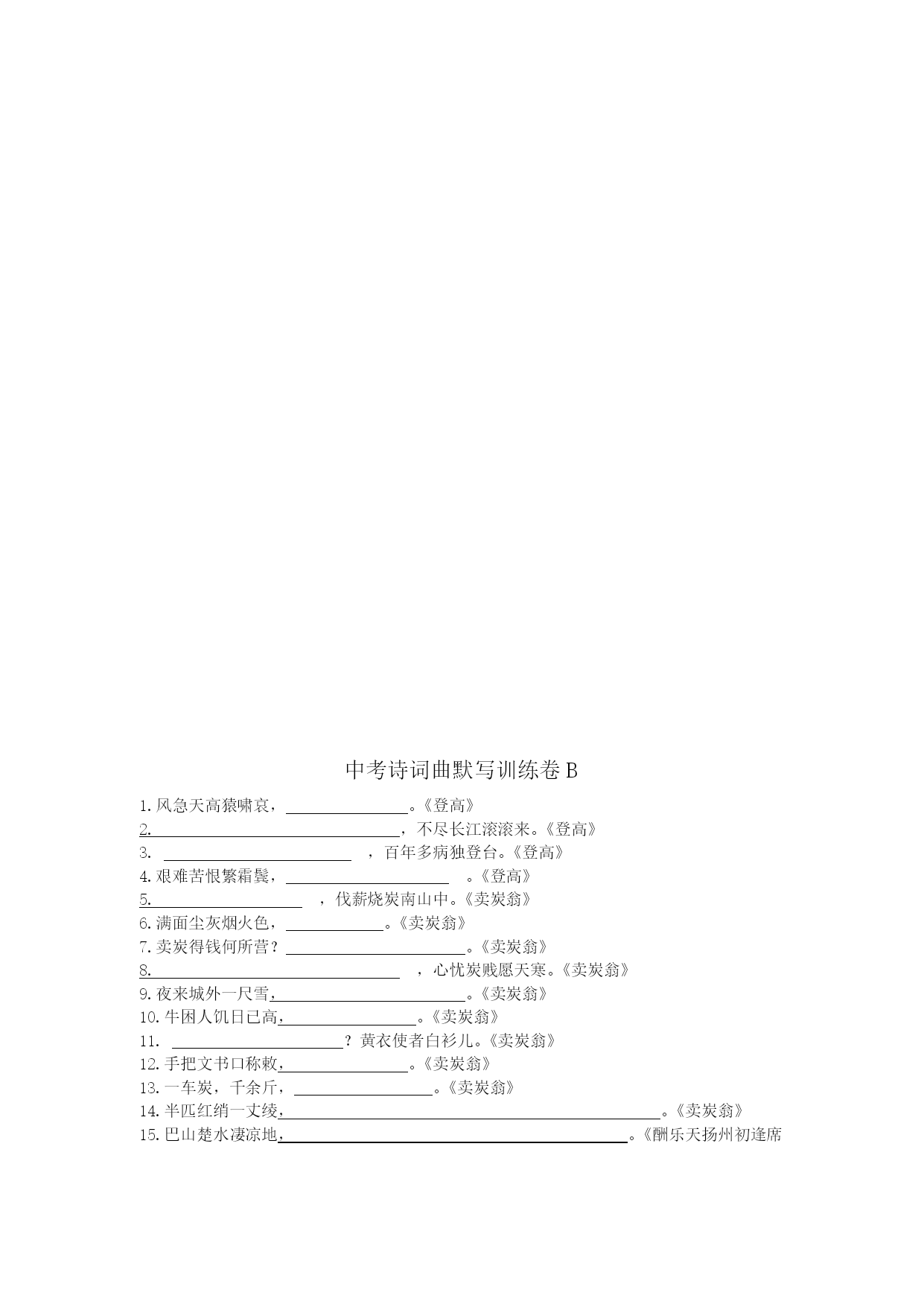 中考诗词曲默写训练卷A1.,渚清沙白鸟飞回。《登高》2.无边落木萧萧下,。《登高》3.万里悲秋常作客,。《登高》4.,潦倒新停浊酒杯。《登高》5.卖炭翁,。《卖炭翁》6.,两鬓苍苍十指黑。《卖炭翁》7.?身上衣裳口中食。《卖炭翁》8.可怜身上衣正单,。《卖炭翁》9.,晓驾炭车辗冰辙。《卖炭翁》10.,市南门外泥中歇。《卖炭翁》11.翩翩两骑来是谁?。《卖炭翁》12.,回车叱牛牵向北。《卖炭翁》13.,,宫使驱将惜不得。《卖炭翁》14.,系向牛头充炭直。《卖炭翁》15.,二十三年弃置身。《酬乐天扬州初逢席上见赠》16.,到乡翻似烂柯人。《酬乐天扬州初逢席上见赠》17、,暂凭杯酒长精神。《酬乐天扬州初逢席上见赠》18.,病树前头万木春。《酬乐天扬州初逢席上见赠》19.,初日照高林。《题破山寺后禅院》20.,禅房花木深。《题破山寺后禅院》21.,潭影空人心。《题破山寺后禅院》22.,但余钟磬音。《题破山寺后禅院》23.浩荡离愁白日斜,。《己亥杂诗(其五)》24.落红不是无情物,。《己亥杂诗(其五)》25.,中原北望气如山。《书愤》26.,铁马秋风大散关。《书愤》27.,镜中衰鬓已先斑。《书愤》28.,千载谁堪伯仲间。《书愤》29.,天寒白屋贫。《逢雪宿芙蓉山主人》30.,干戈寥落四周星。《过零丁洋》31.,风雪夜归人。《逢雪宿芙蓉山主人》32.,身世浮沉雨打萍。《过零丁洋》33.,花木成畦手自栽。《书湖阴先生壁》34.,零丁洋里叹零丁。《过零丁洋》35.,两山排闼送青来。《书湖阴先生壁》36.人生自古谁无死,。《过零丁洋》37.葡萄美酒夜光杯,。《凉州词》38.,艨艟巨舰一毛轻。《观书有感(其二)》39.醉卧沙场君莫笑,。《凉州词》40.,此日中流自在行。《观书有感(其二)》41.,将军猎渭城。《观猎》42.,雪尽马蹄轻。《观猎》43.,还归细柳营。《观猎》44.回看射雕处,。《观猎》45.岱宗夫如何?。《望岳》46.杨花落尽子规啼,。《闻王昌龄左迁龙标遥有此寄》47.造化钟神秀,。《望岳》48.,随君直到夜郎西。《闻王昌龄左迁龙标遥有此寄》49.,决眦入归鸟。《望岳》50.,一览众山小。《望岳》51.水光潋滟晴方好,。《饮湖上初晴后雨》52.,淡妆浓抹总相宜。《饮湖上初晴后雨》53.昔人已乘黄鹤去,。《黄鹤楼》54.黄鹤一去不复返,。《黄鹤楼》55.,芳草萋萋鹦鹉洲。《黄鹤楼》56.日暮乡关何处是,。《黄鹤楼》57.空山新雨后,。《山居秋暝》58.,清泉石上流。《山居秋暝》59.竹喧归浣女,。《山居秋暝》60.青山横北郭,。《送友人》61.此地一为别,。《送友人》62.浮云游子意,。《送友人》63.挥手自兹去,。《送友人》64.八月湖水平,。《望洞庭湖赠张丞相》65.气蒸云梦泽,。《望洞庭湖赠张丞相》66.欲济无舟楫,。《望洞庭湖赠张丞相》67.坐观垂钓者,。《望洞庭湖赠张丞相》68.去年元夜时,。《生查子·元夕》69.月上柳梢头,。《生查子·元夕》70.,。不见去年人,泪湿春衫袖。《生查子·元夕》71.随意春芳歇,。《山居秋暝》72.八百里分麾下炙,,沙场秋点兵。《破阵子·为陈同甫赋壮词以寄》73.,弓如霹雳弦惊。《破阵子·为陈同甫赋壮词以寄》74.了却君王天下事,,可怜白发生!《破阵子·为陈同甫赋壮词以寄》75.。更吹落,星如雨。。《青玉案·元夕》76.凤箫声动,,一夜鱼龙舞。《青玉案·元夕》77.蛾儿雪柳黄金缕,。《青玉案·元夕》78.众里寻他千百度,,那人却在,。《青玉案·元夕》79.老夫聊发少年狂,,。《江城子·密州出猎》80.锦帽貂裘,。《江城子·密州出猎》81.为报倾城随太守,,。《江城子·密州出猎》82.酒酣胸胆尚开张,,?《江城子·密州出猎》83.持节云中,?《江城子·密州出猎》84.会挽雕弓如满月,,。《江城子·密州出猎》85.昨夜雨疏风骤,。《如梦令》86.试问卷帘人,。《如梦令》87.知否,知否?。《如梦令》88.红藕香残玉簟秋。,。《一剪梅》89.云中谁寄锦书来?,。《一剪梅》90.花自飘零水自流。,。《一剪梅》91.,才下眉头,却上心头。《一剪梅》92.当年万里觅封侯,。《诉衷情》93.关河梦断何处,。《诉衷情》94.胡未灭,,泪空流。《诉衷情》95.此身谁料,,。《诉衷情》96.,梦回吹角连营。《破阵子·为陈同甫赋壮词以寄》97.,轻烟老树寒鸦,。《天净沙·秋》98.青山绿水,。《天净沙·秋》99.,小桥流水人家,。《天净沙·秋思》100.夕阳西下,。《天净沙·秋思》