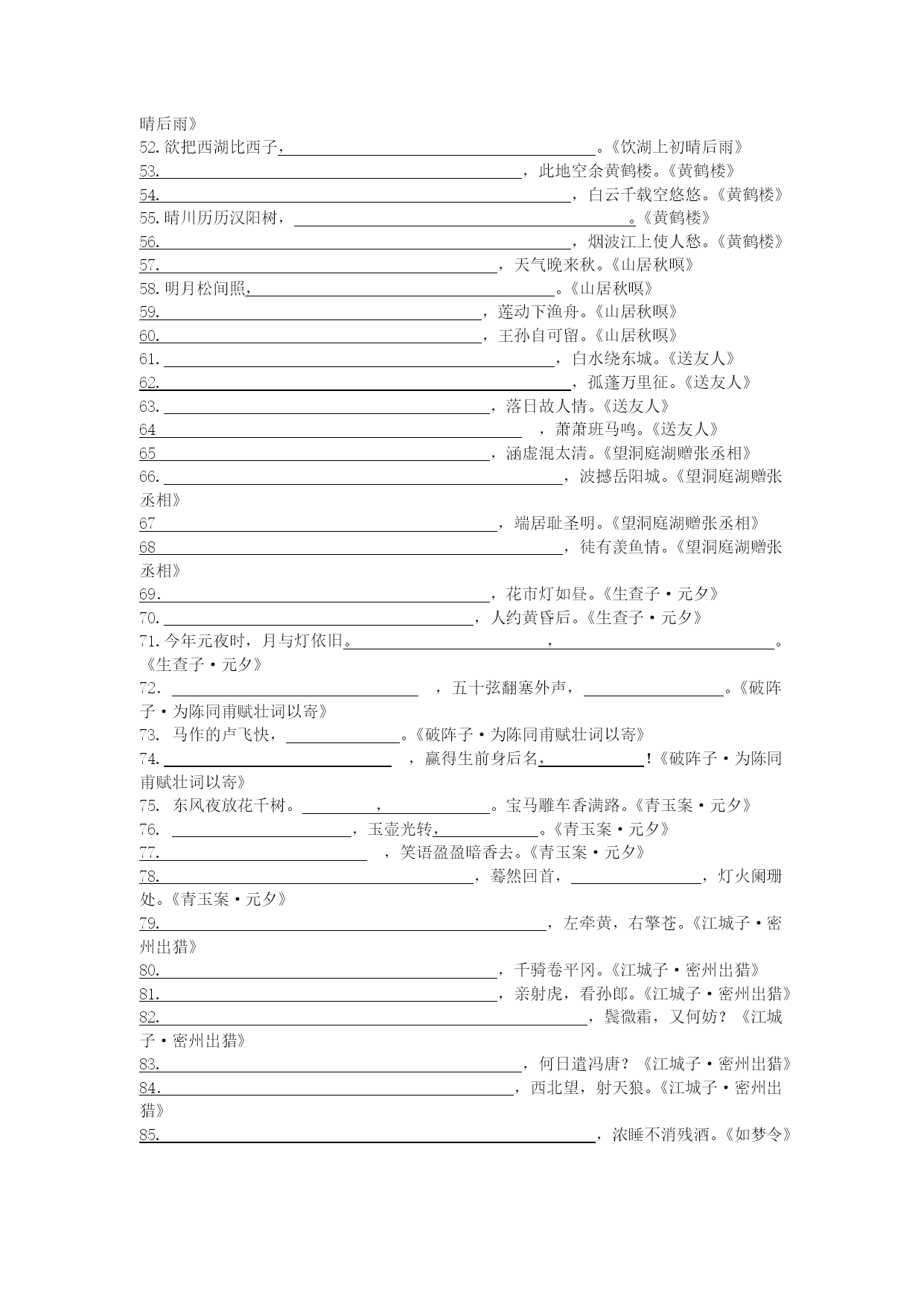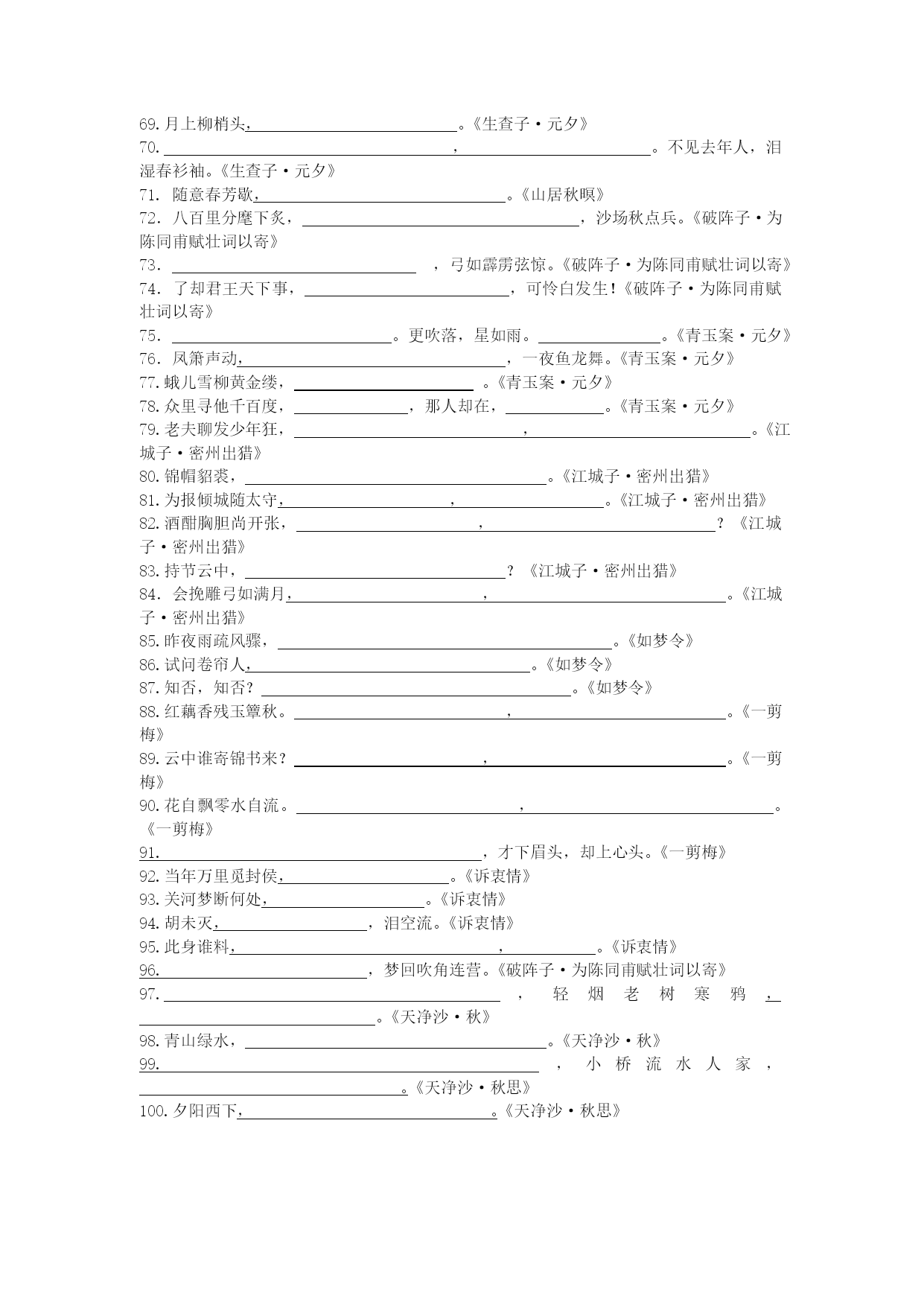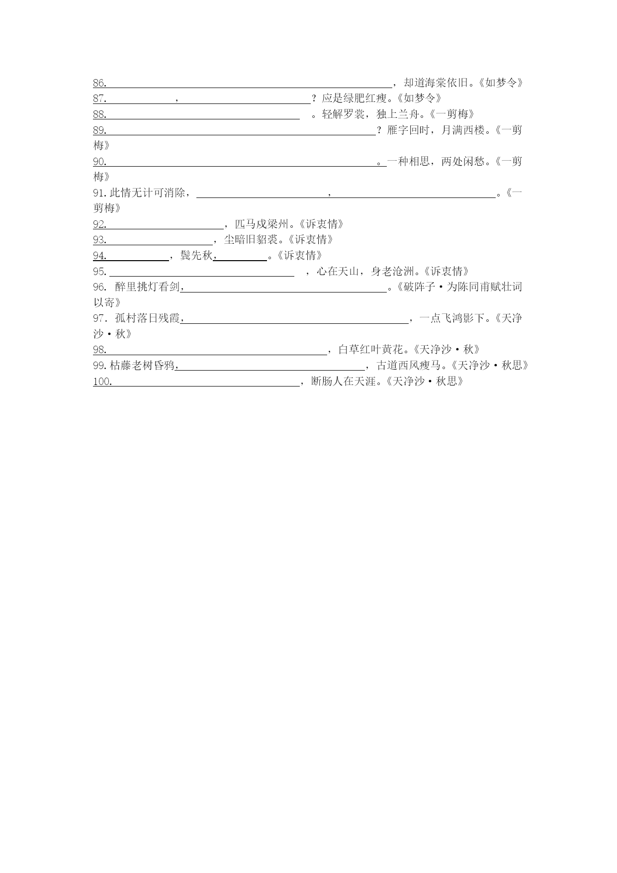 中考诗词曲默写训练卷A1.,渚清沙白鸟飞回。《登高》2.无边落木萧萧下,。《登高》3.万里悲秋常作客,。《登高》4.,潦倒新停浊酒杯。《登高》5.卖炭翁,。《卖炭翁》6.,两鬓苍苍十指黑。《卖炭翁》7.?身上衣裳口中食。《卖炭翁》8.可怜身上衣正单,。《卖炭翁》9.,晓驾炭车辗冰辙。《卖炭翁》10.,市南门外泥中歇。《卖炭翁》11.翩翩两骑来是谁?。《卖炭翁》12.,回车叱牛牵向北。《卖炭翁》13.,,宫使驱将惜不得。《卖炭翁》14.,系向牛头充炭直。《卖炭翁》15.,二十三年弃置身。《酬乐天扬州初逢席上见赠》16.,到乡翻似烂柯人。《酬乐天扬州初逢席上见赠》17、,暂凭杯酒长精神。《酬乐天扬州初逢席上见赠》18.,病树前头万木春。《酬乐天扬州初逢席上见赠》19.,初日照高林。《题破山寺后禅院》20.,禅房花木深。《题破山寺后禅院》21.,潭影空人心。《题破山寺后禅院》22.,但余钟磬音。《题破山寺后禅院》23.浩荡离愁白日斜,。《己亥杂诗(其五)》24.落红不是无情物,。《己亥杂诗(其五)》25.,中原北望气如山。《书愤》26.,铁马秋风大散关。《书愤》27.,镜中衰鬓已先斑。《书愤》28.,千载谁堪伯仲间。《书愤》29.,天寒白屋贫。《逢雪宿芙蓉山主人》30.,干戈寥落四周星。《过零丁洋》31.,风雪夜归人。《逢雪宿芙蓉山主人》32.,身世浮沉雨打萍。《过零丁洋》33.,花木成畦手自栽。《书湖阴先生壁》34.,零丁洋里叹零丁。《过零丁洋》35.,两山排闼送青来。《书湖阴先生壁》36.人生自古谁无死,。《过零丁洋》37.葡萄美酒夜光杯,。《凉州词》38.,艨艟巨舰一毛轻。《观书有感(其二)》39.醉卧沙场君莫笑,。《凉州词》40.,此日中流自在行。《观书有感(其二)》41.,将军猎渭城。《观猎》42.,雪尽马蹄轻。《观猎》43.,还归细柳营。《观猎》44.回看射雕处,。《观猎》45.岱宗夫如何?。《望岳》46.杨花落尽子规啼,。《闻王昌龄左迁龙标遥有此寄》47.造化钟神秀,。《望岳》48.,随君直到夜郎西。《闻王昌龄左迁龙标遥有此寄》49.,决眦入归鸟。《望岳》50.,一览众山小。《望岳》51.水光潋滟晴方好,。《饮湖上初晴后雨》52.,淡妆浓抹总相宜。《饮湖上初晴后雨》53.昔人已乘黄鹤去,。《黄鹤楼》54.黄鹤一去不复返,。《黄鹤楼》55.,芳草萋萋鹦鹉洲。《黄鹤楼》56.日暮乡关何处是,。《黄鹤楼》57.空山新雨后,。《山居秋暝》58.,清泉石上流。《山居秋暝》59.竹喧归浣女,。《山居秋暝》60.青山横北郭,。《送友人》61.此地一为别,。《送友人》62.浮云游子意,。《送友人》63.挥手自兹去,。《送友人》64.八月湖水平,。《望洞庭湖赠张丞相》65.气蒸云梦泽,。《望洞庭湖赠张丞相》66.欲济无舟楫,。《望洞庭湖赠张丞相》67.坐观垂钓者,。《望洞庭湖赠张丞相》68.去年元夜时,。《生查子·元夕》69.月上柳梢头,。《生查子·元夕》70.,。不见去年人,泪湿春衫袖。《生查子·元夕》71.随意春芳歇,。《山居秋暝》72.八百里分麾下炙,,沙场秋点兵。《破阵子·为陈同甫赋壮词以寄》73.,弓如霹雳弦惊。《破阵子·为陈同甫赋壮词以寄》74.了却君王天下事,,可怜白发生!《破阵子·为陈同甫赋壮词以寄》75.。更吹落,星如雨。。《青玉案·元夕》76.凤箫声动,,一夜鱼龙舞。《青玉案·元夕》77.蛾儿雪柳黄金缕,。《青玉案·元夕》78.众里寻他千百度,,那人却在,。《青玉案·元夕》79.老夫聊发少年狂,,。《江城子·密州出猎》80.锦帽貂裘,。《江城子·密州出猎》81.为报倾城随太守,,。《江城子·密州出猎》82.酒酣胸胆尚开张,,?《江城子·密州出猎》83.持节云中,?《江城子·密州出猎》84.会挽雕弓如满月,,。《江城子·密州出猎》85.昨夜雨疏风骤,。《如梦令》86.试问卷帘人,。《如梦令》87.知否,知否?。《如梦令》88.红藕香残玉簟秋。,。《一剪梅》89.云中谁寄锦书来?,。《一剪梅》90.花自飘零水自流。,。《一剪梅》91.,才下眉头,却上心头。《一剪梅》92.当年万里觅封侯,。《诉衷情》93.关河梦断何处,。《诉衷情》94.胡未灭,,泪空流。《诉衷情》95.此身谁料,,。《诉衷情》96.,梦回吹角连营。《破阵子·为陈同甫赋壮词以寄》97.,轻烟老树寒鸦,。《天净沙·秋》98.青山绿水,。《天净沙·秋》99.,小桥流水人家,。《天净沙·秋思》100.夕阳西下,。《天净沙·秋思》