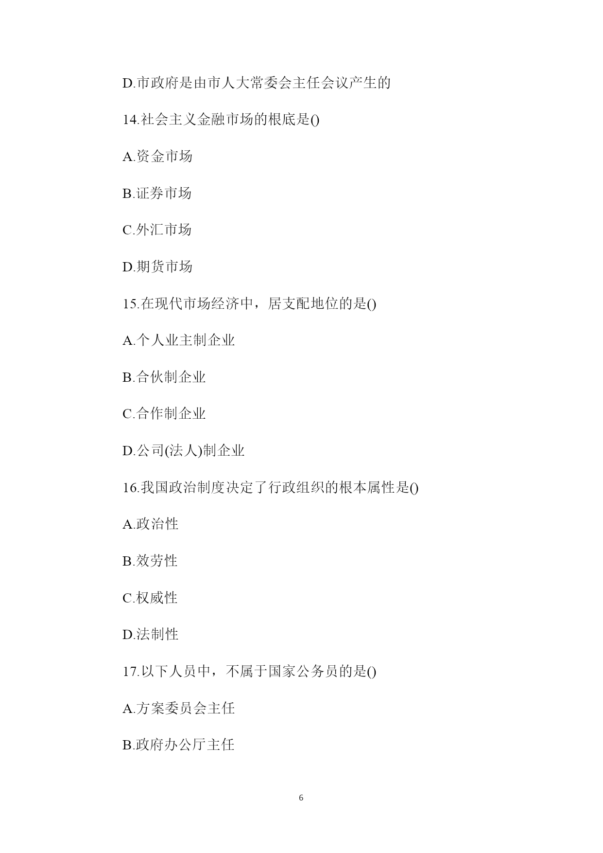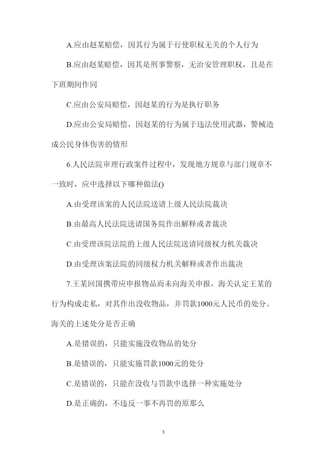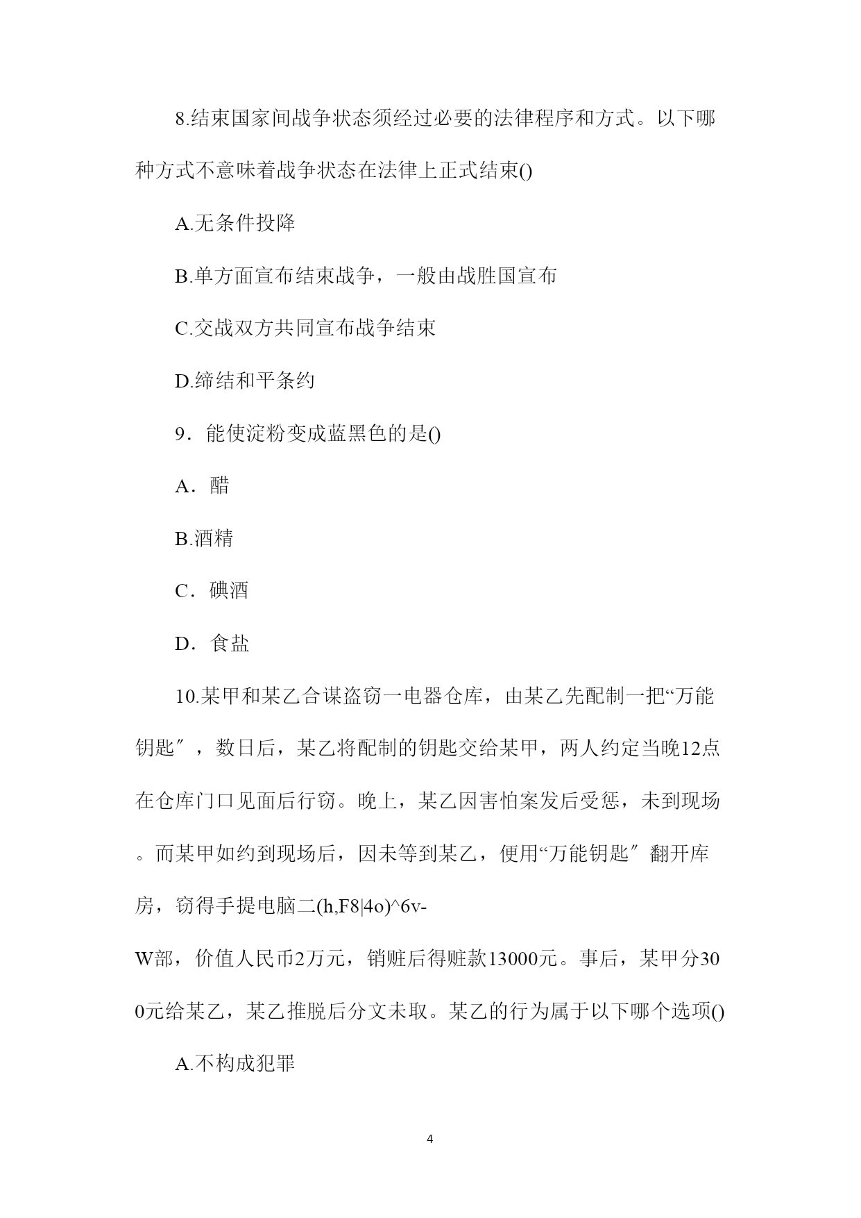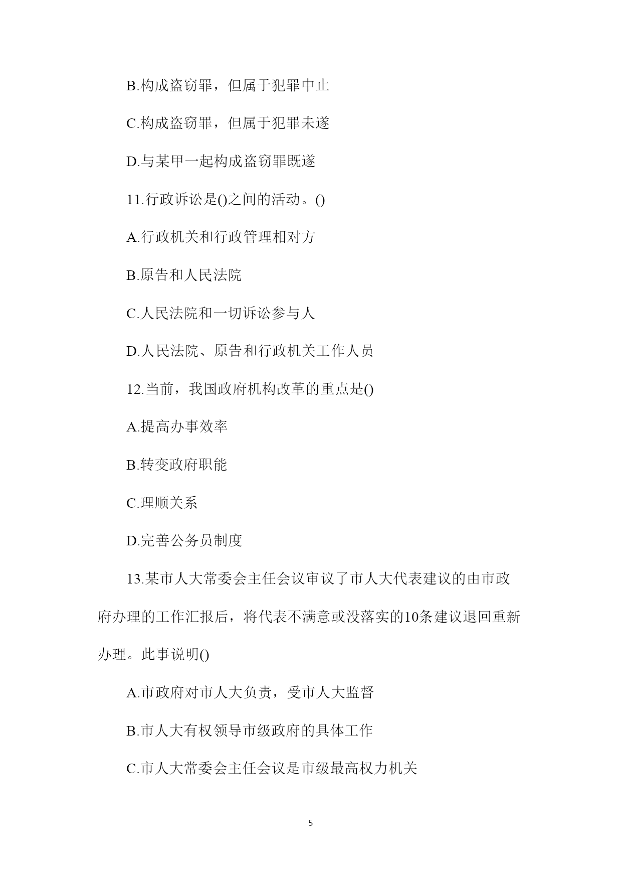 PAGEPAGE26公务员行测常识练习题1.在行政诉讼中,人民法院实施以下哪一行为须征得原告同意()A.通知第三人参加诉讼B.追回或变更被告C.决定合并审理D.允许被告改变具体行政行为2.海鱼的鳃丝上有一种()可以把血液带来的盐分及时排出体外,因此海鱼不咸()A.排盐细胞B.过滤器C.吸收器D.分解盐细胞3.甲与乙系大学同班同学,1987年甲大学毕业后赴加拿大留学并定居加拿大,1993年取得加拿大国籍。1988年乙赴美国留学,1993年成为美国加州永久居民。1995年甲乙同游欧洲,并随后在意大利按当地法律结婚。1996年乙回到中国,不再与甲来往。一年后,乙向中国法院提出与甲离婚。中国法院在认定甲、乙的婚姻是否有效时,应适用何国法律()A.美国加州法律B.加拿大法律C.意大利法律D.中国法律4.1994年6月,赵某被法院以受贿罪判处有期徒刑2年,以贪污罪判处有期徒刑3年,合并执行有期徒刑4年。赵某服刑后不断申诉。1998年2月,法院经审判监督程序对该案再审。再审判决维持了原审法院对赵某受贿罪的判决局部,撤销了对赵某贪污罪的判决局部,随即释放。赵某提起国家赔偿请求,对其请求应如何处理()A.决定不予赔偿B.决定对赵某从1994年6月至1998年2月受羁押期间的损失给予赔偿C.决定对赵某从1996年至1998年2月受羁押期间的损失给予赔偿D.决定对赵某从1997年6月至1998年2月受羁押期间的损失给予赔偿5.某市公安局刑事警察赵某下班期间发现有人斗殴,即予以制止。正巧打架的马某与赵某有隙,便对赵某出言不逊。赵某大怒,拔枪将马某击伤。以下关于赔偿责任的说法正确的选项是()A.应由赵某赔偿,因其行为属于行使职权无关的个人行为B.应由赵某赔偿,因其是刑事警察,无治安管理职权,且是在下班期间作同C.应由公安局赔偿,因赵某的行为是执行职务D.应由公安局赔偿,因赵某的行为属于违法使用武器,警械造成公民身体伤害的情形6.人民法院审理行政案件过程中,发现地方规章与部门规章不一致时,应中选择以下哪种做法()A.由受理该案的人民法院送请上级人民法院裁决B.由最高人民法院送请国务院作出解释或者裁决C.由受理该院法院的上级人民法院送请同级权力机关裁决D.由受理该案法院的同级权力机关解释或者作出裁决7.王某回国携带应申报物品而未向海关申报,海关认定王某的行为构成走私,对其作出没收物品,并罚款1000元人民币的处分。海关的上述处分是否正确A.是错误的,只能实施没收物品的处分B.是错误的,只能实施罚款1000元的处分C.是错误的,只能在没收与罚款中选择一种实施处分D.是正确的,不违反一事不再罚的原那么8.结束国家间战争状态须经过必要的法律程序和方式。以下哪种方式不意味着战争状态在法律上正式结束()A.无条件投降B.单方面宣布结束战争,一般由战胜国宣布C.交战双方共同宣布战争结束D.缔结和平条约9.能使淀粉变成蓝黑色的是()A.醋B.酒精C.碘酒D.食盐10.某甲和某乙合谋盗窃一电器仓库,由某乙先配制一把“万能钥匙〞,数日后,某乙将配制的钥匙交给某甲,两人约定当晚12点在仓库门口见面后行窃。晚上,某乙因害怕案发后受惩,未到现场。而某甲如约到现场后,因未等到某乙,便用“万能钥匙〞翻开库房,窃得手提电脑二(h,F8|4o)^6v-W部,价值人民币2万元,销赃后得赃款13000元。事后,某甲分300元给某乙,某乙推脱后分文未取。某乙的行为属于以下哪个选项()A.不构成犯罪B.构成盗窃罪,但属于犯罪中止C.构成盗窃罪,但属于犯罪未遂D.与某甲一起构成盗窃罪既遂11.行政诉讼是()之间的活动。()A.行政机关和行政管理相对方B.原告和人民法院C.人民法院和一切诉讼参与人D.人民法院、原告和行政机关工作人员12.当前,我国政府机构改革的重点是()A.提高办事效率B.转变政府职能C.理顺关系D.完善公务员制度13.某市人大常委会主任会议审议了市人大代表建议的由市政府办理的工作汇报后,将代表不满意或没落实的10条建议退回重新办理。此事说明()A.市政府对市人大负责,受市人大监督B.市人大有权领导市级政府的具体工作C.市人大常委会主任会议是市级最高权力机关D.市政府是由市人大常委会主任会议产生的14.社会主义金融市场的根底是()A.资金市场B.证券市场C.外汇市场D.期货市场15.在现代市场经济中,居支配地位的是()A.个人业主制企业B.合伙制企业C.合作制企业D.公司(法人)制企业16.我国政治制度决定了行政组织的根本属性是()A.政治性B.效劳性C.权威性D.法制性17.以下人员中,不属于