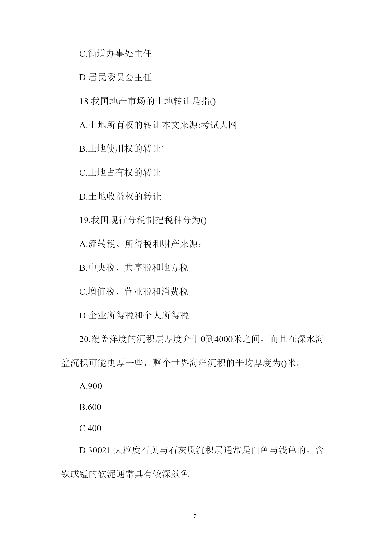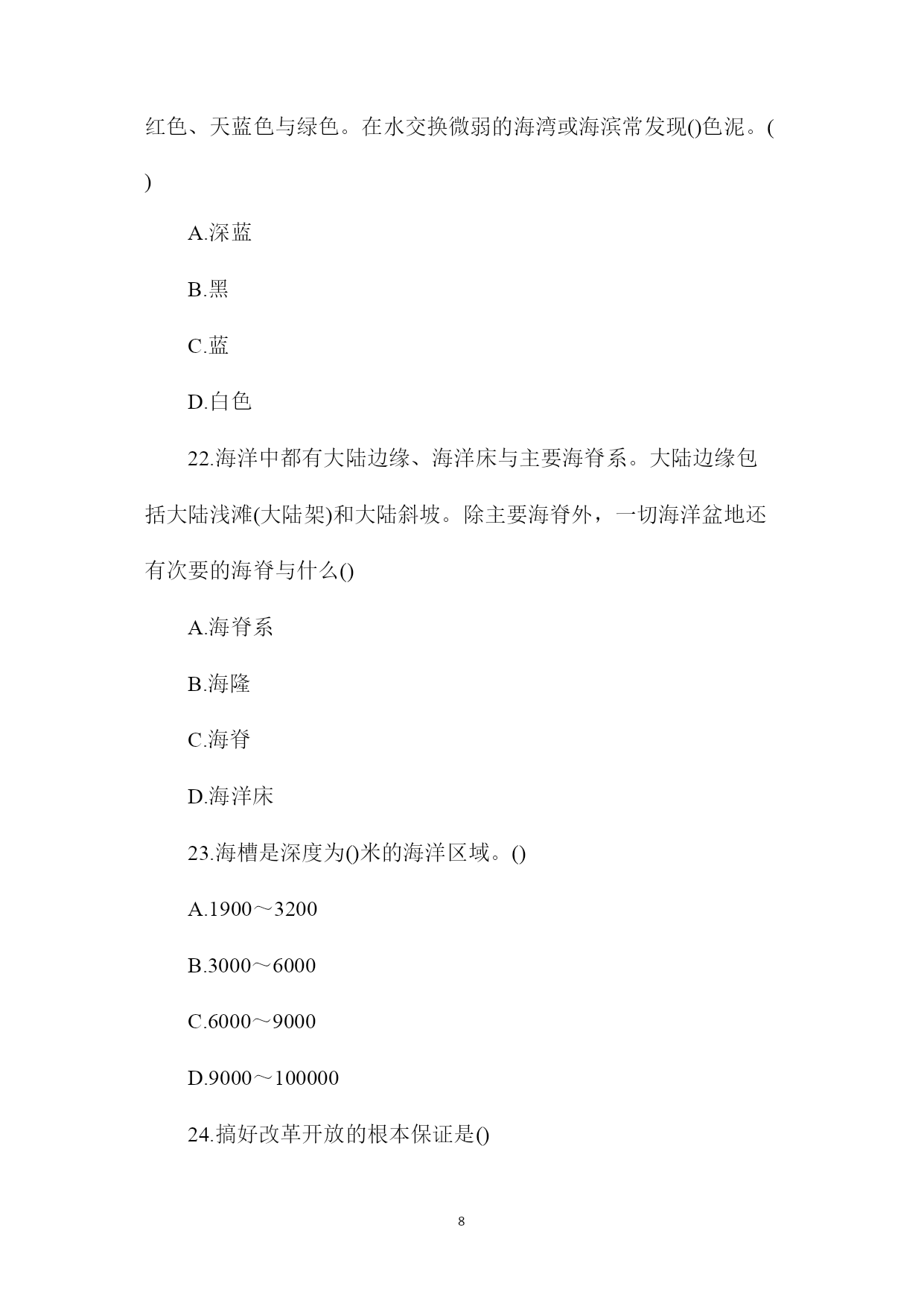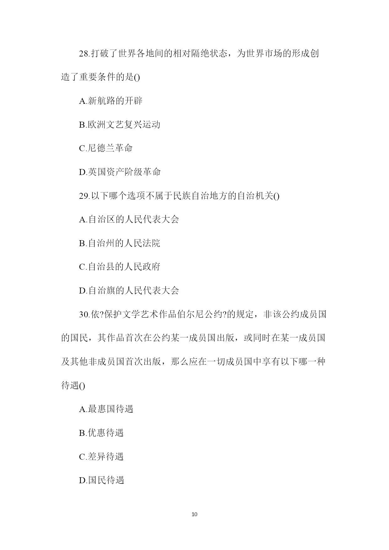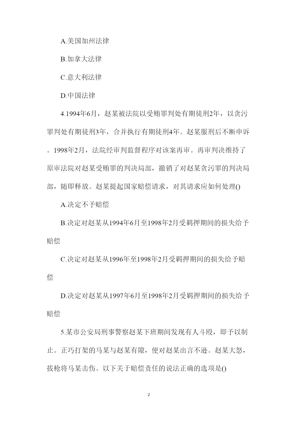 PAGEPAGE26公务员行测常识练习题1.在行政诉讼中,人民法院实施以下哪一行为须征得原告同意()A.通知第三人参加诉讼B.追回或变更被告C.决定合并审理D.允许被告改变具体行政行为2.海鱼的鳃丝上有一种()可以把血液带来的盐分及时排出体外,因此海鱼不咸()A.排盐细胞B.过滤器C.吸收器D.分解盐细胞3.甲与乙系大学同班同学,1987年甲大学毕业后赴加拿大留学并定居加拿大,1993年取得加拿大国籍。1988年乙赴美国留学,1993年成为美国加州永久居民。1995年甲乙同游欧洲,并随后在意大利按当地法律结婚。1996年乙回到中国,不再与甲来往。一年后,乙向中国法院提出与甲离婚。中国法院在认定甲、乙的婚姻是否有效时,应适用何国法律()A.美国加州法律B.加拿大法律C.意大利法律D.中国法律4.1994年6月,赵某被法院以受贿罪判处有期徒刑2年,以贪污罪判处有期徒刑3年,合并执行有期徒刑4年。赵某服刑后不断申诉。1998年2月,法院经审判监督程序对该案再审。再审判决维持了原审法院对赵某受贿罪的判决局部,撤销了对赵某贪污罪的判决局部,随即释放。赵某提起国家赔偿请求,对其请求应如何处理()A.决定不予赔偿B.决定对赵某从1994年6月至1998年2月受羁押期间的损失给予赔偿C.决定对赵某从1996年至1998年2月受羁押期间的损失给予赔偿D.决定对赵某从1997年6月至1998年2月受羁押期间的损失给予赔偿5.某市公安局刑事警察赵某下班期间发现有人斗殴,即予以制止。正巧打架的马某与赵某有隙,便对赵某出言不逊。赵某大怒,拔枪将马某击伤。以下关于赔偿责任的说法正确的选项是()A.应由赵某赔偿,因其行为属于行使职权无关的个人行为B.应由赵某赔偿,因其是刑事警察,无治安管理职权,且是在下班期间作同C.应由公安局赔偿,因赵某的行为是执行职务D.应由公安局赔偿,因赵某的行为属于违法使用武器,警械造成公民身体伤害的情形6.人民法院审理行政案件过程中,发现地方规章与部门规章不一致时,应中选择以下哪种做法()A.由受理该案的人民法院送请上级人民法院裁决B.由最高人民法院送请国务院作出解释或者裁决C.由受理该院法院的上级人民法院送请同级权力机关裁决D.由受理该案法院的同级权力机关解释或者作出裁决7.王某回国携带应申报物品而未向海关申报,海关认定王某的行为构成走私,对其作出没收物品,并罚款1000元人民币的处分。海关的上述处分是否正确A.是错误的,只能实施没收物品的处分B.是错误的,只能实施罚款1000元的处分C.是错误的,只能在没收与罚款中选择一种实施处分D.是正确的,不违反一事不再罚的原那么8.结束国家间战争状态须经过必要的法律程序和方式。以下哪种方式不意味着战争状态在法律上正式结束()A.无条件投降B.单方面宣布结束战争,一般由战胜国宣布C.交战双方共同宣布战争结束D.缔结和平条约9.能使淀粉变成蓝黑色的是()A.醋B.酒精C.碘酒D.食盐10.某甲和某乙合谋盗窃一电器仓库,由某乙先配制一把“万能钥匙〞,数日后,某乙将配制的钥匙交给某甲,两人约定当晚12点在仓库门口见面后行窃。晚上,某乙因害怕案发后受惩,未到现场。而某甲如约到现场后,因未等到某乙,便用“万能钥匙〞翻开库房,窃得手提电脑二(h,F8|4o)^6v-W部,价值人民币2万元,销赃后得赃款13000元。事后,某甲分300元给某乙,某乙推脱后分文未取。某乙的行为属于以下哪个选项()A.不构成犯罪B.构成盗窃罪,但属于犯罪中止C.构成盗窃罪,但属于犯罪未遂D.与某甲一起构成盗窃罪既遂11.行政诉讼是()之间的活动。()A.行政机关和行政管理相对方B.原告和人民法院C.人民法院和一切诉讼参与人D.人民法院、原告和行政机关工作人员12.当前,我国政府机构改革的重点是()A.提高办事效率B.转变政府职能C.理顺关系D.完善公务员制度13.某市人大常委会主任会议审议了市人大代表建议的由市政府办理的工作汇报后,将代表不满意或没落实的10条建议退回重新办理。此事说明()A.市政府对市人大负责,受市人大监督B.市人大有权领导市级政府的具体工作C.市人大常委会主任会议是市级最高权力机关D.市政府是由市人大常委会主任会议产生的14.社会主义金融市场的根底是()A.资金市场B.证券市场C.外汇市场D.期货市场15.在现代市场经济中,居支配地位的是()A.个人业主制企业B.合伙制企业C.合作制企业D.公司(法人)制企业16.我国政治制度决定了行政组织的根本属性是()A.政治性B.效劳性C.权威性D.法制性17.以下人员中,不属于
