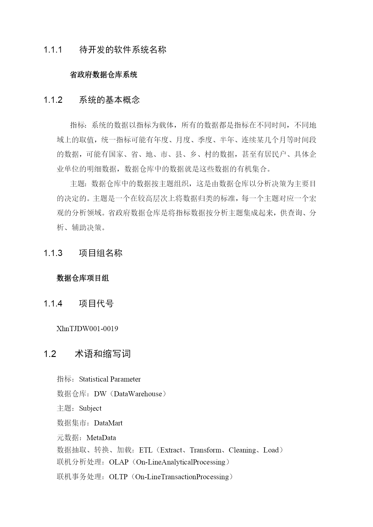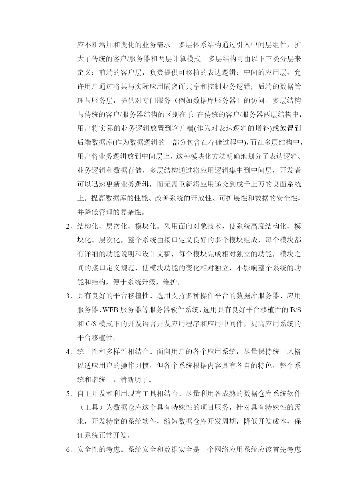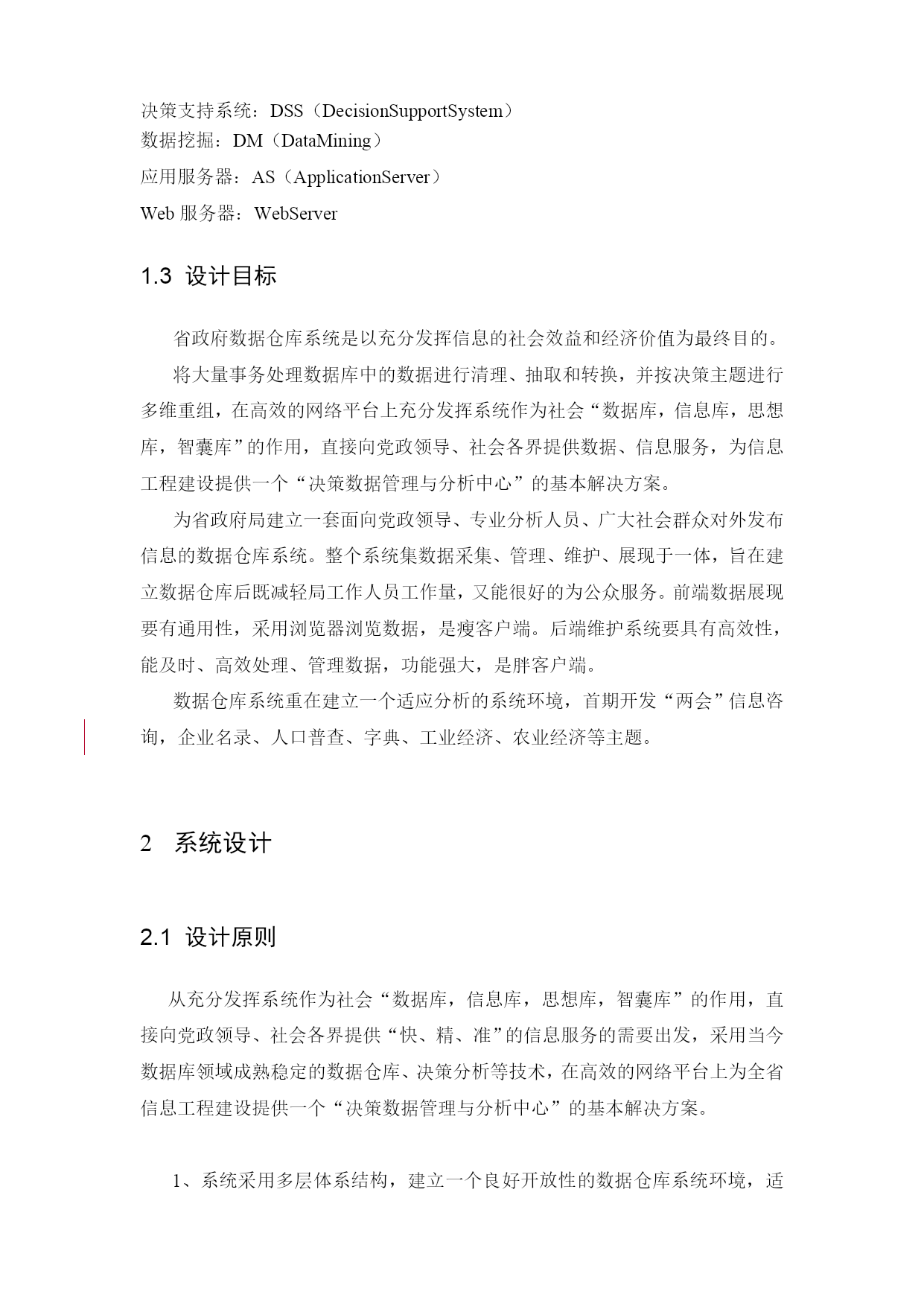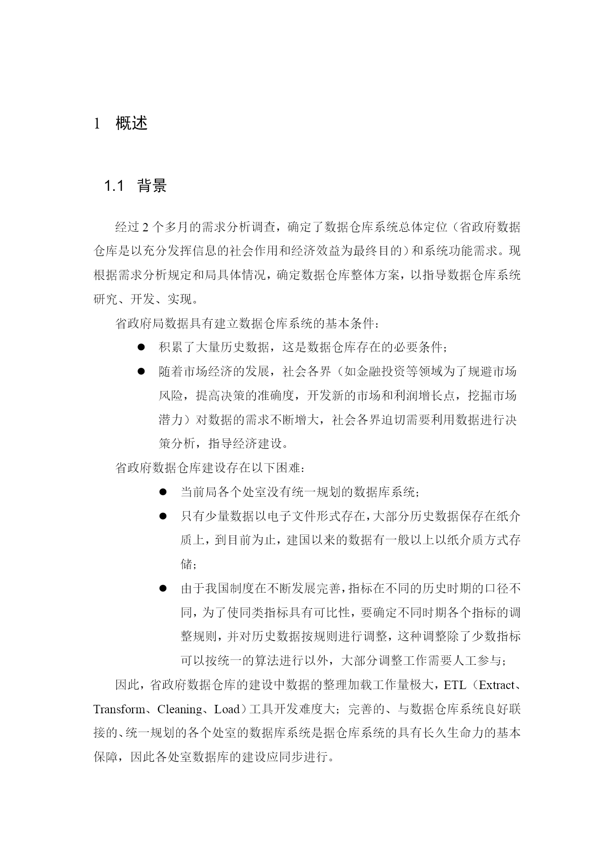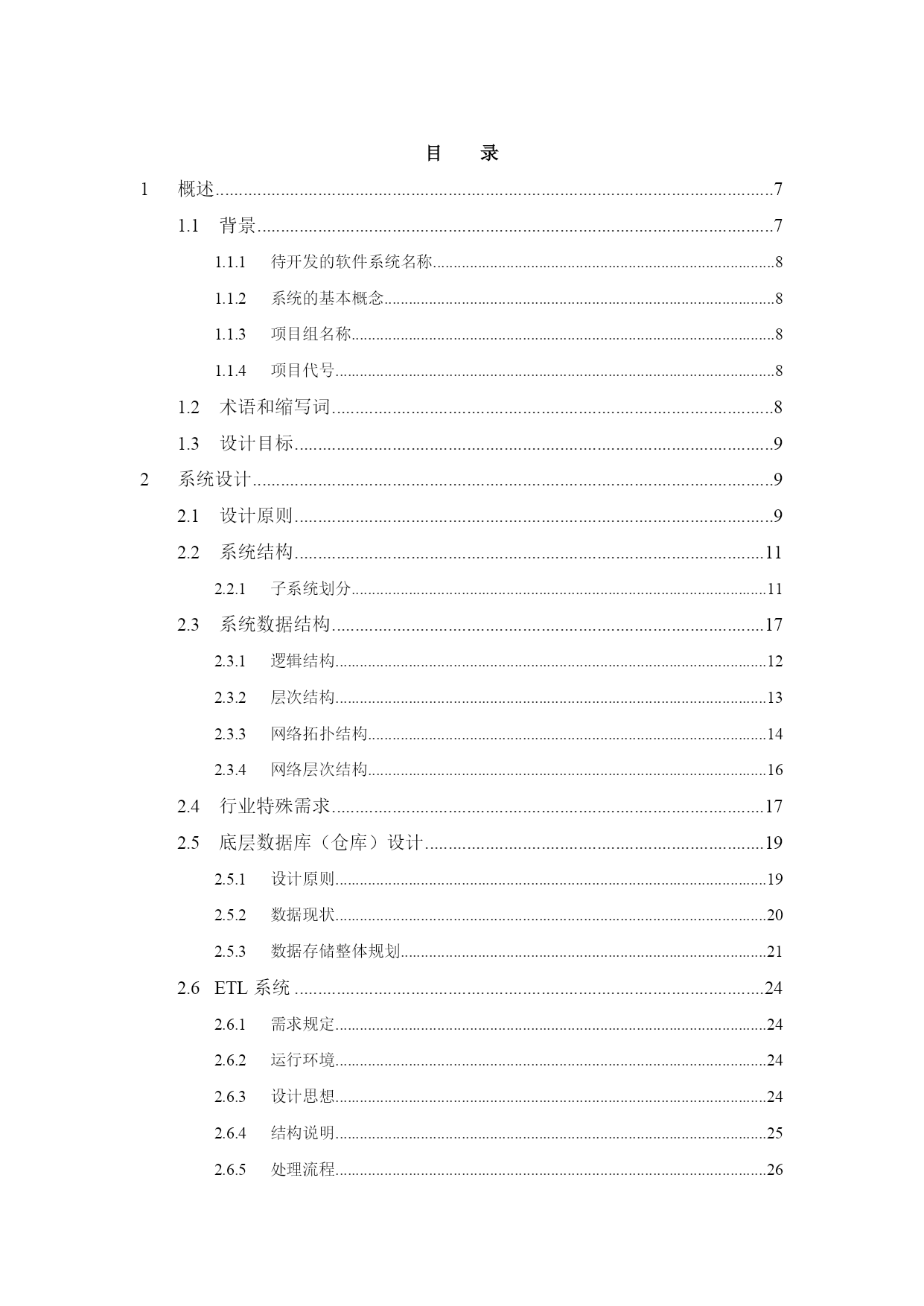 文档编号产品版本密级1.0数据仓库系统总体设计文档作者:______日期:2001/12/20项目经理:______日期:2001/12/28部门经理:____日期:2002/01/08总工办:______日期:2002/01/08目录TOC\o"1-4"\h\zHYPERLINK\l"_Toc535738385"1概述PAGEREF_Toc535738385\h7HYPERLINK\l"_Toc535738386"1.1背景PAGEREF_Toc535738386\h7HYPERLINK\l"_Toc535738387"1.1.1待开发的软件系统名称PAGEREF_Toc535738387\h8HYPERLINK\l"_Toc535738388"1.1.2系统的基本概念PAGEREF_Toc535738388\h8HYPERLINK\l"_Toc535738389"1.1.3项目组名称PAGEREF_Toc535738389\h8HYPERLINK\l"_Toc535738390"1.1.4项目代号PAGEREF_Toc535738390\h8HYPERLINK\l"_Toc535738391"1.2术语和缩写词PAGEREF_Toc535738391\h8HYPERLINK\l"_Toc535738392"1.3设计目标PAGEREF_Toc535738392\h9HYPERLINK\l"_Toc535738393"2系统设计PAGEREF_Toc535738393\h9HYPERLINK\l"_Toc535738394"2.1设计原则PAGEREF_Toc535738394\h9HYPERLINK\l"_Toc535738395"2.2系统结构PAGEREF_Toc535738395\h11HYPERLINK\l"_Toc535738396"2.2.1子系统划分PAGEREF_Toc535738396\h11HYPERLINK\l"_Toc535738397"2.3系统数据结构PAGEREF_Toc535738397\h17HYPERLINK\l"_Toc535738398"2.3.1逻辑结构PAGEREF_Toc535738398\h12HYPERLINK\l"_Toc535738399"2.3.2层次结构PAGEREF_Toc535738399\h13HYPERLINK\l"_Toc535738400"2.3.3网络拓扑结构PAGEREF_Toc535738400\h14HYPERLINK\l"_Toc535738401"2.3.4网络层次结构PAGEREF_Toc535738401\h16HYPERLINK\l"_Toc535738402"2.4行业特殊需求PAGEREF_Toc535738402\h17HYPERLINK\l"_Toc535738403"2.5底层数据库(仓库)设计PAGEREF_Toc535738403\h19HYPERLINK\l"_Toc535738404"2.5.1设计原则PAGEREF_Toc535738404\h19HYPERLINK\l"_Toc535738405"2.5.2数据现状PAGEREF_Toc535738405\h20HYPERLINK\l"_Toc535738406"2.5.3数据存储整体规划PAGEREF_Toc535738406\h21HYPERLINK\l"_Toc535738407"2.6ETL系统PAGEREF_Toc535738407\h24HYPERLINK\l"_Toc535738408"2.6.1需求规定PAGEREF_Toc535738408\h24HYPERLINK\l"_Toc535738409"2.6.2运行环境PAGEREF_Toc535738409\h24HYPERLINK\l"_Toc535738410"2.6.3设计思想PAGEREF_Toc535738410\h24HYPERLINK\l"_Toc535738411"2.6.4结构说明PAGEREF_Toc535738411\h25HYPERLINK