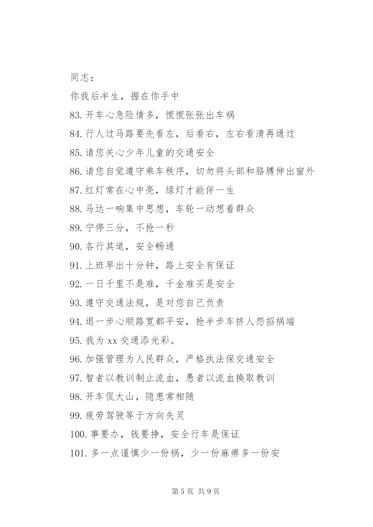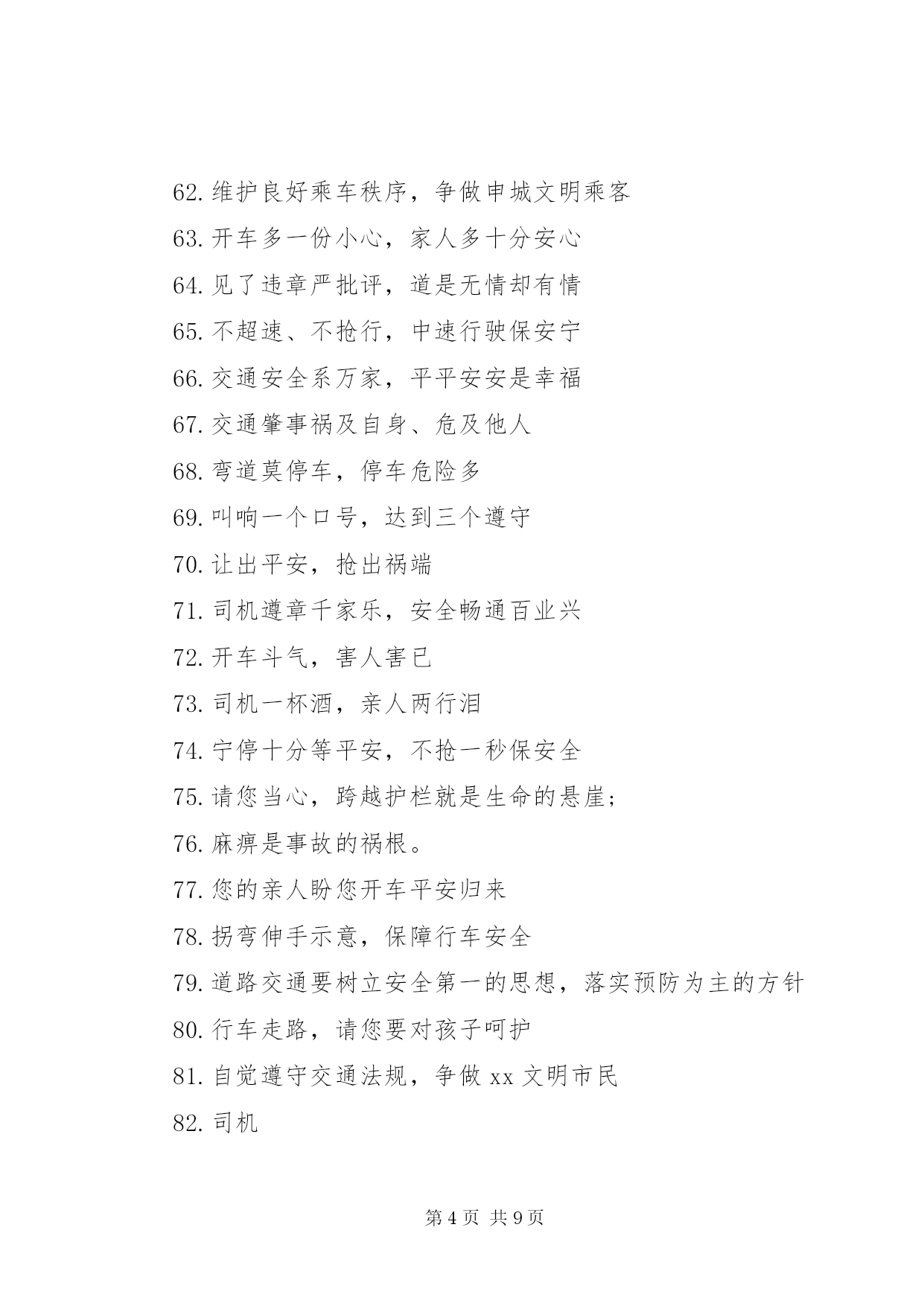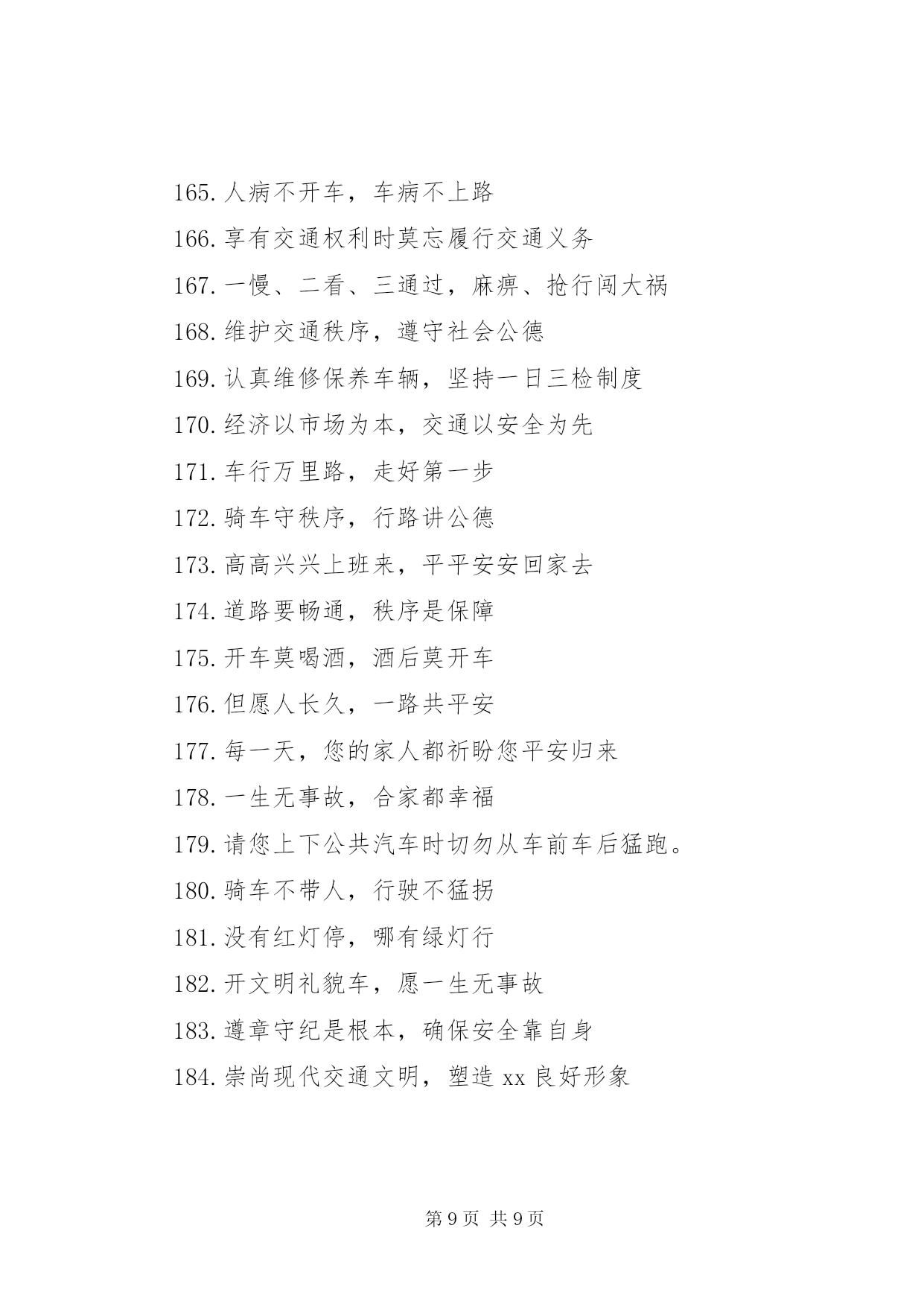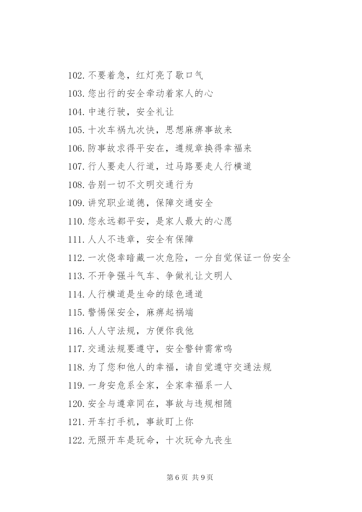 第PAGE\*Arabic\*MERGEFORMAT9页共NUMPAGES\*MERGEFORMAT9页交通安全标语宣传标语交通安全标语宣传标语1.行车慎为本,开车礼当先2.铁路道口险情多,停车、了望再通过。3.让一让道路通畅,让一让安全有保障,让一让心情更舒畅4.进一步将受到谴责,退一步将得到尊重5.交通法规在心中,交通安全在手中6.人行横道车让人,各种车道人让车7.祝您一路平安。8.要遵守交规,不要乱行乱停9.恪守交规,法律为您生命护航10.要做英雄人,不开英雄车11.珍爱生命不要翻越护栏12.谨慎驾驶,保证安全13.多拉快跑,凶多吉少14.交通事故不长眼,你凶他就险15.出行时,切记系上交通法规这条安全带16.各行其道,安全可靠17.创造良好交通环境。18.行人过马路不能斜穿、也勿猛跑19.挣金山,挣银山,交通安全是靠山20.安全开车是大事,文明走路非小节21.骑车上路别着急,争、超、抢道不安全22.不开带病车上路23.行人一生平安,行车一路平安24.遵章守规连你我,道路畅通有保障25.交通法规是您生命之友。26.骑好车、走好路、安全伴您每一步27.遵守交通信号,遵守交通标志,遵守交通标线28.树立文明意识,搞好交通秩序29.违规是交通事故的祸根,侥幸是交通事故的隐患30.良药苦口利于病,交通规则利于行31.路好车好安全最好,慢行快行平安才行32.讲究交通公德,遵守交通法规33.车铃车闸齐全,维系您的安全34.遵守交规得平安,道路畅通保安全35.骑车抢行一秒,危险增加十分36.交通安全抛脑后,交通事故在前头37.您保持车况良好,车容整洁38.交通安全在我心中。39.加强综合治理,保障交通安全40.学龄前儿童上街要有成年人带领41.穿马路,跨护栏,少公德,多危险42.上有老,下有小,出了交通事故不得了43.宣传交通法规,提高交通文明意识44.最大的浪费是事故,最大的节约是安全45.行横道是您横过马路的安全带。46.人行道车莫占,车行道人莫钻47.您是xx的客人,您是遵章守规的楷模48.酒后开车,危险万分。49.行经路口要观望,拐弯示意要礼让50.勿以快慢论英雄,安全行车最光荣51.我礼你让,道路通畅52.交通畅通有序,管理科学高效,执法文明严格53.安全为了生产,生产必须安全54.多一些谨慎,多一些安全55.迎世博,为xx争光56.请您关心老年人的交通安全57.交通法规关系着您和家人的安全与幸福58.保险赔钱不赔命59.一人出事故,全家受痛苦60.侥幸躲过千次,出事就在一次61.三躲不如一停62.维护良好乘车秩序,争做申城文明乘客63.开车多一份小心,家人多十分安心64.见了违章严批评,道是无情却有情65.不超速、不抢行,中速行驶保安宁66.交通安全系万家,平平安安是幸福67.交通肇事祸及自身、危及他人68.弯道莫停车,停车危险多69.叫响一个口号,达到三个遵守70.让出平安,抢出祸端71.司机遵章千家乐,安全畅通百业兴72.开车斗气,害人害已73.司机一杯酒,亲人两行泪74.宁停十分等平安,不抢一秒保安全75.请您当心,跨越护栏就是生命的悬崖;76.麻痹是事故的祸根。77.您的亲人盼您开车平安归来78.拐弯伸手示意,保障行车安全79.道路交通要树立安全第一的思想,落实预防为主的方针80.行车走路,请您要对孩子呵护81.自觉遵守交通法规,争做xx文明市民82.司机同志:你我后半生,握在你手中83.开车心急险情多,慌慌张张出车祸84.行人过马路要先看左,后看右,左右看清再通过85.请您关心少年儿童的交通安全86.请您自觉遵守乘车秩序,切勿将头部和胳膊伸出窗外87.红灯常在心中亮,绿灯才能伴一生88.马达一响集中思想,车轮一动想着群众89.宁停三分,不抢一秒90.各行其道,安全畅通91.上班早出十分钟,路上安全有保证92.一日千里不是难,千金难买是安全93.遵守交通法规,是对您自己负责94.退一步心顺路宽都平安,抢半步车挤人怨招祸端95.我为xx交通添光彩。96.加强管理为人民群众,严格执法保交通安全97.智者以教训制止流血,愚者以流血换取教训98.开车侃大山,隐患常相随99.疲劳驾驶等于方向失灵100.事要办,钱要挣,安全行车是保证101.多一点谨慎少一份祸,少一份麻痹多一份安102.不要着急,红灯亮了歇口气103.您出行的安全牵动着家人的心104.中速行驶,安全礼让105.十次车祸九次快,思想麻痹事故来106.防事故求得平安在,遵规章换得幸福来107.行人要走人行道,过马路要走人行横道108.告别一切不文明交通行为109.讲究职业道德,保障交通安全110.您永远都平安,是家人最大的心愿111.人人不违章,安全有保障112.一次侥幸暗藏一次危险,一分自觉保证一份安全113.不开争强斗气车、争做礼让文