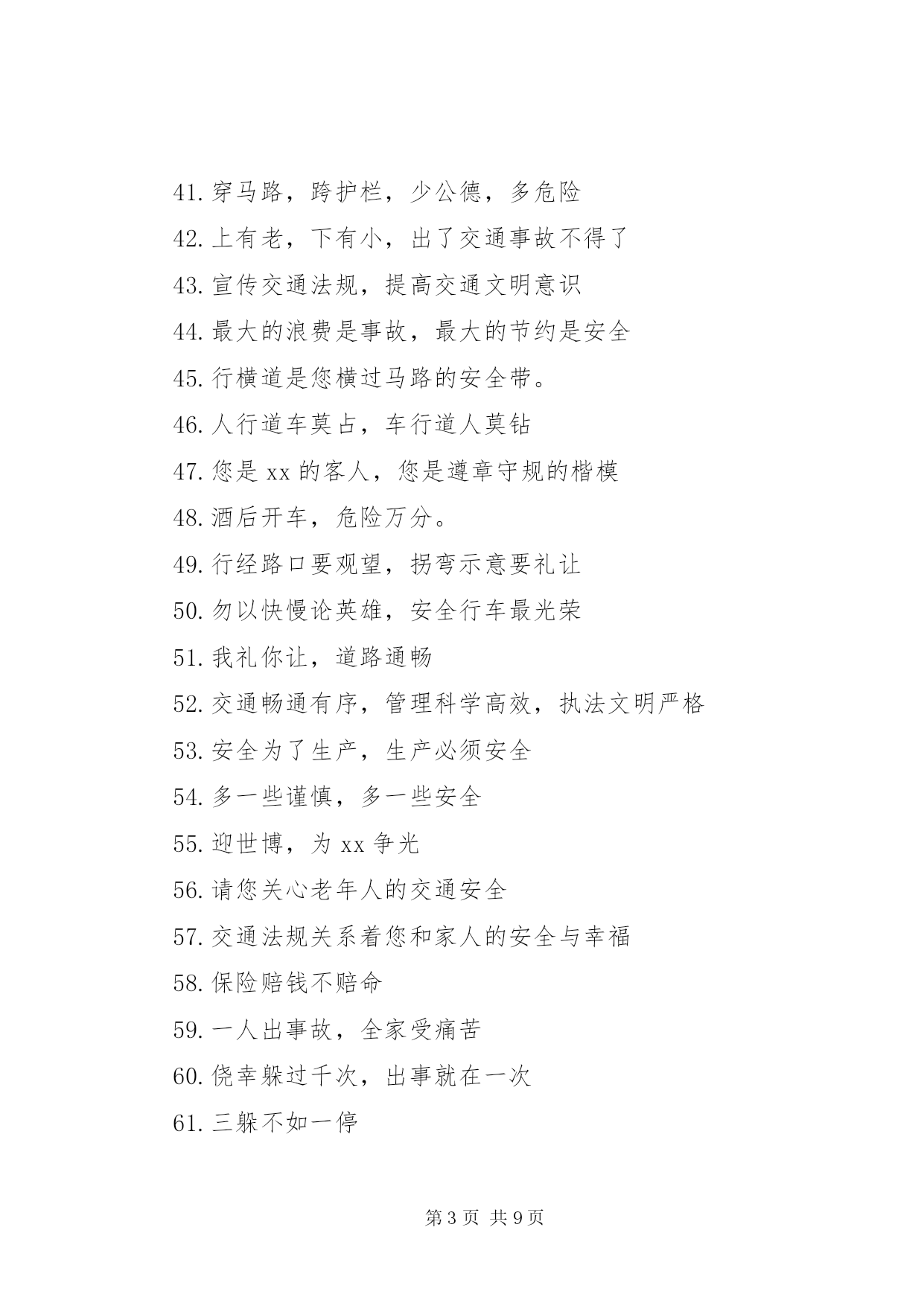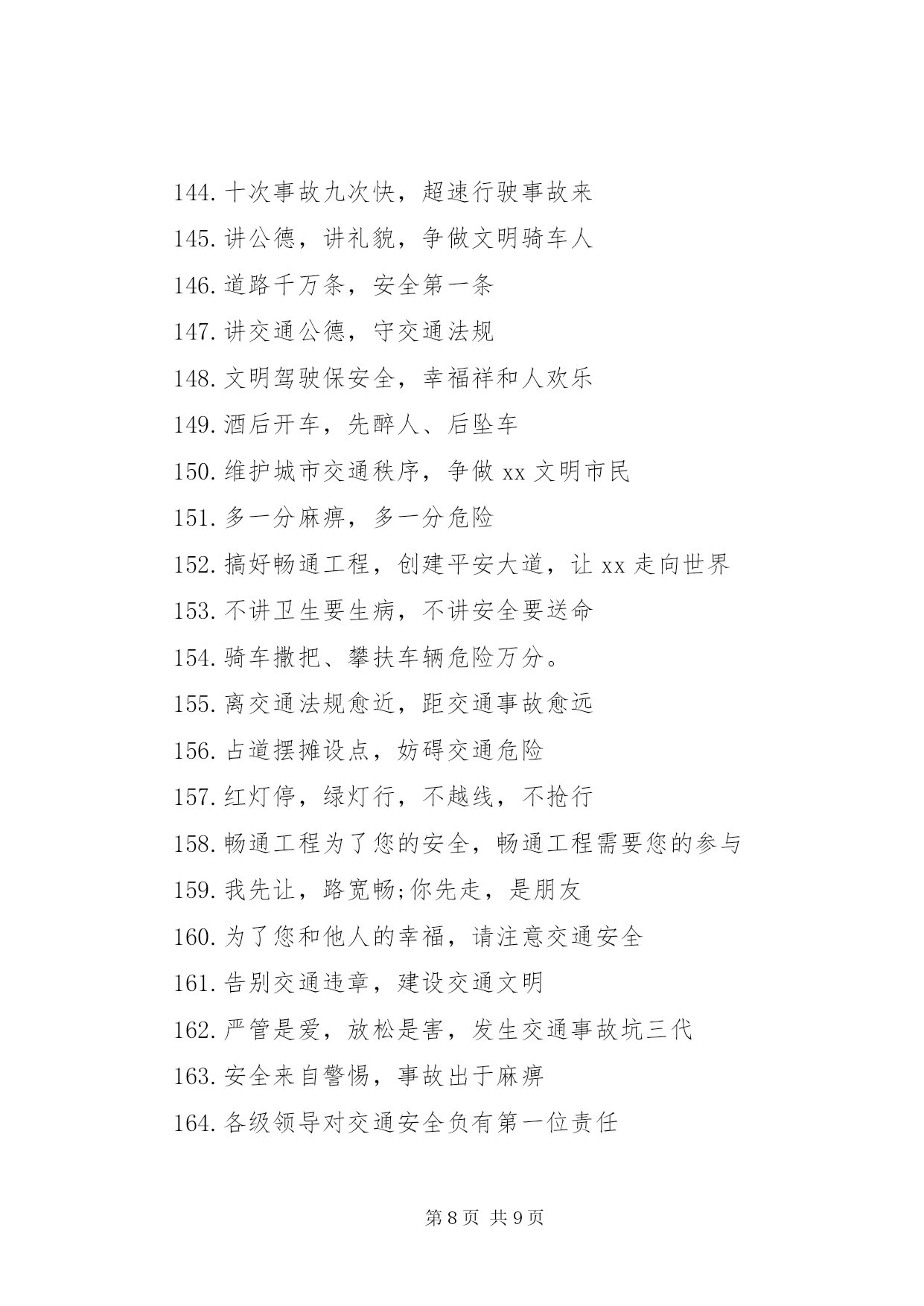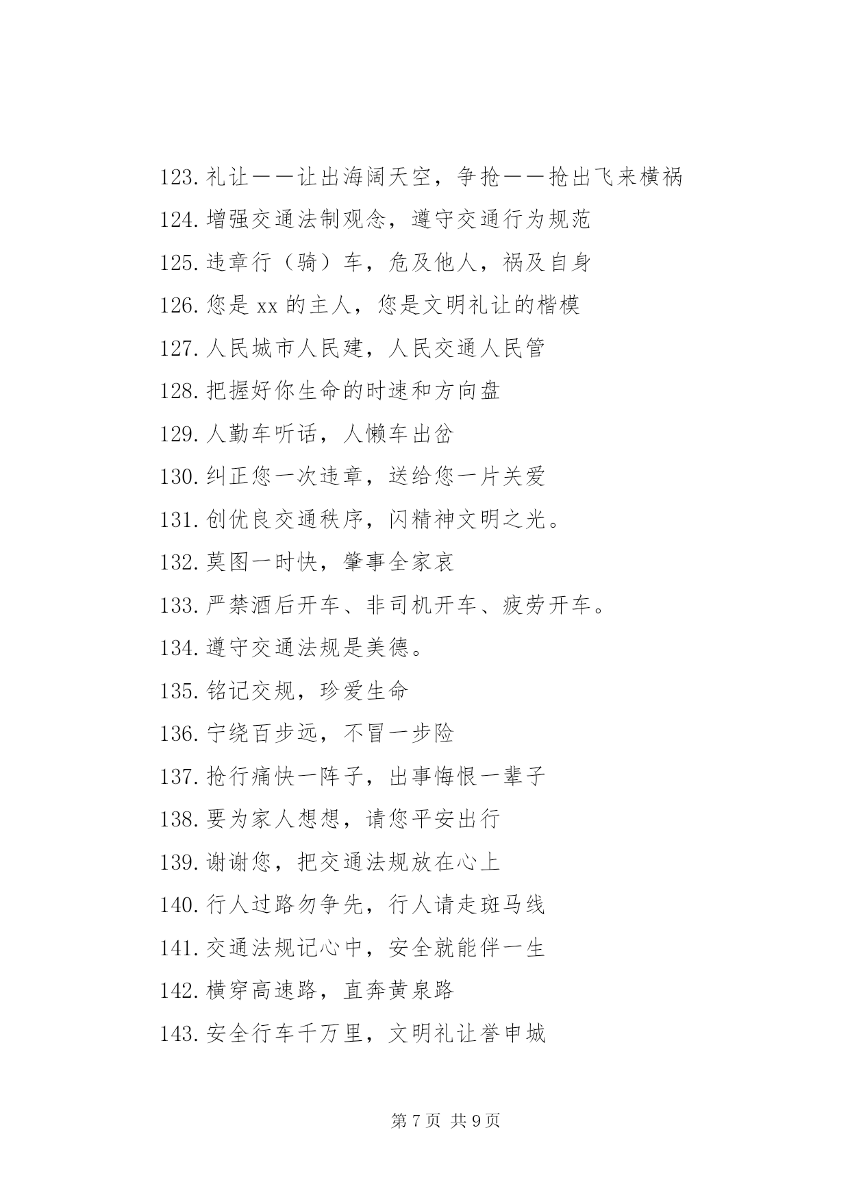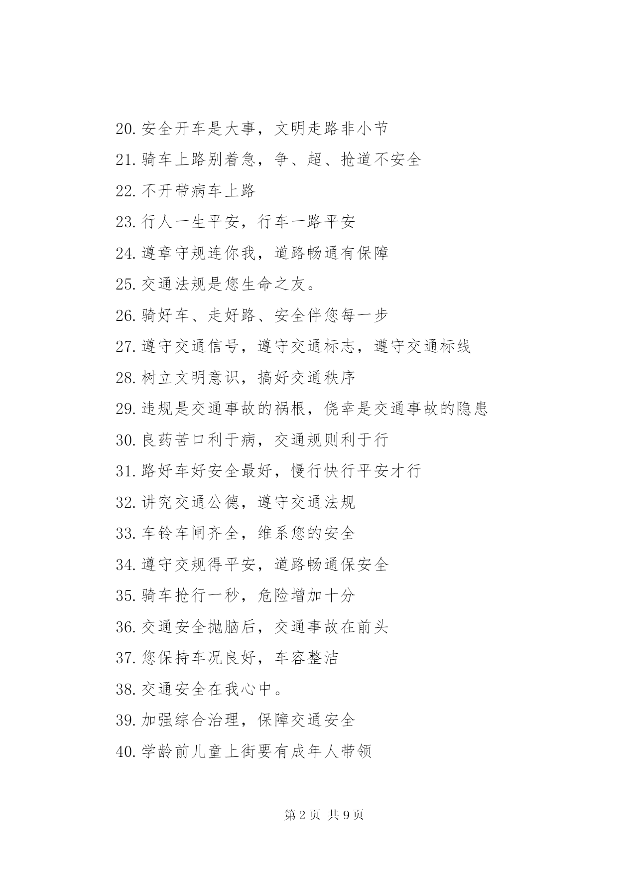 第PAGE\*Arabic\*MERGEFORMAT9页共NUMPAGES\*MERGEFORMAT9页交通安全标语宣传标语交通安全标语宣传标语1.行车慎为本,开车礼当先2.铁路道口险情多,停车、了望再通过。3.让一让道路通畅,让一让安全有保障,让一让心情更舒畅4.进一步将受到谴责,退一步将得到尊重5.交通法规在心中,交通安全在手中6.人行横道车让人,各种车道人让车7.祝您一路平安。8.要遵守交规,不要乱行乱停9.恪守交规,法律为您生命护航10.要做英雄人,不开英雄车11.珍爱生命不要翻越护栏12.谨慎驾驶,保证安全13.多拉快跑,凶多吉少14.交通事故不长眼,你凶他就险15.出行时,切记系上交通法规这条安全带16.各行其道,安全可靠17.创造良好交通环境。18.行人过马路不能斜穿、也勿猛跑19.挣金山,挣银山,交通安全是靠山20.安全开车是大事,文明走路非小节21.骑车上路别着急,争、超、抢道不安全22.不开带病车上路23.行人一生平安,行车一路平安24.遵章守规连你我,道路畅通有保障25.交通法规是您生命之友。26.骑好车、走好路、安全伴您每一步27.遵守交通信号,遵守交通标志,遵守交通标线28.树立文明意识,搞好交通秩序29.违规是交通事故的祸根,侥幸是交通事故的隐患30.良药苦口利于病,交通规则利于行31.路好车好安全最好,慢行快行平安才行32.讲究交通公德,遵守交通法规33.车铃车闸齐全,维系您的安全34.遵守交规得平安,道路畅通保安全35.骑车抢行一秒,危险增加十分36.交通安全抛脑后,交通事故在前头37.您保持车况良好,车容整洁38.交通安全在我心中。39.加强综合治理,保障交通安全40.学龄前儿童上街要有成年人带领41.穿马路,跨护栏,少公德,多危险42.上有老,下有小,出了交通事故不得了43.宣传交通法规,提高交通文明意识44.最大的浪费是事故,最大的节约是安全45.行横道是您横过马路的安全带。46.人行道车莫占,车行道人莫钻47.您是xx的客人,您是遵章守规的楷模48.酒后开车,危险万分。49.行经路口要观望,拐弯示意要礼让50.勿以快慢论英雄,安全行车最光荣51.我礼你让,道路通畅52.交通畅通有序,管理科学高效,执法文明严格53.安全为了生产,生产必须安全54.多一些谨慎,多一些安全55.迎世博,为xx争光56.请您关心老年人的交通安全57.交通法规关系着您和家人的安全与幸福58.保险赔钱不赔命59.一人出事故,全家受痛苦60.侥幸躲过千次,出事就在一次61.三躲不如一停62.维护良好乘车秩序,争做申城文明乘客63.开车多一份小心,家人多十分安心64.见了违章严批评,道是无情却有情65.不超速、不抢行,中速行驶保安宁66.交通安全系万家,平平安安是幸福67.交通肇事祸及自身、危及他人68.弯道莫停车,停车危险多69.叫响一个口号,达到三个遵守70.让出平安,抢出祸端71.司机遵章千家乐,安全畅通百业兴72.开车斗气,害人害已73.司机一杯酒,亲人两行泪74.宁停十分等平安,不抢一秒保安全75.请您当心,跨越护栏就是生命的悬崖;76.麻痹是事故的祸根。77.您的亲人盼您开车平安归来78.拐弯伸手示意,保障行车安全79.道路交通要树立安全第一的思想,落实预防为主的方针80.行车走路,请您要对孩子呵护81.自觉遵守交通法规,争做xx文明市民82.司机同志:你我后半生,握在你手中83.开车心急险情多,慌慌张张出车祸84.行人过马路要先看左,后看右,左右看清再通过85.请您关心少年儿童的交通安全86.请您自觉遵守乘车秩序,切勿将头部和胳膊伸出窗外87.红灯常在心中亮,绿灯才能伴一生88.马达一响集中思想,车轮一动想着群众89.宁停三分,不抢一秒90.各行其道,安全畅通91.上班早出十分钟,路上安全有保证92.一日千里不是难,千金难买是安全93.遵守交通法规,是对您自己负责94.退一步心顺路宽都平安,抢半步车挤人怨招祸端95.我为xx交通添光彩。96.加强管理为人民群众,严格执法保交通安全97.智者以教训制止流血,愚者以流血换取教训98.开车侃大山,隐患常相随99.疲劳驾驶等于方向失灵100.事要办,钱要挣,安全行车是保证101.多一点谨慎少一份祸,少一份麻痹多一份安102.不要着急,红灯亮了歇口气103.您出行的安全牵动着家人的心104.中速行驶,安全礼让105.十次车祸九次快,思想麻痹事故来106.防事故求得平安在,遵规章换得幸福来107.行人要走人行道,过马路要走人行横道108.告别一切不文明交通行为109.讲究职业道德,保障交通安全110.您永远都平安,是家人最大的心愿111.人人不违章,安全有保障112.一次侥幸暗藏一次危险,一分自觉保证一份安全113.不开争强斗气车、争做礼让文