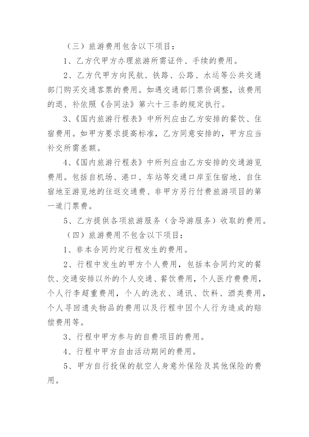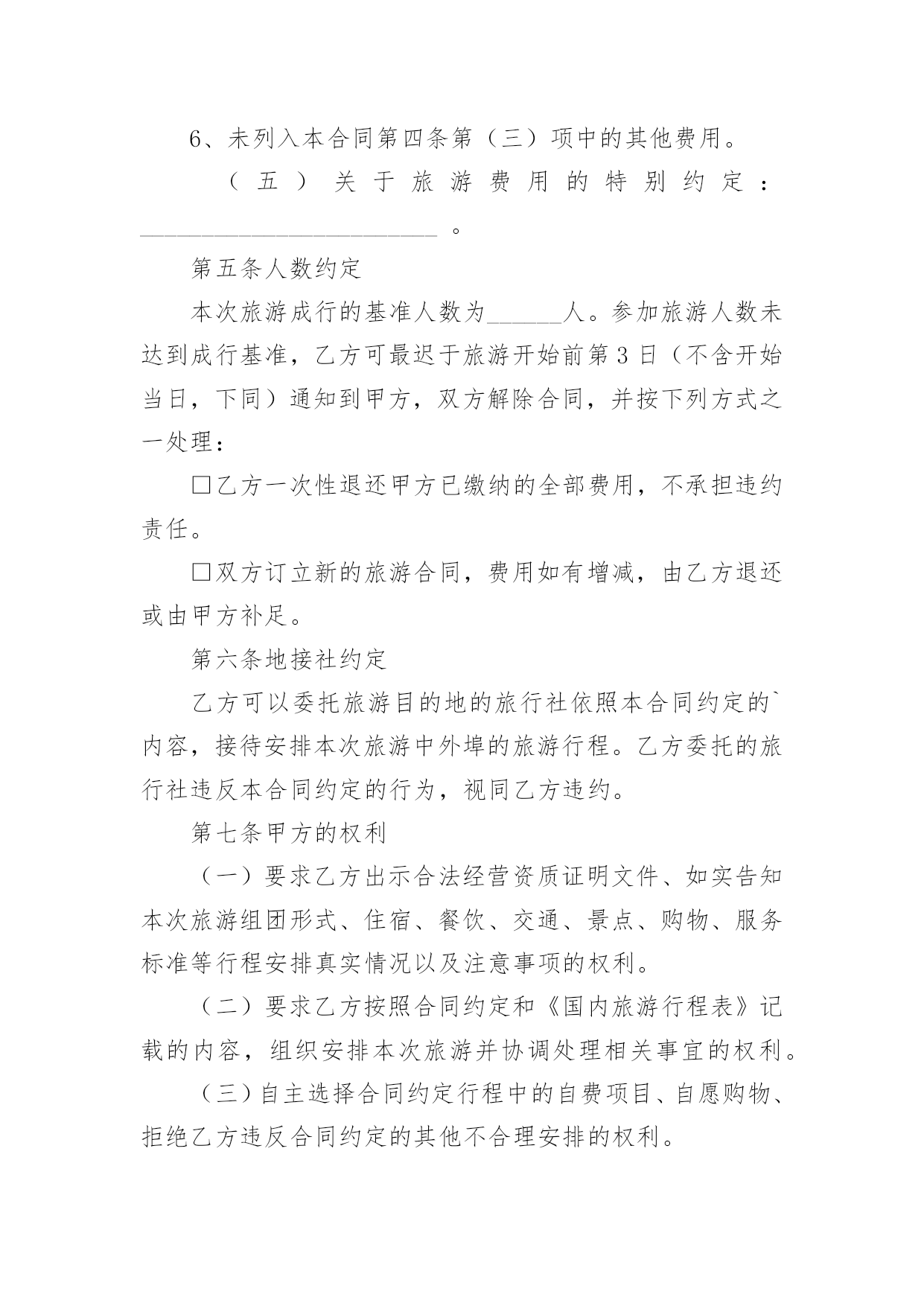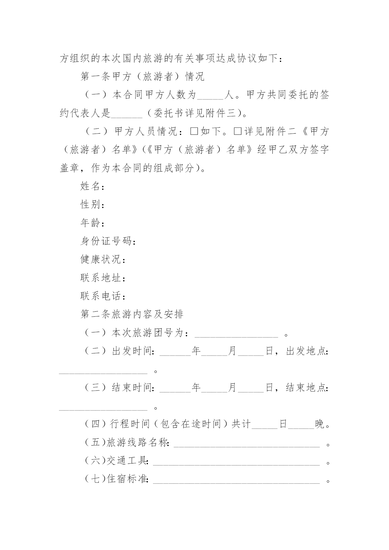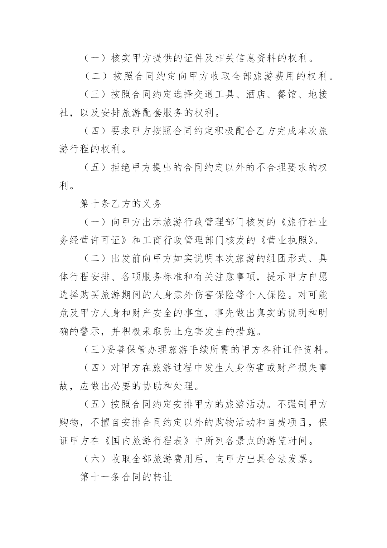 国内旅游合同国内旅游合同集锦15篇随着法律知识的普及,合同的使用频率呈上升趋势,签订合同可以使我们的合法权益得到法律的保障。那么常见的合同书是什么样的呢?下面是小编收集整理的国内旅游合同,供大家参考借鉴,希望可以帮助到有需要的朋友。国内旅游合同1合同编号:___________甲方(旅游者):________身份证号码:____________住所地址:______________联系人:________________联系电话:______________传真或电子邮件:________乙方(组团旅行社):____住所地址:______________联系人:________________联系电话:______________传真或电子邮件:________根据《中华人民共和国合同法》及有关法律、法规和规章的规定,经甲乙双方自愿、平等协商,现就甲方参加由乙方组织的本次国内旅游的有关事项达成协议如下:第一条甲方(旅游者)情况(一)本合同甲方人数为_____人。甲方共同委托的签约代表人是______(委托书详见附件三)。(二)甲方人员情况:□如下。□详见附件二《甲方(旅游者)名单》(《甲方(旅游者)名单》经甲乙双方签字盖章,作为本合同的组成部分)。姓名:性别:年龄:身份证号码:健康状况:联系地址:联系电话:第二条旅游内容及安排(一)本次旅游团号为:________________。(二)出发时间:______年_____月_____日,出发地点:_________________。(三)结束时间:______年_____月_____日,结束地点:_________________。(四)行程时间(包含在途时间)共计_____日_____晚。(五)旅游线路名称:____________________________。(六)交通工具:________________________________。(七)住宿标准:________________________________。住宿如遇单人房间时,差价的解决办法为:__________。(八)餐饮标准:_________________________________。(九)购物安排:本次旅游行程中乙方安排的购物不超过_____次。(十)自费项目:本次旅游行程中乙方安排的需要甲方在本合同旅游费用以外另行付费的项目不超过_____个,付费金额不超过_______元人民币。(十一)导游服务:乙方全程陪同人员_____人,旅游目的地导游员_____人。(十二)乙方根据本合同制定明确具体的《国内旅游行程表》(附件一),于出发前____日内交给甲方,并经甲乙双方签字盖章,作为本合同的组成部分。第三条服务标准本次旅游乙方的服务质量标准,执行国家旅游局颁布实施的《旅行社国内旅游服务质量要求》。此外,甲乙双方自行约定的其他服务质量标准为:_____________________________________。第四条旅游费用(一)本次旅游的旅游费用为:成人每人_______元人民币,儿童(_____岁以下或身高____米以下)每人_____元人民币,总计为______元人民币。(二)本合同签订之日,甲方预付______元人民币,余款于旅游开始前_____日内付讫。(三)旅游费用包含以下项目:1、乙方代甲方办理旅游所需证件、手续的费用。2、乙方代甲方向民航、铁路、公路、水运等公共交通部门购买交通客票的费用。如遇交通部门票价调整,该费用的退、补依照《合同法》第六十三条的规定执行。3、《国内旅游行程表》中所列应由乙方安排的餐饮、住宿费用。如甲方要求提高标准,乙方同意安排的,甲方应当补交所需差额。4、《国内旅游行程表》中所列应由乙方安排的交通游览费用。包括自机场、港口、车站等交通口岸至住宿地、自住宿地至游览地的往返交通费、非甲方另行付费旅游项目的第一道门票费。5、乙方提供各项旅游服务(含导游服务)收取的费用。(四)旅游费用不包含以下项目:1、非本合同约定行程发生的费用。2、行程中发生的甲方个人费用,包括本合同约定的餐饮、交通安排以外的个人交通、餐饮费用,个人医疗费费用,个人行李超重费用,个人的洗衣、通讯、饮料、酒类费用,个人寻回遗失物品的费用以及行程中因个人行为造成的赔偿费用等。3、行程中甲方参与的自费项目的费用。4、行程中甲方自由活动期间的费用。5、甲方自行投保的航空人身意外保险及其他保险的费用。6、未列入本合同第四条第(三)项中的其他费用。(五)关于旅游费用的特别约定:________________________。第五条人数约定本次旅游成行的基准人数为______人。参加旅游人数未达到成行基准,乙方可最迟于旅游开始前第3日(不含开始当日,下同)通知到甲方,双方解除合同,并按下列方式之一处