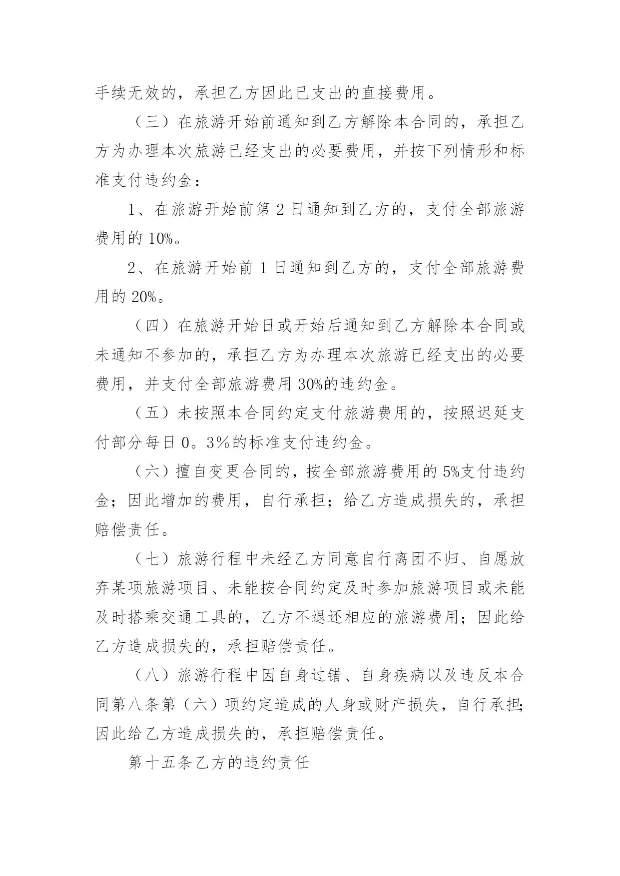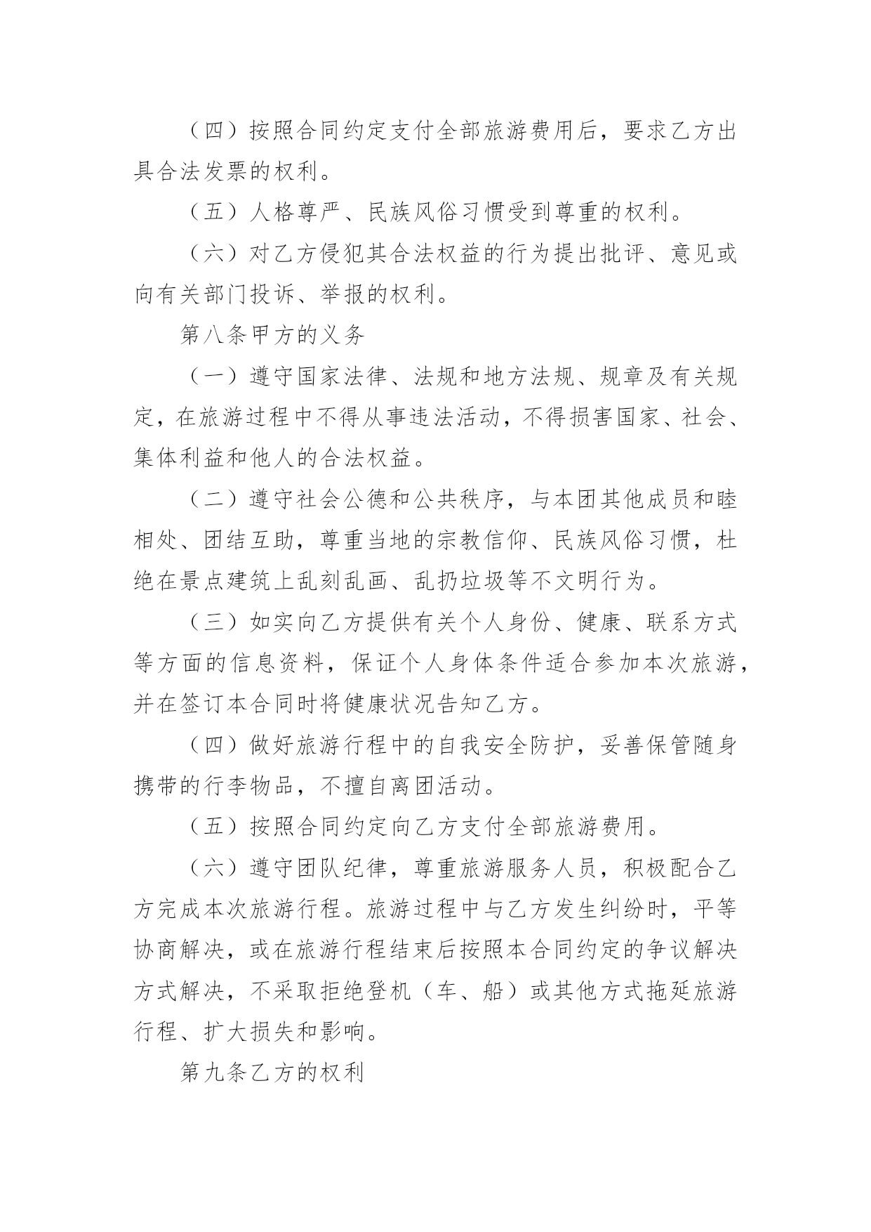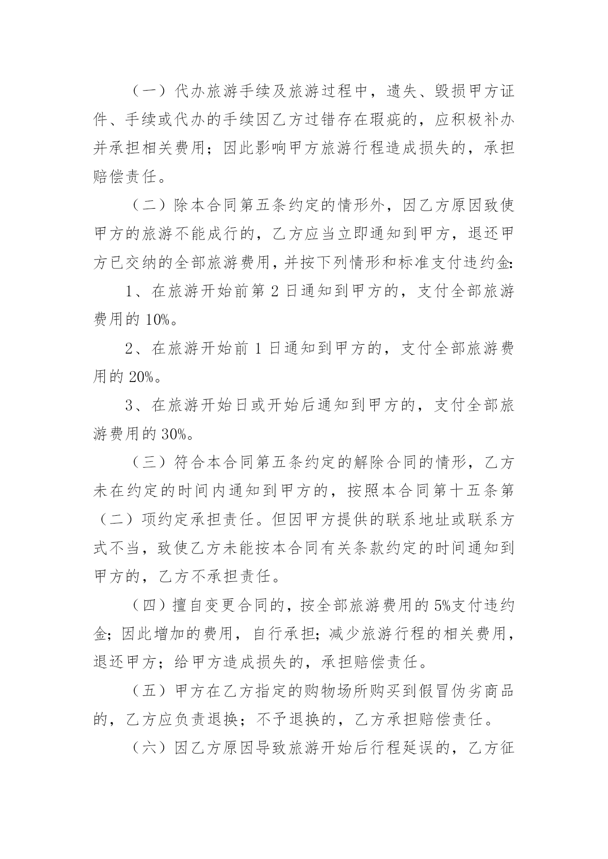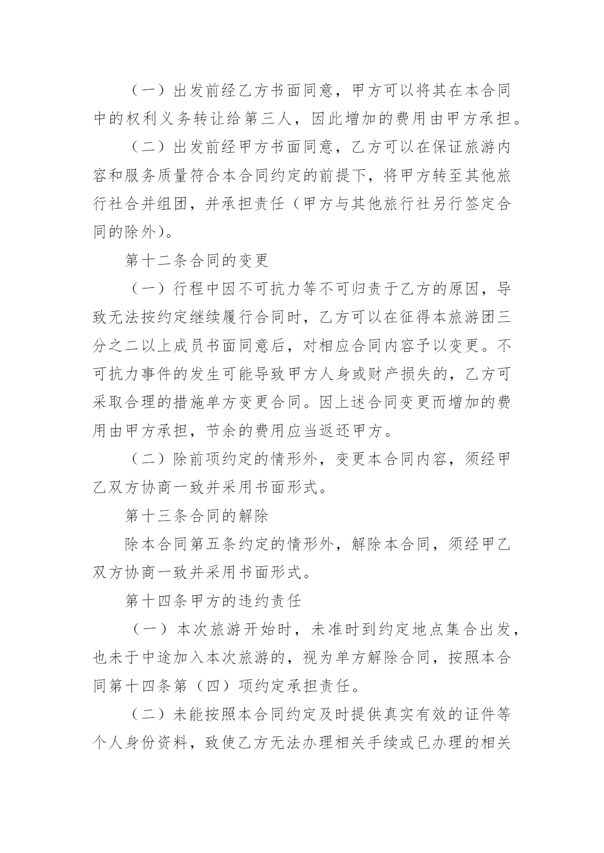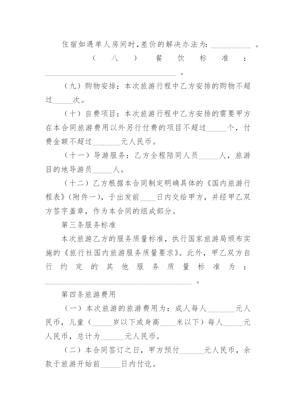国内旅游合同国内旅游合同集锦15篇随着法律知识的普及,合同的使用频率呈上升趋势,签订合同可以使我们的合法权益得到法律的保障。那么常见的合同书是什么样的呢?下面是小编收集整理的国内旅游合同,供大家参考借鉴,希望可以帮助到有需要的朋友。国内旅游合同1合同编号:___________甲方(旅游者):________身份证号码:____________住所地址:______________联系人:________________联系电话:______________传真或电子邮件:________乙方(组团旅行社):____住所地址:______________联系人:________________联系电话:______________传真或电子邮件:________根据《中华人民共和国合同法》及有关法律、法规和规章的规定,经甲乙双方自愿、平等协商,现就甲方参加由乙方组织的本次国内旅游的有关事项达成协议如下:第一条甲方(旅游者)情况(一)本合同甲方人数为_____人。甲方共同委托的签约代表人是______(委托书详见附件三)。(二)甲方人员情况:□如下。□详见附件二《甲方(旅游者)名单》(《甲方(旅游者)名单》经甲乙双方签字盖章,作为本合同的组成部分)。姓名:性别:年龄:身份证号码:健康状况:联系地址:联系电话:第二条旅游内容及安排(一)本次旅游团号为:________________。(二)出发时间:______年_____月_____日,出发地点:_________________。(三)结束时间:______年_____月_____日,结束地点:_________________。(四)行程时间(包含在途时间)共计_____日_____晚。(五)旅游线路名称:____________________________。(六)交通工具:________________________________。(七)住宿标准:________________________________。住宿如遇单人房间时,差价的解决办法为:__________。(八)餐饮标准:_________________________________。(九)购物安排:本次旅游行程中乙方安排的购物不超过_____次。(十)自费项目:本次旅游行程中乙方安排的需要甲方在本合同旅游费用以外另行付费的项目不超过_____个,付费金额不超过_______元人民币。(十一)导游服务:乙方全程陪同人员_____人,旅游目的地导游员_____人。(十二)乙方根据本合同制定明确具体的《国内旅游行程表》(附件一),于出发前____日内交给甲方,并经甲乙双方签字盖章,作为本合同的组成部分。第三条服务标准本次旅游乙方的服务质量标准,执行国家旅游局颁布实施的《旅行社国内旅游服务质量要求》。此外,甲乙双方自行约定的其他服务质量标准为:_____________________________________。第四条旅游费用(一)本次旅游的旅游费用为:成人每人_______元人民币,儿童(_____岁以下或身高____米以下)每人_____元人民币,总计为______元人民币。(二)本合同签订之日,甲方预付______元人民币,余款于旅游开始前_____日内付讫。(三)旅游费用包含以下项目:1、乙方代甲方办理旅游所需证件、手续的费用。2、乙方代甲方向民航、铁路、公路、水运等公共交通部门购买交通客票的费用。如遇交通部门票价调整,该费用的退、补依照《合同法》第六十三条的规定执行。3、《国内旅游行程表》中所列应由乙方安排的餐饮、住宿费用。如甲方要求提高标准,乙方同意安排的,甲方应当补交所需差额。4、《国内旅游行程表》中所列应由乙方安排的交通游览费用。包括自机场、港口、车站等交通口岸至住宿地、自住宿地至游览地的往返交通费、非甲方另行付费旅游项目的第一道门票费。5、乙方提供各项旅游服务(含导游服务)收取的费用。(四)旅游费用不包含以下项目:1、非本合同约定行程发生的费用。2、行程中发生的甲方个人费用,包括本合同约定的餐饮、交通安排以外的个人交通、餐饮费用,个人医疗费费用,个人行李超重费用,个人的洗衣、通讯、饮料、酒类费用,个人寻回遗失物品的费用以及行程中因个人行为造成的赔偿费用等。3、行程中甲方参与的自费项目的费用。4、行程中甲方自由活动期间的费用。5、甲方自行投保的航空人身意外保险及其他保险的费用。6、未列入本合同第四条第(三)项中的其他费用。(五)关于旅游费用的特别约定:________________________。第五条人数约定本次旅游成行的基准人数为______人。参加旅游人数未达到成行基准,乙方可最迟于旅游开始前第3日(不含开始当日,下同)通知到甲方,双方解除合同,并按下列方式之一处
