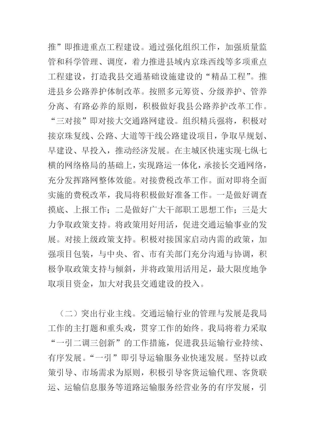 交通局安全规划要点年,机遇与挑战并存。即有国家实行启动内需政策,大力推进“大交通、大建设、大发展”战略,对全国交通事业进行大投入,国务院即将投入4万亿拉动内需的机遇,更有交通大部制改革及即将出台的费税改革政策带来的一系列深刻变革。面对新形势、新变革和新趋势,只有审时度势,因势而导,才能在变革中寻求更强的突破和更大的发展。为此,我局将振奋精神,力争上游,立足于区建设,放眼长一体化乃至全省、全国,抢抓发展契机,科学合理定位,勇于超前谋划蓝图:以科学发展观为统领,紧紧围绕县委提出的“全力打造新城区,实现三年大变样”的发展战略,以“实现交通又快又好发展”为目标,把握发展中心,突出行业主线,建立基础体系,确保企业稳定,圆满完成县委、县政府下达的各项工作任务,为实现我县“率先全面小康,进军全国百强”提供坚实的交通保障。(一)把握发展中心。充分把握我县作为先导区核心区的有利契机,发挥我县连东贯西、承南启北的区位和交通优势,乘势而上,借势而为,顺势而进,切实履行交通职责,全面发挥交通作用,通过“一谋二推三对接”,使交通成为我县区域建设的生力军。“一谋”即谋划好公司的发展。完善组织机构,明确战略定位,把握市场发展方向,创新投融资方式,使交建投充分行使交通基础设施建设的载体作用。“二推”即推进重点工程建设。通过强化组织工作,加强质量监管和科学管理、调度,着力推进县域内京珠西线等多项重点工程建设,打造我县交通基础设施建设的“精品工程”。推进县乡公路养护体制改革。按照多元筹资、分级养护、管养分离、有路必养的原则,积极做好我县公路养护改革工作。“三对接”即对接大交通路网建设。组织精兵强将,积极对接京珠复线、公路、大道等干线公路建设项目,争取早规划、早建设、早投入,推动经济发展。在主城区快速实现七纵七横的网络格局的基础上,实现路运一体化,承接长交通网络,充分发挥路网整体效能。对接费税改革工作。面对即将全面实施的费税改革,我局将积极做好准备工作。一是做好调查摸底、上报工作;二是做好广大干部职工思想工作;三是大力争取政策支持。将政策用好用活,促进交通运输事业的发展。对接上级政策支持。积极对接国家启动内需的政策,加强项目包装,与中央、省、市有关部门充分沟通与协调,积极争取政策支持与倾斜,并将政策用活用足,最大限度地争取项目资金,加大对我县交通建设的投入。(二)突出行业主线。交通运输行业的管理与发展是我局工作的主打题和重头戏,贯穿工作的始终。我局将着力采取“一引二调三创新”的工作措施,促进我县运输行业持续、有序发展。“一引”即引导运输服务业快速发展。坚持以政策引导、市场需求为原则,积极引导客货运输代理、客货联运、运输信息服务等道路运输服务经营业务的有序发展,引导运输服务企业做大做强,支持物流企业,加快建设物流基地,形成日趋合理的运输综合服务体系。“二调”即调整站、点建设。目前我县已建成的农村客运站因班车始发站点分散,以致基本处于闲置状态,没有发挥作用。因此,我局将调整站场建设方向,积极争取省、市支持,选择主要线路,合理建设200个左右侯车亭,真正满足群众出行的需要。调控四大市场。增强企业责任,建立调控机制,优化客运网络,让行政管理、企业行为、市场导向有机结合,使运力、运量达到相对平衡,逐步完善以客运为主的四大市场(货运、驾培、维修)。“三创新”即创新管理方式。对行业管理力求新的突破,全面实施调度制、信誉等级考核制、责任追究制,用制度规范企业行为,改变职责错位的局面,增强企业自主责任能力。创新核算办法。探究新的核算模式,严格制度管理,坚持收支两条线,规范执法行为,着力推进处罚分离、罚缴分离的新方式。创新发展环境。牢记服务宗旨,广泛开展优质服务,扎实推进社会服务承诺制,打造交通良好的社会品牌形象,积极深入开展“两优”创建活动,力争进入全县“两优”先进行列。(三)建立基础体系。坚实、科学、合理的基础工作是推进整体工作发展的基础,为此,我们将通过“一改二建三加强”,构建高效运作的基础管理体系。“一改”即改变管理体制。针对政、企、事相混的现状,将逐步建立一个机关独立、事业分设、企业自主、职责明晰的高效运转模式。“二建”即建立顺畅的格局。按照民主决策、共同管理的要求,建立分线负责、程序管理、环节把关的工作格局。建设窗口工作环境。通过加强窗口的软、硬件建设,优化工作环境,开展“创人民满意基层站所”活动,提高服务能力和水平,树立良好形象。“三加强”即加强信息化建设。建立信息中心,健全信息网络,创新管理模式,提高工作效率,力争两年内投入,完成信息化建设任务。加强队伍建设。打造交通文化理念和精神,加强思想引导、素质培训、能力建设和法纪教育,建设一支积极向上、充满活力、业务精通、德才兼备、奋发有为、廉洁自律的队伍。加强规范化管理。建立健全规章制度,做到用