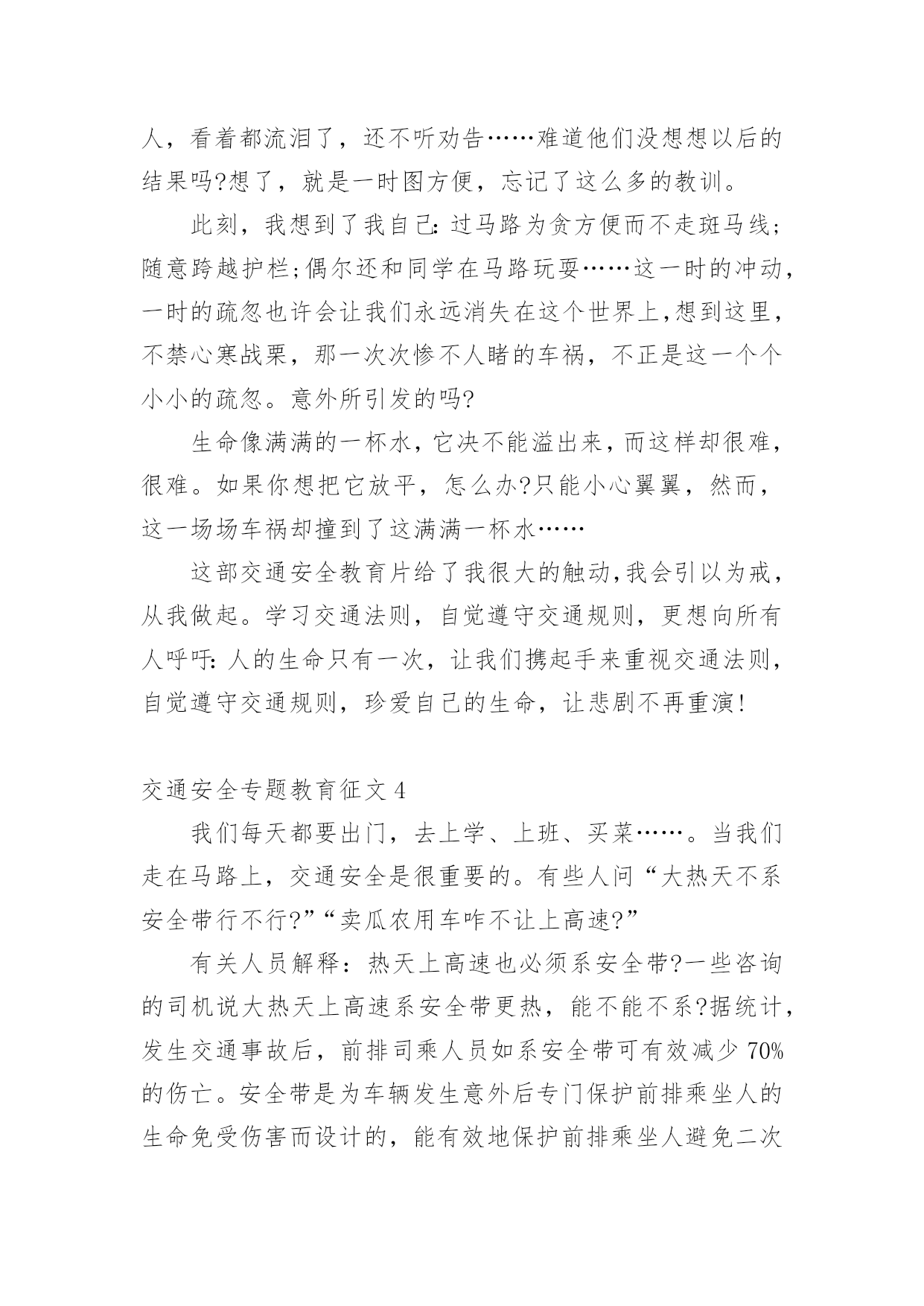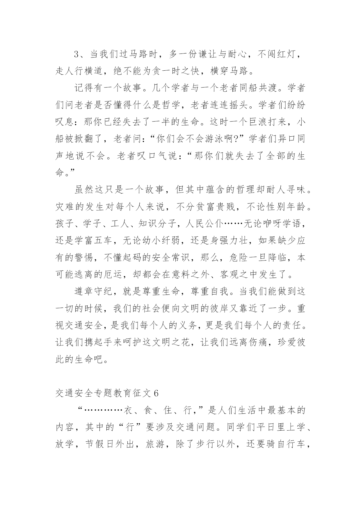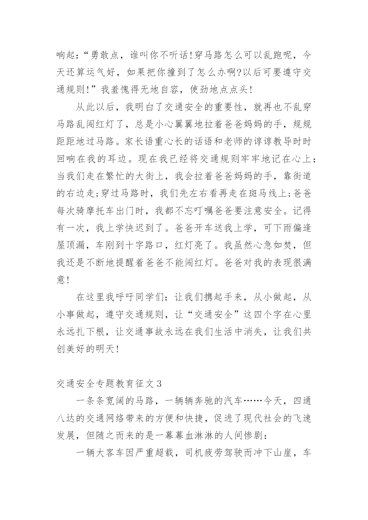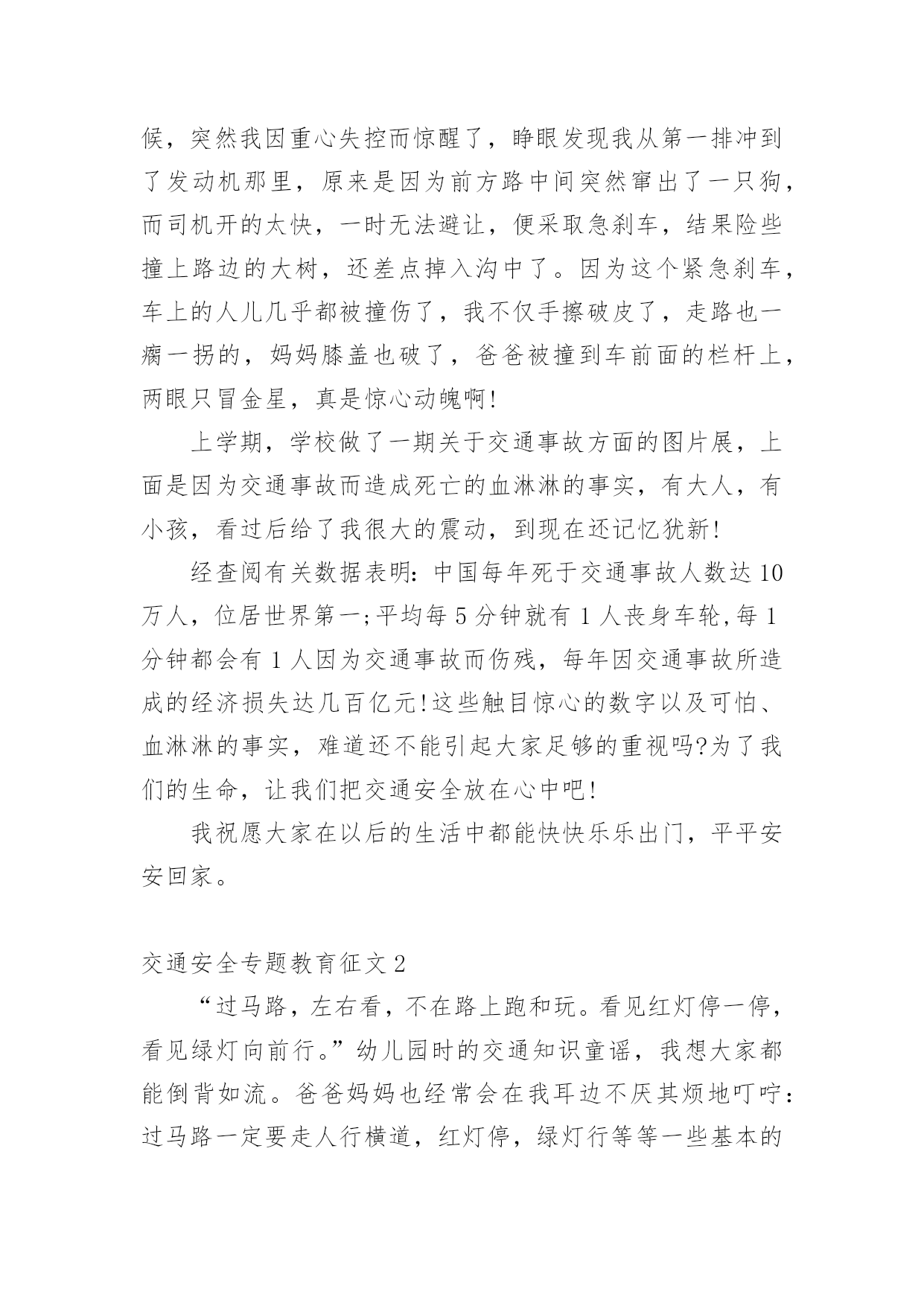 交通安全专题教育征文交通安全专题教育征文范文(精选15篇)无论在学习、工作或是生活中,大家都经常接触到征文吧,征文一般都具有精彩的开头,给人耳目一新的感觉。那么问题来了,到底应如何写一篇优秀的征文呢?以下是小编帮大家整理的交通安全专题教育征文范文(精选15篇),欢迎阅读与收藏。交通安全专题教育征文1交通安全和我们的生活密切相关,每年都有许多起交通事故,是因为人们对交通法规一知半解,没有交通安全意识,不能主动遵守交通法规。我们都知道红灯停、绿灯行、黄灯要注意,过马路要走人行道,不横穿马路,可事实上却经常违规。有些人只重视行走时的安全,而忽视了骑车和驾车的安全问题;一些未满12岁的小孩就骑自行车上街横冲直撞,险些丧身在车轮下;有的人驾车太快,发现前边有条沟,紧急转弯不小心撞上了大树……这些都是因为没有血的教训。有几次,我在去南京的高速公路上,看见一些车翻的四轮朝天,这也许是因为开的太快,从而一不小心撞上了护栏。这些交通事故都是因为没有遵守交通安全法规造成的后果。有一次,我也碰上了交通事故。那天,我和爸爸、妈妈从乡下回来,坐在车上,我晕晕欲睡,正在我迷迷糊糊的时候,突然我因重心失控而惊醒了,睁眼发现我从第一排冲到了发动机那里,原来是因为前方路中间突然窜出了一只狗,而司机开的太快,一时无法避让,便采取急刹车,结果险些撞上路边的大树,还差点掉入沟中了。因为这个紧急刹车,车上的人儿几乎都被撞伤了,我不仅手擦破皮了,走路也一瘸一拐的,妈妈膝盖也破了,爸爸被撞到车前面的栏杆上,两眼只冒金星,真是惊心动魄啊!上学期,学校做了一期关于交通事故方面的图片展,上面是因为交通事故而造成死亡的血淋淋的事实,有大人,有小孩,看过后给了我很大的震动,到现在还记忆犹新!经查阅有关数据表明:中国每年死于交通事故人数达10万人,位居世界第一;平均每5分钟就有1人丧身车轮,每1分钟都会有1人因为交通事故而伤残,每年因交通事故所造成的经济损失达几百亿元!这些触目惊心的数字以及可怕、血淋淋的事实,难道还不能引起大家足够的重视吗?为了我们的生命,让我们把交通安全放在心中吧!我祝愿大家在以后的生活中都能快快乐乐出门,平平安安回家。交通安全专题教育征文2“过马路,左右看,不在路上跑和玩。看见红灯停一停,看见绿灯向前行。”幼儿园时的交通知识童谣,我想大家都能倒背如流。爸爸妈妈也经常会在我耳边不厌其烦地叮咛:过马路一定要走人行横道,红灯停,绿灯行等等一些基本的常识,可是生性顽皮的我根本不放在心里,总是左耳朵听,右耳朵冒,当作耳旁风。上了小学,老师也告诉我们:人车各行其道,走路要走人行道,要靠右边,穿过马路要走斑马线,红灯停,绿灯行。我是一名好学生,在学校当然要听老师话,排好队,走人行道,但离开老师,我仍然是我行我素。但是,直到有一天发生了这样一件事情,才让我彻底改变了不遵守交通规则的坏习惯。邻居家的小姨是一名高中三年级学生,学习成绩优异。但是,就在高考前20天,她在骑自行车过马路时,一不小心手中的伞被风吹翻遮挡住了视线,与迎面而来的骑车人撞在了一起,造成了肋骨3处骨折,结果高考当然是泡汤了。看到同学们在新学期都各奔东西去上大学,小姨伤心极了,她总是埋怨自己没有遵守交通规则。而我自己也亲自经历了一次险情。记得那是一个天气晴朗的星期天,我和妈妈一起去逛西亚超市。过马路的时候,我没有听从妈妈的阻止,只是兴奋地在马路中间蹦蹦跳跳,早已经跑出了横行道的界线,全然不顾妈妈急切地叫喊声,而自顾自悠闲地奔跑着。看见妈妈吓得面红耳赤,追得气喘吁吁,竟然还恶作剧地笑妈妈这么胆小。就在我得意洋洋的时候,忽然,一辆电动摩托车向我面前急驶而来,擦身而过,好悬啊!我摔倒在地,膝盖被逞开了一块皮,吓得惊出了一身冷汗。这时妈妈早已经吓得脸通红通红的,她心疼地一把把我搂在怀里。此时此刻,我真的后悔极了!可是后悔又有什么用啊,唉,真是自讨苦吃!只听妈妈的叮咛又在我耳边响起:“勇敢点,谁叫你不听话!穿马路怎么可以乱跑呢,今天还算运气好,如果把你撞到了怎么办啊?以后可要遵守交通规则!”我羞愧得无地自容,使劲地点点头!从此以后,我明白了交通安全的重要性,就再也不乱穿马路乱闯红灯了,总是小心翼翼地拉着爸爸妈妈的手,规规距距地过马路。家长语重心长的话语和老师的谆谆教导时时回响在我的耳边。现在我已经将交通规则牢牢地记在心上:当我们走在繁忙的大街上,我会拉着爸爸妈妈的手,靠街道的右边走;穿过马路时,我们先左右看再走在斑马线上;爸爸每次骑摩托车出门时,我都不忘叮嘱爸爸要注意安全。记得有一次,我上学快迟到了。爸爸开车送我上学,可下雨偏逢屋顶漏,车刚到十字路口,红灯亮了。我虽然心急如焚,但我还是不断地提醒着爸爸不能闯红灯。爸爸对我的表现很满意!在这里我呼吁同学们:让我们携起手来,从小做起,从小事做起,遵守交通规则,让“交通安全”这