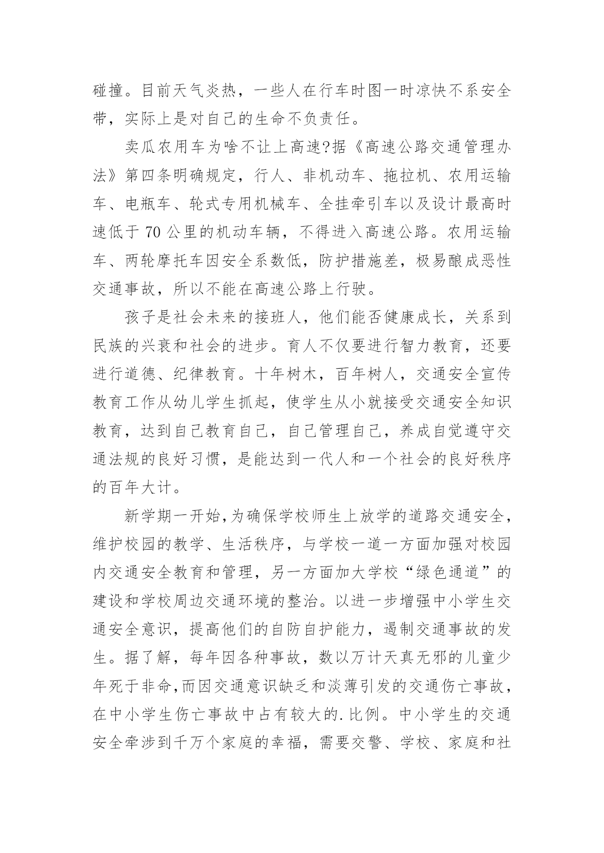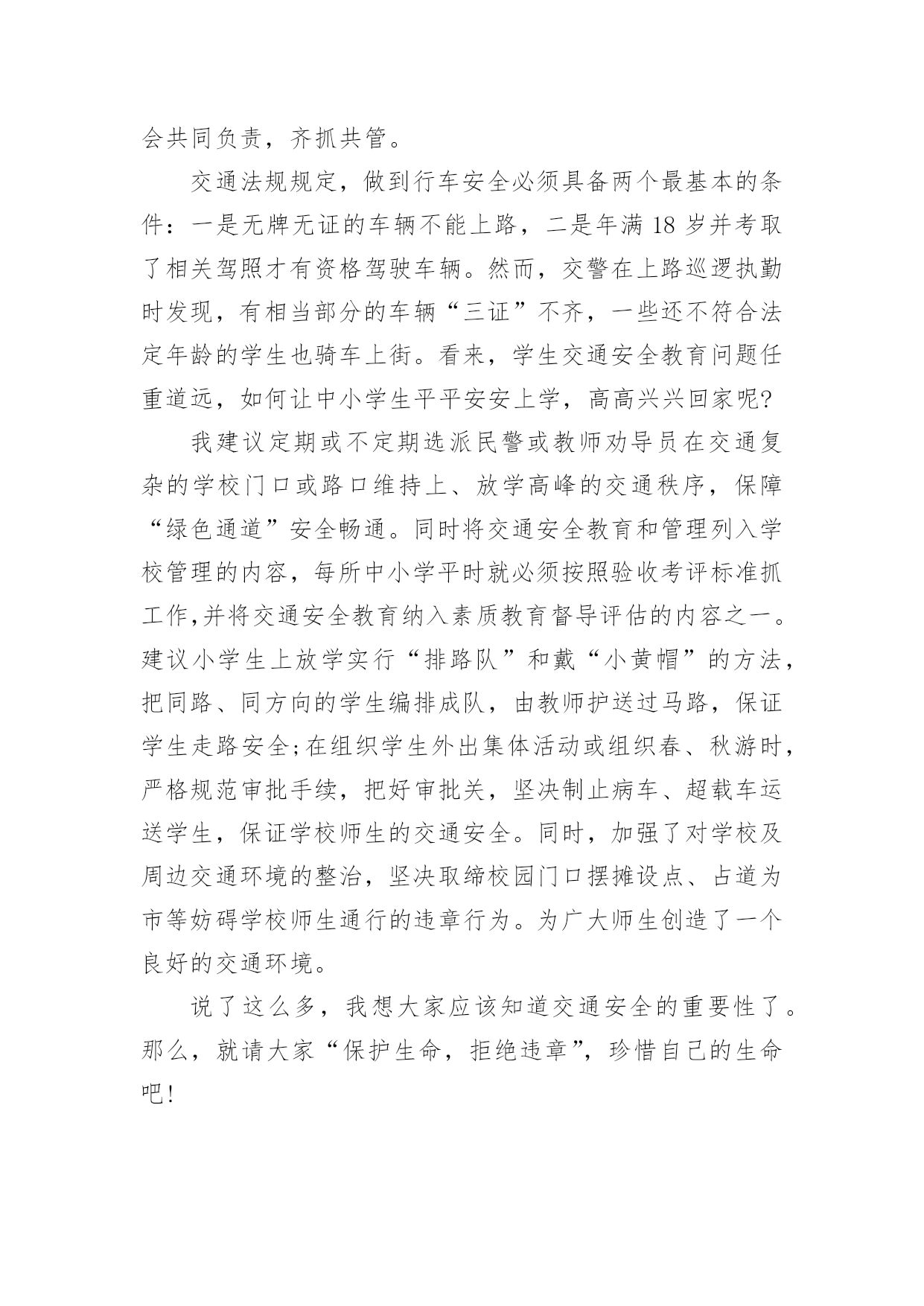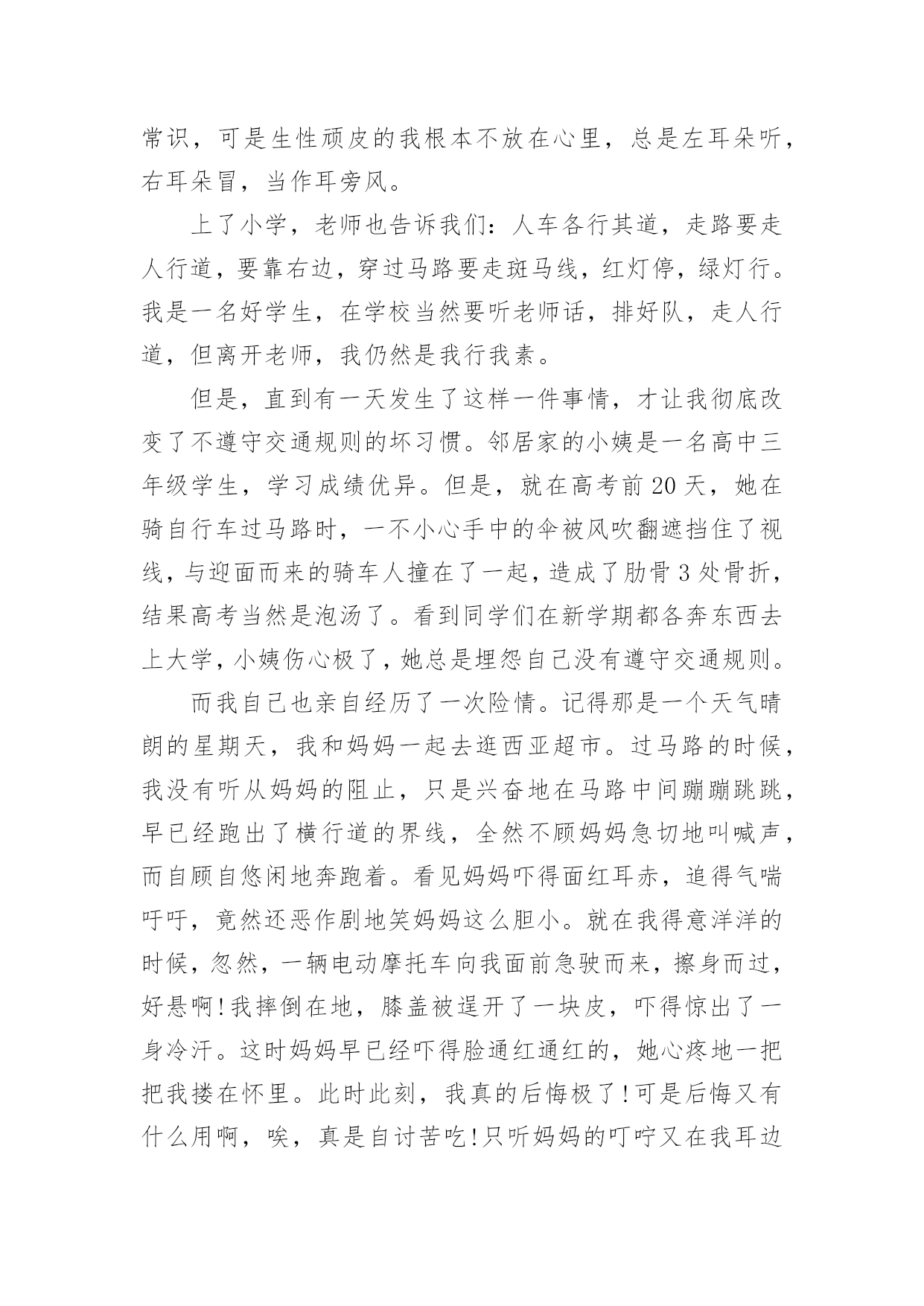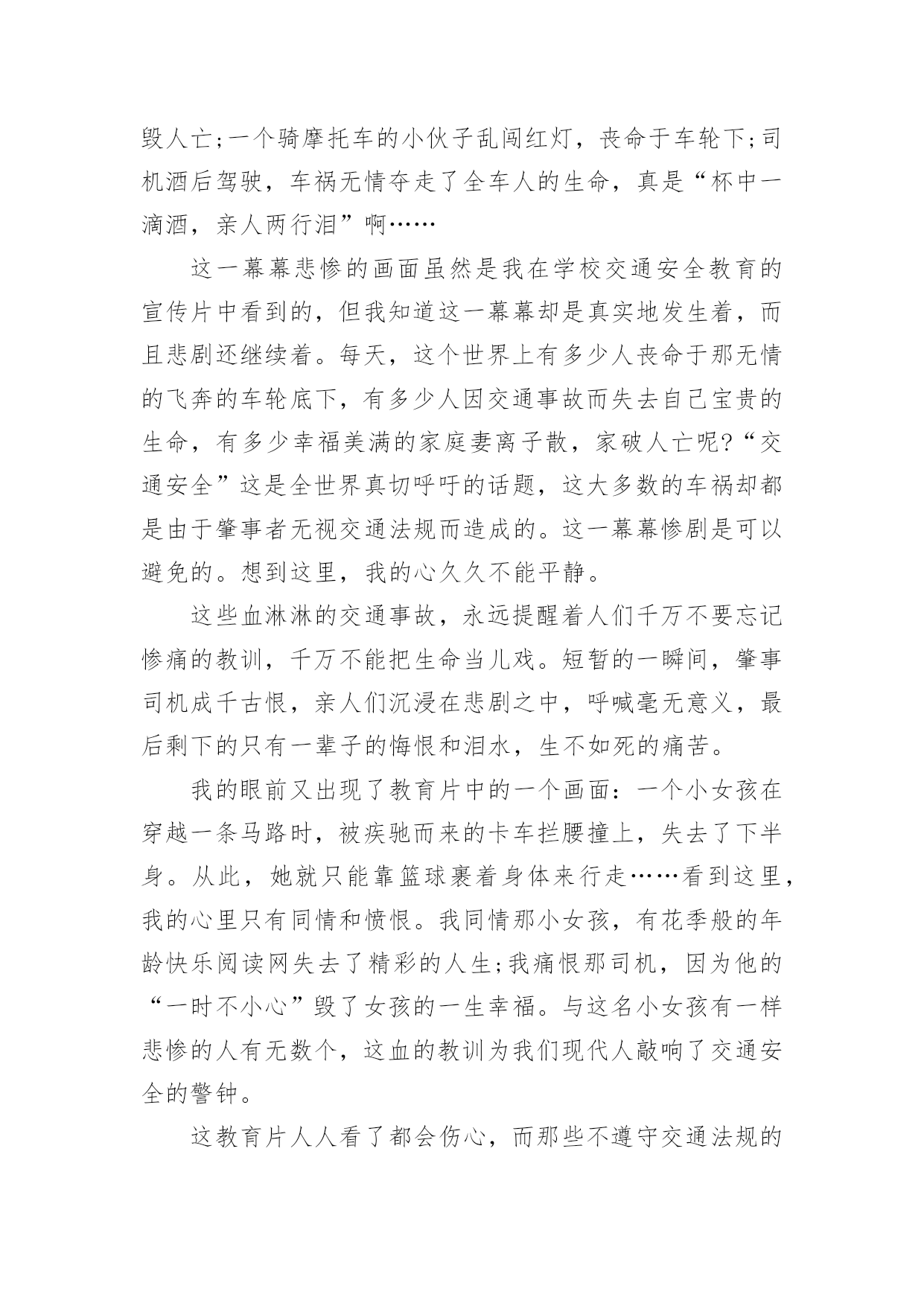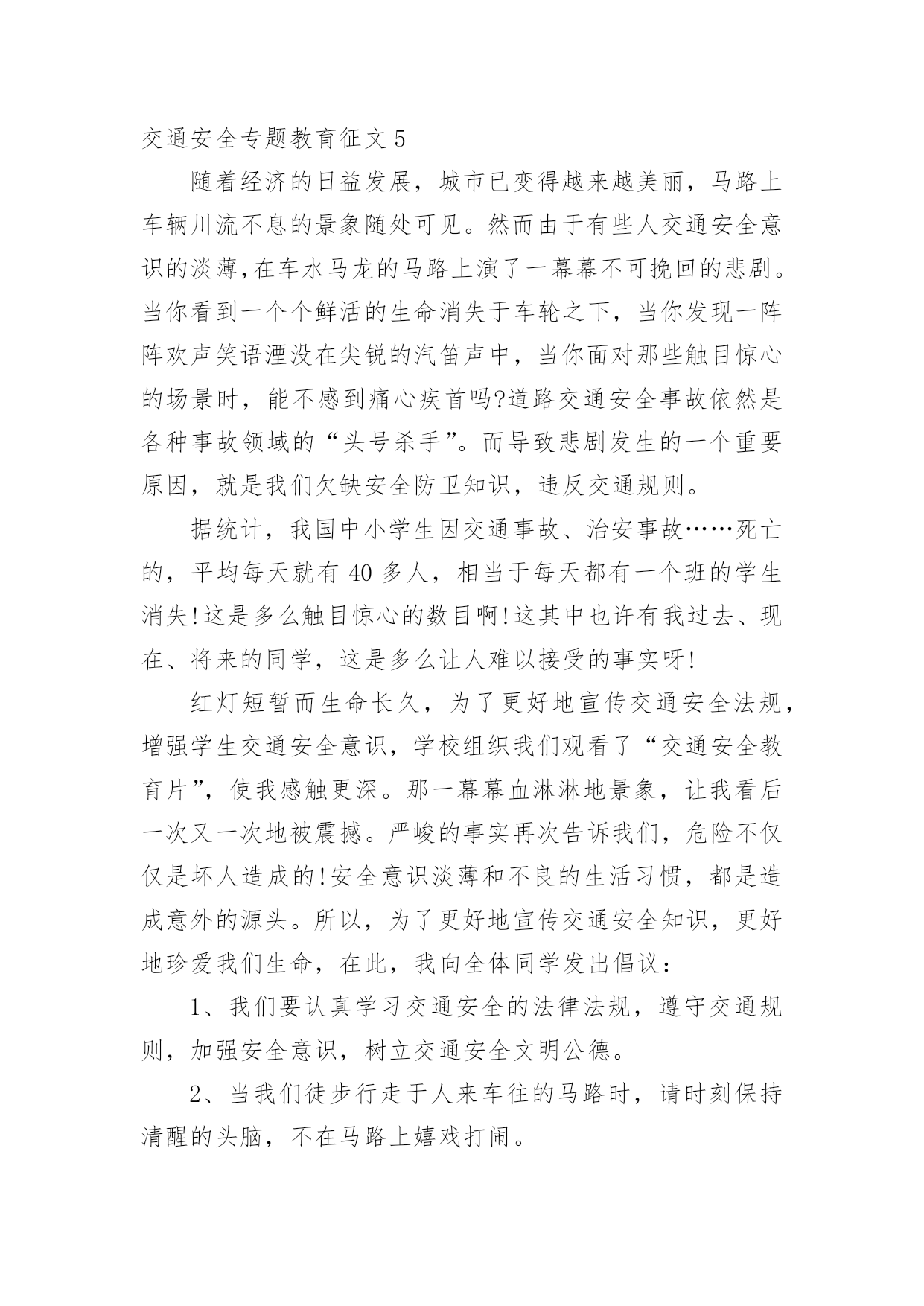 交通安全专题教育征文交通安全专题教育征文范文(精选15篇)无论在学习、工作或是生活中,大家都经常接触到征文吧,征文一般都具有精彩的开头,给人耳目一新的感觉。那么问题来了,到底应如何写一篇优秀的征文呢?以下是小编帮大家整理的交通安全专题教育征文范文(精选15篇),欢迎阅读与收藏。交通安全专题教育征文1交通安全和我们的生活密切相关,每年都有许多起交通事故,是因为人们对交通法规一知半解,没有交通安全意识,不能主动遵守交通法规。我们都知道红灯停、绿灯行、黄灯要注意,过马路要走人行道,不横穿马路,可事实上却经常违规。有些人只重视行走时的安全,而忽视了骑车和驾车的安全问题;一些未满12岁的小孩就骑自行车上街横冲直撞,险些丧身在车轮下;有的人驾车太快,发现前边有条沟,紧急转弯不小心撞上了大树……这些都是因为没有血的教训。有几次,我在去南京的高速公路上,看见一些车翻的四轮朝天,这也许是因为开的太快,从而一不小心撞上了护栏。这些交通事故都是因为没有遵守交通安全法规造成的后果。有一次,我也碰上了交通事故。那天,我和爸爸、妈妈从乡下回来,坐在车上,我晕晕欲睡,正在我迷迷糊糊的时候,突然我因重心失控而惊醒了,睁眼发现我从第一排冲到了发动机那里,原来是因为前方路中间突然窜出了一只狗,而司机开的太快,一时无法避让,便采取急刹车,结果险些撞上路边的大树,还差点掉入沟中了。因为这个紧急刹车,车上的人儿几乎都被撞伤了,我不仅手擦破皮了,走路也一瘸一拐的,妈妈膝盖也破了,爸爸被撞到车前面的栏杆上,两眼只冒金星,真是惊心动魄啊!上学期,学校做了一期关于交通事故方面的图片展,上面是因为交通事故而造成死亡的血淋淋的事实,有大人,有小孩,看过后给了我很大的震动,到现在还记忆犹新!经查阅有关数据表明:中国每年死于交通事故人数达10万人,位居世界第一;平均每5分钟就有1人丧身车轮,每1分钟都会有1人因为交通事故而伤残,每年因交通事故所造成的经济损失达几百亿元!这些触目惊心的数字以及可怕、血淋淋的事实,难道还不能引起大家足够的重视吗?为了我们的生命,让我们把交通安全放在心中吧!我祝愿大家在以后的生活中都能快快乐乐出门,平平安安回家。交通安全专题教育征文2“过马路,左右看,不在路上跑和玩。看见红灯停一停,看见绿灯向前行。”幼儿园时的交通知识童谣,我想大家都能倒背如流。爸爸妈妈也经常会在我耳边不厌其烦地叮咛:过马路一定要走人行横道,红灯停,绿灯行等等一些基本的常识,可是生性顽皮的我根本不放在心里,总是左耳朵听,右耳朵冒,当作耳旁风。上了小学,老师也告诉我们:人车各行其道,走路要走人行道,要靠右边,穿过马路要走斑马线,红灯停,绿灯行。我是一名好学生,在学校当然要听老师话,排好队,走人行道,但离开老师,我仍然是我行我素。但是,直到有一天发生了这样一件事情,才让我彻底改变了不遵守交通规则的坏习惯。邻居家的小姨是一名高中三年级学生,学习成绩优异。但是,就在高考前20天,她在骑自行车过马路时,一不小心手中的伞被风吹翻遮挡住了视线,与迎面而来的骑车人撞在了一起,造成了肋骨3处骨折,结果高考当然是泡汤了。看到同学们在新学期都各奔东西去上大学,小姨伤心极了,她总是埋怨自己没有遵守交通规则。而我自己也亲自经历了一次险情。记得那是一个天气晴朗的星期天,我和妈妈一起去逛西亚超市。过马路的时候,我没有听从妈妈的阻止,只是兴奋地在马路中间蹦蹦跳跳,早已经跑出了横行道的界线,全然不顾妈妈急切地叫喊声,而自顾自悠闲地奔跑着。看见妈妈吓得面红耳赤,追得气喘吁吁,竟然还恶作剧地笑妈妈这么胆小。就在我得意洋洋的时候,忽然,一辆电动摩托车向我面前急驶而来,擦身而过,好悬啊!我摔倒在地,膝盖被逞开了一块皮,吓得惊出了一身冷汗。这时妈妈早已经吓得脸通红通红的,她心疼地一把把我搂在怀里。此时此刻,我真的后悔极了!可是后悔又有什么用啊,唉,真是自讨苦吃!只听妈妈的叮咛又在我耳边响起:“勇敢点,谁叫你不听话!穿马路怎么可以乱跑呢,今天还算运气好,如果把你撞到了怎么办啊?以后可要遵守交通规则!”我羞愧得无地自容,使劲地点点头!从此以后,我明白了交通安全的重要性,就再也不乱穿马路乱闯红灯了,总是小心翼翼地拉着爸爸妈妈的手,规规距距地过马路。家长语重心长的话语和老师的谆谆教导时时回响在我的耳边。现在我已经将交通规则牢牢地记在心上:当我们走在繁忙的大街上,我会拉着爸爸妈妈的手,靠街道的右边走;穿过马路时,我们先左右看再走在斑马线上;爸爸每次骑摩托车出门时,我都不忘叮嘱爸爸要注意安全。记得有一次,我上学快迟到了。爸爸开车送我上学,可下雨偏逢屋顶漏,车刚到十字路口,红灯亮了。我虽然心急如焚,但我还是不断地提醒着爸爸不能闯红灯。爸爸对我的表现很满意!在这里我呼吁同学们:让我们携起手来,从小做起,从小事做起,遵守交通规则,让“交通安全”这