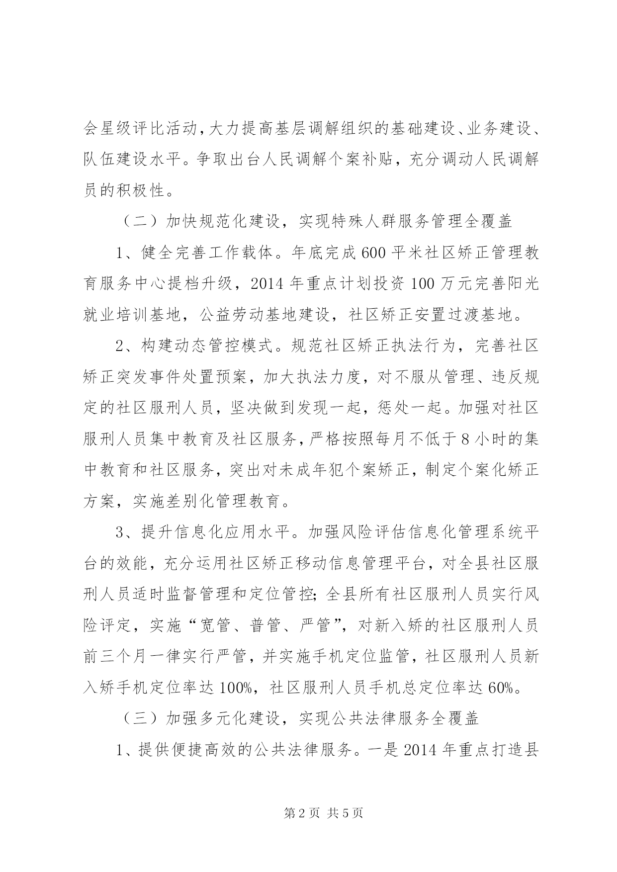 第PAGE\*Arabic\*MERGEFORMAT5页共NUMPAGES\*MERGEFORMAT5页司法局年度工作计划**县司法局2014年工作计划(一)推进网格化建设,实现矛盾纠纷排查调处全覆盖1、健全人民调解组织网络。乡镇依托综治中心,村居依托村部、城市小区依托服务中心普遍建立健全调解阵地;在县工业园区,乡镇工业集中区建立人民调解工作室;争取年底在交警大队、分金亭医院、县医院等成立专业调解工作室,2014年上半年在经济开发区设立司法所,鼓励与支持有威望、有相关专业知识的老党员、老干部、热心调解事业的年轻同志设立个人调解室,逐步完善县乡村三级调解组织网络。2、健全网格化排查机制。与县法院、检察院及基层法庭签署庭所共建和检司共建协议,整合多方资源,推进多元调解全覆盖,县矛盾调处服务中心制度完善,运作正常,网格化排查预警覆盖率达100%,重大复杂矛盾纠纷排查率,调处率90%。3、加强人民调解员队伍建设。采取以会代训,专题培训,集中检查等方式着力提高专职调解员的职业技能;推广“两代表一委员”参与矛盾纠纷化解的做法推进调解社会化建设;聘请大学生村官、农村能人等有一定社会影响力的特定人群担任调解员。4、创新举措,推进特色调解全覆盖。在村居公共服务场所张贴“人民调解、法律服务、法律援助”便民公示牌,把人员照片、联系电话、监督电话公示上墙。实行人民调解员等级和调委会星级评比活动,大力提高基层调解组织的基础建设、业务建设、队伍建设水平。争取出台人民调解个案补贴,充分调动人民调解员的积极性。(二)加快规范化建设,实现特殊人群服务管理全覆盖1、健全完善工作载体。年底完成600平米社区矫正管理教育服务中心提档升级,2014年重点计划投资100万元完善阳光就业培训基地,公益劳动基地建设,社区矫正安置过渡基地。2、构建动态管控模式。规范社区矫正执法行为,完善社区矫正突发事件处置预案,加大执法力度,对不服从管理、违反规定的社区服刑人员,坚决做到发现一起,惩处一起。加强对社区服刑人员集中教育及社区服务,严格按照每月不低于8小时的集中教育和社区服务,突出对未成年犯个案矫正,制定个案化矫正方案,实施差别化管理教育。3、提升信息化应用水平。加强风险评估信息化管理系统平台的效能,充分运用社区矫正移动信息管理平台,对全县社区服刑人员适时监督管理和定位管控;全县所有社区服刑人员实行风险评定,实施“宽管、普管、严管”,对新入矫的社区服刑人员前三个月一律实行严管,并实施手机定位监管,社区服刑人员新入矫手机定位率达100%,社区服刑人员手机总定位率达60%。(三)加强多元化建设,实现公共法律服务全覆盖1、提供便捷高效的公共法律服务。一是2014年重点打造县级公共法律服务中心大厅,以律师、公证员、基层法律服务工作者、法律援助律师或人民调解员为主体,提供公证、法律援助等“一条龙式”的系列服务,并与相关法律服务机构具体承办“无缝对接”,逐步带动乡镇公共法律服务中心建设,二是引导律师事务所合理化布局,进一步完善浙江商会、青阳工业园区等律师工作室建设,推动工作长期化、规范化;三是“点面结合”统一农村律师工作室工作流程、硬件建设等,建成5个以上有代表性的“示范法律顾问工作室”,逐步实现23个乡镇的全覆盖。四是加快公共法律服务信息化建设,拓展“12348”服务功能,设立法律服务qq群在线交流,提升**普法网公共法律服务效能,依托省厅司法行政专网,全面建设网络公共法律服务平台,办理网络法律服务事项,形成公共法律服务体系的有机整体。2、保障公共法律服务机制建设。健全县、乡、村法律服务网络,进一步完善“30分钟法律援助服务圈”,在全县律师事务所和村(社区)设立法律援助工作站,就近就地为城乡居民提供法律援助服务,凡是城乡居民无论法律咨询,还是申请法律援助,只需30分钟,就可到达所在的法律援助中心或工作站,得到相应的法律援助服务.3、加强公共法律服务队伍建设。推进律师和乡镇结对帮扶,建立联系点制度;成立政府法律顾问团、村法律服务志愿者小分队,探索建立法律服务人员积分制度,并出台配套考评细则,规范服务行为。(四)提升常态化建设,实现法制宣传教育全覆盖1、优化法制宣传教育机制。增强县、乡、村、组四级普法教育组织机构的职能,构建“法制宣传员”、“学法中心户”、“法律明白人”网络,有计划地培养专业普法人员,提高综合素质,有效的利用各级社会资源扩张法制宣传队伍,形成“横向到边、纵向到底”的组织体系。2、推进法治文化阵地建设。加大法治文化广场、青少年法制宣传教育基地(计划投资460万元)建设力度,将青少年法制宣传教育基地建设纳入2014年为民办实事项目。并将现有的法治文化广场进行升级改造,计划司法局年度工作计划投资280万元,由专业人士进行整体规划设计,力争将其建成高标准、集法