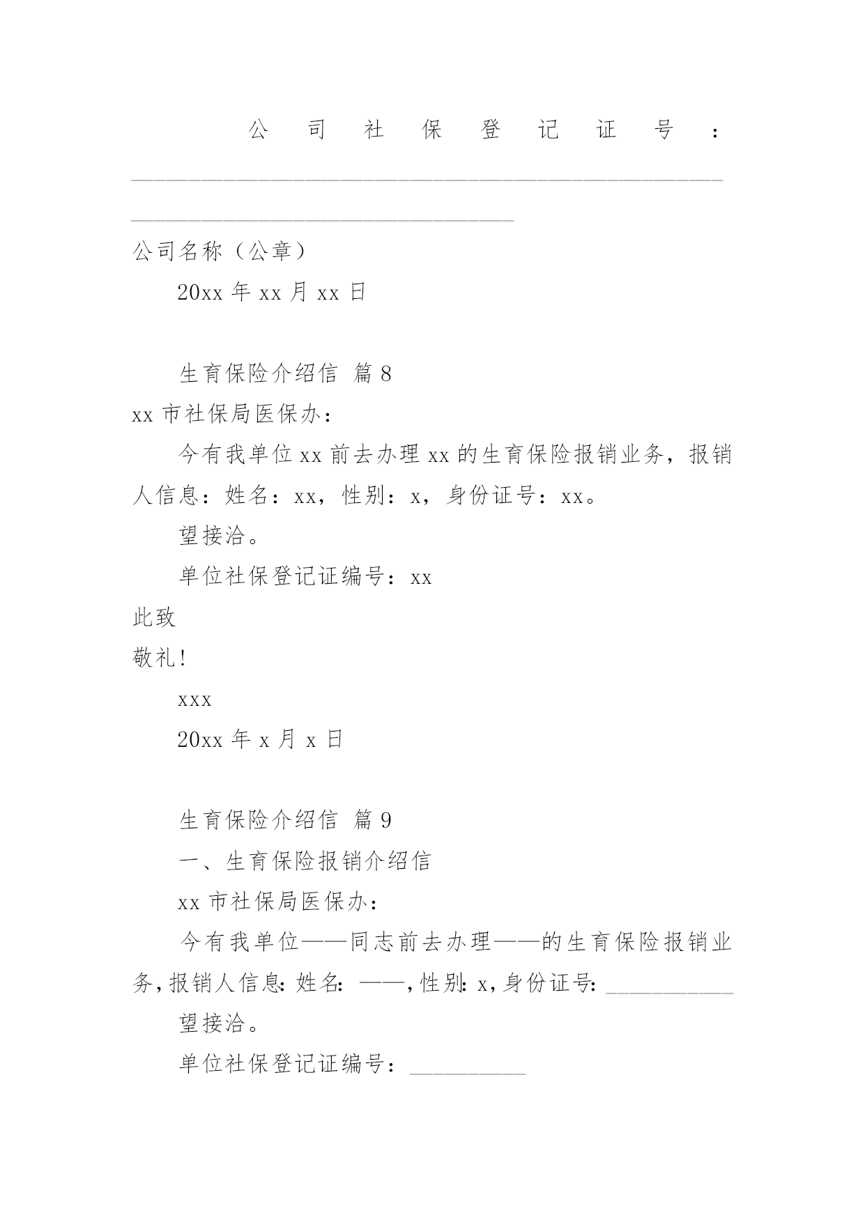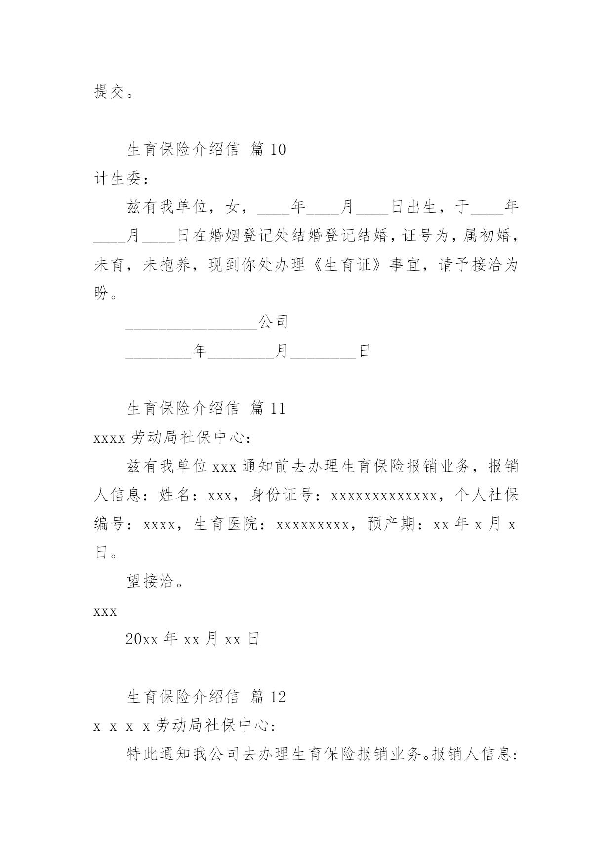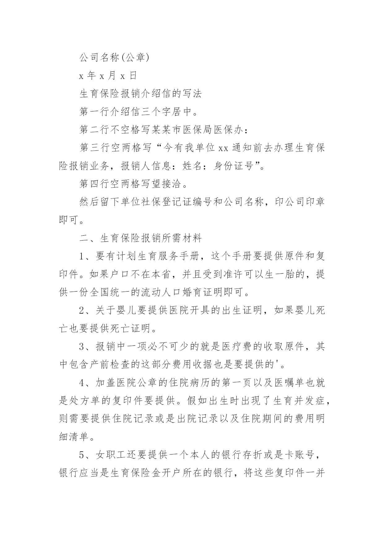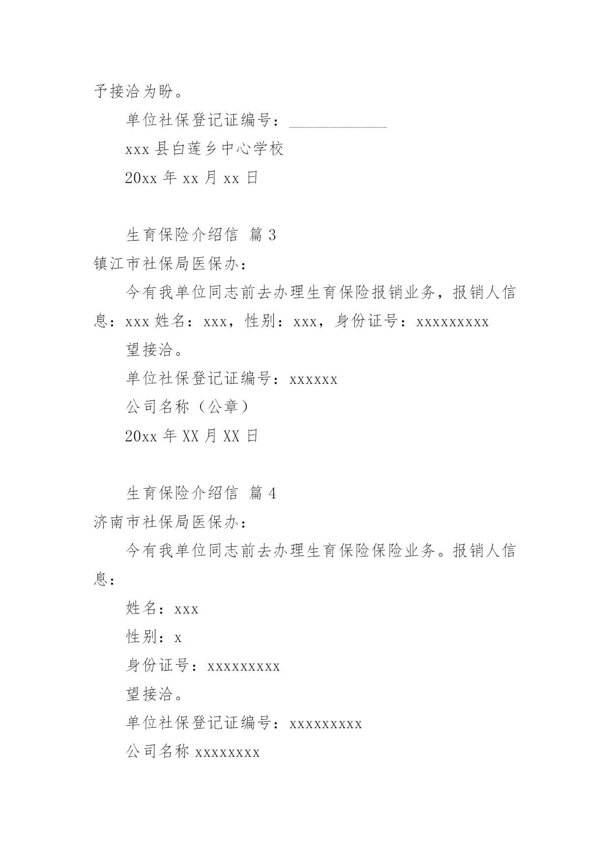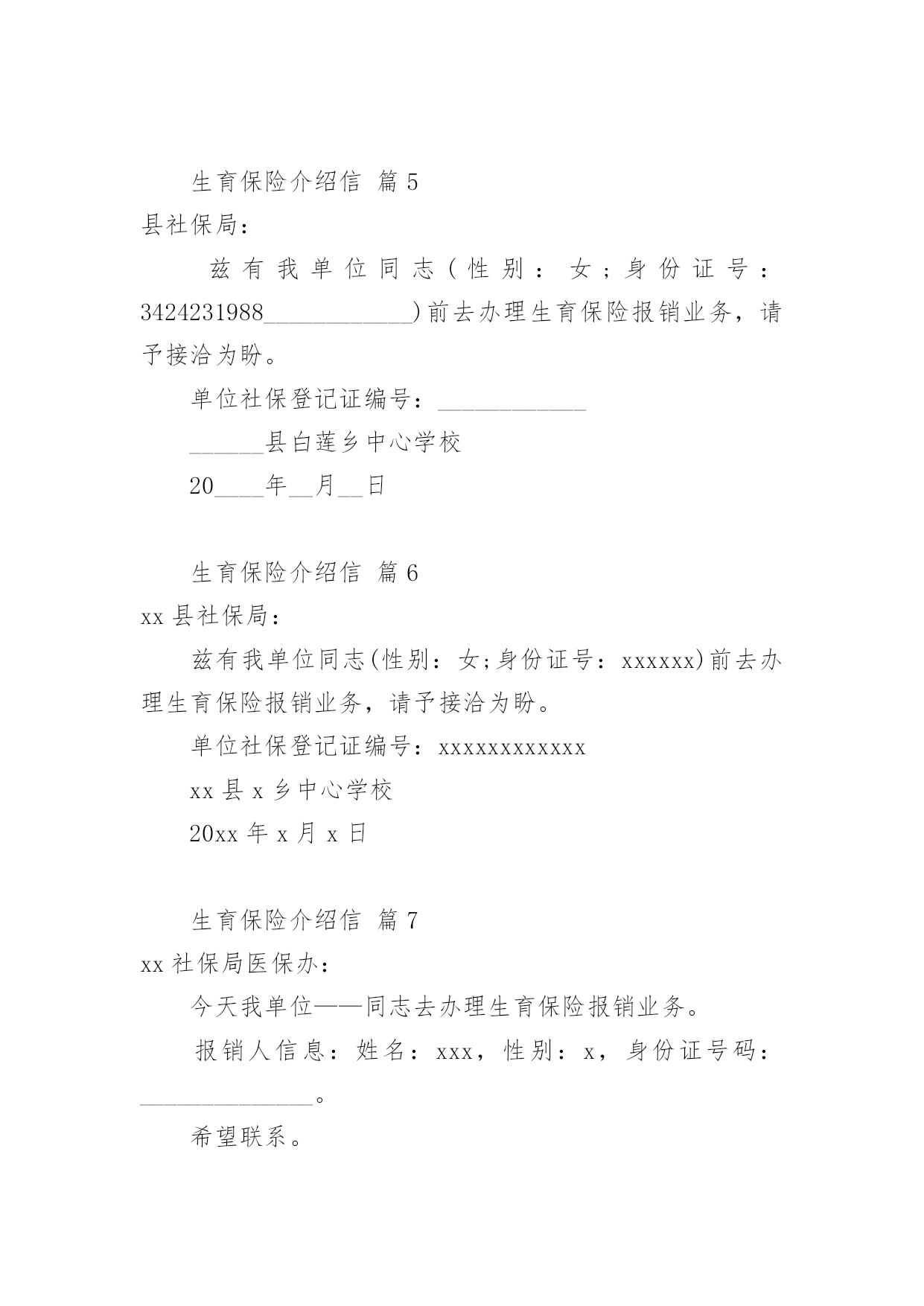 生育保险介绍信生育保险介绍信12篇在当今社会生活中,我们可以使用介绍信的机会越来越多,介绍信在介绍联系接洽事宜中具有介绍、证明的双重作用。那么你有了解过介绍信吗?下面是小编为大家收集的生育保险介绍信,希望能够帮助到大家。生育保险介绍信篇1________医保办:现有我单位________同志前去办理生育保险保险业务。报销人信息:________姓名:________性别:________身份证号:________望接洽。________单位社保登记证编号:________公司名称年月日生育保险介绍信篇2县社保局:兹有我单位同志(性别:女;身份证号:3424231988____________)前去办理生育保险报销业务,请予接洽为盼。单位社保登记证编号:____________xxx县白莲乡中心学校20xx年xx月xx日生育保险介绍信篇3镇江市社保局医保办:今有我单位同志前去办理生育保险报销业务,报销人信息:xxx姓名:xxx,性别:xxx,身份证号:xxxxxxxxx望接洽。单位社保登记证编号:xxxxxx公司名称(公章)20xx年XX月XX日生育保险介绍信篇4济南市社保局医保办:今有我单位同志前去办理生育保险保险业务。报销人信息:姓名:xxx性别:x身份证号:xxxxxxxxx望接洽。单位社保登记证编号:xxxxxxxxx公司名称xxxxxxxx生育保险介绍信篇5县社保局:兹有我单位同志(性别:女;身份证号:3424231988____________)前去办理生育保险报销业务,请予接洽为盼。单位社保登记证编号:__________________县白莲乡中心学校20____年__月__日生育保险介绍信篇6xx县社保局:兹有我单位同志(性别:女;身份证号:xxxxxx)前去办理生育保险报销业务,请予接洽为盼。单位社保登记证编号:xxxxxxxxxxxxxx县x乡中心学校20xx年x月x日生育保险介绍信篇7xx社保局医保办:今天我单位——同志去办理生育保险报销业务。报销人信息:姓名:xxx,性别:x,身份证号码:______________。希望联系。公司社保登记证号:____________________________________________________________________________________公司名称(公章)20xx年xx月xx日生育保险介绍信篇8xx市社保局医保办:今有我单位xx前去办理xx的生育保险报销业务,报销人信息:姓名:xx,性别:x,身份证号:xx。望接洽。单位社保登记证编号:xx此致敬礼!xxx20xx年x月x日生育保险介绍信篇9一、生育保险报销介绍信xx市社保局医保办:今有我单位——同志前去办理——的生育保险报销业务,报销人信息:姓名:——,性别:x,身份证号:___________望接洽。单位社保登记证编号:__________公司名称(公章)x年x月x日生育保险报销介绍信的写法第一行介绍信三个字居中。第二行不空格写某某市医保局医保办:第三行空两格写“今有我单位xx通知前去办理生育保险报销业务,报销人信息:姓名:身份证号”。第四行空两格写望接洽。然后留下单位社保登记证编号和公司名称,印公司印章即可。二、生育保险报销所需材料1、要有计划生育服务手册,这个手册要提供原件和复印件。如果户口不在本省,并且受到准许可以生一胎的,提供一份全国统一的流动人口婚育证明即可。2、关于婴儿要提供医院开具的出生证明,如果婴儿死亡也要提供死亡证明。3、报销中一项必不可少的就是医疗费的收取原件,其中包含产前检查的这部分费用收据也是要提供的'。4、加盖医院公章的住院病历的第一页以及医嘱单也就是处方单的复印件要提供。假如出生时出现了生育并发症,则需要提供住院记录或是出院记录以及住院期间的费用明细清单。5、女职工还要提供一个本人的银行存折或是卡账号,银行应当是生育保险金开户所在的银行,将这些复印件一并提交。生育保险介绍信篇10计生委:兹有我单位,女,____年____月____日出生,于____年____月____日在婚姻登记处结婚登记结婚,证号为,属初婚,未育,未抱养,现到你处办理《生育证》事宜,请予接洽为盼。________________公司________年________月________日生育保险介绍信篇11xxxx劳动局社保中心:兹有我单位xxx通知前去办理生育保险报销业务,报销人信息:姓名:xxx,身份证号:xxxxxxxxxxxxx,个人社保编号:xxxx,生育医院:xxxxxxxxx,预产期:xx年x月x日。望接洽。xxx20xx年xx月xx日生育保险介绍信篇12xxxx劳动局社保中心:特此通知我公司去办理生育保险报销业务。报销人信息:姓名:xxxxxxxx,身份证号:xxx