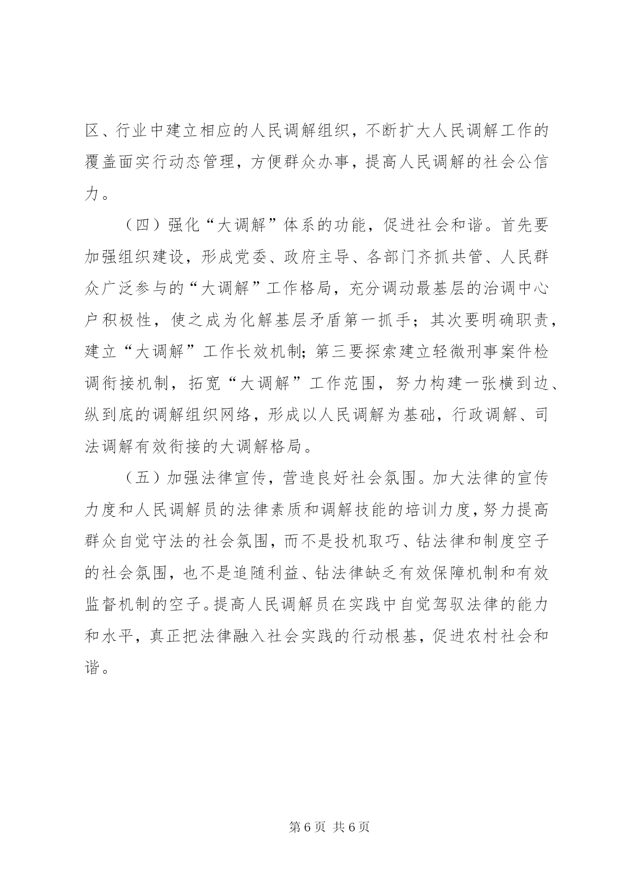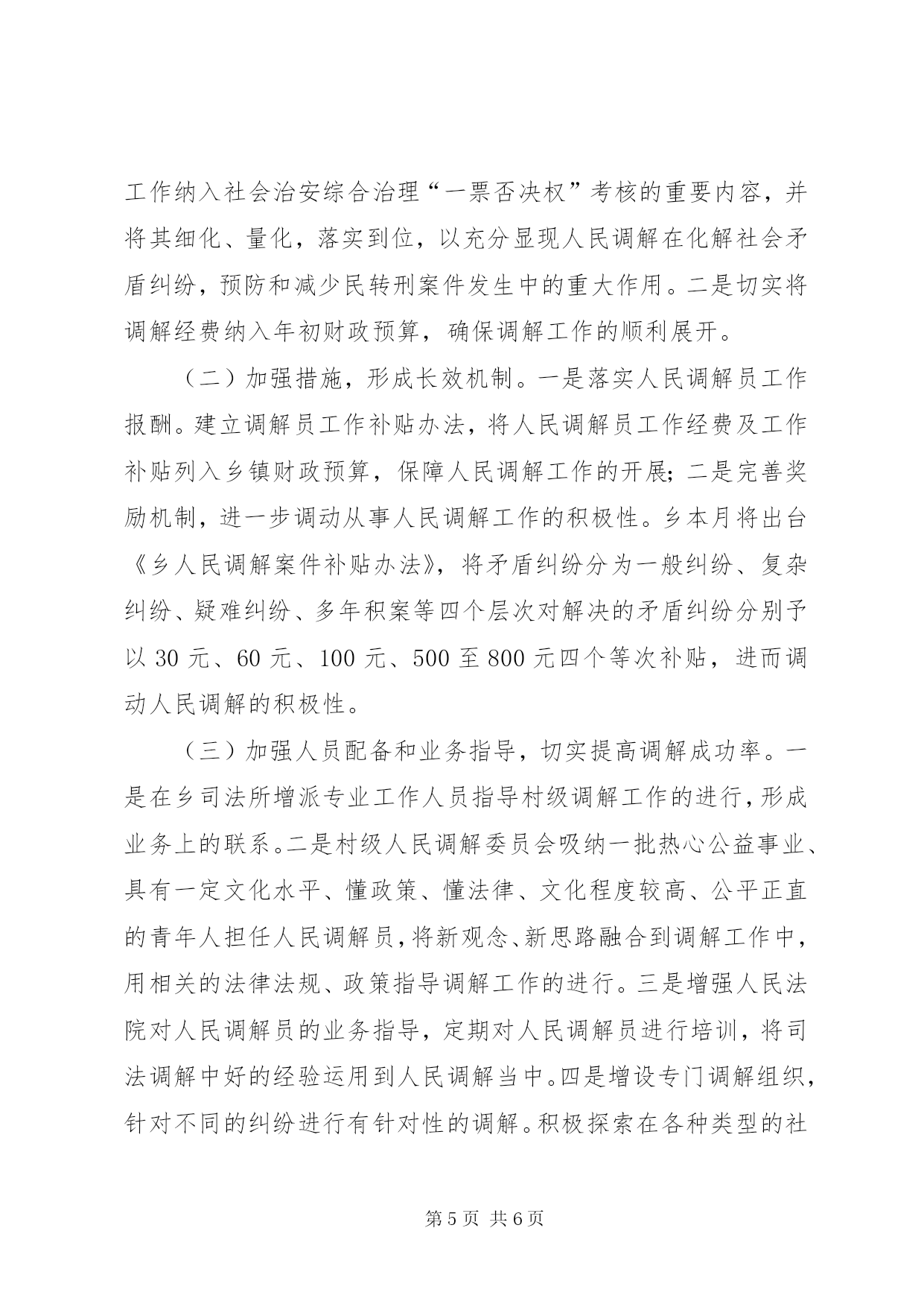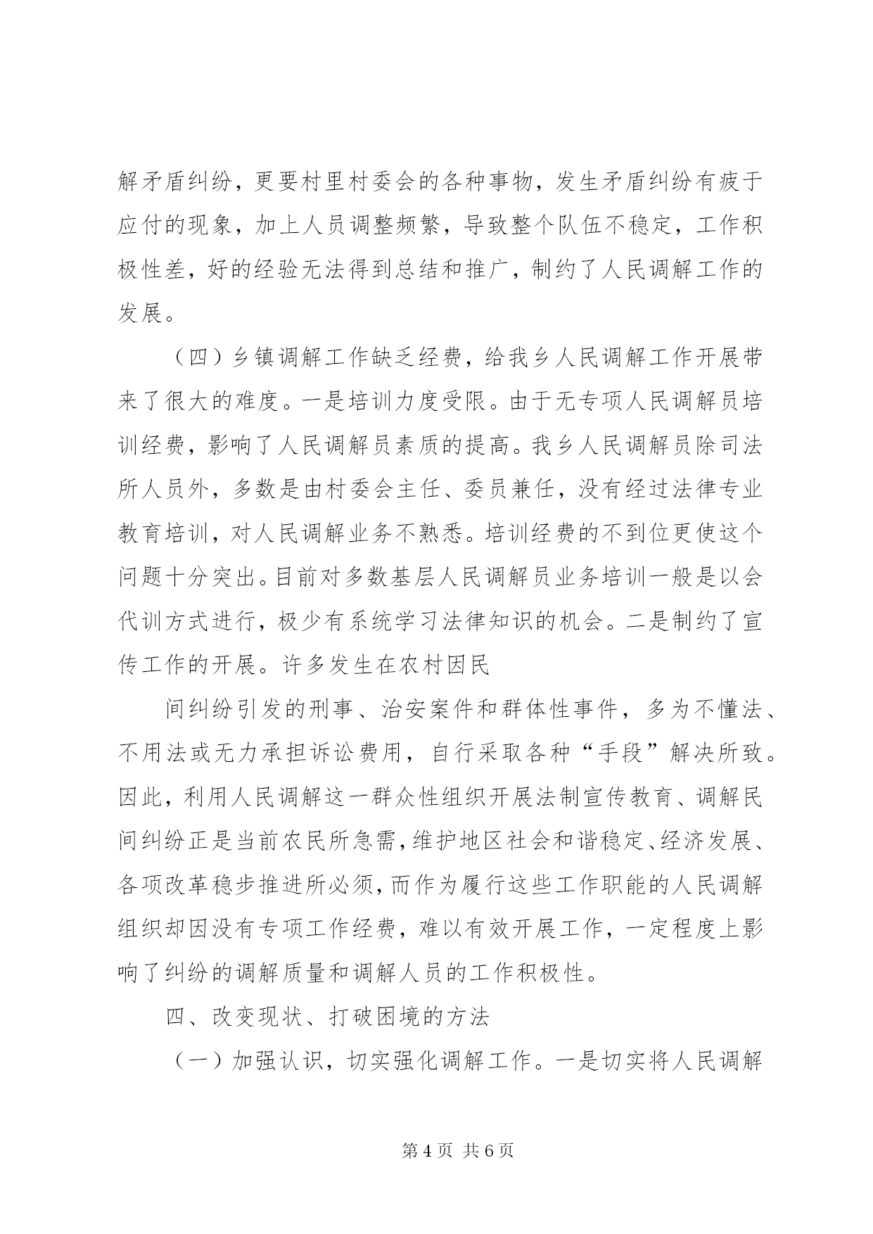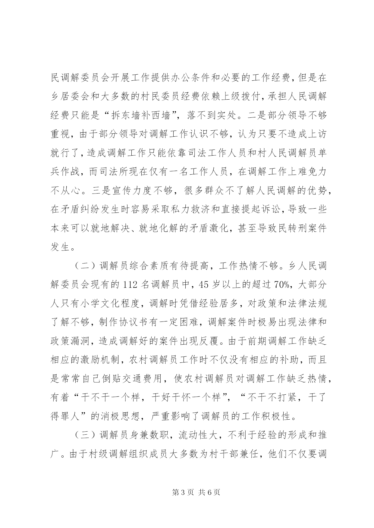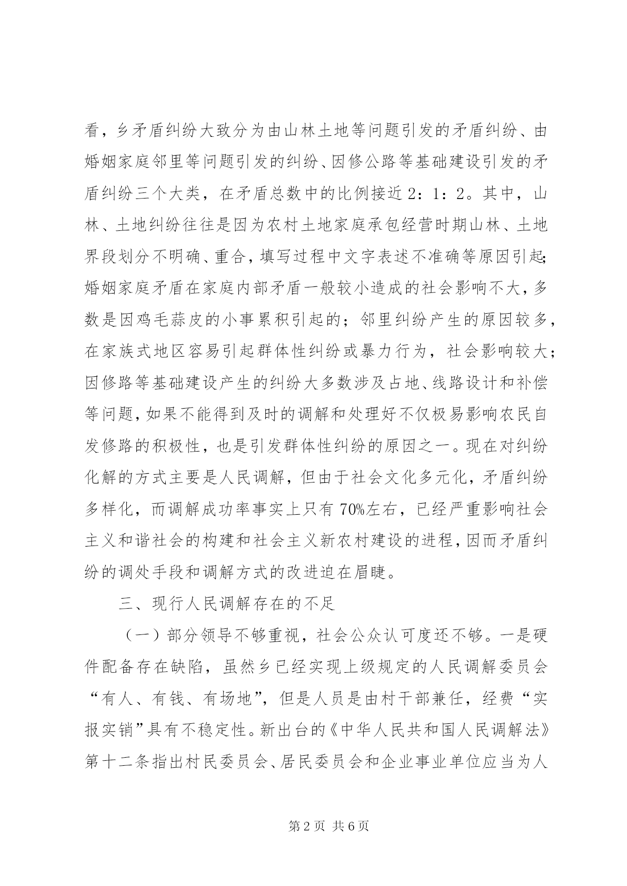 第PAGE\*Arabic\*MERGEFORMAT6页共NUMPAGES\*MERGEFORMAT6页乡镇司法办人民调解现状调研报告加强人员配备和业务指导,切实提高调解成功率。一是在乡司法所增派专业工作人员指导村级调解工作的进行,形成业务上的联系。二是村级人民调解委员会吸纳一批热心公益事业、具有一定文化水平、懂政策、懂法律、文化程在乡综治办工作已经一年了,在与矛盾纠纷打交道的同时我们总是在不断的思考和探索着提高调解效率,减少矛盾纠纷的方法,先就此谈几点浅薄的意见。一、乡基本情况乡素有“楚天茶叶第一乡”和“山歌之乡”的美誉,东邻县城,西接,南临,北出,乡政府机关所在地距县城52公里。全乡国土面积300平方公里,耕地面积40587亩,辖15个行政村、1个居委会,114个村民小组、8067户、27614人,农村劳动力13605人,29个党支部,1155名党员,上年农民年均纯收入2360元,属典型的革命老区和土家族聚居区。全乡建立人民调解委员会16个,其中,乡人民调解委员会1个,村人民调解委员会15个,有调解员112人,制度建设逐渐规范,“大调解”格局基本形成。xx年以来排查排查矛盾纠纷103起,调处成功76起。xx年以来排查矛盾纠纷85起,调处成功63起。矛盾纠纷的发生对社会主义和谐社会构建造成不良影响,而且在一定程度上造成社会危害影响经济发展。二、矛盾纠纷的特点和产生原因根据年对矛盾纠纷的统计来看,乡矛盾纠纷大致分为由山林土地等问题引发的矛盾纠纷、由婚姻家庭邻里等问题引发的纠纷、因修公路等基础建设引发的矛盾纠纷三个大类,在矛盾总数中的比例接近2:1:2。其中,山林、土地纠纷往往是因为农村土地家庭承包经营时期山林、土地界段划分不明确、重合,填写过程中文字表述不准确等原因引起;婚姻家庭矛盾在家庭内部矛盾一般较小造成的社会影响不大,多数是因鸡毛蒜皮的小事累积引起的;邻里纠纷产生的原因较多,在家族式地区容易引起群体性纠纷或暴力行为,社会影响较大;因修路等基础建设产生的纠纷大多数涉及占地、线路设计和补偿等问题,如果不能得到及时的调解和处理好不仅极易影响农民自发修路的积极性,也是引发群体性纠纷的原因之一。现在对纠纷化解的方式主要是人民调解,但由于社会文化多元化,矛盾纠纷多样化,而调解成功率事实上只有70%左右,已经严重影响社会主义和谐社会的构建和社会主义新农村建设的进程,因而矛盾纠纷的调处手段和调解方式的改进迫在眉睫。三、现行人民调解存在的不足(一)部分领导不够重视,社会公众认可度还不够。一是硬件配备存在缺陷,虽然乡已经实现上级规定的人民调解委员会“有人、有钱、有场地”,但是人员是由村干部兼任,经费“实报实销”具有不稳定性。新出台的《中华人民共和国人民调解法》第十二条指出村民委员会、居民委员会和企业事业单位应当为人民调解委员会开展工作提供办公条件和必要的工作经费,但是在乡居委会和大多数的村民委员经费依赖上级拨付,承担人民调解经费只能是“拆东墙补西墙”,落不到实处。二是部分领导不够重视,由于部分领导对调解工作认识不够,认为只要不造成上访就行了,造成调解工作只能依靠司法工作人员和村人民调解员单兵作战,而司法所现在仅有一名工作人员,在调解工作上难免力不从心。三是宣传力度不够,很多群众不了解人民调解的优势,在矛盾纠纷发生时容易采取私力救济和直接提起诉讼,导致一些本来可以就地解决、就地化解的矛盾激化,甚至导致民转刑案件发生。(二)调解员综合素质有待提高,工作热情不够。乡人民调解委员会现有的112名调解员中,45岁以上的超过70%,大部分人只有小学文化程度,调解时凭借经验居多,对政策和法律法规了解不够,制作协议书有一定困难,调解案件时极易出现法律和政策漏洞,造成调解好的案件出现反覆。由于前期调解工作缺乏相应的激励机制,农村调解员工作时不仅没有相应的补助,而且是常常自己倒贴交通费用,使农村调解员对调解工作缺乏热情,有着“干不干一个样,干好干怀一个样”,“不干不打紧,干了得罪人”的消极思想,严重影响了调解员的工作积极性。(三)调解员身兼数职,流动性大,不利于经验的形成和推广。由于村级调解组织成员大多数为村干部兼任,他们不仅要调解矛盾纠纷,更要村里村委会的各种事物,发生矛盾纠纷有疲于应付的现象,加上人员调整频繁,导致整个队伍不稳定,工作积极性差,好的经验无法得到总结和推广,制约了人民调解工作的发展。(四)乡镇调解工作缺乏经费,给我乡人民调解工作开展带来了很大的难度。一是培训力度受限。由于无专项人民调解员培训经费,影响了人民调解员素质的提高。我乡人民调解员除司法所人员外,多数是由村委会主任、委员兼任,没有经过法律专业教育培训,对人民调解业务不熟悉。培训经费的不到位更使这个问题十分突出。目前对多数基层人民调解员业务培训一般是以会代训方式