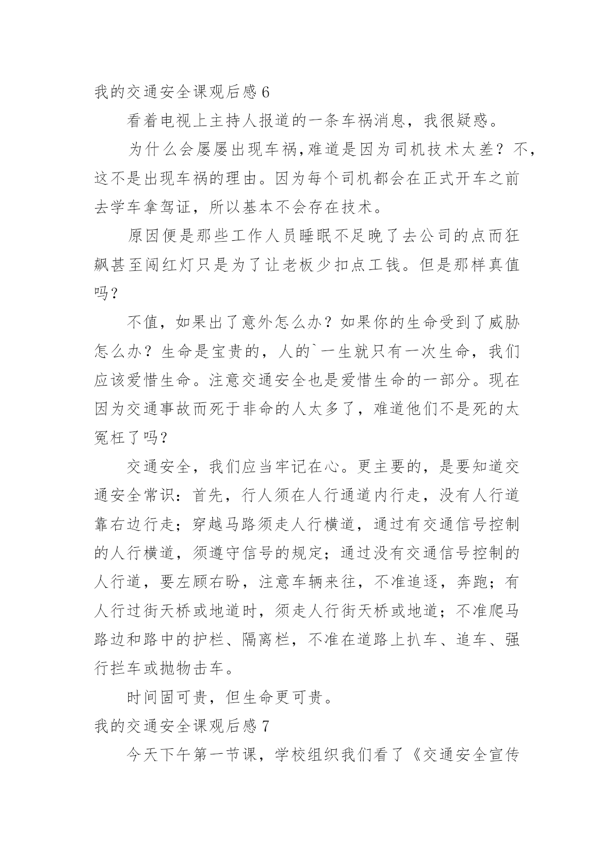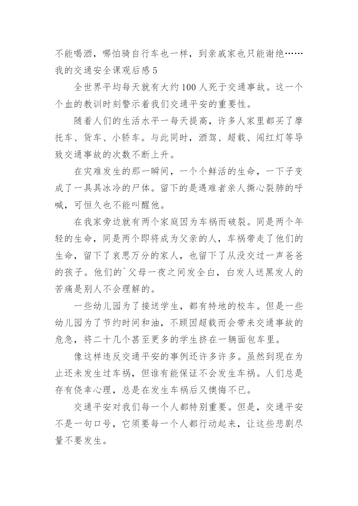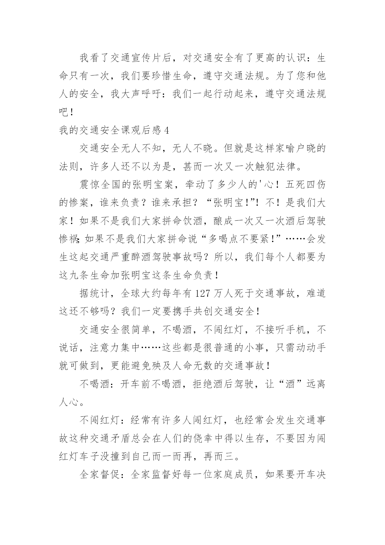 我的交通安全课观后感我的交通安全课观后感当看完一部作品后,想必你有不少可以分享的东西,为此需要好好认真地写观后感。可是观后感怎么写才合适呢?下面是小编精心整理的我的交通安全课观后感,仅供参考,希望能够帮助到大家。我的交通安全课观后感1今天,我们学校邀请了陈警官来我们学校进行了《交通知识讲座》,讲得可细致了。贾警官先讲了过马路的要点:不能离正在拐弯的车太近、不能在指示灯为红灯的时候过马路、在过没有指示灯的马路时要看车等,然后讲了文明乘车的要点,最后讲了12岁之后才能骑自行车,即使12之后,在骑自行车也要了解相关的规定才能骑等许多知识。贾警官讲完后,让我深思起来,仔细想一想,姥姥、姥爷、妈妈以及我都犯下了不少错误,如:没交警的地方就违反交通规则——横穿马路。就拿几年前来说吧,我和妈妈在我家附近的人行道上,只见妈妈东张西望看看有没有交警,然后就拉着我横穿马路,结果刚走出马路就被罚款,但至今都没有改。他们还有不文明乘车的的现象,自己偶尔也不例外,如:有一次,一个老奶奶上了车,没有座位了,我心想:让吧,但又没胆量,不让吧,自己又是少先队员,要不然下车,给老奶奶让座?可离我要去的'地方还很远。最终,是一位小弟弟让的座位,此刻,羞愧、内疚骤然涌上心头,脸一下子涨得通红通红。今后,为了我们全家的安全,我一定要先以身作则,再极力提醒姥姥、姥爷、妈妈还有我的习惯性违反交通规则的错误!我的交通安全课观后感2由于对道路的不断改造,我们周边的道路不仅变的越来越宽,而且也越来越高。但是与此同时,路上的人流、车流也越来越多了。这样一来就给我们中小学生的出行带来了难题。在“122交通安全日”到来之际,我们就非常有必要关注这样一个主题:如何让孩子们在安全中成长。视频以一个同龄人给父母的`一封平安家书为开头,并配上交通安全意外事故的视频和图片,惊心动魄的场面让我受到了警醒。我每天要自己过马路,我想我的爸爸妈妈一定非常担心我。为了不让他们担心,我们不能翻越护栏,不然,很可能发生交通事故的,轻则受伤,重则丧命。当然,现实生活中也有这样的案例,一个学生与他的奶奶在一起车祸事故中都去世了,听起来真叫人揪心,更叫人害怕。可时间不能倒流,生命不能重来,所以我们要珍惜生命,文明出行。假如我们要骑自行车上学的话,千万不能闯红灯。我们也要提醒父母,注意交通灯。美好的人生从安全开始,只有保证了健康和安全,才能创造美好未来,大家一定要培养文明交通意识,养成自觉遵守交通法规的良好习惯。只要大家始终把交通安全牢记在心,落实到行动,我们完全可以远离交通事故。我的交通安全课观后感3生命只有一次,不会再生,也无法重来!可有些人却不珍惜生命,觉得闯一次红灯,横穿一次马路没有什么。“红灯停,绿灯行……”这是众所周知的交通安全口诀,就连上幼儿园的小朋友都能倒背如流。可现实生活中,谁又能自觉遵守交通规则呢?今天在我们临河三小特别的'升国旗仪式上,杨百凌校长给我们播放了一个交通宣传片。视频中间有一个调查,调查中小学生横穿马路,闯红灯的人不在少数。而且他们认为只要没车就没有危险,就可以横穿马路。明显这种行为是不对的。视频中还有一位小伙子快速走在马路中央,结果左不顾,右不看,结果被车碾压。这真是惊心动魄的事件啊!这样不遵守交通规则的人现在也非常多,一旦出事故,死亡率非常高。我国中小学生第二大生命杀手就是交通事故。现在,交通事故已不能忽视,而预防交通事故有很多办法如:不闯红灯,过马路要走斑马线,过没有信号灯的马路时要左顾右盼。其实,最重要的是守法。人们自觉遵守交通法规,事故率就会大大地减少。我看了交通宣传片后,对交通安全有了更高的认识:生命只有一次,我们要珍惜生命,遵守交通法规。为了您和他人的安全,我大声呼吁:我们一起行动起来,遵守交通法规吧!我的交通安全课观后感4交通安全无人不知,无人不晓。但就是这样家喻户晓的法则,许多人还不以为是,甚而一次又一次触犯法律。震惊全国的张明宝案,牵动了多少人的'心!五死四伤的惨案,谁来负责?谁来承担?“张明宝!”!不!是我们大家!如果不是我们大家拼命饮酒,酿成一次又一次酒后驾驶惨祸;如果不是我们大家拼命说“多喝点不要紧!”……会发生这起交通严重醉酒驾驶事故吗?所以,我们每个人都要为这九条生命加张明宝这条生命负责!据统计,全球大约每年有127万人死于交通事故,难道这还不够吗?我们一定要携手共创交通安全!交通安全很简单,不喝酒,不闯红灯,不接听手机,不说话,注意力集中……这些都是很普通的小事,只需动动手就可做到,更能避免殃及人命无数的交通事故!不喝酒:开车前不喝酒,拒绝酒后驾驶,让“酒”远离人心。不闯红灯:经常有许多人闯红灯,也经常会发生交通事故这种交通矛盾总会在人们的侥幸中得以生存,不要因为闯红灯车子没撞到自己而一而再,再而三。全家督促:全家监督好每一位家庭成员,如果要开车
