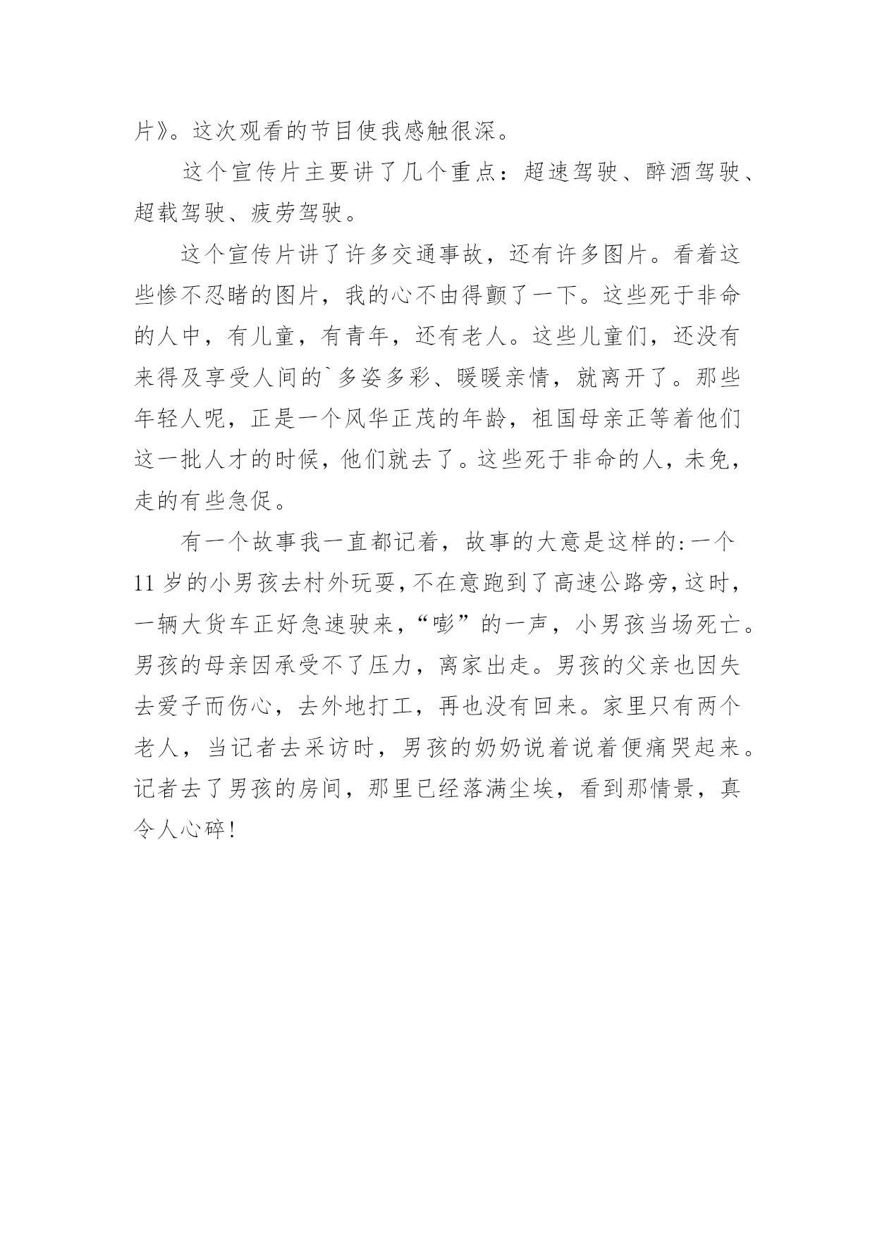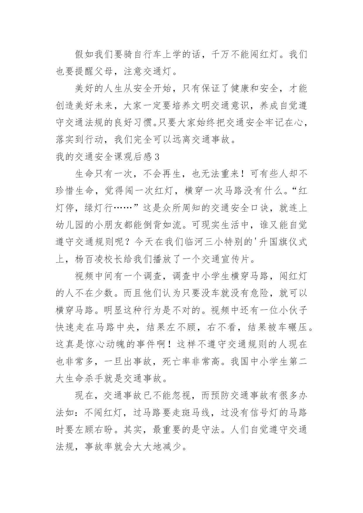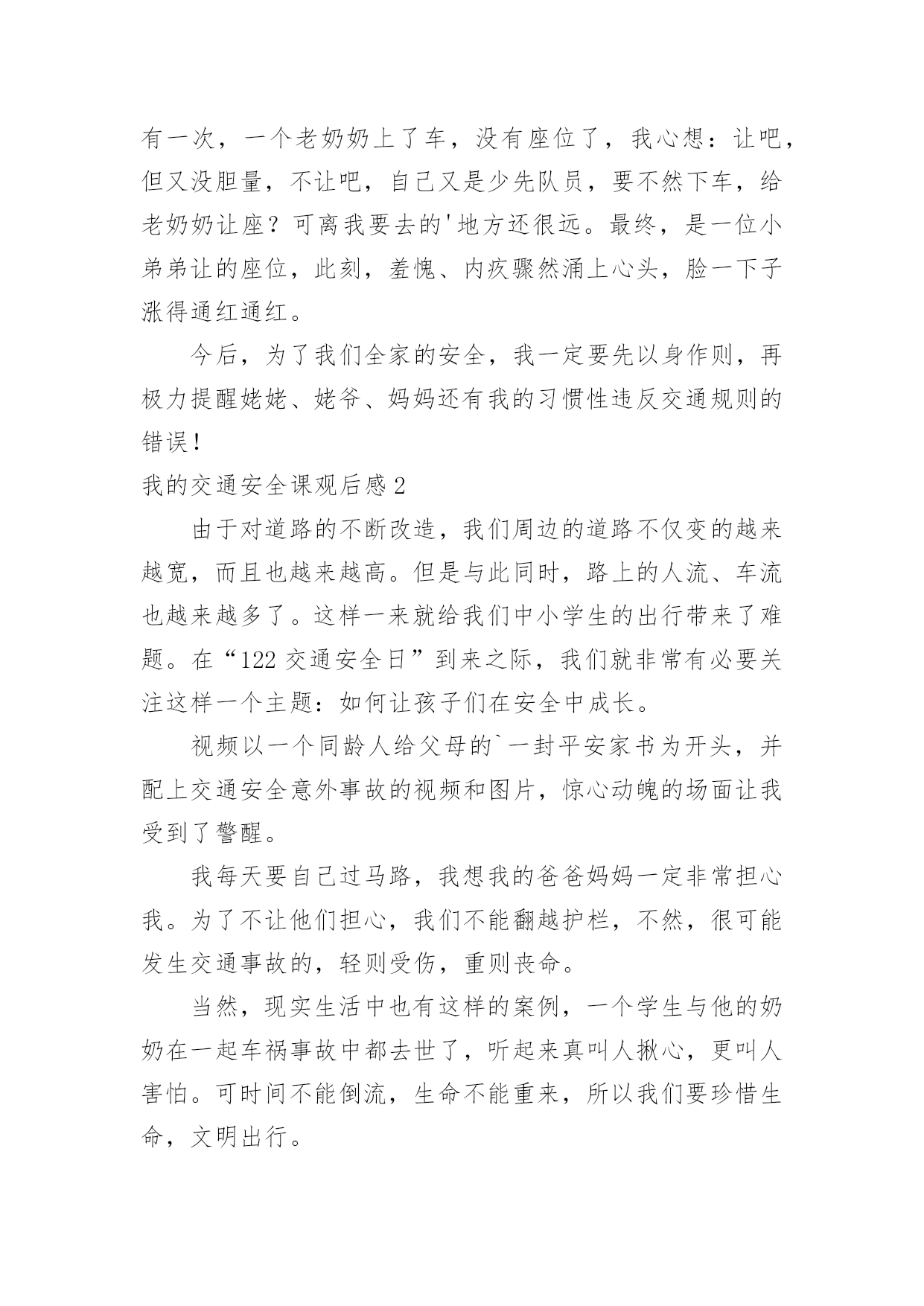 我的交通安全课观后感我的交通安全课观后感当看完一部作品后,想必你有不少可以分享的东西,为此需要好好认真地写观后感。可是观后感怎么写才合适呢?下面是小编精心整理的我的交通安全课观后感,仅供参考,希望能够帮助到大家。我的交通安全课观后感1今天,我们学校邀请了陈警官来我们学校进行了《交通知识讲座》,讲得可细致了。贾警官先讲了过马路的要点:不能离正在拐弯的车太近、不能在指示灯为红灯的时候过马路、在过没有指示灯的马路时要看车等,然后讲了文明乘车的要点,最后讲了12岁之后才能骑自行车,即使12之后,在骑自行车也要了解相关的规定才能骑等许多知识。贾警官讲完后,让我深思起来,仔细想一想,姥姥、姥爷、妈妈以及我都犯下了不少错误,如:没交警的地方就违反交通规则——横穿马路。就拿几年前来说吧,我和妈妈在我家附近的人行道上,只见妈妈东张西望看看有没有交警,然后就拉着我横穿马路,结果刚走出马路就被罚款,但至今都没有改。他们还有不文明乘车的的现象,自己偶尔也不例外,如:有一次,一个老奶奶上了车,没有座位了,我心想:让吧,但又没胆量,不让吧,自己又是少先队员,要不然下车,给老奶奶让座?可离我要去的'地方还很远。最终,是一位小弟弟让的座位,此刻,羞愧、内疚骤然涌上心头,脸一下子涨得通红通红。今后,为了我们全家的安全,我一定要先以身作则,再极力提醒姥姥、姥爷、妈妈还有我的习惯性违反交通规则的错误!我的交通安全课观后感2由于对道路的不断改造,我们周边的道路不仅变的越来越宽,而且也越来越高。但是与此同时,路上的人流、车流也越来越多了。这样一来就给我们中小学生的出行带来了难题。在“122交通安全日”到来之际,我们就非常有必要关注这样一个主题:如何让孩子们在安全中成长。视频以一个同龄人给父母的`一封平安家书为开头,并配上交通安全意外事故的视频和图片,惊心动魄的场面让我受到了警醒。我每天要自己过马路,我想我的爸爸妈妈一定非常担心我。为了不让他们担心,我们不能翻越护栏,不然,很可能发生交通事故的,轻则受伤,重则丧命。当然,现实生活中也有这样的案例,一个学生与他的奶奶在一起车祸事故中都去世了,听起来真叫人揪心,更叫人害怕。可时间不能倒流,生命不能重来,所以我们要珍惜生命,文明出行。假如我们要骑自行车上学的话,千万不能闯红灯。我们也要提醒父母,注意交通灯。美好的人生从安全开始,只有保证了健康和安全,才能创造美好未来,大家一定要培养文明交通意识,养成自觉遵守交通法规的良好习惯。只要大家始终把交通安全牢记在心,落实到行动,我们完全可以远离交通事故。我的交通安全课观后感3生命只有一次,不会再生,也无法重来!可有些人却不珍惜生命,觉得闯一次红灯,横穿一次马路没有什么。“红灯停,绿灯行……”这是众所周知的交通安全口诀,就连上幼儿园的小朋友都能倒背如流。可现实生活中,谁又能自觉遵守交通规则呢?今天在我们临河三小特别的'升国旗仪式上,杨百凌校长给我们播放了一个交通宣传片。视频中间有一个调查,调查中小学生横穿马路,闯红灯的人不在少数。而且他们认为只要没车就没有危险,就可以横穿马路。明显这种行为是不对的。视频中还有一位小伙子快速走在马路中央,结果左不顾,右不看,结果被车碾压。这真是惊心动魄的事件啊!这样不遵守交通规则的人现在也非常多,一旦出事故,死亡率非常高。我国中小学生第二大生命杀手就是交通事故。现在,交通事故已不能忽视,而预防交通事故有很多办法如:不闯红灯,过马路要走斑马线,过没有信号灯的马路时要左顾右盼。其实,最重要的是守法。人们自觉遵守交通法规,事故率就会大大地减少。我看了交通宣传片后,对交通安全有了更高的认识:生命只有一次,我们要珍惜生命,遵守交通法规。为了您和他人的安全,我大声呼吁:我们一起行动起来,遵守交通法规吧!我的交通安全课观后感4交通安全无人不知,无人不晓。但就是这样家喻户晓的法则,许多人还不以为是,甚而一次又一次触犯法律。震惊全国的张明宝案,牵动了多少人的'心!五死四伤的惨案,谁来负责?谁来承担?“张明宝!”!不!是我们大家!如果不是我们大家拼命饮酒,酿成一次又一次酒后驾驶惨祸;如果不是我们大家拼命说“多喝点不要紧!”……会发生这起交通严重醉酒驾驶事故吗?所以,我们每个人都要为这九条生命加张明宝这条生命负责!据统计,全球大约每年有127万人死于交通事故,难道这还不够吗?我们一定要携手共创交通安全!交通安全很简单,不喝酒,不闯红灯,不接听手机,不说话,注意力集中……这些都是很普通的小事,只需动动手就可做到,更能避免殃及人命无数的交通事故!不喝酒:开车前不喝酒,拒绝酒后驾驶,让“酒”远离人心。不闯红灯:经常有许多人闯红灯,也经常会发生交通事故这种交通矛盾总会在人们的侥幸中得以生存,不要因为闯红灯车子没撞到自己而一而再,再而三。全家督促:全家监督好每一位家庭成员,如果要开车