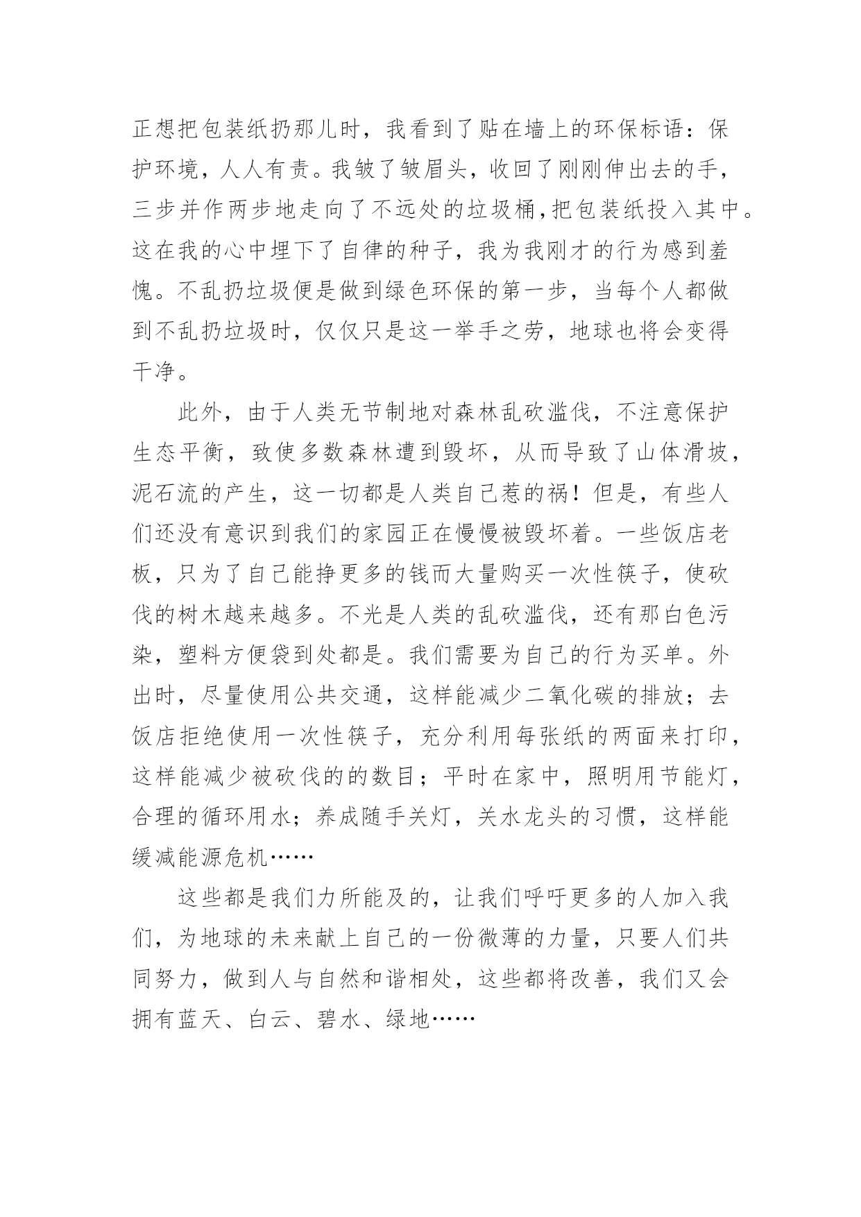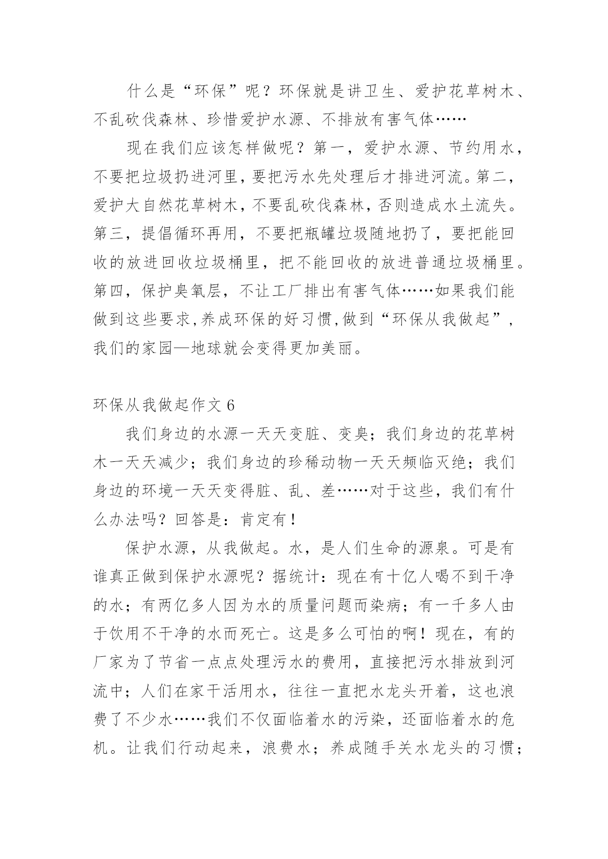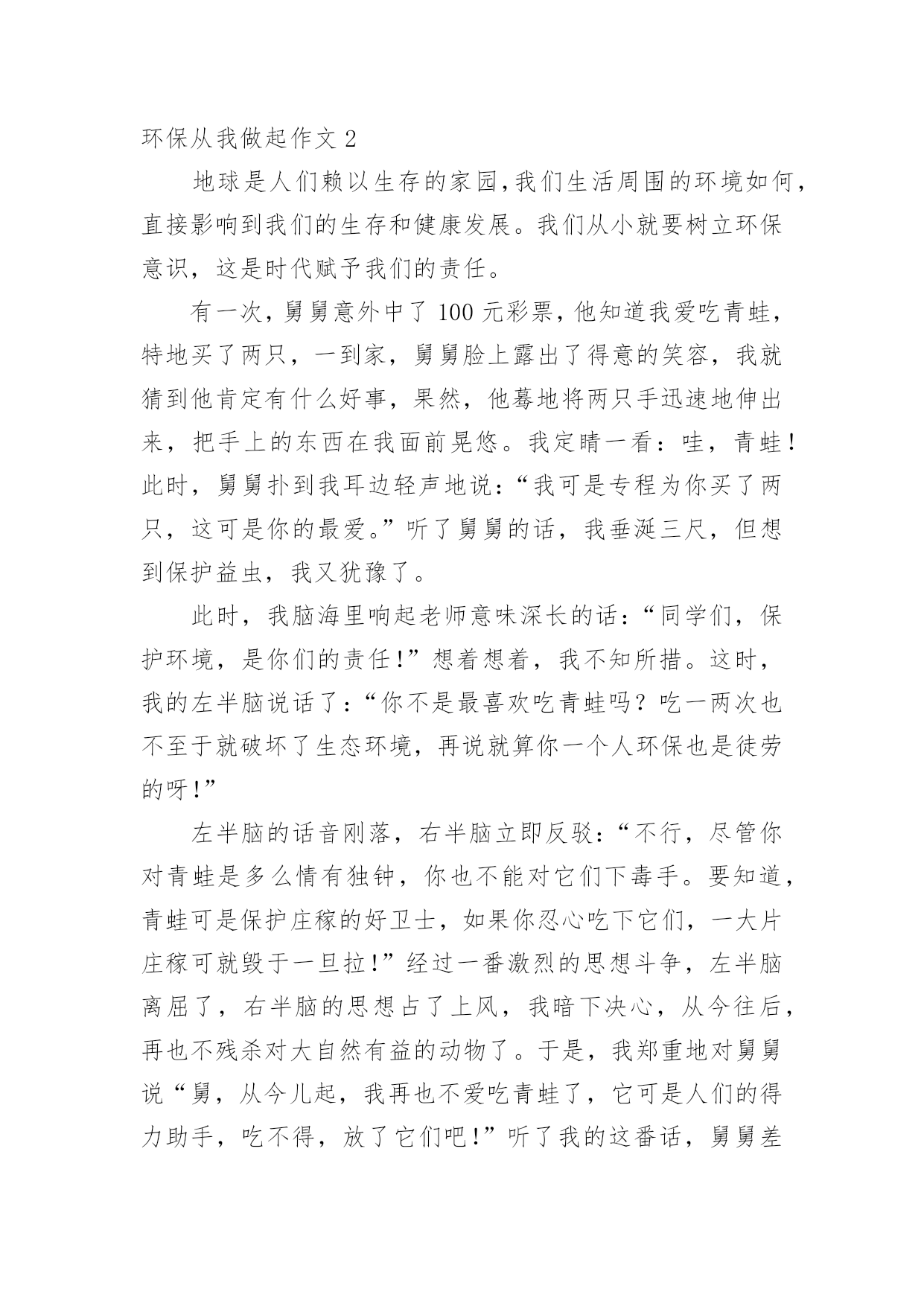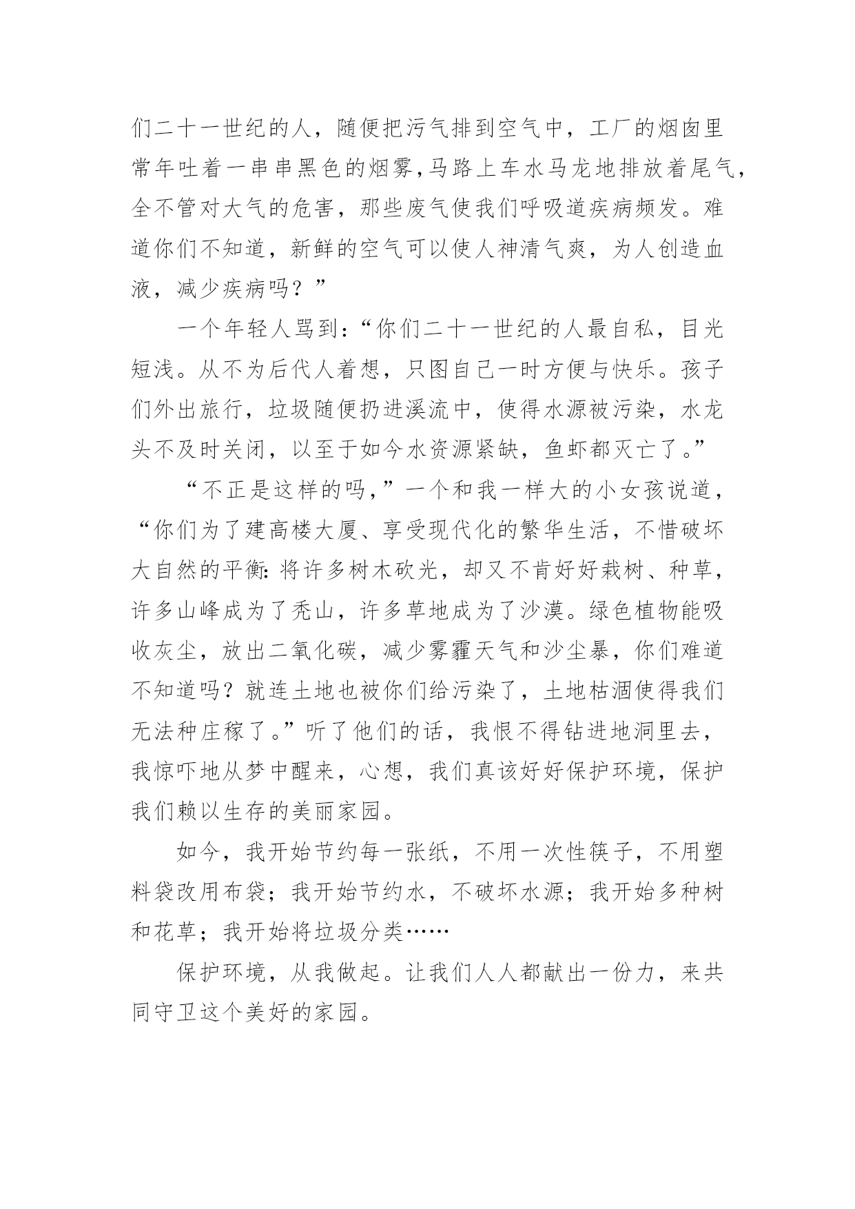 环保从我做起作文环保从我做起作文通用15篇在平凡的学习、工作、生活中,大家都不可避免地会接触到作文吧,借助作文人们可以实现文化交流的目的。如何写一篇有思想、有文采的作文呢?下面是小编精心整理的环保从我做起作文,供大家参考借鉴,希望可以帮助到有需要的朋友。环保从我做起作文1今天看了几则关于环保的新闻报道,我不禁感触万千,日有所思夜有所梦,晚上的睡梦中我便梦到了未来。梦中我听说22世纪是超高科技信息时代,于是我乘坐着时光飞船来到了二十二世纪的地球上……我兴致勃勃地下了飞船,却看见了令人难以想象的情景:土黄色的天空像一口大锅罩在头顶上,天上不断飘着黄沙;太阳没精打采地悬在天空,似乎已经疲惫不堪。真热啊!我的身上仿佛像火烧一样。空气里弥漫着难闻的化学药品味道,令我头晕目眩,呛出了眼泪。地面踩上去像石头一样的硬。我看见一片焦黄的土地上,横七竖八的躺着水生动物的骨架。我看见一群群衣衫褴褛,弯着腰的人,到处寻找食物,他们一个个精神萎靡、毫无生机。当人们知道我是个从21世纪来的人,都朝我这边聚拢过来,你一言我一语地控诉了起来。一位老人生气地说:“你们二十一世纪的人,随便把污气排到空气中,工厂的烟囱里常年吐着一串串黑色的烟雾,马路上车水马龙地排放着尾气,全不管对大气的危害,那些废气使我们呼吸道疾病频发。难道你们不知道,新鲜的空气可以使人神清气爽,为人创造血液,减少疾病吗?”一个年轻人骂到:“你们二十一世纪的人最自私,目光短浅。从不为后代人着想,只图自己一时方便与快乐。孩子们外出旅行,垃圾随便扔进溪流中,使得水源被污染,水龙头不及时关闭,以至于如今水资源紧缺,鱼虾都灭亡了。”“不正是这样的吗,”一个和我一样大的小女孩说道,“你们为了建高楼大厦、享受现代化的繁华生活,不惜破坏大自然的平衡:将许多树木砍光,却又不肯好好栽树、种草,许多山峰成为了秃山,许多草地成为了沙漠。绿色植物能吸收灰尘,放出二氧化碳,减少雾霾天气和沙尘暴,你们难道不知道吗?就连土地也被你们给污染了,土地枯涸使得我们无法种庄稼了。”听了他们的话,我恨不得钻进地洞里去,我惊吓地从梦中醒来,心想,我们真该好好保护环境,保护我们赖以生存的美丽家园。如今,我开始节约每一张纸,不用一次性筷子,不用塑料袋改用布袋;我开始节约水,不破坏水源;我开始多种树和花草;我开始将垃圾分类……保护环境,从我做起。让我们人人都献出一份力,来共同守卫这个美好的家园。环保从我做起作文2地球是人们赖以生存的家园,我们生活周围的环境如何,直接影响到我们的生存和健康发展。我们从小就要树立环保意识,这是时代赋予我们的责任。有一次,舅舅意外中了100元彩票,他知道我爱吃青蛙,特地买了两只,一到家,舅舅脸上露出了得意的笑容,我就猜到他肯定有什么好事,果然,他蓦地将两只手迅速地伸出来,把手上的东西在我面前晃悠。我定睛一看:哇,青蛙!此时,舅舅扑到我耳边轻声地说:“我可是专程为你买了两只,这可是你的最爱。”听了舅舅的话,我垂涎三尺,但想到保护益虫,我又犹豫了。此时,我脑海里响起老师意味深长的话:“同学们,保护环境,是你们的责任!”想着想着,我不知所措。这时,我的左半脑说话了:“你不是最喜欢吃青蛙吗?吃一两次也不至于就破坏了生态环境,再说就算你一个人环保也是徒劳的呀!”左半脑的话音刚落,右半脑立即反驳:“不行,尽管你对青蛙是多么情有独钟,你也不能对它们下毒手。要知道,青蛙可是保护庄稼的好卫士,如果你忍心吃下它们,一大片庄稼可就毁于一旦拉!”经过一番激烈的思想斗争,左半脑离屈了,右半脑的思想占了上风,我暗下决心,从今往后,再也不残杀对大自然有益的动物了。于是,我郑重地对舅舅说“舅,从今儿起,我再也不爱吃青蛙了,它可是人们的得力助手,吃不得,放了它们吧!”听了我的这番话,舅舅差点儿晕过去,又疑惑又生气地说道:“我可是看你那么喜欢吃青蛙才大‘放血’买上两只的,你现在告诉我要放生,这是为何?”“我不是说的很明白了吗?青蛙是吃害虫的专家,如果你吃了它,今年,你那一片绿油油的麦田可就。”话还没说完,舅舅就笑眯眯地说:“小机灵鬼,斗不过你,那你就到天里把它放了吧,以免我们全家去喝西北风!”“哈哈哈”我们开心的笑了。保护环境,人人有责。我们头顶同一片蓝天,脚踩同一片土地,保护环境,我们责无旁贷,让我们携手采取行动,让明天的天更蓝、水更清、草更绿,让明天的大自然充满生机人们生活更美满!环保从我做起作文3天空的幸福,在于它的湛蓝;河水的幸福,在于它的清澈;大地的幸福,在于它那多姿多彩的生命……然而如今,天空被蒙上了一层灰,河水变得浑浊肮脏,许多肥沃的大地变成了沙漠。过度开发、化学污染、生活中不好的习惯都导致了环境问题越来越严重。那么,你是否听见了地球在哭泣?面对曾经美丽的一切,你是否有所感触?从现在开始,让我们改变这些情况,绿色环保从我做起。我作为