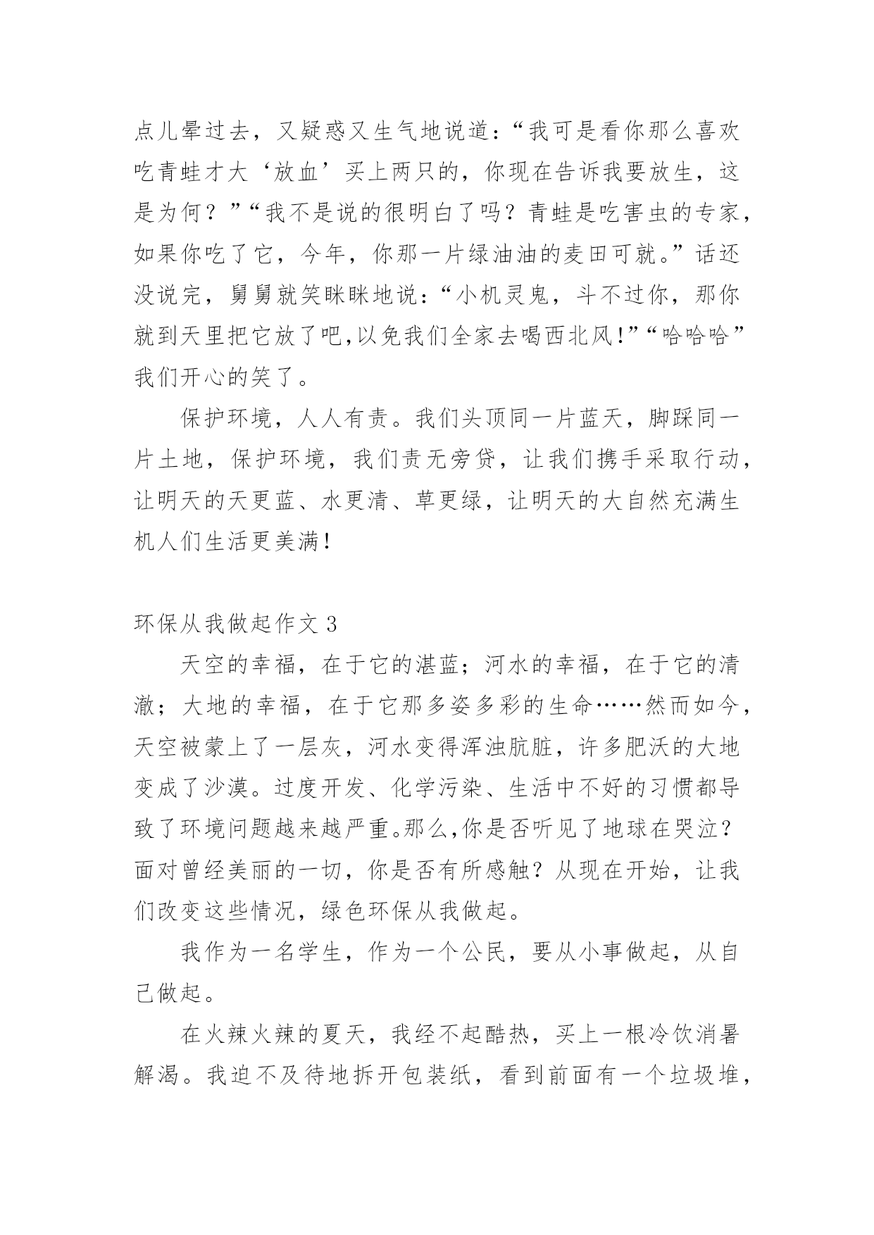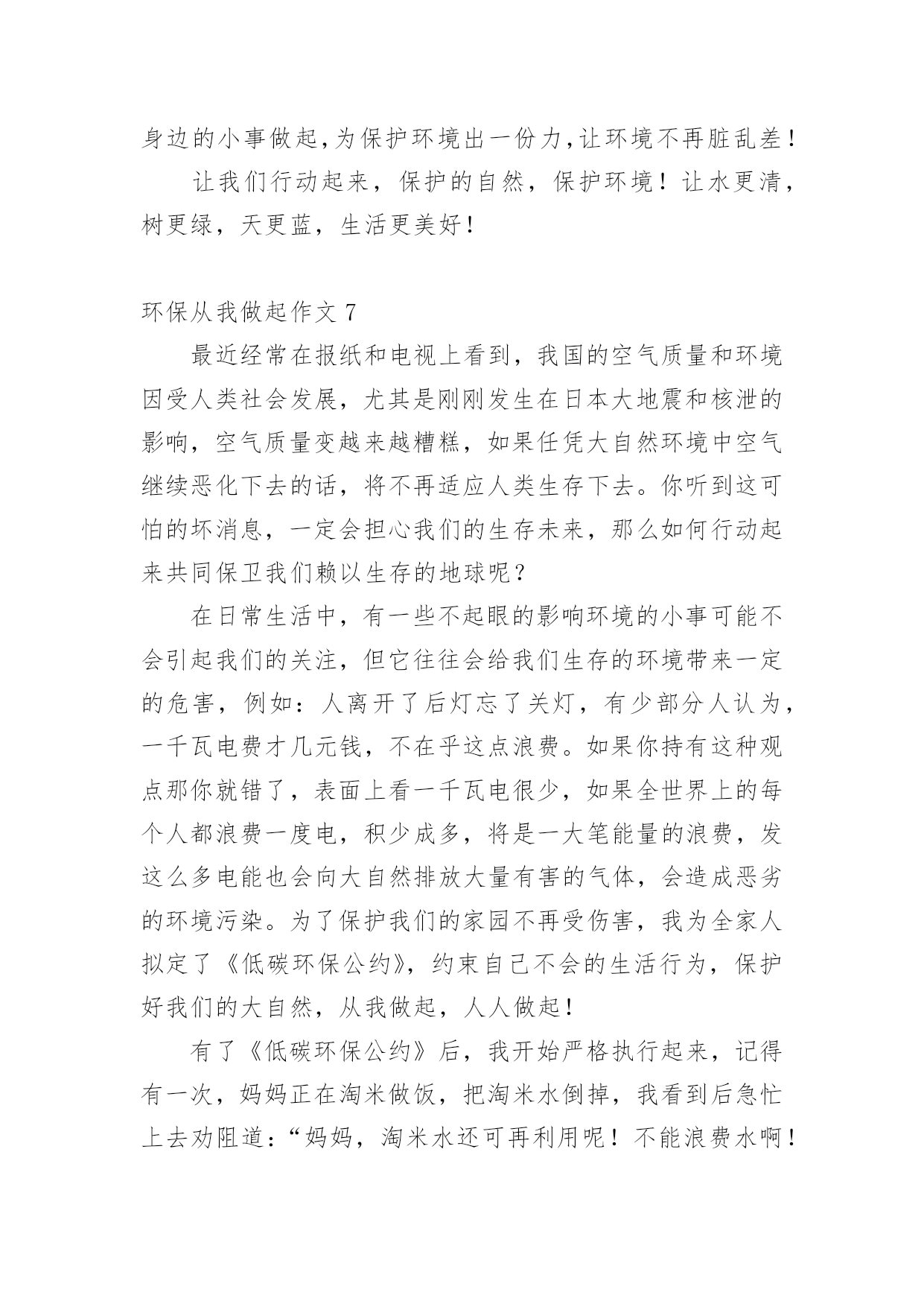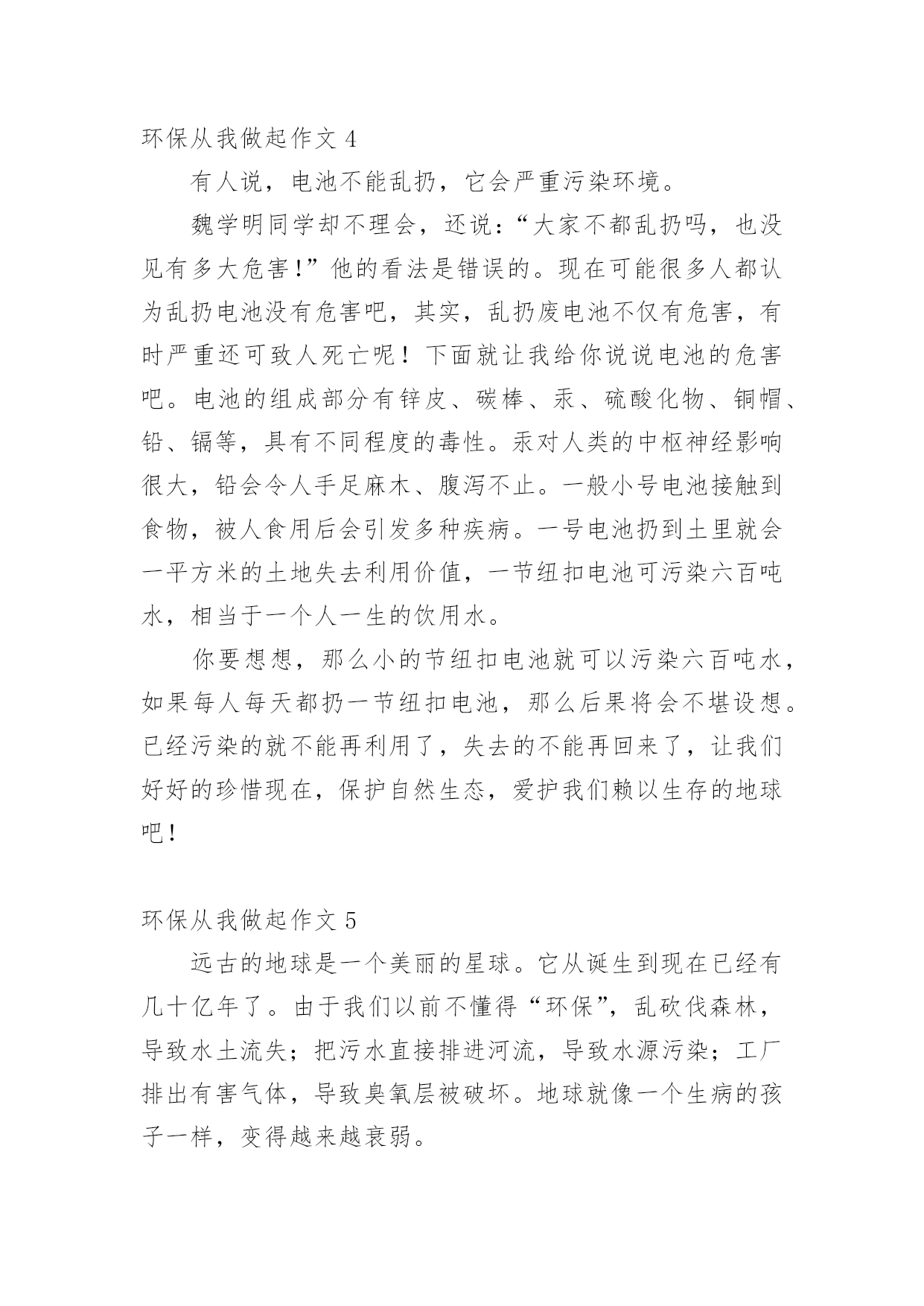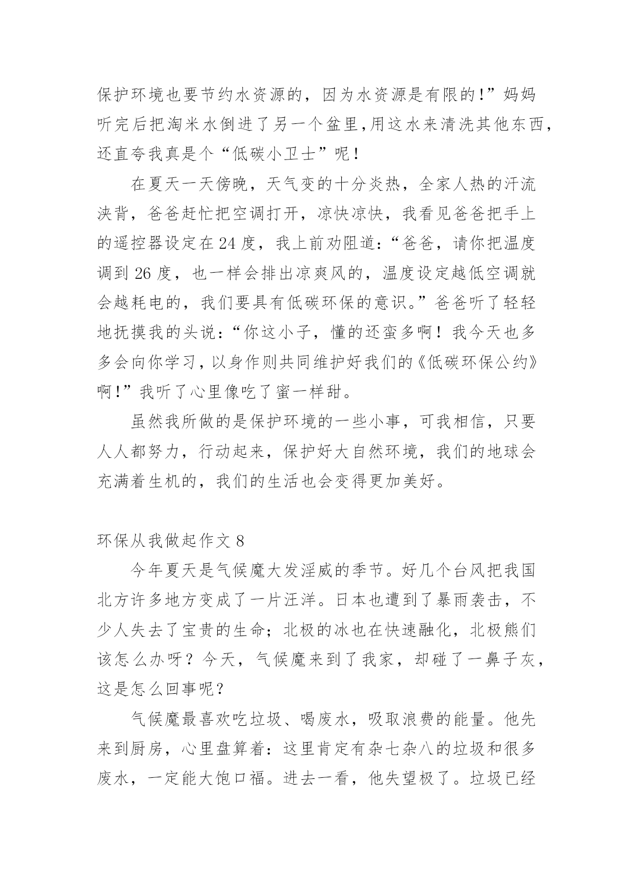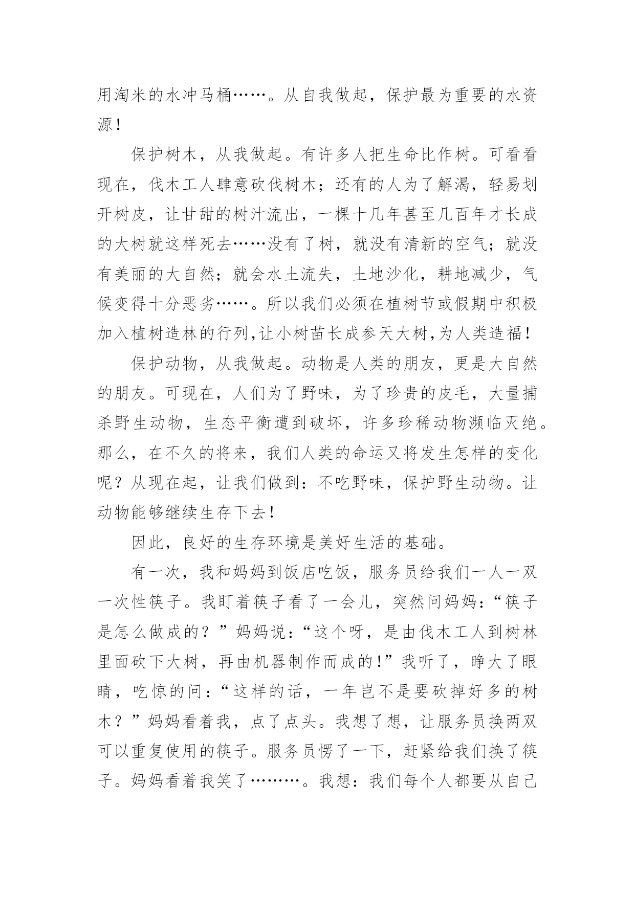 环保从我做起作文环保从我做起作文通用15篇在平凡的学习、工作、生活中,大家都不可避免地会接触到作文吧,借助作文人们可以实现文化交流的目的。如何写一篇有思想、有文采的作文呢?下面是小编精心整理的环保从我做起作文,供大家参考借鉴,希望可以帮助到有需要的朋友。环保从我做起作文1今天看了几则关于环保的新闻报道,我不禁感触万千,日有所思夜有所梦,晚上的睡梦中我便梦到了未来。梦中我听说22世纪是超高科技信息时代,于是我乘坐着时光飞船来到了二十二世纪的地球上……我兴致勃勃地下了飞船,却看见了令人难以想象的情景:土黄色的天空像一口大锅罩在头顶上,天上不断飘着黄沙;太阳没精打采地悬在天空,似乎已经疲惫不堪。真热啊!我的身上仿佛像火烧一样。空气里弥漫着难闻的化学药品味道,令我头晕目眩,呛出了眼泪。地面踩上去像石头一样的硬。我看见一片焦黄的土地上,横七竖八的躺着水生动物的骨架。我看见一群群衣衫褴褛,弯着腰的人,到处寻找食物,他们一个个精神萎靡、毫无生机。当人们知道我是个从21世纪来的人,都朝我这边聚拢过来,你一言我一语地控诉了起来。一位老人生气地说:“你们二十一世纪的人,随便把污气排到空气中,工厂的烟囱里常年吐着一串串黑色的烟雾,马路上车水马龙地排放着尾气,全不管对大气的危害,那些废气使我们呼吸道疾病频发。难道你们不知道,新鲜的空气可以使人神清气爽,为人创造血液,减少疾病吗?”一个年轻人骂到:“你们二十一世纪的人最自私,目光短浅。从不为后代人着想,只图自己一时方便与快乐。孩子们外出旅行,垃圾随便扔进溪流中,使得水源被污染,水龙头不及时关闭,以至于如今水资源紧缺,鱼虾都灭亡了。”“不正是这样的吗,”一个和我一样大的小女孩说道,“你们为了建高楼大厦、享受现代化的繁华生活,不惜破坏大自然的平衡:将许多树木砍光,却又不肯好好栽树、种草,许多山峰成为了秃山,许多草地成为了沙漠。绿色植物能吸收灰尘,放出二氧化碳,减少雾霾天气和沙尘暴,你们难道不知道吗?就连土地也被你们给污染了,土地枯涸使得我们无法种庄稼了。”听了他们的话,我恨不得钻进地洞里去,我惊吓地从梦中醒来,心想,我们真该好好保护环境,保护我们赖以生存的美丽家园。如今,我开始节约每一张纸,不用一次性筷子,不用塑料袋改用布袋;我开始节约水,不破坏水源;我开始多种树和花草;我开始将垃圾分类……保护环境,从我做起。让我们人人都献出一份力,来共同守卫这个美好的家园。环保从我做起作文2地球是人们赖以生存的家园,我们生活周围的环境如何,直接影响到我们的生存和健康发展。我们从小就要树立环保意识,这是时代赋予我们的责任。有一次,舅舅意外中了100元彩票,他知道我爱吃青蛙,特地买了两只,一到家,舅舅脸上露出了得意的笑容,我就猜到他肯定有什么好事,果然,他蓦地将两只手迅速地伸出来,把手上的东西在我面前晃悠。我定睛一看:哇,青蛙!此时,舅舅扑到我耳边轻声地说:“我可是专程为你买了两只,这可是你的最爱。”听了舅舅的话,我垂涎三尺,但想到保护益虫,我又犹豫了。此时,我脑海里响起老师意味深长的话:“同学们,保护环境,是你们的责任!”想着想着,我不知所措。这时,我的左半脑说话了:“你不是最喜欢吃青蛙吗?吃一两次也不至于就破坏了生态环境,再说就算你一个人环保也是徒劳的呀!”左半脑的话音刚落,右半脑立即反驳:“不行,尽管你对青蛙是多么情有独钟,你也不能对它们下毒手。要知道,青蛙可是保护庄稼的好卫士,如果你忍心吃下它们,一大片庄稼可就毁于一旦拉!”经过一番激烈的思想斗争,左半脑离屈了,右半脑的思想占了上风,我暗下决心,从今往后,再也不残杀对大自然有益的动物了。于是,我郑重地对舅舅说“舅,从今儿起,我再也不爱吃青蛙了,它可是人们的得力助手,吃不得,放了它们吧!”听了我的这番话,舅舅差点儿晕过去,又疑惑又生气地说道:“我可是看你那么喜欢吃青蛙才大‘放血’买上两只的,你现在告诉我要放生,这是为何?”“我不是说的很明白了吗?青蛙是吃害虫的专家,如果你吃了它,今年,你那一片绿油油的麦田可就。”话还没说完,舅舅就笑眯眯地说:“小机灵鬼,斗不过你,那你就到天里把它放了吧,以免我们全家去喝西北风!”“哈哈哈”我们开心的笑了。保护环境,人人有责。我们头顶同一片蓝天,脚踩同一片土地,保护环境,我们责无旁贷,让我们携手采取行动,让明天的天更蓝、水更清、草更绿,让明天的大自然充满生机人们生活更美满!环保从我做起作文3天空的幸福,在于它的湛蓝;河水的幸福,在于它的清澈;大地的幸福,在于它那多姿多彩的生命……然而如今,天空被蒙上了一层灰,河水变得浑浊肮脏,许多肥沃的大地变成了沙漠。过度开发、化学污染、生活中不好的习惯都导致了环境问题越来越严重。那么,你是否听见了地球在哭泣?面对曾经美丽的一切,你是否有所感触?从现在开始,让我们改变这些情况,绿色环保从我做起。我作为