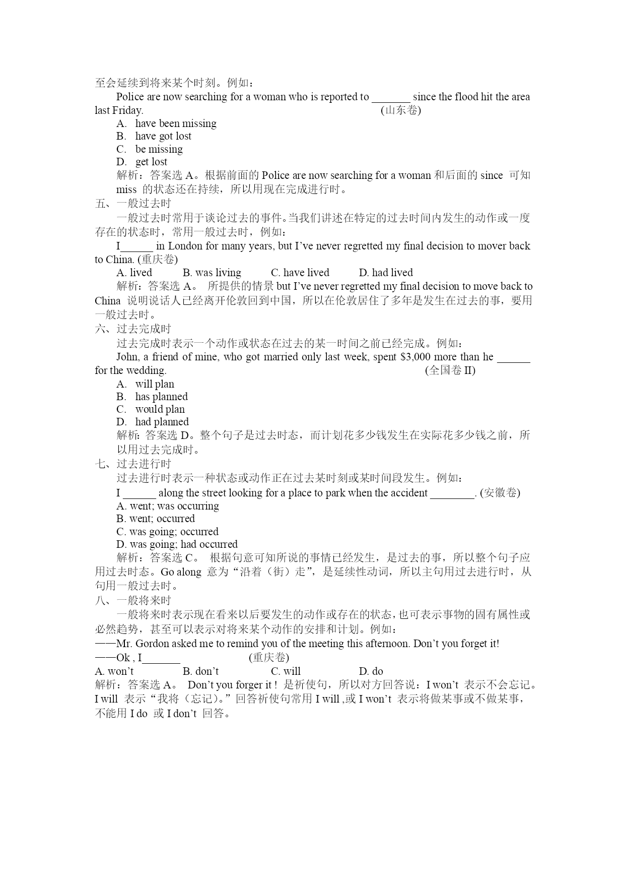 备战高考---动词时态篇动词的时态在英语中是个非常重要的语法项目,几乎是每年高考的必考内容。下面以2006年各地高考题为例,对动词时态的考查作一小结。一般现在时一般现在时可用来陈述现在时段内发生、存在的事件、动作或情况,陈述主语的特征、能力、性格及客观事实和普遍真理。当谈及时间表、节目单或日程表上已经安排好的将要发生的动作时,用一般现在时代替将来时。在条件时间和让步状语从句中,也用一般现在时代替将来时。例如:Lookatthetimetable.Hurryup!Flight4026______offat18:20.(四川卷)A.takesB.tookC.willbetakenD.hastaken解析:答案选A。飞机起飞的时间一般是固定的,所以要用一般现在时。Sendmyregardstoyourlovelywifewhenyou______home.(上海卷)A.wroteB.willwriteC.havewrittenD.write解析:答案选D。when引导时间状语从句,在从句中要用一般现在时表示将要发生的动作或存在的状态,而不能用一般将来时。Thefatheraswellashisthreechildren_______everySundayafternooninwinter.(辽宁卷)A.isgoingB.goC.goesD.aregoing解析:答案选C。这个句子的主语是thefather,所以其谓语动词要用单数形式。再根据时间状语everySundayafternooninwinter可判断出这是经常性的动作,所以用一般现在时。现在进行时现在进行时表示说话时正在发生的动作或事件,常常与now,atthemoment,just等副词连用。现在进行时也用来表示已经安排好的近期内即将发生的动作。Always,constantly,continually,forever,repeatedly.等副词与进行时连用,表示不断重复的动作,多含有不满或抱怨的情绪。例如:Ladiesandgentlemen,pleasefastenyourseatbelts.Theplane______.(福建卷)A.takesoffB.istakingoffC.hastakenoffD.tookoff解析:答案选B。现在进行时可用来表示按计划或安排将要发生的事情,常与表示将来的时间状语连用。这处用法比较生动,给你一种期待感。根据所提供的情景Ladiesandgentlemen,pleasefastenyourseatbelts.可判断出飞机马上就要起飞了。现在完成时现在完成时表示对目前状况仍有影响的刚刚完成的动作,或者过去某一时刻发生的持续到现在的情况,常与upto.tillnow,sofar,yet,already,since等连用。例如:(1)Customersareaskedtomakesurethatthey_______therightchangebeforeleavingtheshop.(重庆卷)A.willgiveB.havebeengivenC.havegivenD.willbegiven解析:答案选B。give后接双宾语,therightchange作直接宾语,customers作间接宾语。该句用了被动语态,customers在句中作主语,谓语动词要用被动形式。顾客检查所找零钱是否正确发生在离开商店以前,所以应用完成式。(2)Althoughmedicalscience______controloverseveraldangerousdiseases.whatworriesusisthatsomeofthemareretuning.(江苏卷)A.achievedB.hasachievedC.willachieveD.hadachieved解析:答案选B。现在完成时表示过去发生的事对现在造成的结果,表示动作已经完成。根据所提供的情景whatworriesusisthatsomeofthemarereturning可判断出一些危险的疾病已经得到了控制,但有一些疾病又开始传播。四、现在完成进行时现在完成进行时表示从过去某一时刻开始的动作或存在的状态一直持续说话时为止,甚至会延续到将来某个时刻。例如:Policearenowsearchingforawomanwhoisreportedto_______sincethefloodhitthearealastFriday.(山东卷)havebeenmissinghavegotlostbemissingge