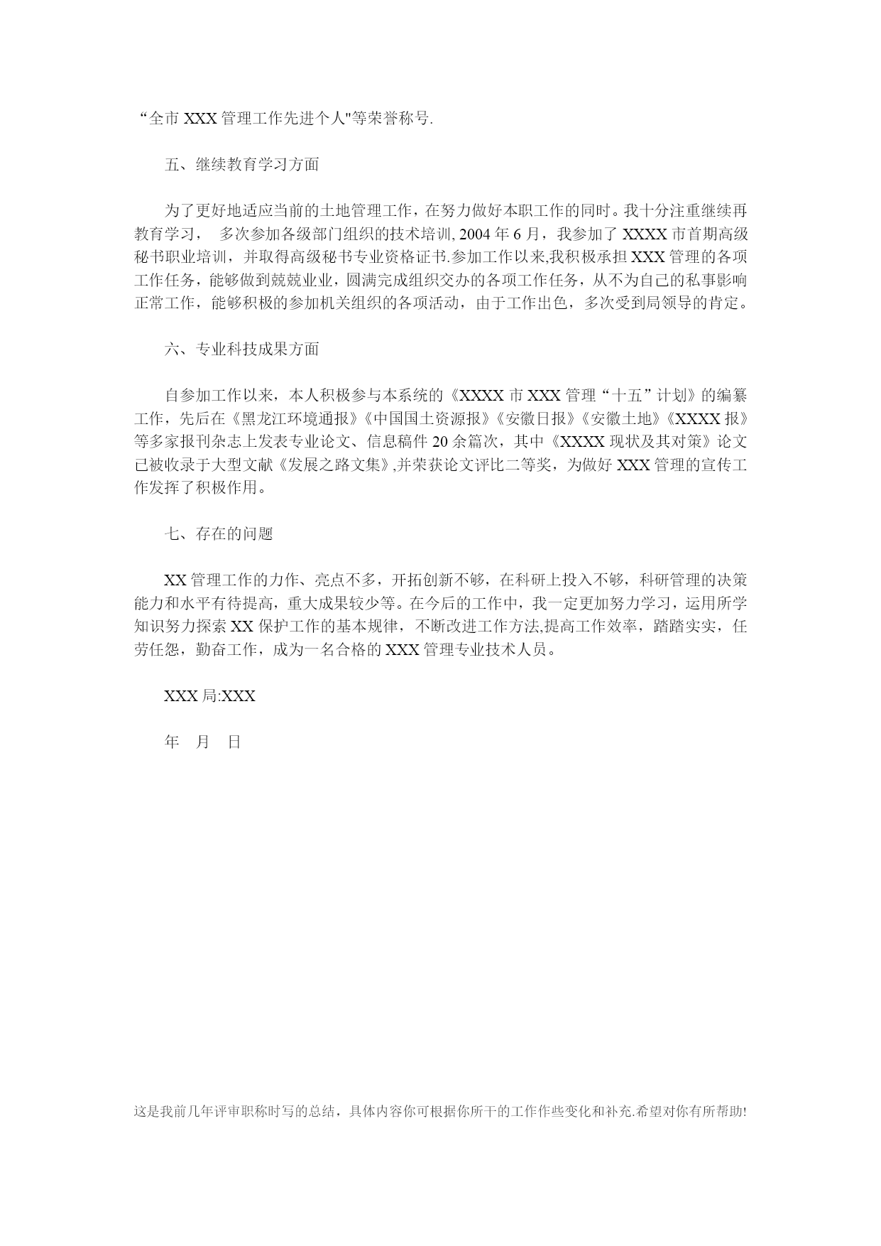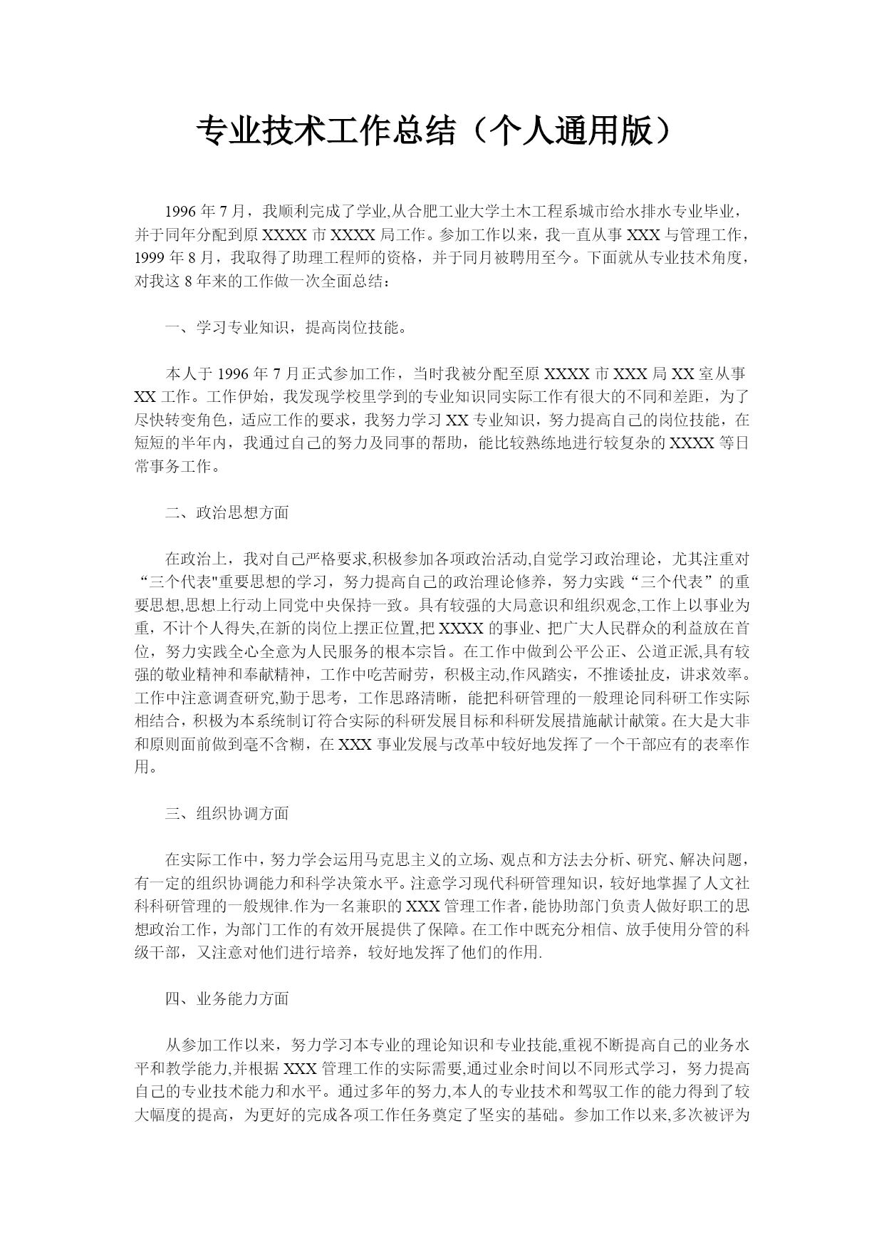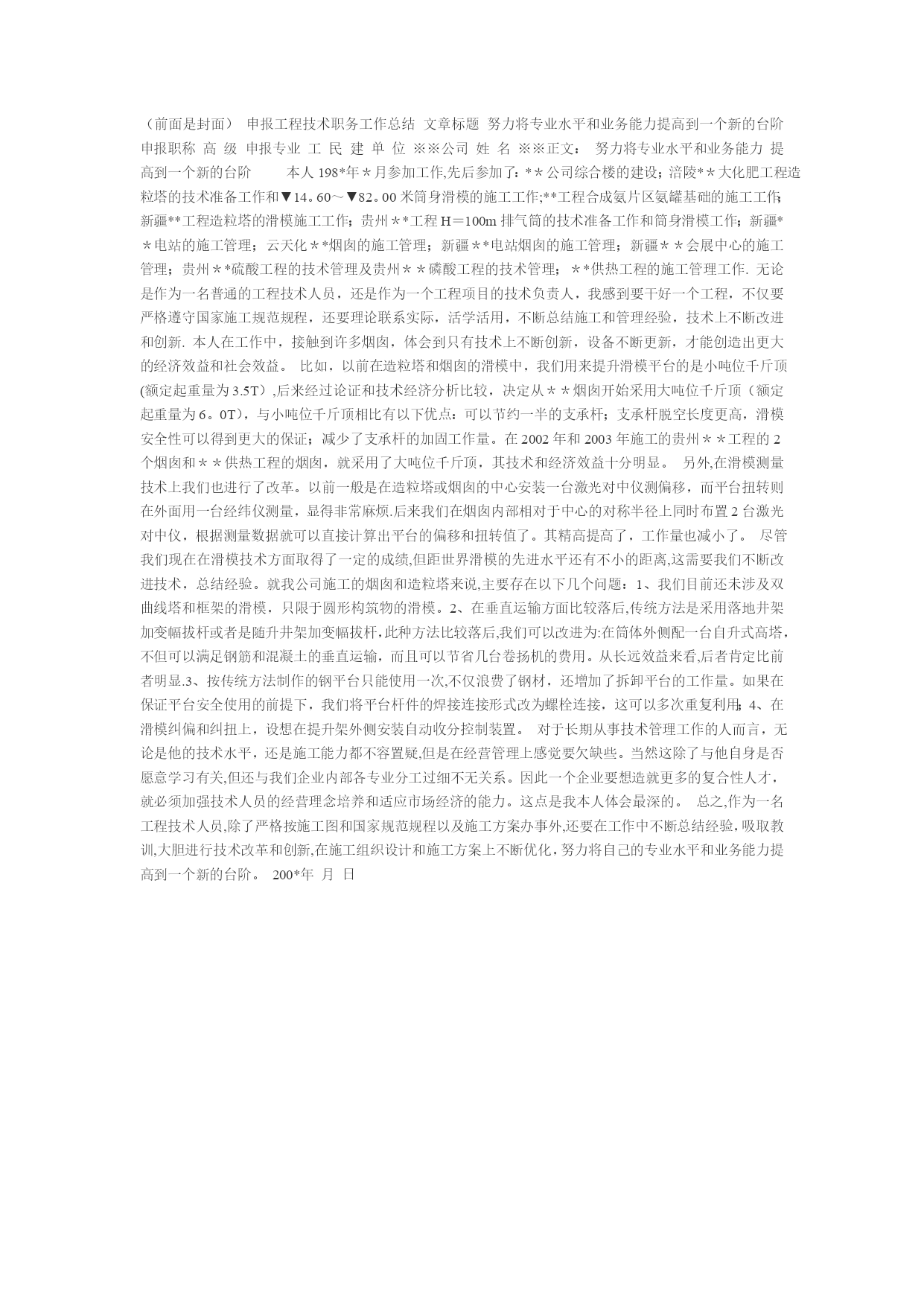 职称申报用专业技术工作总结模板(可以直接使用,可编辑优秀版资料,欢迎下载)专业技术工作总结(个人通用版)1996年7月,我顺利完成了学业,从合肥工业大学土木工程系城市给水排水专业毕业,并于同年分配到原XXXX市XXXX局工作。参加工作以来,我一直从事XXX与管理工作,1999年8月,我取得了助理工程师的资格,并于同月被聘用至今。下面就从专业技术角度,对我这8年来的工作做一次全面总结:一、学习专业知识,提高岗位技能。本人于1996年7月正式参加工作,当时我被分配至原XXXX市XXX局XX室从事XX工作。工作伊始,我发现学校里学到的专业知识同实际工作有很大的不同和差距,为了尽快转变角色,适应工作的要求,我努力学习XX专业知识,努力提高自己的岗位技能,在短短的半年内,我通过自己的努力及同事的帮助,能比较熟练地进行较复杂的XXXX等日常事务工作。二、政治思想方面在政治上,我对自己严格要求,积极参加各项政治活动,自觉学习政治理论,尤其注重对“三个代表"重要思想的学习,努力提高自己的政治理论修养,努力实践“三个代表”的重要思想,思想上行动上同党中央保持一致。具有较强的大局意识和组织观念,工作上以事业为重,不计个人得失,在新的岗位上摆正位置,把XXXX的事业、把广大人民群众的利益放在首位,努力实践全心全意为人民服务的根本宗旨。在工作中做到公平公正、公道正派,具有较强的敬业精神和奉献精神,工作中吃苦耐劳,积极主动,作风踏实,不推诿扯皮,讲求效率。工作中注意调查研究,勤于思考,工作思路清晰,能把科研管理的一般理论同科研工作实际相结合,积极为本系统制订符合实际的科研发展目标和科研发展措施献计献策。在大是大非和原则面前做到毫不含糊,在XXX事业发展与改革中较好地发挥了一个干部应有的表率作用。三、组织协调方面在实际工作中,努力学会运用马克思主义的立场、观点和方法去分析、研究、解决问题,有一定的组织协调能力和科学决策水平。注意学习现代科研管理知识,较好地掌握了人文社科科研管理的一般规律.作为一名兼职的XXX管理工作者,能协助部门负责人做好职工的思想政治工作,为部门工作的有效开展提供了保障。在工作中既充分相信、放手使用分管的科级干部,又注意对他们进行培养,较好地发挥了他们的作用.四、业务能力方面从参加工作以来,努力学习本专业的理论知识和专业技能,重视不断提高自己的业务水平和教学能力,并根据XXX管理工作的实际需要,通过业余时间以不同形式学习,努力提高自己的专业技术能力和水平。通过多年的努力,本人的专业技术和驾驭工作的能力得到了较大幅度的提高,为更好的完成各项工作任务奠定了坚实的基础。参加工作以来,多次被评为“全市XXX管理工作先进个人"等荣誉称号.五、继续教育学习方面为了更好地适应当前的土地管理工作,在努力做好本职工作的同时。我十分注重继续再教育学习,多次参加各级部门组织的技术培训,2004年6月,我参加了XXXX市首期高级秘书职业培训,并取得高级秘书专业资格证书.参加工作以来,我积极承担XXX管理的各项工作任务,能够做到兢兢业业,圆满完成组织交办的各项工作任务,从不为自己的私事影响正常工作,能够积极的参加机关组织的各项活动,由于工作出色,多次受到局领导的肯定。六、专业科技成果方面自参加工作以来,本人积极参与本系统的《XXXX市XXX管理“十五”计划》的编纂工作,先后在《黑龙江环境通报》《中国国土资源报》《安徽日报》《安徽土地》《XXXX报》等多家报刊杂志上发表专业论文、信息稿件20余篇次,其中《XXXX现状及其对策》论文已被收录于大型文献《发展之路文集》,并荣获论文评比二等奖,为做好XXX管理的宣传工作发挥了积极作用。七、存在的问题XX管理工作的力作、亮点不多,开拓创新不够,在科研上投入不够,科研管理的决策能力和水平有待提高,重大成果较少等。在今后的工作中,我一定更加努力学习,运用所学知识努力探索XX保护工作的基本规律,不断改进工作方法,提高工作效率,踏踏实实,任劳任怨,勤奋工作,成为一名合格的XXX管理专业技术人员。XXX局:XXX年月日这是我前几年评审职称时写的总结,具体内容你可根据你所干的工作作些变化和补充.希望对你有所帮助!(前面是封面)申报工程技术职务工作总结文章标题努力将专业水平和业务能力提高到一个新的台阶申报职称高级申报专业工民建单位※※公司姓名※※正文:努力将专业水平和业务能力提高到一个新的台阶本人198*年*月参加工作,先后参加了:**公司综合楼的建设;涪陵**大化肥工程造粒塔的技术准备工作和▼14。60~▼82。00米筒身滑模的施工工作;**工程合成氨片区氨罐基础的施工工作;新疆**工程造粒塔的滑模施工工作;贵州**工程H=10
