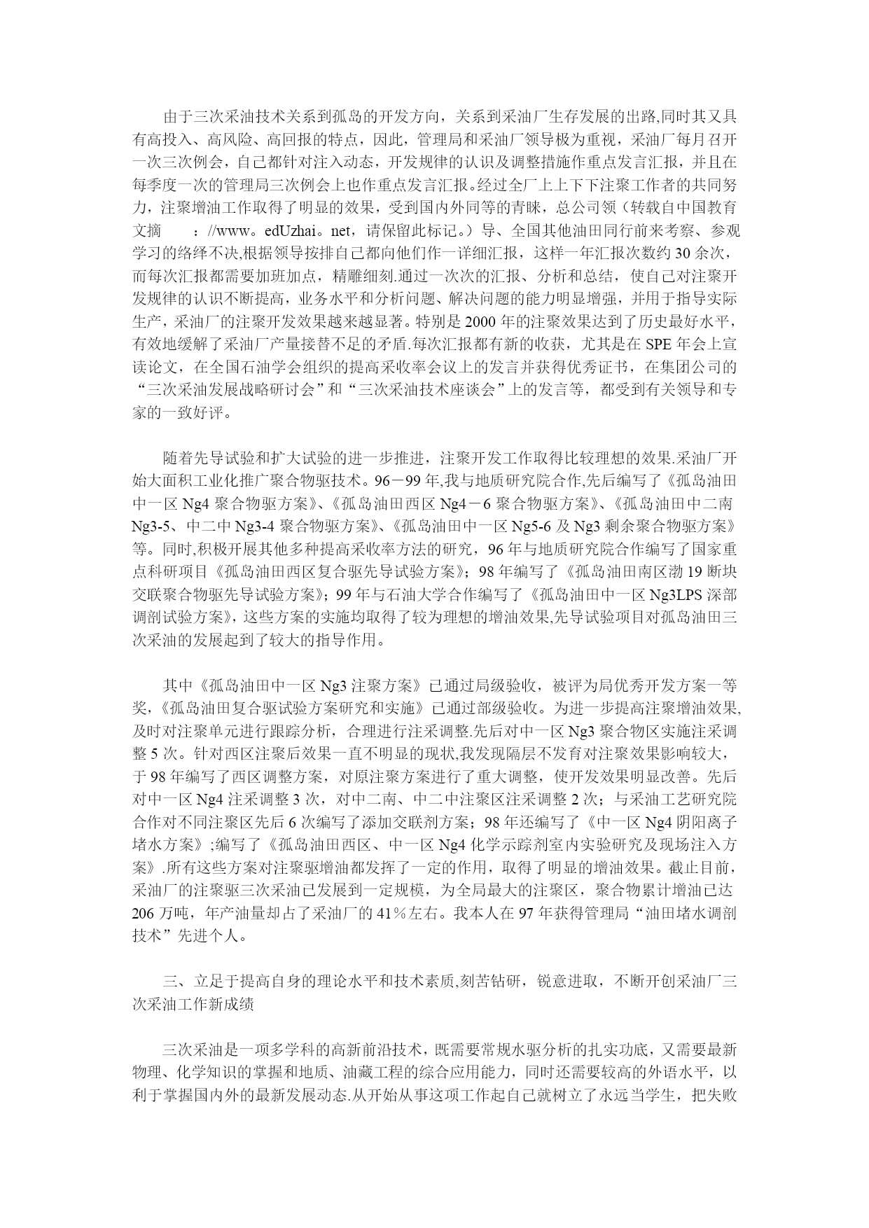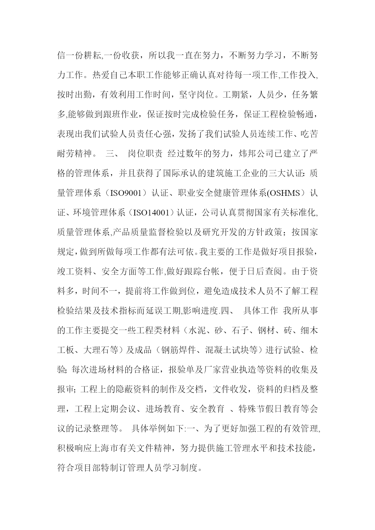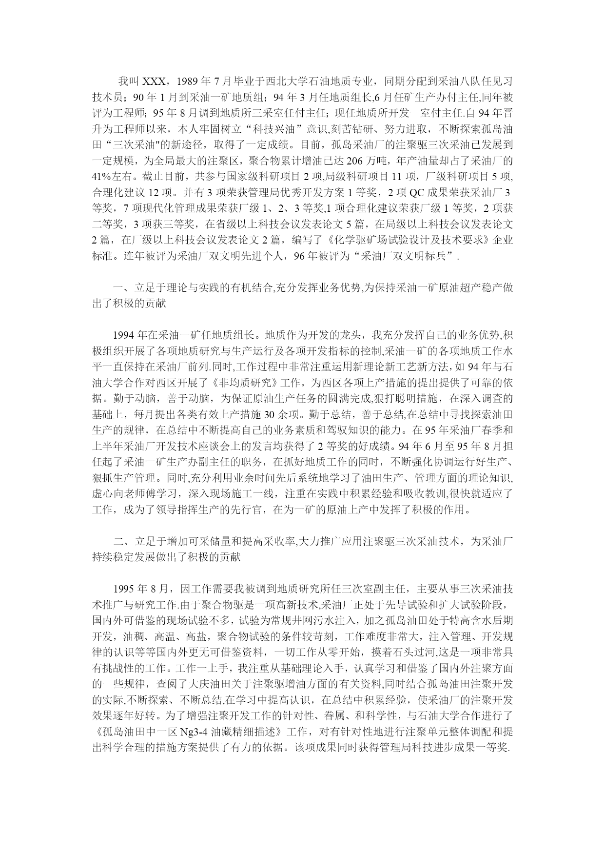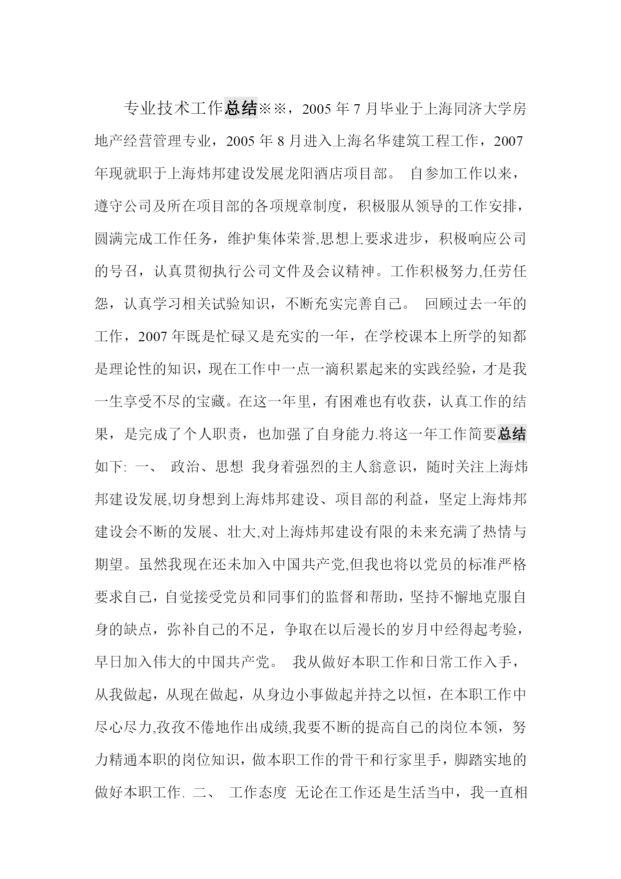 职称申报用专业技术工作总结模板(可以直接使用,可编辑优秀版资料,欢迎下载)专业技术工作总结(个人通用版)1996年7月,我顺利完成了学业,从合肥工业大学土木工程系城市给水排水专业毕业,并于同年分配到原XXXX市XXXX局工作。参加工作以来,我一直从事XXX与管理工作,1999年8月,我取得了助理工程师的资格,并于同月被聘用至今。下面就从专业技术角度,对我这8年来的工作做一次全面总结:一、学习专业知识,提高岗位技能。本人于1996年7月正式参加工作,当时我被分配至原XXXX市XXX局XX室从事XX工作。工作伊始,我发现学校里学到的专业知识同实际工作有很大的不同和差距,为了尽快转变角色,适应工作的要求,我努力学习XX专业知识,努力提高自己的岗位技能,在短短的半年内,我通过自己的努力及同事的帮助,能比较熟练地进行较复杂的XXXX等日常事务工作。二、政治思想方面在政治上,我对自己严格要求,积极参加各项政治活动,自觉学习政治理论,尤其注重对“三个代表"重要思想的学习,努力提高自己的政治理论修养,努力实践“三个代表”的重要思想,思想上行动上同党中央保持一致。具有较强的大局意识和组织观念,工作上以事业为重,不计个人得失,在新的岗位上摆正位置,把XXXX的事业、把广大人民群众的利益放在首位,努力实践全心全意为人民服务的根本宗旨。在工作中做到公平公正、公道正派,具有较强的敬业精神和奉献精神,工作中吃苦耐劳,积极主动,作风踏实,不推诿扯皮,讲求效率。工作中注意调查研究,勤于思考,工作思路清晰,能把科研管理的一般理论同科研工作实际相结合,积极为本系统制订符合实际的科研发展目标和科研发展措施献计献策。在大是大非和原则面前做到毫不含糊,在XXX事业发展与改革中较好地发挥了一个干部应有的表率作用。三、组织协调方面在实际工作中,努力学会运用马克思主义的立场、观点和方法去分析、研究、解决问题,有一定的组织协调能力和科学决策水平。注意学习现代科研管理知识,较好地掌握了人文社科科研管理的一般规律.作为一名兼职的XXX管理工作者,能协助部门负责人做好职工的思想政治工作,为部门工作的有效开展提供了保障。在工作中既充分相信、放手使用分管的科级干部,又注意对他们进行培养,较好地发挥了他们的作用.四、业务能力方面从参加工作以来,努力学习本专业的理论知识和专业技能,重视不断提高自己的业务水平和教学能力,并根据XXX管理工作的实际需要,通过业余时间以不同形式学习,努力提高自己的专业技术能力和水平。通过多年的努力,本人的专业技术和驾驭工作的能力得到了较大幅度的提高,为更好的完成各项工作任务奠定了坚实的基础。参加工作以来,多次被评为“全市XXX管理工作先进个人"等荣誉称号.五、继续教育学习方面为了更好地适应当前的土地管理工作,在努力做好本职工作的同时。我十分注重继续再教育学习,多次参加各级部门组织的技术培训,2004年6月,我参加了XXXX市首期高级秘书职业培训,并取得高级秘书专业资格证书.参加工作以来,我积极承担XXX管理的各项工作任务,能够做到兢兢业业,圆满完成组织交办的各项工作任务,从不为自己的私事影响正常工作,能够积极的参加机关组织的各项活动,由于工作出色,多次受到局领导的肯定。六、专业科技成果方面自参加工作以来,本人积极参与本系统的《XXXX市XXX管理“十五”计划》的编纂工作,先后在《黑龙江环境通报》《中国国土资源报》《安徽日报》《安徽土地》《XXXX报》等多家报刊杂志上发表专业论文、信息稿件20余篇次,其中《XXXX现状及其对策》论文已被收录于大型文献《发展之路文集》,并荣获论文评比二等奖,为做好XXX管理的宣传工作发挥了积极作用。七、存在的问题XX管理工作的力作、亮点不多,开拓创新不够,在科研上投入不够,科研管理的决策能力和水平有待提高,重大成果较少等。在今后的工作中,我一定更加努力学习,运用所学知识努力探索XX保护工作的基本规律,不断改进工作方法,提高工作效率,踏踏实实,任劳任怨,勤奋工作,成为一名合格的XXX管理专业技术人员。XXX局:XXX年月日这是我前几年评审职称时写的总结,具体内容你可根据你所干的工作作些变化和补充.希望对你有所帮助!(前面是封面)申报工程技术职务工作总结文章标题努力将专业水平和业务能力提高到一个新的台阶申报职称高级申报专业工民建单位※※公司姓名※※正文:努力将专业水平和业务能力提高到一个新的台阶本人198*年*月参加工作,先后参加了:**公司综合楼的建设;涪陵**大化肥工程造粒塔的技术准备工作和▼14。60~▼82。00米筒身滑模的施工工作;**工程合成氨片区氨罐基础的施工工作;新疆**工程造粒塔的滑模施工工作;贵州**工程H=10