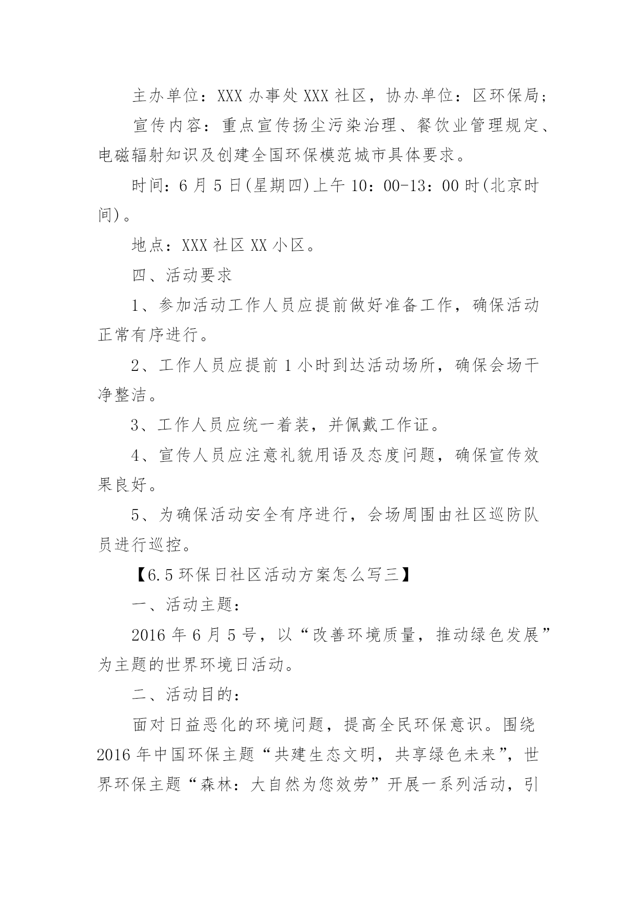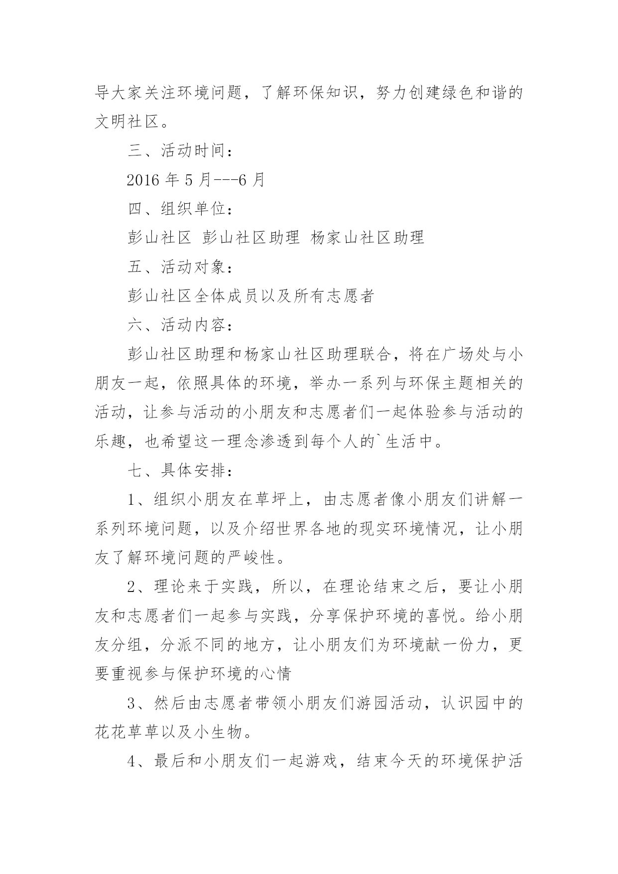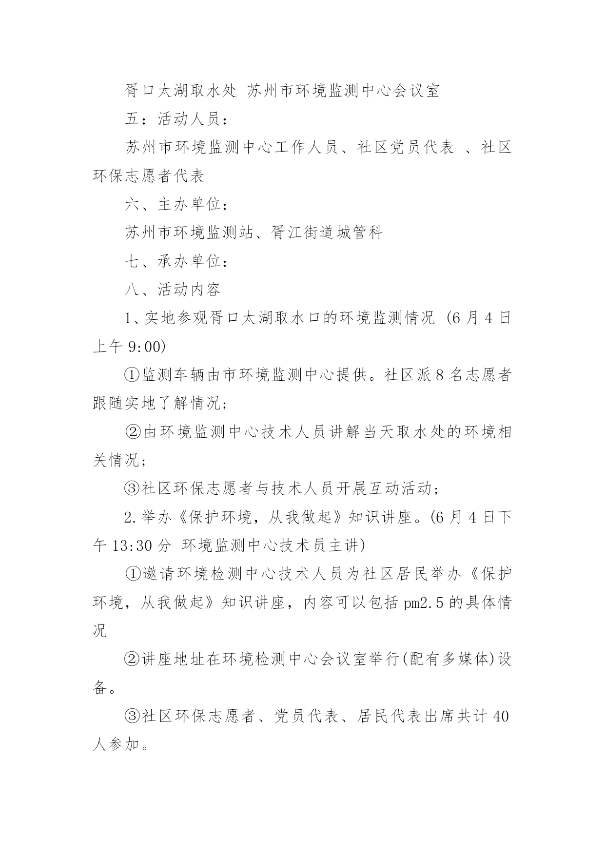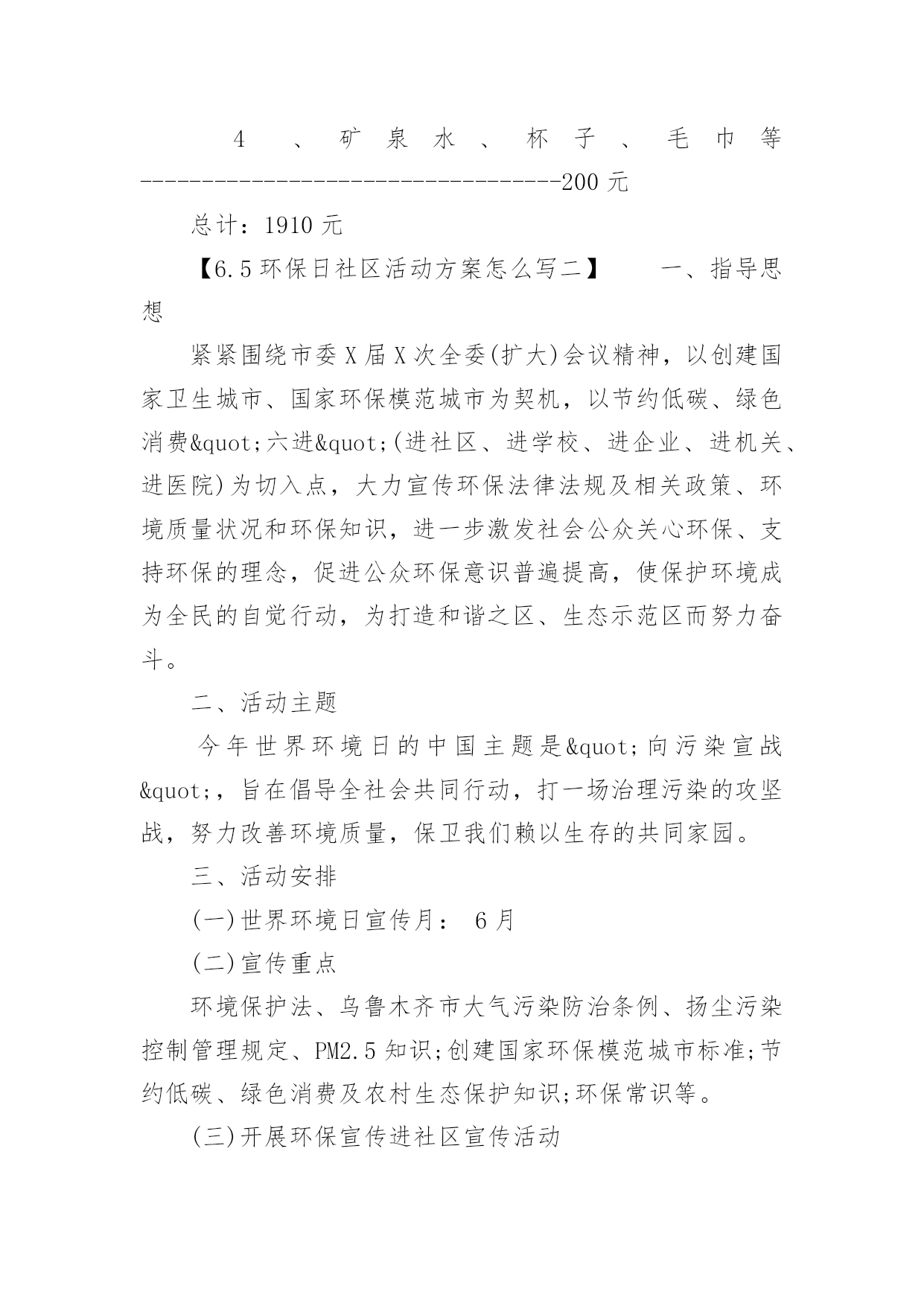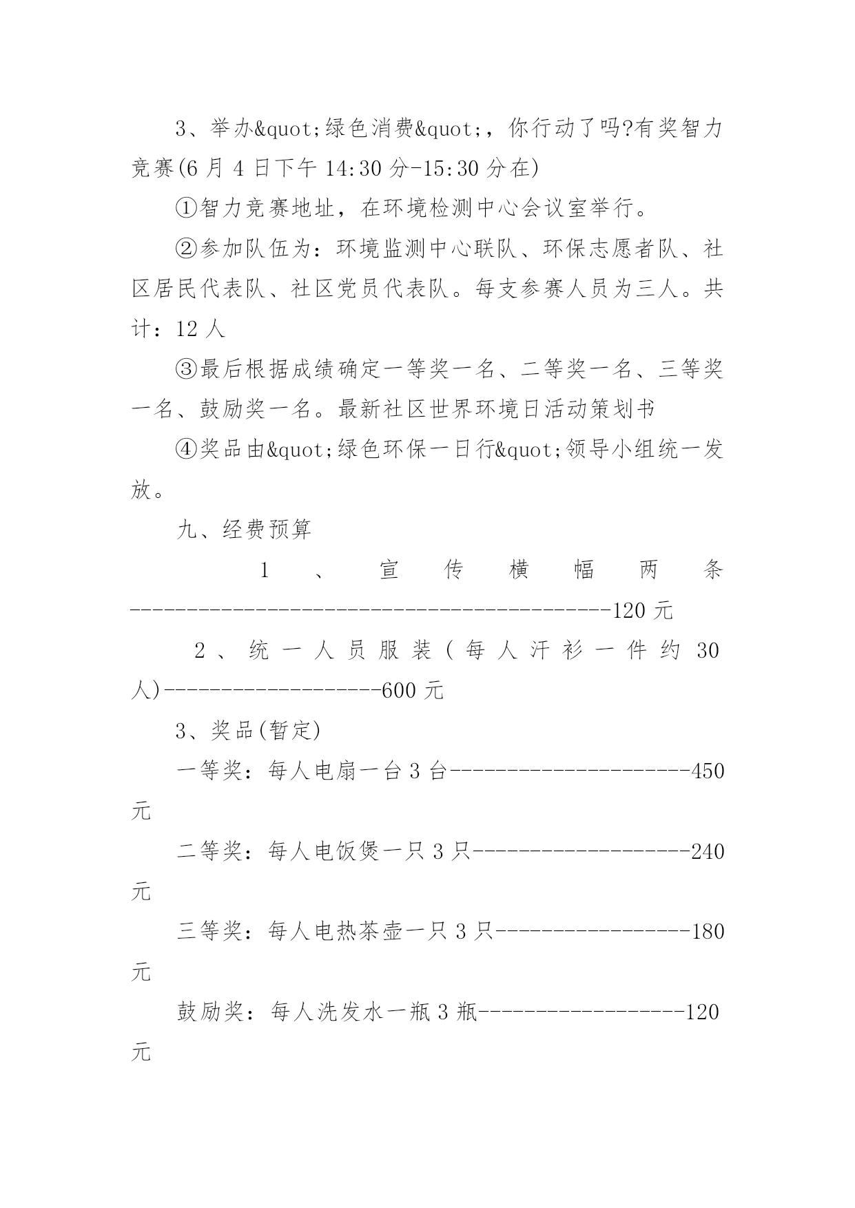 环保日社区活动方案环保日社区活动方案模板【6.5环保日社区活动方案怎么写一】为进一步在社区居民中加强绿色消费宣传、普及环保知识、树立环保意识,促进更多的人积极参与到绿色生态环保活动中来。社区拟开展世界环境日系列活动。并通过一系列活动来鼓励居民绿色消费从自身做起,从身边小事做起,使社区居民树立"绿色消费"的良好习惯,达到强化环保意识。一、指导思想:今年世界环境日中国主题为"绿色消费你行动了吗?"这一主题旨在强调绿色消费理念,唤起社会公众转变消费观念和行为,节约资源能源,保护生态环境,来提高公众的环保意识、文明意识,在全社会共建生态文明共享绿色未来,促进绿色环保知识。二、组织领导:组长:苏州市环境监测站张东宝书记、副组长:胥江街道城管科徐德亮科长、三香社区刘家亮书记成员:姚剑明、孙永芳、朱斌、鲍莉萍、瞿锞下设办公室:姚剑明兼任办公室主任。负责组织制定活动方案,安排部署各项主题活动,检查督促各项措施。三、时间安排:2012年6月4日(上午:9:30分开始)四、活动地址:胥口太湖取水处苏州市环境监测中心会议室五:活动人员:苏州市环境监测中心工作人员、社区党员代表、社区环保志愿者代表六、主办单位:苏州市环境监测站、胥江街道城管科七、承办单位:八、活动内容1、实地参观胥口太湖取水口的环境监测情况(6月4日上午9:00)①监测车辆由市环境监测中心提供。社区派8名志愿者跟随实地了解情况;②由环境监测中心技术人员讲解当天取水处的环境相关情况;③社区环保志愿者与技术人员开展互动活动;2.举办《保护环境,从我做起》知识讲座。(6月4日下午13:30分环境监测中心技术员主讲)①邀请环境检测中心技术人员为社区居民举办《保护环境,从我做起》知识讲座,内容可以包括pm2.5的具体情况②讲座地址在环境检测中心会议室举行(配有多媒体)设备。③社区环保志愿者、党员代表、居民代表出席共计40人参加。3、举办"绿色消费",你行动了吗?有奖智力竞赛(6月4日下午14:30分-15:30分在)①智力竞赛地址,在环境检测中心会议室举行。②参加队伍为:环境监测中心联队、环保志愿者队、社区居民代表队、社区党员代表队。每支参赛人员为三人。共计:12人③最后根据成绩确定一等奖一名、二等奖一名、三等奖一名、鼓励奖一名。最新社区世界环境日活动策划书④奖品由"绿色环保一日行"领导小组统一发放。九、经费预算1、宣传横幅两条------------------------------------------120元2、统一人员服装(每人汗衫一件约30人)-------------------600元3、奖品(暂定)一等奖:每人电扇一台3台---------------------450元二等奖:每人电饭煲一只3只-------------------240元三等奖:每人电热茶壶一只3只-----------------180元鼓励奖:每人洗发水一瓶3瓶------------------120元4、矿泉水、杯子、毛巾等----------------------------------200元总计:1910元【6.5环保日社区活动方案怎么写二】一、指导思想紧紧围绕市委X届X次全委(扩大)会议精神,以创建国家卫生城市、国家环保模范城市为契机,以节约低碳、绿色消费"六进"(进社区、进学校、进企业、进机关、进医院)为切入点,大力宣传环保法律法规及相关政策、环境质量状况和环保知识,进一步激发社会公众关心环保、支持环保的理念,促进公众环保意识普遍提高,使保护环境成为全民的自觉行动,为打造和谐之区、生态示范区而努力奋斗。二、活动主题今年世界环境日的中国主题是"向污染宣战",旨在倡导全社会共同行动,打一场治理污染的攻坚战,努力改善环境质量,保卫我们赖以生存的共同家园。三、活动安排(一)世界环境日宣传月:6月(二)宣传重点环境保护法、乌鲁木齐市大气污染防治条例、扬尘污染控制管理规定、PM2.5知识;创建国家环保模范城市标准;节约低碳、绿色消费及农村生态保护知识;环保常识等。(三)开展环保宣传进社区宣传活动主办单位:XXX办事处XXX社区,协办单位:区环保局;宣传内容:重点宣传扬尘污染治理、餐饮业管理规定、电磁辐射知识及创建全国环保模范城市具体要求。时间:6月5日(星期四)上午10:00-13:00时(北京时间)。地点:XXX社区XX小区。四、活动要求1、参加活动工作人员应提前做好准备工作,确保活动正常有序进行。2、工作人员应提前1小时到达活动场所,确保会场干净整洁。3、工作人员应统一着装,并佩戴工作证。4、宣传人员应注意礼貌用语及态度问题,确保宣传效果良好。5、为确保活动安全有序进行