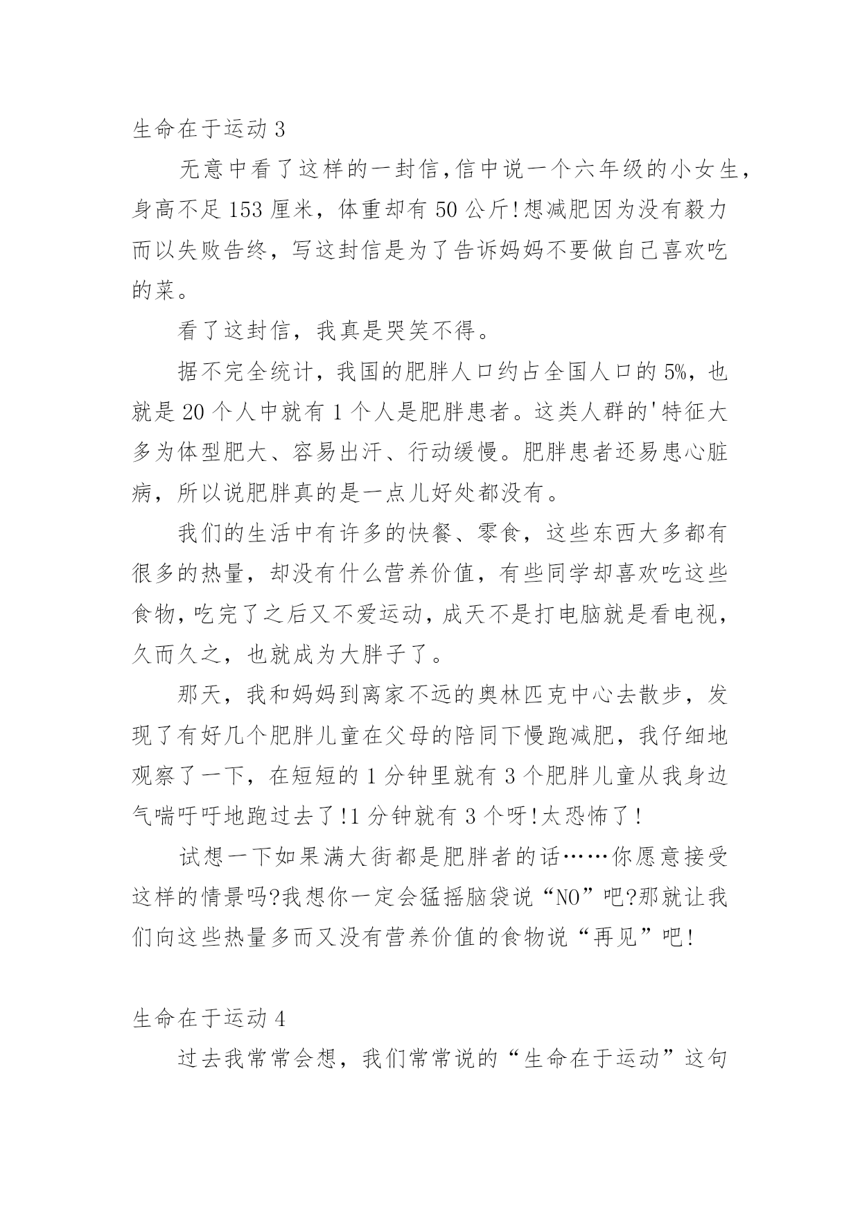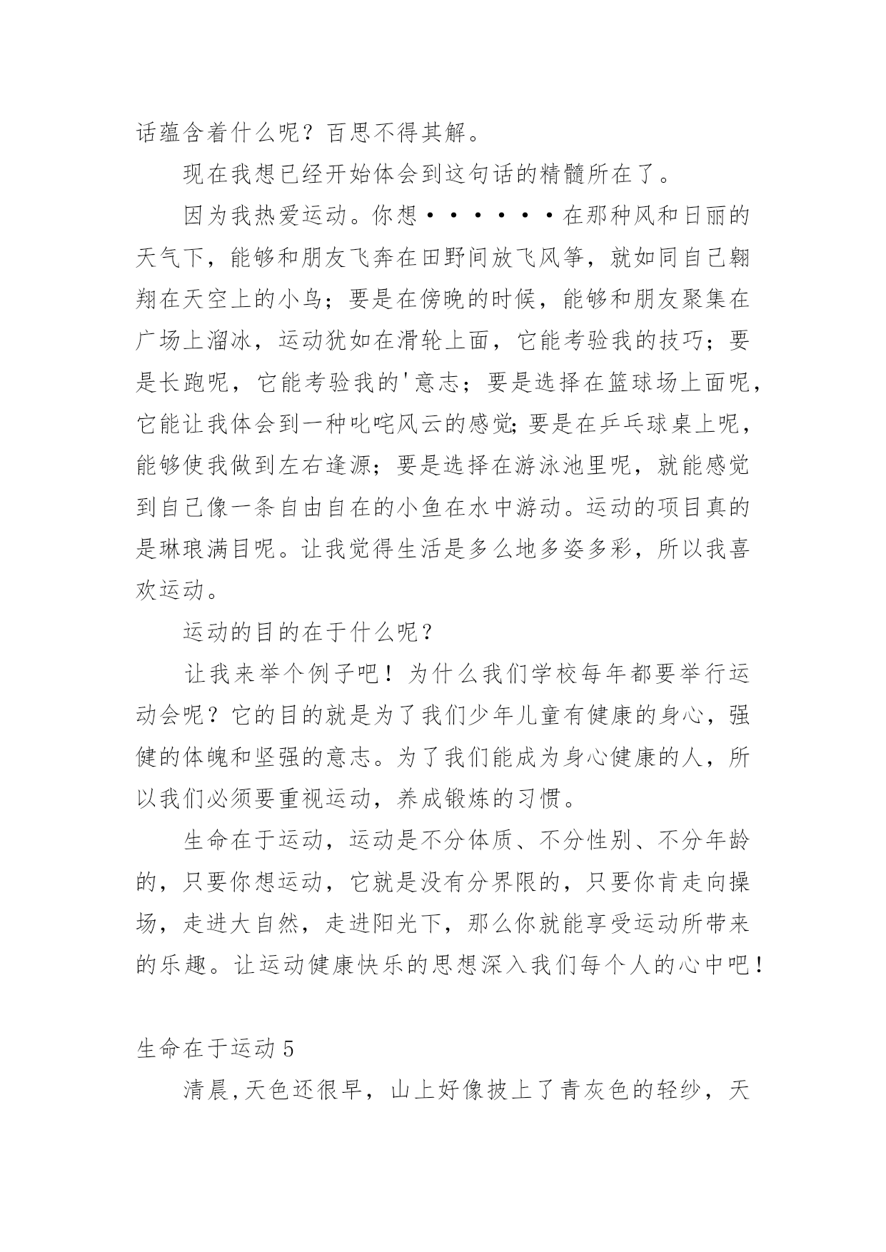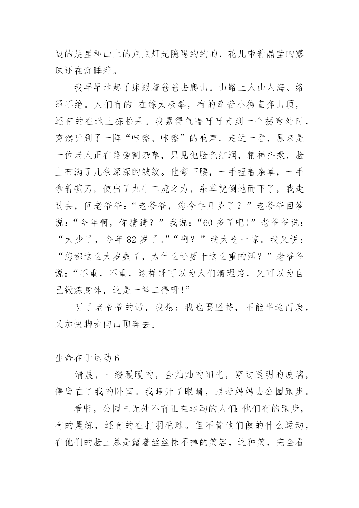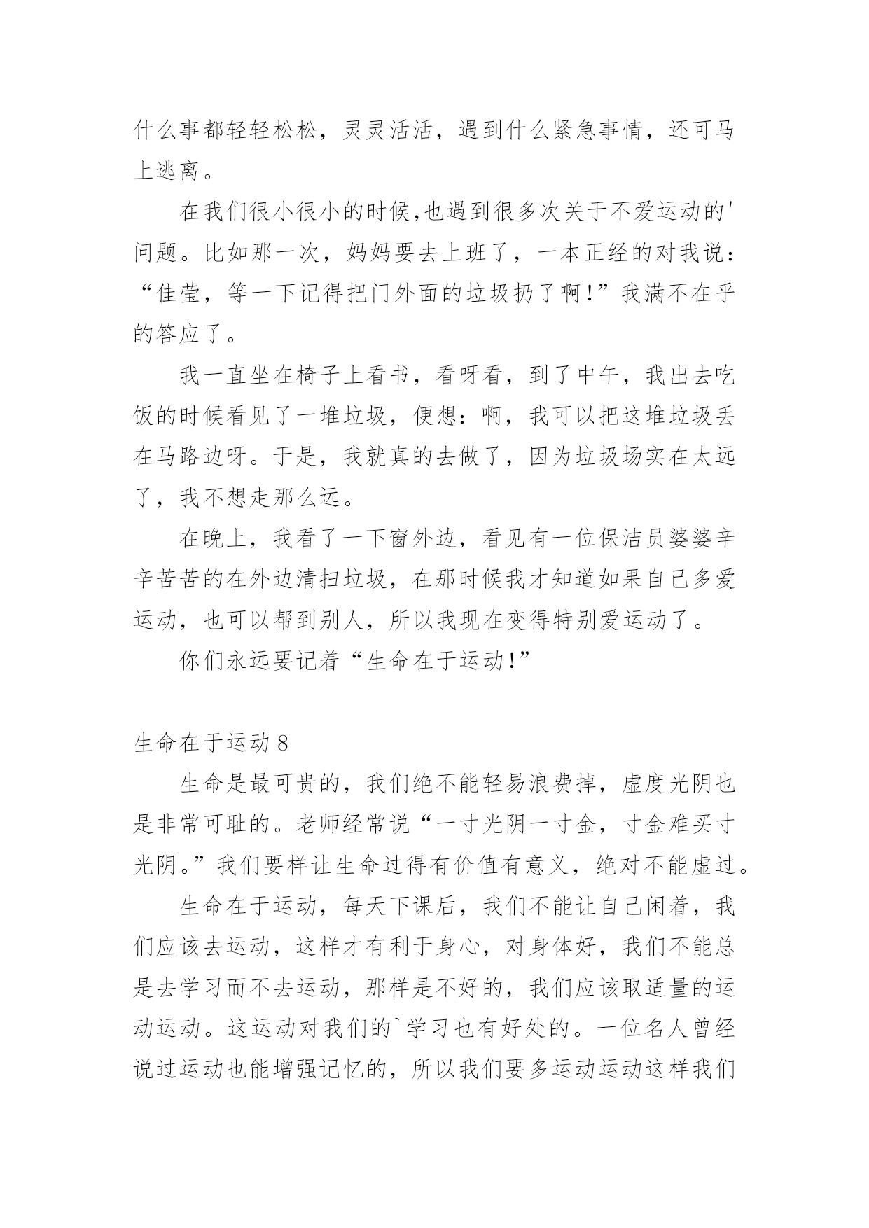 生命在于运动生命在于运动1两年前,我一点都不喜欢运动,吃完饭就躺在沙发上或床上,懒得动,就这样一天天胖起来,爸爸妈妈一直劝我出去多运动,可我就是左耳朵进右耳朵出,从来不放在心上。直到有一天我看到一则新闻,不管老人还是小孩,如果过度肥胖,不坚持运动,会引起很多种疾病,影响脑力,有的甚至会死亡……我立马来了精神,下决心要运动起来,不能再懒下去了,我要去学打篮球,为了自己的健康,我要动起来。爸爸给我报了篮球班,记得刚去的时候,我连球都拿不稳,球拍几下就丢了,没跑几圈就跑不动了,教练看看我又看看别人,对我说:“刘骐铭,你手好像有点小哟,打篮球的都是很大的手呀,你看邱子寒的手跟我差不多大啦!”听完,我心里就不舒服了,手大有什么了不起的,先天的我们无法控制,我们是需要后天的'努力,我只要勤加练习,肯定也能打得好,从那以后,篮球场上就天天能看到我的影子了,不管天气多么炎热,都不会减退我对篮球的热情。运动给人们带来的好处太多了,没有健康和快乐,一切都白搭,而运动就是创造健康的最好方法。生命在于运动,我健康,我快乐!生命在于运动2天刚破晓,淡蓝色的天空中还镶有几颗暗淡的残星。残月像一块失去了光泽的鹅卵石,抛在天边。不一会儿,明丽的太阳光,照着盛开的攀枝花树,乳白的'晨雾,像轻纱似的,慢慢被揭开了,火红的攀枝花,仿佛一片殷红的朝霞浮荡在三山谷里。我便来到龙山脚下爬山,山上的树木郁郁葱葱,投下一片绿茵,几只起的早的小鸟“叽叽”叫着,好像在欢迎我到来。花儿争奇斗艳,使劲一闻,一股清香扑来,沁人心脾!我边走边看,走到半山腰时,已是气喘吁吁,骨头像被泡麻了,软了下去,两脚就想挂了沙袋一般,再也不能往前走一步。我正要放弃,忽然传来“哎哟哎呦”的喊声,一个白发苍苍、精神矍铄的老人映入我的眼帘。只见他满头白发随着风飘荡。虽年事已高,但仍面色红润,他拿着一把刀,抓住野草,麻利地一割,就只剩下一些美丽的花草了。被他修过的地总是平整地如同有一台割草机操纵。我过去问道“老爷爷,您今年几岁了?”老爷爷的回答让我大吃一惊,“82岁了”。我不解“您这么老了,还出来割草啊!万一......。”老爷爷语重心长地对我说“我到这儿来有两个好处:既可以健身,又能有利于大家,孩子,运动可以使人改掉一些坏毛病,所以要多运动。”说完便走了。我顿时感到有使不完的力气,马上便来到了山顶。这件事让我明白,生命在于运动,只有多运动才能使人健康,大家一定要多运动呀!生命在于运动3无意中看了这样的一封信,信中说一个六年级的小女生,身高不足153厘米,体重却有50公斤!想减肥因为没有毅力而以失败告终,写这封信是为了告诉妈妈不要做自己喜欢吃的菜。看了这封信,我真是哭笑不得。据不完全统计,我国的肥胖人口约占全国人口的5%,也就是20个人中就有1个人是肥胖患者。这类人群的'特征大多为体型肥大、容易出汗、行动缓慢。肥胖患者还易患心脏病,所以说肥胖真的是一点儿好处都没有。我们的生活中有许多的快餐、零食,这些东西大多都有很多的热量,却没有什么营养价值,有些同学却喜欢吃这些食物,吃完了之后又不爱运动,成天不是打电脑就是看电视,久而久之,也就成为大胖子了。那天,我和妈妈到离家不远的奥林匹克中心去散步,发现了有好几个肥胖儿童在父母的陪同下慢跑减肥,我仔细地观察了一下,在短短的1分钟里就有3个肥胖儿童从我身边气喘吁吁地跑过去了!1分钟就有3个呀!太恐怖了!试想一下如果满大街都是肥胖者的话……你愿意接受这样的情景吗?我想你一定会猛摇脑袋说“NO”吧?那就让我们向这些热量多而又没有营养价值的食物说“再见”吧!生命在于运动4过去我常常会想,我们常常说的“生命在于运动”这句话蕴含着什么呢?百思不得其解。现在我想已经开始体会到这句话的精髓所在了。因为我热爱运动。你想······在那种风和日丽的天气下,能够和朋友飞奔在田野间放飞风筝,就如同自己翱翔在天空上的小鸟;要是在傍晚的时候,能够和朋友聚集在广场上溜冰,运动犹如在滑轮上面,它能考验我的技巧;要是长跑呢,它能考验我的'意志;要是选择在篮球场上面呢,它能让我体会到一种叱咤风云的感觉;要是在乒乓球桌上呢,能够使我做到左右逢源;要是选择在游泳池里呢,就能感觉到自己像一条自由自在的小鱼在水中游动。运动的项目真的是琳琅满目呢。让我觉得生活是多么地多姿多彩,所以我喜欢运动。运动的目的在于什么呢?让我来举个例子吧!为什么我们学校每年都要举行运动会呢?它的目的就是为了我们少年儿童有健康的身心,强健的体魄和坚强的意志。为了我们能成为身心健康的人,所以我们必须要重视运动,养成锻炼的习惯。生命在于运动,运动是不分体质、不分性别、不分年龄的,只要你想运动,它就是没有分界限的,只要你肯走向操场,走进大自然,走进阳光下,那么你就能享受运动所带来的乐趣。让运动健康快乐的思想深入我们每个人的心中吧!生命在于运
