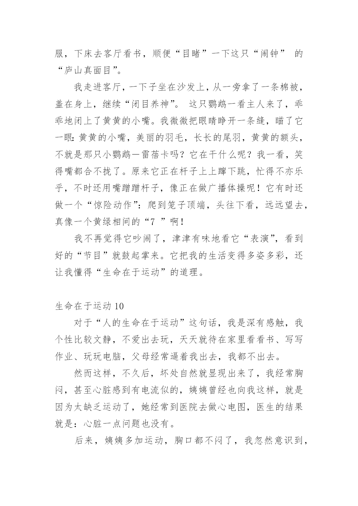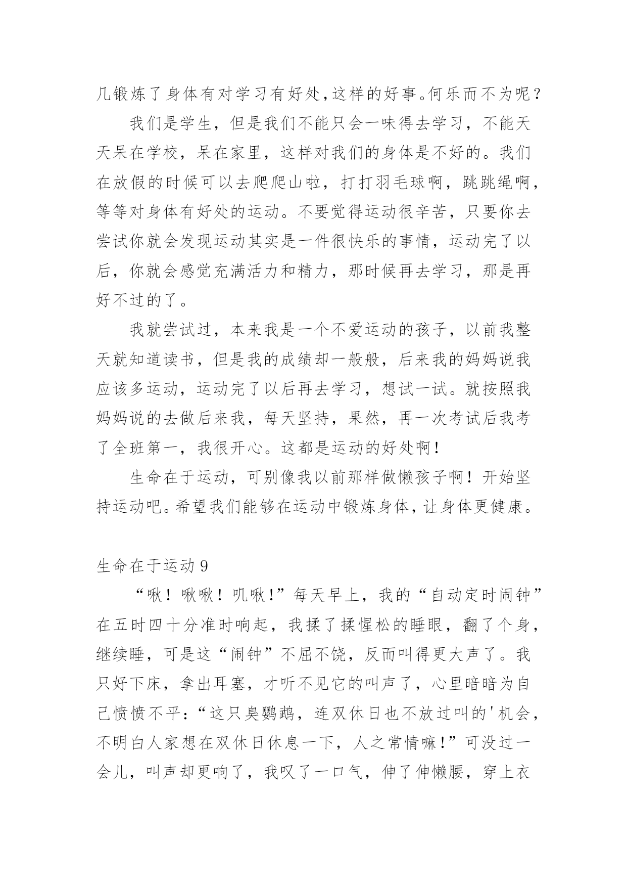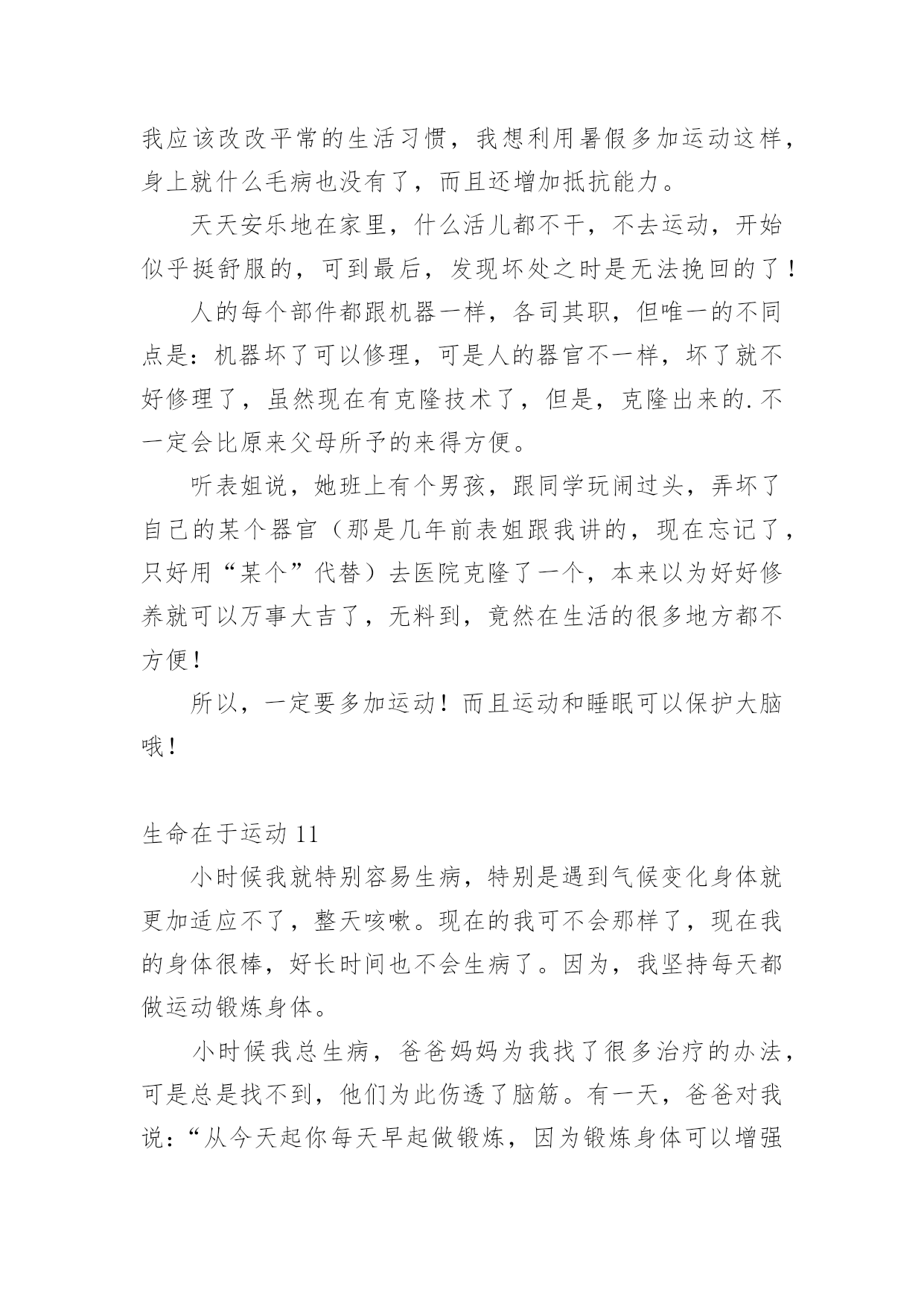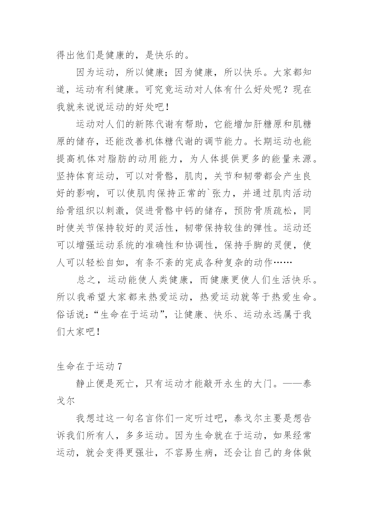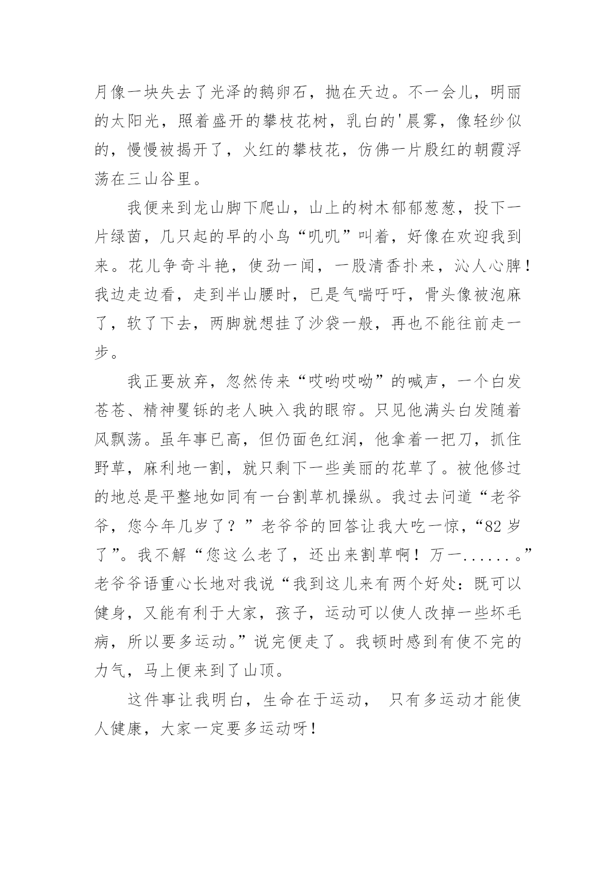 生命在于运动生命在于运动1两年前,我一点都不喜欢运动,吃完饭就躺在沙发上或床上,懒得动,就这样一天天胖起来,爸爸妈妈一直劝我出去多运动,可我就是左耳朵进右耳朵出,从来不放在心上。直到有一天我看到一则新闻,不管老人还是小孩,如果过度肥胖,不坚持运动,会引起很多种疾病,影响脑力,有的甚至会死亡……我立马来了精神,下决心要运动起来,不能再懒下去了,我要去学打篮球,为了自己的健康,我要动起来。爸爸给我报了篮球班,记得刚去的时候,我连球都拿不稳,球拍几下就丢了,没跑几圈就跑不动了,教练看看我又看看别人,对我说:“刘骐铭,你手好像有点小哟,打篮球的都是很大的手呀,你看邱子寒的手跟我差不多大啦!”听完,我心里就不舒服了,手大有什么了不起的,先天的我们无法控制,我们是需要后天的'努力,我只要勤加练习,肯定也能打得好,从那以后,篮球场上就天天能看到我的影子了,不管天气多么炎热,都不会减退我对篮球的热情。运动给人们带来的好处太多了,没有健康和快乐,一切都白搭,而运动就是创造健康的最好方法。生命在于运动,我健康,我快乐!生命在于运动2天刚破晓,淡蓝色的天空中还镶有几颗暗淡的残星。残月像一块失去了光泽的鹅卵石,抛在天边。不一会儿,明丽的太阳光,照着盛开的攀枝花树,乳白的'晨雾,像轻纱似的,慢慢被揭开了,火红的攀枝花,仿佛一片殷红的朝霞浮荡在三山谷里。我便来到龙山脚下爬山,山上的树木郁郁葱葱,投下一片绿茵,几只起的早的小鸟“叽叽”叫着,好像在欢迎我到来。花儿争奇斗艳,使劲一闻,一股清香扑来,沁人心脾!我边走边看,走到半山腰时,已是气喘吁吁,骨头像被泡麻了,软了下去,两脚就想挂了沙袋一般,再也不能往前走一步。我正要放弃,忽然传来“哎哟哎呦”的喊声,一个白发苍苍、精神矍铄的老人映入我的眼帘。只见他满头白发随着风飘荡。虽年事已高,但仍面色红润,他拿着一把刀,抓住野草,麻利地一割,就只剩下一些美丽的花草了。被他修过的地总是平整地如同有一台割草机操纵。我过去问道“老爷爷,您今年几岁了?”老爷爷的回答让我大吃一惊,“82岁了”。我不解“您这么老了,还出来割草啊!万一......。”老爷爷语重心长地对我说“我到这儿来有两个好处:既可以健身,又能有利于大家,孩子,运动可以使人改掉一些坏毛病,所以要多运动。”说完便走了。我顿时感到有使不完的力气,马上便来到了山顶。这件事让我明白,生命在于运动,只有多运动才能使人健康,大家一定要多运动呀!生命在于运动3无意中看了这样的一封信,信中说一个六年级的小女生,身高不足153厘米,体重却有50公斤!想减肥因为没有毅力而以失败告终,写这封信是为了告诉妈妈不要做自己喜欢吃的菜。看了这封信,我真是哭笑不得。据不完全统计,我国的肥胖人口约占全国人口的5%,也就是20个人中就有1个人是肥胖患者。这类人群的'特征大多为体型肥大、容易出汗、行动缓慢。肥胖患者还易患心脏病,所以说肥胖真的是一点儿好处都没有。我们的生活中有许多的快餐、零食,这些东西大多都有很多的热量,却没有什么营养价值,有些同学却喜欢吃这些食物,吃完了之后又不爱运动,成天不是打电脑就是看电视,久而久之,也就成为大胖子了。那天,我和妈妈到离家不远的奥林匹克中心去散步,发现了有好几个肥胖儿童在父母的陪同下慢跑减肥,我仔细地观察了一下,在短短的1分钟里就有3个肥胖儿童从我身边气喘吁吁地跑过去了!1分钟就有3个呀!太恐怖了!试想一下如果满大街都是肥胖者的话……你愿意接受这样的情景吗?我想你一定会猛摇脑袋说“NO”吧?那就让我们向这些热量多而又没有营养价值的食物说“再见”吧!生命在于运动4过去我常常会想,我们常常说的“生命在于运动”这句话蕴含着什么呢?百思不得其解。现在我想已经开始体会到这句话的精髓所在了。因为我热爱运动。你想······在那种风和日丽的天气下,能够和朋友飞奔在田野间放飞风筝,就如同自己翱翔在天空上的小鸟;要是在傍晚的时候,能够和朋友聚集在广场上溜冰,运动犹如在滑轮上面,它能考验我的技巧;要是长跑呢,它能考验我的'意志;要是选择在篮球场上面呢,它能让我体会到一种叱咤风云的感觉;要是在乒乓球桌上呢,能够使我做到左右逢源;要是选择在游泳池里呢,就能感觉到自己像一条自由自在的小鱼在水中游动。运动的项目真的是琳琅满目呢。让我觉得生活是多么地多姿多彩,所以我喜欢运动。运动的目的在于什么呢?让我来举个例子吧!为什么我们学校每年都要举行运动会呢?它的目的就是为了我们少年儿童有健康的身心,强健的体魄和坚强的意志。为了我们能成为身心健康的人,所以我们必须要重视运动,养成锻炼的习惯。生命在于运动,运动是不分体质、不分性别、不分年龄的,只要你想运动,它就是没有分界限的,只要你肯走向操场,走进大自然,走进阳光下,那么你就能享受运动所带来的乐趣。让运动健康快乐的思想深入我们每个人的心中吧!生命在于运