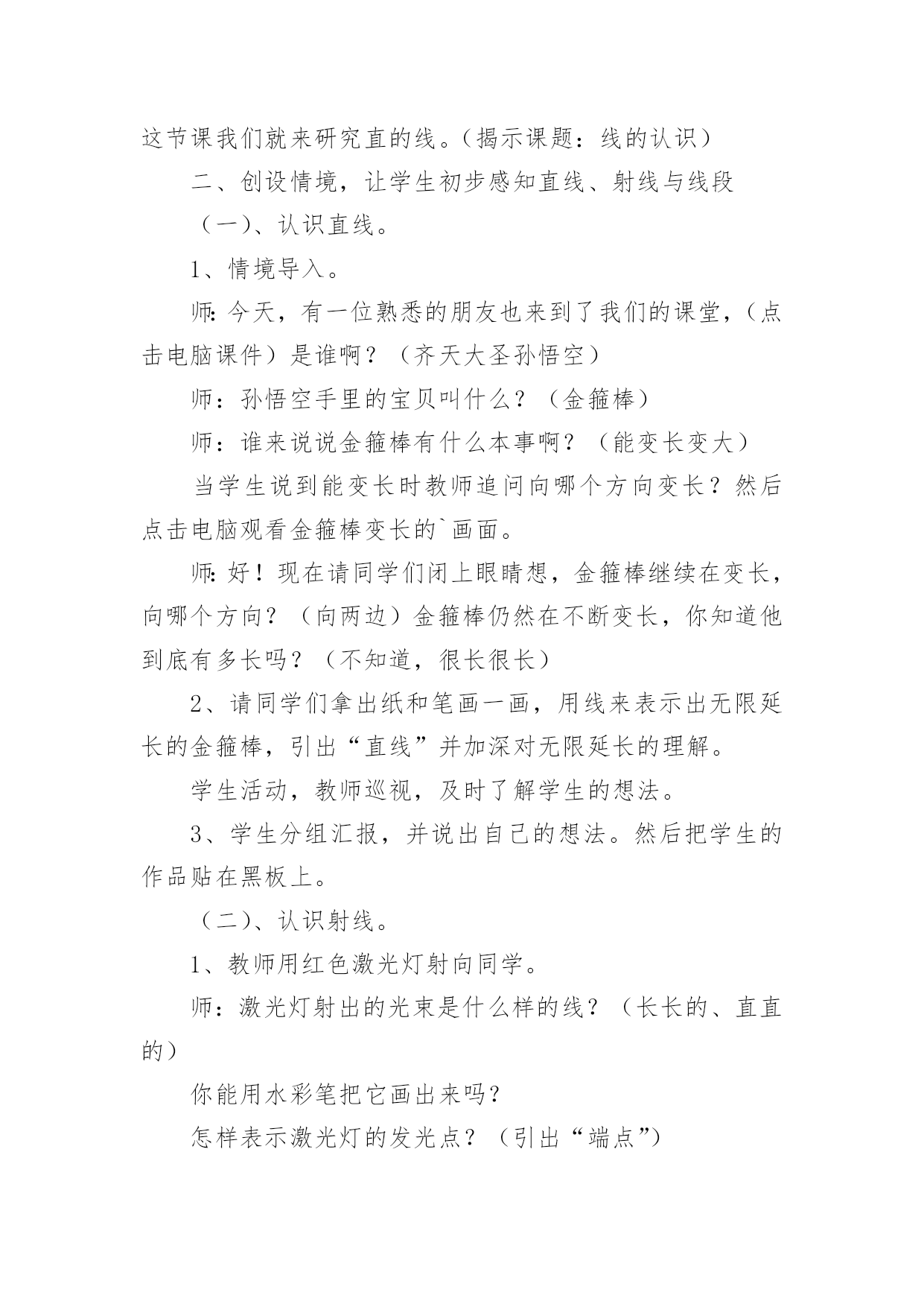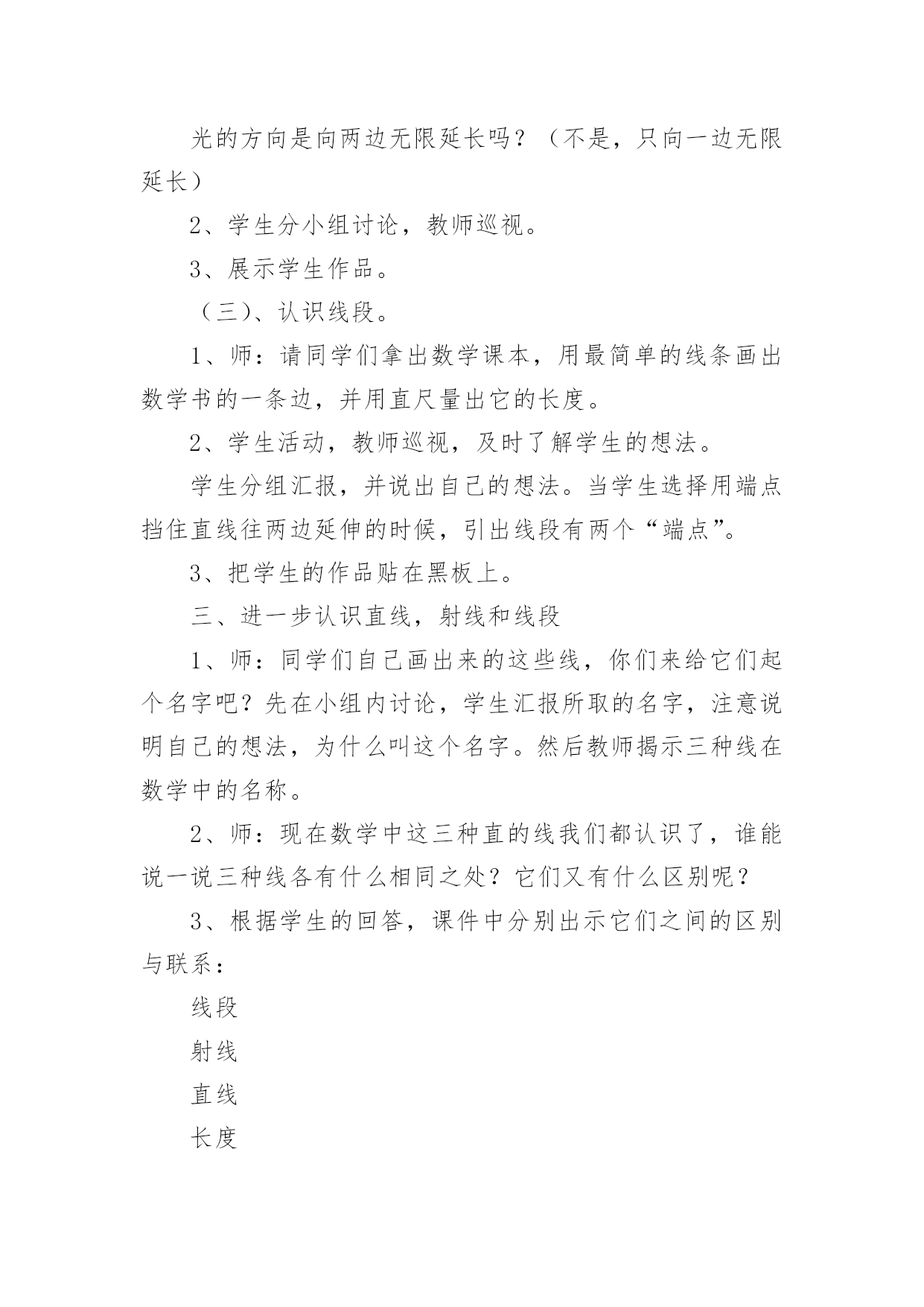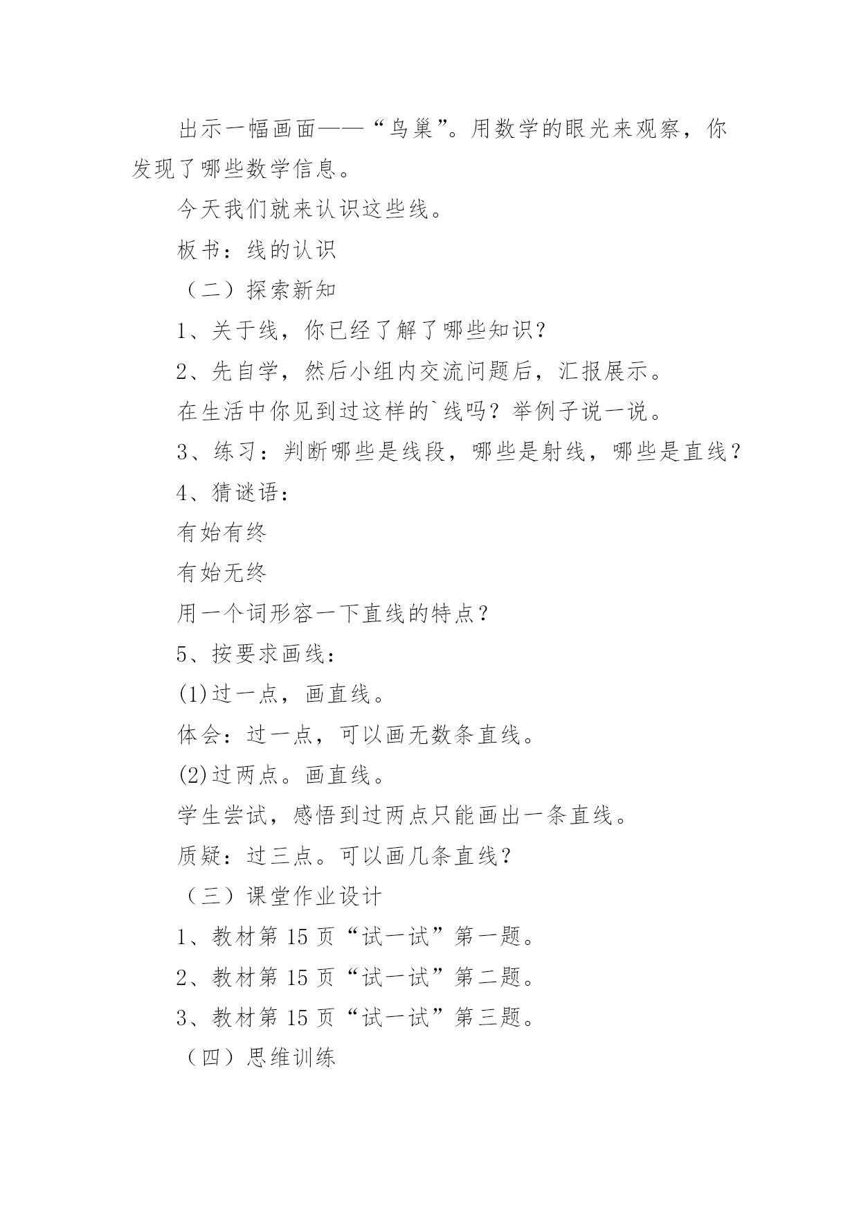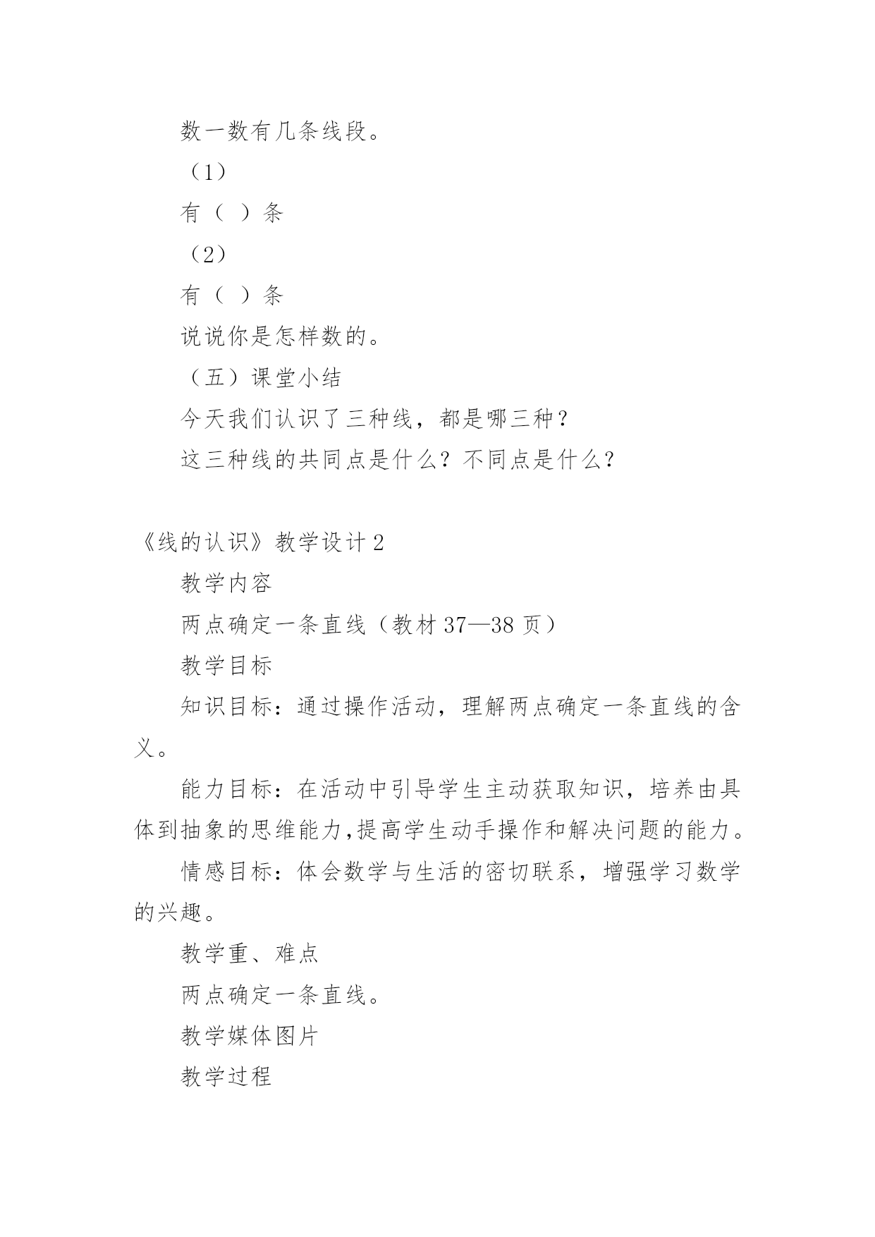 《线的认识》教学设计作为一位杰出的老师,编写教学设计是必不可少的,借助教学设计可以提高教学质量,收到预期的教学效果。那么你有了解过教学设计吗?以下是小编为大家整理的《线的认识》教学设计,仅供参考,大家一起来看看吧。《线的认识》教学设计1四年级上册线与角一、教学内容:北师大版教材四年级上册数学线的认识二、教学目标:1、借助实际情景和操作活动,认识直线、线段与射线。2、会用字母正确读出直线、线段与射线。会数简单图形中的线段。3、培养学生的观察、动手及分析概括的能力。三、重点难点1、体会直线、线段与射线的区别与联系,会用字母正确读出直线、与射线,会数简单图形中的线段。2、理解三种线的特征,掌握三种线的读法四、教具准备直尺,三种不同颜色的线,电脑课件。教学过程(一)导入:出示一幅画面——“鸟巢”。用数学的眼光来观察,你发现了哪些数学信息。今天我们就来认识这些线。板书:线的认识(二)探索新知1、关于线,你已经了解了哪些知识?2、先自学,然后小组内交流问题后,汇报展示。在生活中你见到过这样的`线吗?举例子说一说。3、练习:判断哪些是线段,哪些是射线,哪些是直线?4、猜谜语:有始有终有始无终用一个词形容一下直线的特点?5、按要求画线:(1)过一点,画直线。体会:过一点,可以画无数条直线。(2)过两点。画直线。学生尝试,感悟到过两点只能画出一条直线。质疑:过三点。可以画几条直线?(三)课堂作业设计1、教材“试一试”第一题。2、教材“试一试”第二题。3、教材“试一试”第三题。(四)思维训练数一数有几条线段。(1)有()条(2)有()条说说你是怎样数的。(五)课堂小结今天我们认识了三种线,都是哪三种?这三种线的共同点是什么?不同点是什么?《线的认识》教学设计2教学内容两点确定一条直线(教材37—38页)教学目标知识目标:通过操作活动,理解两点确定一条直线的含义。能力目标:在活动中引导学生主动获取知识,培养由具体到抽象的思维能力,提高学生动手操作和解决问题的能力。情感目标:体会数学与生活的密切联系,增强学习数学的兴趣。教学重、难点两点确定一条直线。教学媒体图片教学过程一、探索新知1.小实验出示图片《小实验》教师提出问题:如果你想把一块木板固定在墙上至少需要几个钉子?学生讨论、汇报。2.画直线(1)在本子上画一个点,试试经过一点画直线,看看能画几条?(2)在本子上画两个点,试试经过两点画直线,看看能画几条?汇报结果。二、得出结论师生共同总结出直线的基本性质:两点确定一条直线。三、生活中的应用出示图片《实际运用》师:同学们还能找出“两点确定一条直线”在生活中应用的其他例子吗?学生分组讨论,汇报。适当引导:栽树时只要确定两个树坑的位置,就能确定同一行的.树坑所在的直线。建筑工人在砌墙时,经常在两个墙角分别立一根标志杆,在两根标志杆之间拉一根绳,沿这根绳就可以砌出直的墙来。四、小结两点确定一条直线。五、巩固练习过一个点可以画出()条直线;过两点可以画出()条直线;过三点至少可以画()条直线,最多可以画()条直线。《线的认识》教学设计3教学内容:北师大版(义务教育课程标准实验教科书)四年级上册第16~17页。教学目标:1、借助实际情境和操作活动,认识直线、线段与射线。2、会用字母正确读出直线、线段与射线。3、会数简单图形中的线段。4、培养学生空间想象意识,动手操作、观察比较和抽象概括能力。教学重、难点:掌握直线、线段与射线的特点,以及它们的区别与联系。教具、学具:多媒体课件、直尺、水彩笔、红色激光灯。教学过程:一、谈话引人同学们,我们的生活中有着各种各样的线,有直的线,也有弯的线,在我们数学中同样也有直的线和弯的线,今天这节课我们就来研究直的线。(揭示课题:线的认识)二、创设情境,让学生初步感知直线、射线与线段(一)、认识直线。1、情境导入。师:今天,有一位熟悉的朋友也来到了我们的课堂,(点击电脑课件)是谁啊?(齐天大圣孙悟空)师:孙悟空手里的宝贝叫什么?(金箍棒)师:谁来说说金箍棒有什么本事啊?(能变长变大)当学生说到能变长时教师追问向哪个方向变长?然后点击电脑观看金箍棒变长的`画面。师:好!现在请同学们闭上眼睛想,金箍棒继续在变长,向哪个方向?(向两边)金箍棒仍然在不断变长,你知道他到底有多长吗?(不知道,很长很长)2、请同学们拿出纸和笔画一画,用线来表示出无限延长的金箍棒,引出“直线”并加深对无限延长的理解。学生活动,教师巡视,及时了解学生的想法。3、学生分组汇报,并说出自己的想法。然后把学生的作品贴在黑板上。(二)、认识射线。1、教师用红色激光灯射向同学。师:激光灯射出的光束是什么样的线?(长长的、直直的)你能用水彩笔把它画出来吗?怎样表示激光灯的发光点?(引出“端点”)光的方向是向两边无限延长吗?(不是,只向一边无限延长)2、学生分小组讨论,教