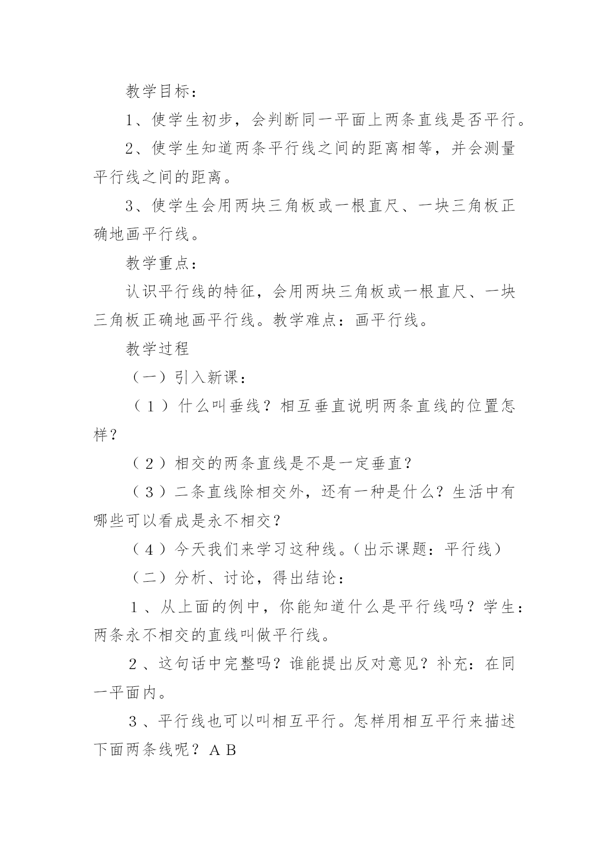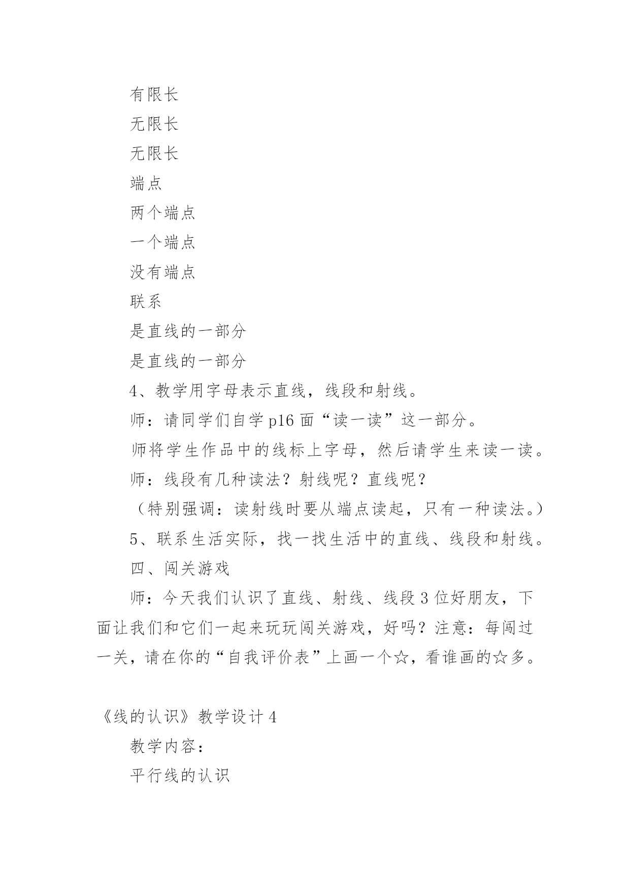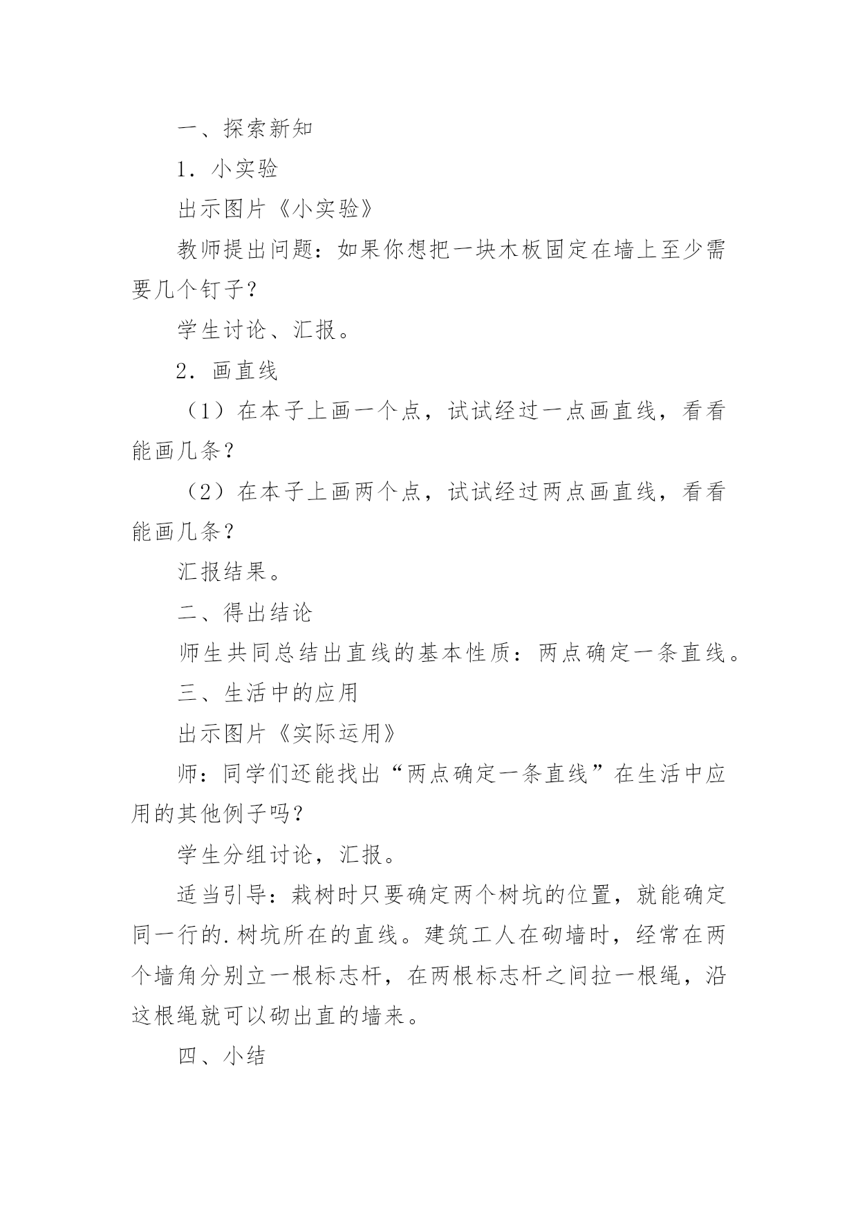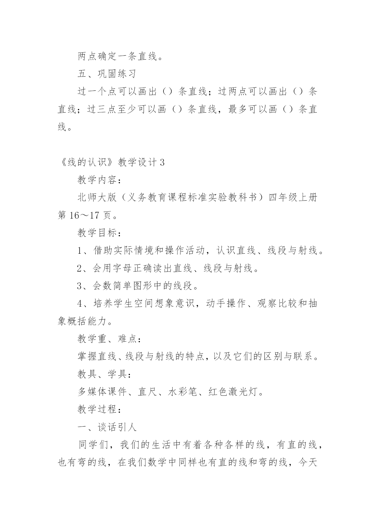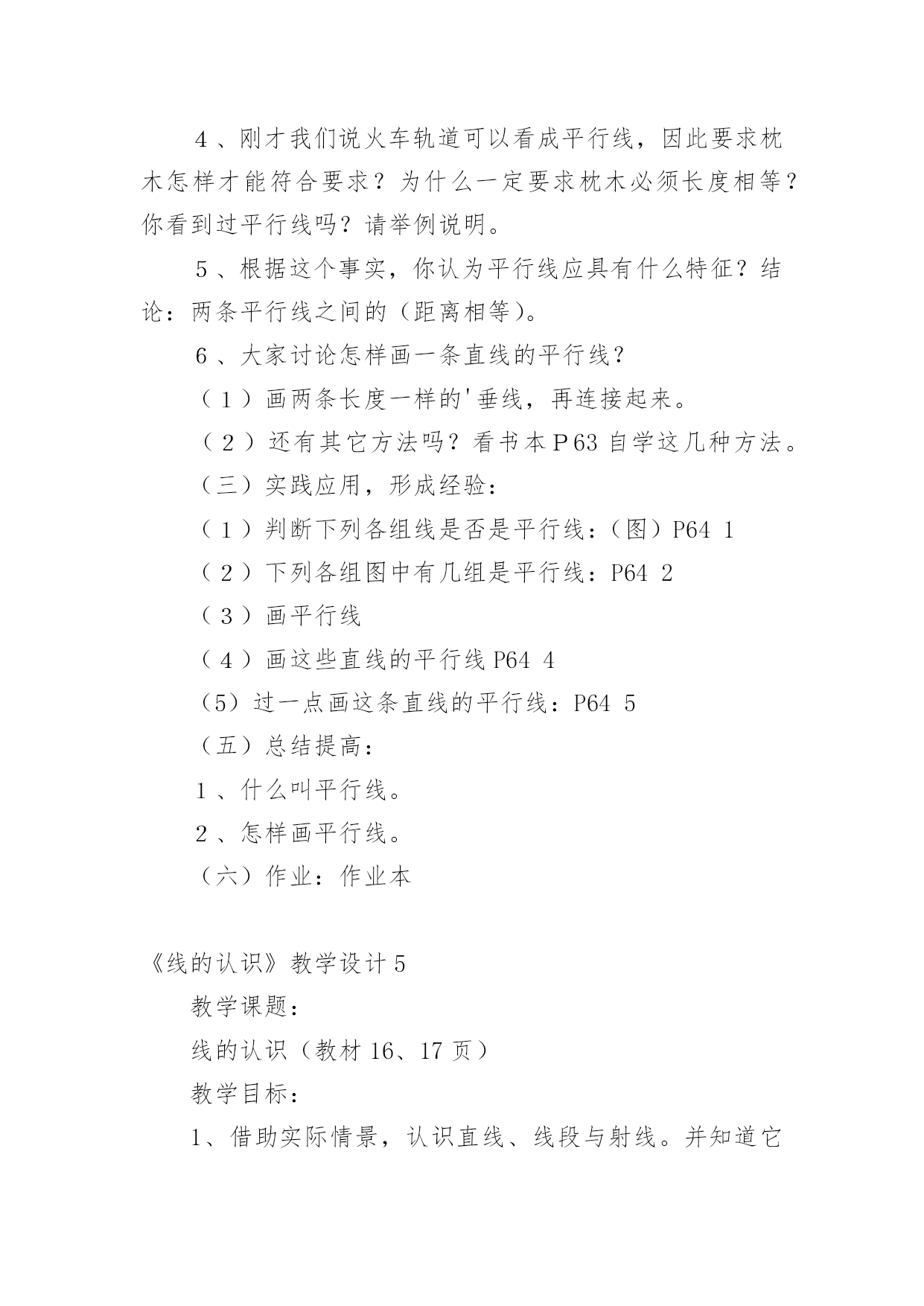 《线的认识》教学设计作为一位杰出的老师,编写教学设计是必不可少的,借助教学设计可以提高教学质量,收到预期的教学效果。那么你有了解过教学设计吗?以下是小编为大家整理的《线的认识》教学设计,仅供参考,大家一起来看看吧。《线的认识》教学设计1四年级上册线与角一、教学内容:北师大版教材四年级上册数学线的认识二、教学目标:1、借助实际情景和操作活动,认识直线、线段与射线。2、会用字母正确读出直线、线段与射线。会数简单图形中的线段。3、培养学生的观察、动手及分析概括的能力。三、重点难点1、体会直线、线段与射线的区别与联系,会用字母正确读出直线、与射线,会数简单图形中的线段。2、理解三种线的特征,掌握三种线的读法四、教具准备直尺,三种不同颜色的线,电脑课件。教学过程(一)导入:出示一幅画面——“鸟巢”。用数学的眼光来观察,你发现了哪些数学信息。今天我们就来认识这些线。板书:线的认识(二)探索新知1、关于线,你已经了解了哪些知识?2、先自学,然后小组内交流问题后,汇报展示。在生活中你见到过这样的`线吗?举例子说一说。3、练习:判断哪些是线段,哪些是射线,哪些是直线?4、猜谜语:有始有终有始无终用一个词形容一下直线的特点?5、按要求画线:(1)过一点,画直线。体会:过一点,可以画无数条直线。(2)过两点。画直线。学生尝试,感悟到过两点只能画出一条直线。质疑:过三点。可以画几条直线?(三)课堂作业设计1、教材“试一试”第一题。2、教材“试一试”第二题。3、教材“试一试”第三题。(四)思维训练数一数有几条线段。(1)有()条(2)有()条说说你是怎样数的。(五)课堂小结今天我们认识了三种线,都是哪三种?这三种线的共同点是什么?不同点是什么?《线的认识》教学设计2教学内容两点确定一条直线(教材37—38页)教学目标知识目标:通过操作活动,理解两点确定一条直线的含义。能力目标:在活动中引导学生主动获取知识,培养由具体到抽象的思维能力,提高学生动手操作和解决问题的能力。情感目标:体会数学与生活的密切联系,增强学习数学的兴趣。教学重、难点两点确定一条直线。教学媒体图片教学过程一、探索新知1.小实验出示图片《小实验》教师提出问题:如果你想把一块木板固定在墙上至少需要几个钉子?学生讨论、汇报。2.画直线(1)在本子上画一个点,试试经过一点画直线,看看能画几条?(2)在本子上画两个点,试试经过两点画直线,看看能画几条?汇报结果。二、得出结论师生共同总结出直线的基本性质:两点确定一条直线。三、生活中的应用出示图片《实际运用》师:同学们还能找出“两点确定一条直线”在生活中应用的其他例子吗?学生分组讨论,汇报。适当引导:栽树时只要确定两个树坑的位置,就能确定同一行的.树坑所在的直线。建筑工人在砌墙时,经常在两个墙角分别立一根标志杆,在两根标志杆之间拉一根绳,沿这根绳就可以砌出直的墙来。四、小结两点确定一条直线。五、巩固练习过一个点可以画出()条直线;过两点可以画出()条直线;过三点至少可以画()条直线,最多可以画()条直线。《线的认识》教学设计3教学内容:北师大版(义务教育课程标准实验教科书)四年级上册第16~17页。教学目标:1、借助实际情境和操作活动,认识直线、线段与射线。2、会用字母正确读出直线、线段与射线。3、会数简单图形中的线段。4、培养学生空间想象意识,动手操作、观察比较和抽象概括能力。教学重、难点:掌握直线、线段与射线的特点,以及它们的区别与联系。教具、学具:多媒体课件、直尺、水彩笔、红色激光灯。教学过程:一、谈话引人同学们,我们的生活中有着各种各样的线,有直的线,也有弯的线,在我们数学中同样也有直的线和弯的线,今天这节课我们就来研究直的线。(揭示课题:线的认识)二、创设情境,让学生初步感知直线、射线与线段(一)、认识直线。1、情境导入。师:今天,有一位熟悉的朋友也来到了我们的课堂,(点击电脑课件)是谁啊?(齐天大圣孙悟空)师:孙悟空手里的宝贝叫什么?(金箍棒)师:谁来说说金箍棒有什么本事啊?(能变长变大)当学生说到能变长时教师追问向哪个方向变长?然后点击电脑观看金箍棒变长的`画面。师:好!现在请同学们闭上眼睛想,金箍棒继续在变长,向哪个方向?(向两边)金箍棒仍然在不断变长,你知道他到底有多长吗?(不知道,很长很长)2、请同学们拿出纸和笔画一画,用线来表示出无限延长的金箍棒,引出“直线”并加深对无限延长的理解。学生活动,教师巡视,及时了解学生的想法。3、学生分组汇报,并说出自己的想法。然后把学生的作品贴在黑板上。(二)、认识射线。1、教师用红色激光灯射向同学。师:激光灯射出的光束是什么样的线?(长长的、直直的)你能用水彩笔把它画出来吗?怎样表示激光灯的发光点?(引出“端点”)光的方向是向两边无限延长吗?(不是,只向一边无限延长)2、学生分小组讨论,教