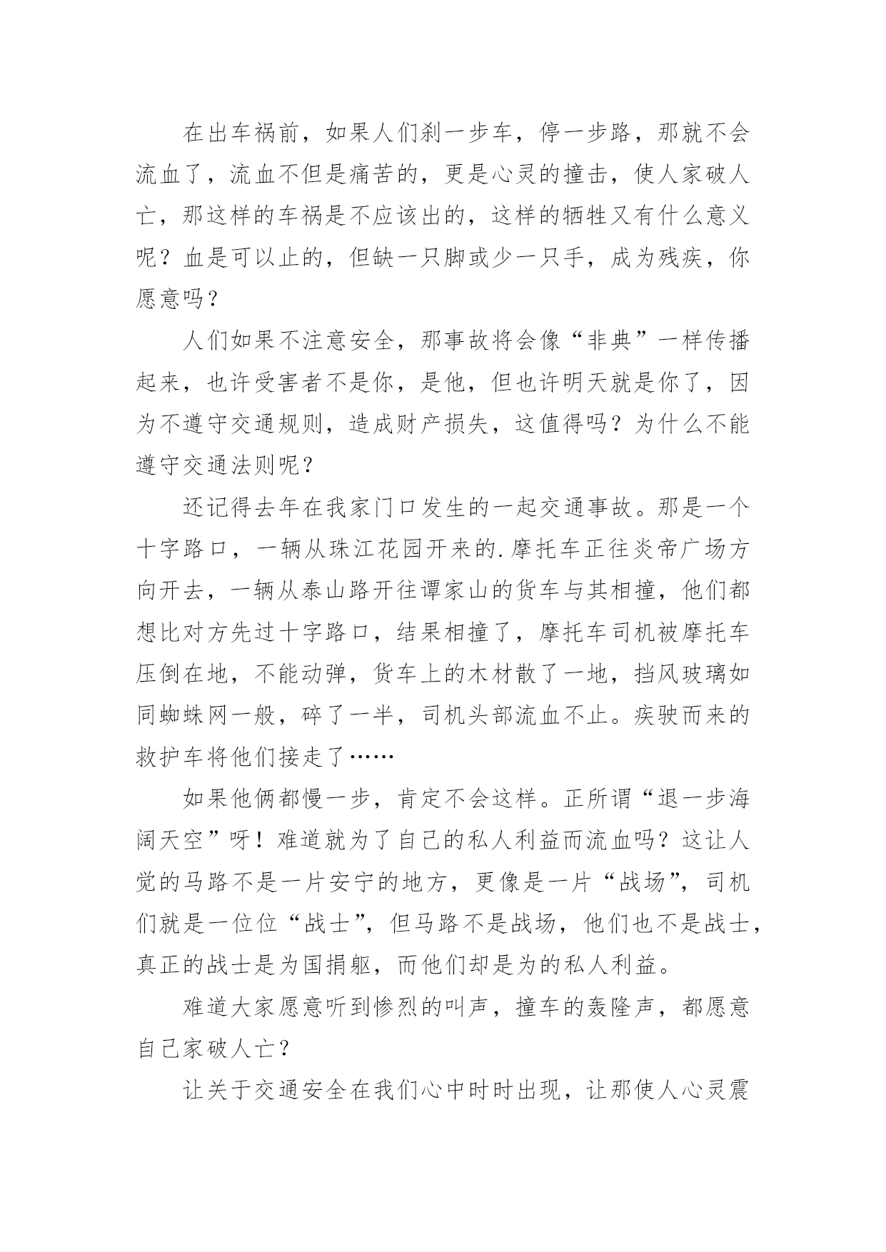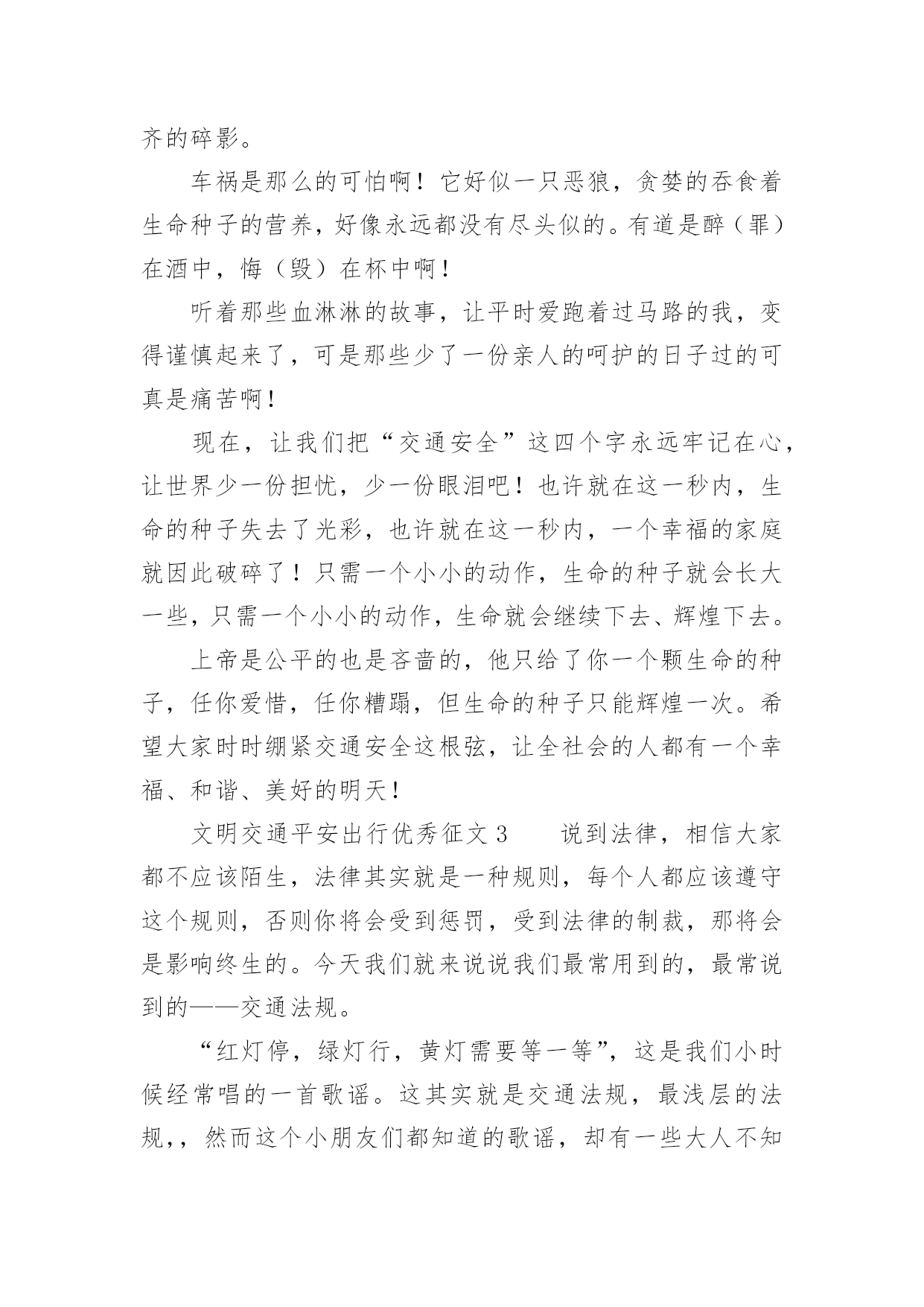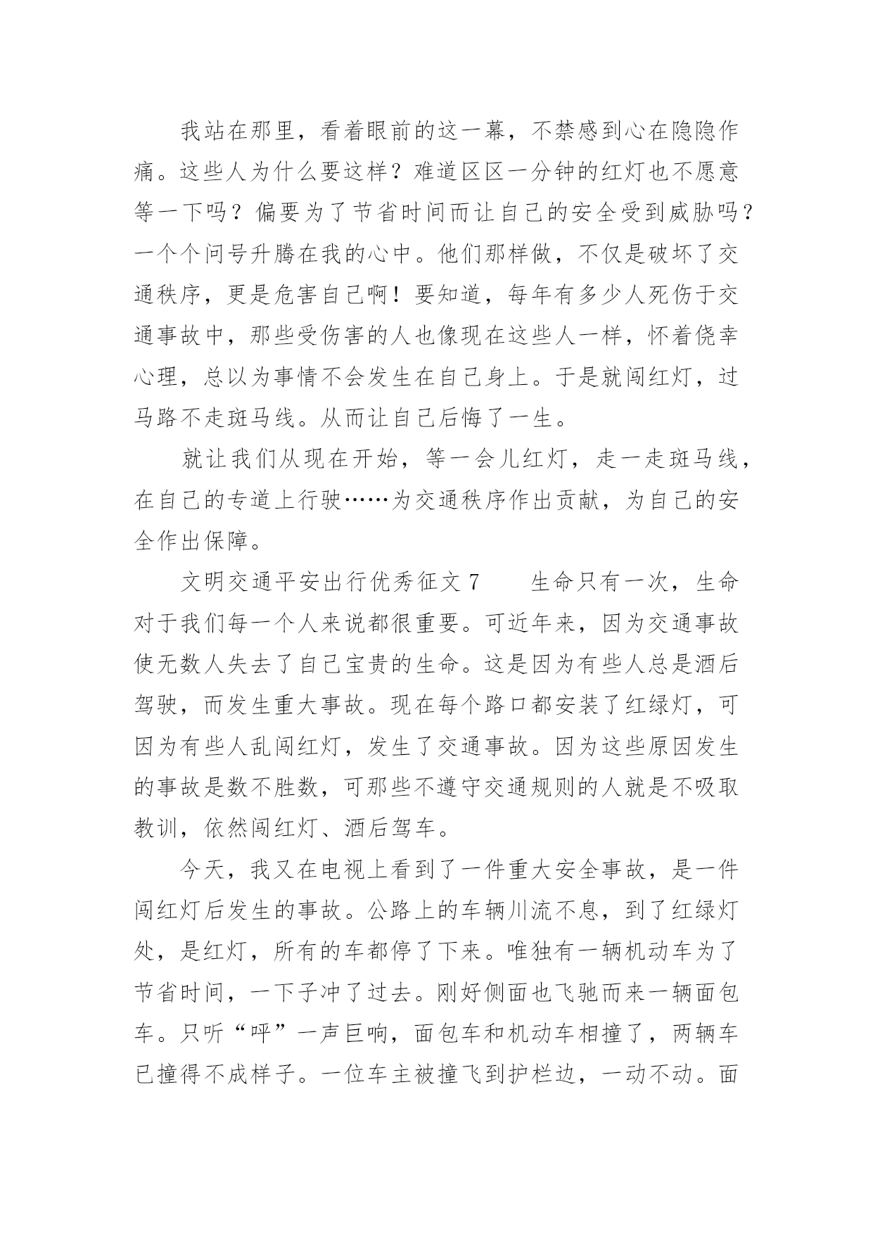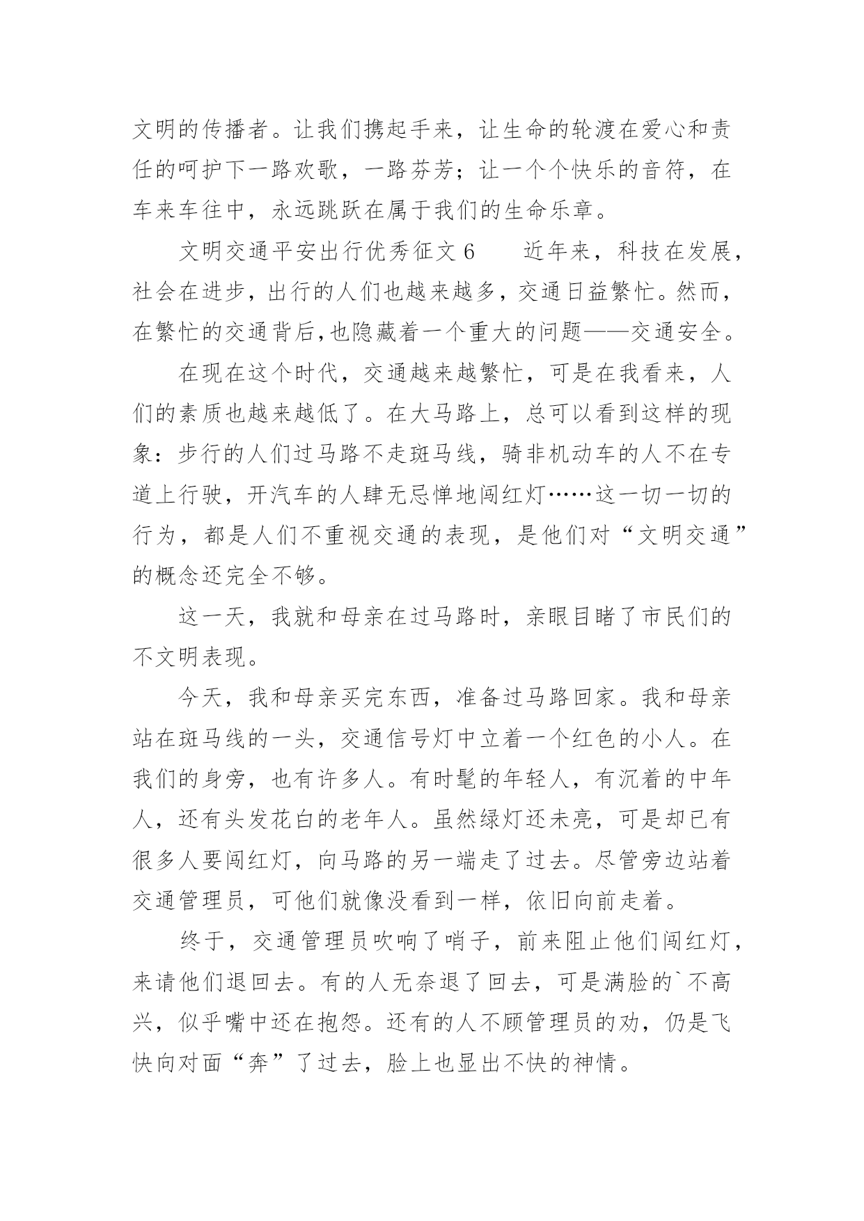 文明交通平安出行优秀征文文明交通平安出行优秀征文范文800字(精选35篇)无论是身处学校还是步入社会,说到征文,大家肯定都不陌生吧,借助征文可以提高我们的语言组织能力。为了让您在写征文时更加简单方便,下面是小编收集整理的文明交通平安出行优秀征文范文800字(精选35篇),欢迎大家分享。文明交通平安出行优秀征文1“嘀嘟,嘀嘟,嘀嘟……”又是一阵震撼人心的救护车声,马路上又出现了一片血迹:当事人躺在地上痛苦地呻吟,那呻吟中掺杂着无限的悔恨,肇事者无奈地望着流血不止的当事人,深深地叹着一口口粗气……据有关数据显示,我国平均每秒有两起车祸发生,每年有20000人死于车祸。这触目惊心的数字,重重地撞击着人们那颗稚嫩的心。交通是国民经济的命脉,不仅关系到国民经济的发展,也与广大人民群众的生命财产密切相关,国家为了维护道路交通秩序,预防和减少交通事故造成人们必要的生命财产及其他的经济损失,特制定《中华人民共和国道路法》,让每个市民都依法做到在我心中。马路作为交通的载体,它伤害了无数人的生命,它不能没有,但有了它却有无休止的流血。在出车祸前,如果人们刹一步车,停一步路,那就不会流血了,流血不但是痛苦的,更是心灵的撞击,使人家破人亡,那这样的车祸是不应该出的,这样的牺牲又有什么意义呢?血是可以止的,但缺一只脚或少一只手,成为残疾,你愿意吗?人们如果不注意安全,那事故将会像“非典”一样传播起来,也许受害者不是你,是他,但也许明天就是你了,因为不遵守交通规则,造成财产损失,这值得吗?为什么不能遵守交通法则呢?还记得去年在我家门口发生的一起交通事故。那是一个十字路口,一辆从珠江花园开来的.摩托车正往炎帝广场方向开去,一辆从泰山路开往谭家山的货车与其相撞,他们都想比对方先过十字路口,结果相撞了,摩托车司机被摩托车压倒在地,不能动弹,货车上的木材散了一地,挡风玻璃如同蜘蛛网一般,碎了一半,司机头部流血不止。疾驶而来的救护车将他们接走了……如果他俩都慢一步,肯定不会这样。正所谓“退一步海阔天空”呀!难道就为了自己的私人利益而流血吗?这让人觉的马路不是一片安宁的地方,更像是一片“战场”,司机们就是一位位“战士”,但马路不是战场,他们也不是战士,真正的战士是为国捐躯,而他们却是为的私人利益。难道大家愿意听到惨烈的叫声,撞车的轰隆声,都愿意自己家破人亡?让关于交通安全在我们心中时时出现,让那使人心灵震撼的声音不再出现。文明交通平安出行优秀征文2上帝有时是公平的,有时也是吝啬的,他只赐予每个人一颗生命的种子,任你去爱惜,任你去糟蹋,可是生命只有一次,你愿意就此糟踏此生吗?我相信你不会的。交通安全最重要了,那什么是安全呢?它是街道上横行霸道的摩托车吗?是逆向行驶的小轿车吗?是急着想过马路而闯红灯的三轮车吗?是那些酒后驾车的司机们吗?还是。交通事故是人类致命的弱点,你瞧,那高个的叔叔正用着刘翔跨栏般的姿势翻过马路上的护栏,也不就是图个方便嘛!可是他想过那严重的后果吗?当然没有做到规范的交通“礼仪”的事件是非常普遍的,可是危险性却是非常大的。俗话说的好嘛:红灯、黄灯、绿灯,只只都是警示灯;黄线、白线、斑马线,条条都是生命线!就在去年的一个夜晚,我最亲爱的小姑公永远的离开了我,现在在我的`脑海里,也只有他的一些残缺不齐的碎影了,因为他就死于一场车祸中:黑黑的夜晚,小姑公半醒半睡地开着自己用一生的钱攒来的轿车飞驰在郊外的马路上。突然,在转弯口,莫名其妙的“冒”出了一枝庞大的树干,就在这一瞬间,世界上永远的失去一位心地善良的好人。后来,我才听爸爸妈妈说,小姑公是因为那根树干插进了他的心脏才永远的离开了我,傻傻的我,有时还会呆呆的望着蓝蓝的天空,望着枝头上的鸟儿,回忆着那一些残缺不齐的碎影。车祸是那么的可怕啊!它好似一只恶狼,贪婪的吞食着生命种子的营养,好像永远都没有尽头似的。有道是醉(罪)在酒中,悔(毁)在杯中啊!听着那些血淋淋的故事,让平时爱跑着过马路的我,变得谨慎起来了,可是那些少了一份亲人的呵护的日子过的可真是痛苦啊!现在,让我们把“交通安全”这四个字永远牢记在心,让世界少一份担忧,少一份眼泪吧!也许就在这一秒内,生命的种子失去了光彩,也许就在这一秒内,一个幸福的家庭就因此破碎了!只需一个小小的动作,生命的种子就会长大一些,只需一个小小的动作,生命就会继续下去、辉煌下去。上帝是公平的也是吝啬的,他只给了你一个颗生命的种子,任你爱惜,任你糟蹋,但生命的种子只能辉煌一次。希望大家时时绷紧交通安全这根弦,让全社会的人都有一个幸福、和谐、美好的明天!文明交通平安出行优秀征文3说到法律,相信大家都不应该陌生,法律其实就是一种规则,每个人都应该遵守这个规则,否则你将会受到惩罚,受到法律的制裁,那将会是影响终生的。今天我们就来说说我们最常用到的,最常说到的——交通法规。“红灯停,
