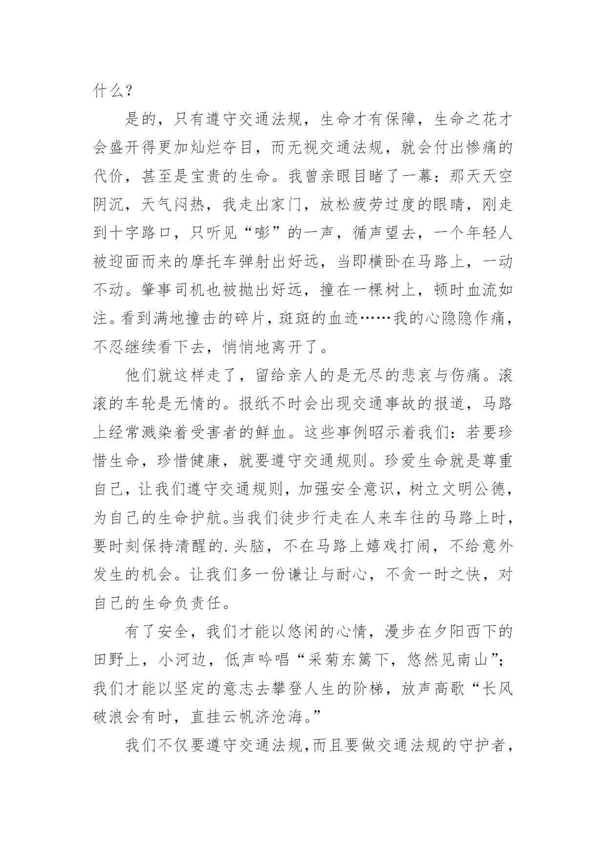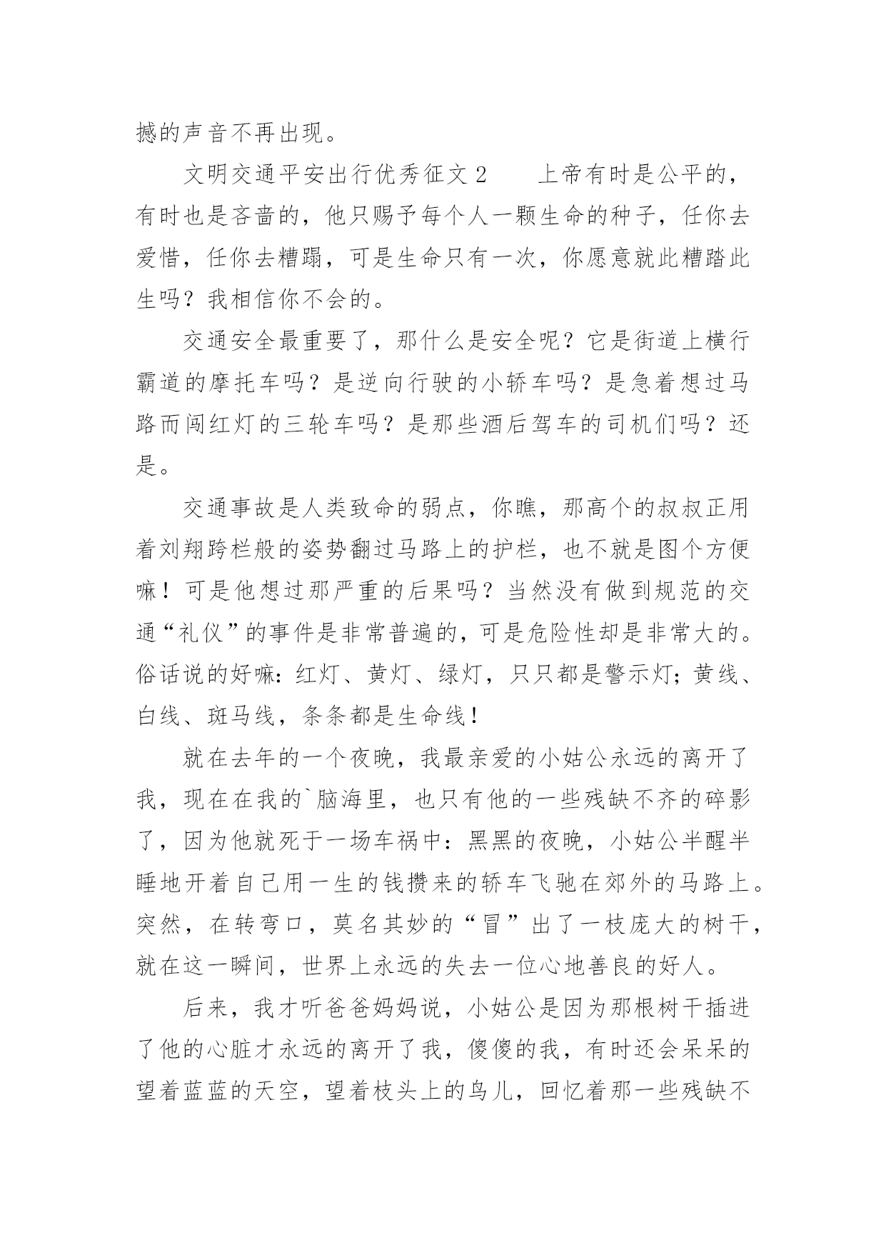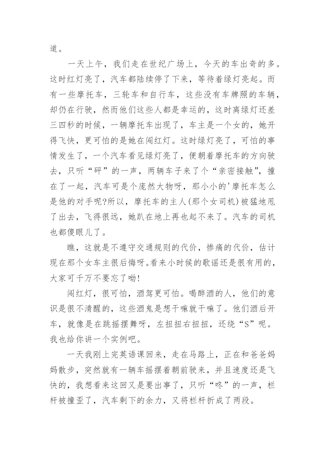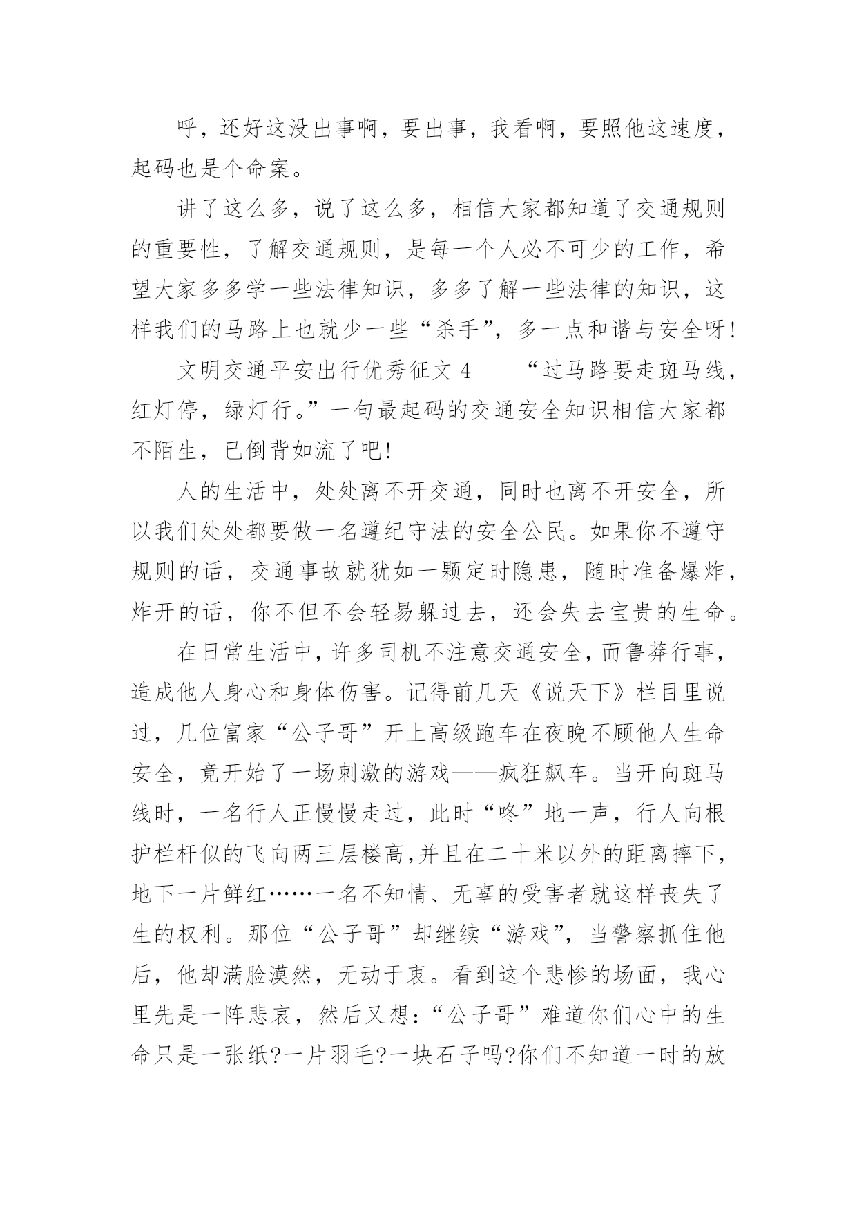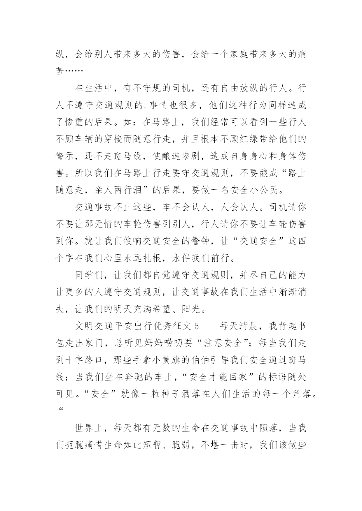 文明交通平安出行优秀征文文明交通平安出行优秀征文范文800字(精选35篇)无论是身处学校还是步入社会,说到征文,大家肯定都不陌生吧,借助征文可以提高我们的语言组织能力。为了让您在写征文时更加简单方便,下面是小编收集整理的文明交通平安出行优秀征文范文800字(精选35篇),欢迎大家分享。文明交通平安出行优秀征文1“嘀嘟,嘀嘟,嘀嘟……”又是一阵震撼人心的救护车声,马路上又出现了一片血迹:当事人躺在地上痛苦地呻吟,那呻吟中掺杂着无限的悔恨,肇事者无奈地望着流血不止的当事人,深深地叹着一口口粗气……据有关数据显示,我国平均每秒有两起车祸发生,每年有20000人死于车祸。这触目惊心的数字,重重地撞击着人们那颗稚嫩的心。交通是国民经济的命脉,不仅关系到国民经济的发展,也与广大人民群众的生命财产密切相关,国家为了维护道路交通秩序,预防和减少交通事故造成人们必要的生命财产及其他的经济损失,特制定《中华人民共和国道路法》,让每个市民都依法做到在我心中。马路作为交通的载体,它伤害了无数人的生命,它不能没有,但有了它却有无休止的流血。在出车祸前,如果人们刹一步车,停一步路,那就不会流血了,流血不但是痛苦的,更是心灵的撞击,使人家破人亡,那这样的车祸是不应该出的,这样的牺牲又有什么意义呢?血是可以止的,但缺一只脚或少一只手,成为残疾,你愿意吗?人们如果不注意安全,那事故将会像“非典”一样传播起来,也许受害者不是你,是他,但也许明天就是你了,因为不遵守交通规则,造成财产损失,这值得吗?为什么不能遵守交通法则呢?还记得去年在我家门口发生的一起交通事故。那是一个十字路口,一辆从珠江花园开来的.摩托车正往炎帝广场方向开去,一辆从泰山路开往谭家山的货车与其相撞,他们都想比对方先过十字路口,结果相撞了,摩托车司机被摩托车压倒在地,不能动弹,货车上的木材散了一地,挡风玻璃如同蜘蛛网一般,碎了一半,司机头部流血不止。疾驶而来的救护车将他们接走了……如果他俩都慢一步,肯定不会这样。正所谓“退一步海阔天空”呀!难道就为了自己的私人利益而流血吗?这让人觉的马路不是一片安宁的地方,更像是一片“战场”,司机们就是一位位“战士”,但马路不是战场,他们也不是战士,真正的战士是为国捐躯,而他们却是为的私人利益。难道大家愿意听到惨烈的叫声,撞车的轰隆声,都愿意自己家破人亡?让关于交通安全在我们心中时时出现,让那使人心灵震撼的声音不再出现。文明交通平安出行优秀征文2上帝有时是公平的,有时也是吝啬的,他只赐予每个人一颗生命的种子,任你去爱惜,任你去糟蹋,可是生命只有一次,你愿意就此糟踏此生吗?我相信你不会的。交通安全最重要了,那什么是安全呢?它是街道上横行霸道的摩托车吗?是逆向行驶的小轿车吗?是急着想过马路而闯红灯的三轮车吗?是那些酒后驾车的司机们吗?还是。交通事故是人类致命的弱点,你瞧,那高个的叔叔正用着刘翔跨栏般的姿势翻过马路上的护栏,也不就是图个方便嘛!可是他想过那严重的后果吗?当然没有做到规范的交通“礼仪”的事件是非常普遍的,可是危险性却是非常大的。俗话说的好嘛:红灯、黄灯、绿灯,只只都是警示灯;黄线、白线、斑马线,条条都是生命线!就在去年的一个夜晚,我最亲爱的小姑公永远的离开了我,现在在我的`脑海里,也只有他的一些残缺不齐的碎影了,因为他就死于一场车祸中:黑黑的夜晚,小姑公半醒半睡地开着自己用一生的钱攒来的轿车飞驰在郊外的马路上。突然,在转弯口,莫名其妙的“冒”出了一枝庞大的树干,就在这一瞬间,世界上永远的失去一位心地善良的好人。后来,我才听爸爸妈妈说,小姑公是因为那根树干插进了他的心脏才永远的离开了我,傻傻的我,有时还会呆呆的望着蓝蓝的天空,望着枝头上的鸟儿,回忆着那一些残缺不齐的碎影。车祸是那么的可怕啊!它好似一只恶狼,贪婪的吞食着生命种子的营养,好像永远都没有尽头似的。有道是醉(罪)在酒中,悔(毁)在杯中啊!听着那些血淋淋的故事,让平时爱跑着过马路的我,变得谨慎起来了,可是那些少了一份亲人的呵护的日子过的可真是痛苦啊!现在,让我们把“交通安全”这四个字永远牢记在心,让世界少一份担忧,少一份眼泪吧!也许就在这一秒内,生命的种子失去了光彩,也许就在这一秒内,一个幸福的家庭就因此破碎了!只需一个小小的动作,生命的种子就会长大一些,只需一个小小的动作,生命就会继续下去、辉煌下去。上帝是公平的也是吝啬的,他只给了你一个颗生命的种子,任你爱惜,任你糟蹋,但生命的种子只能辉煌一次。希望大家时时绷紧交通安全这根弦,让全社会的人都有一个幸福、和谐、美好的明天!文明交通平安出行优秀征文3说到法律,相信大家都不应该陌生,法律其实就是一种规则,每个人都应该遵守这个规则,否则你将会受到惩罚,受到法律的制裁,那将会是影响终生的。今天我们就来说说我们最常用到的,最常说到的——交通法规。“红灯停,