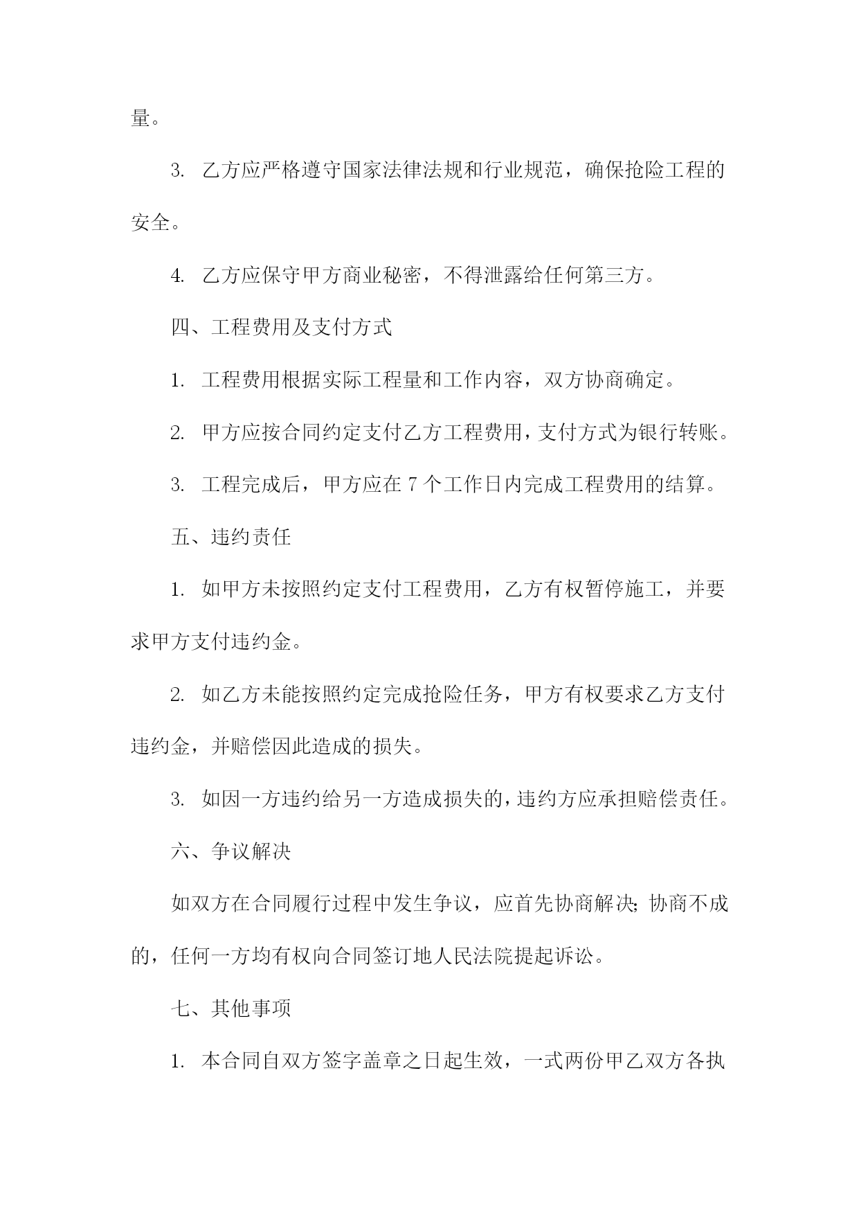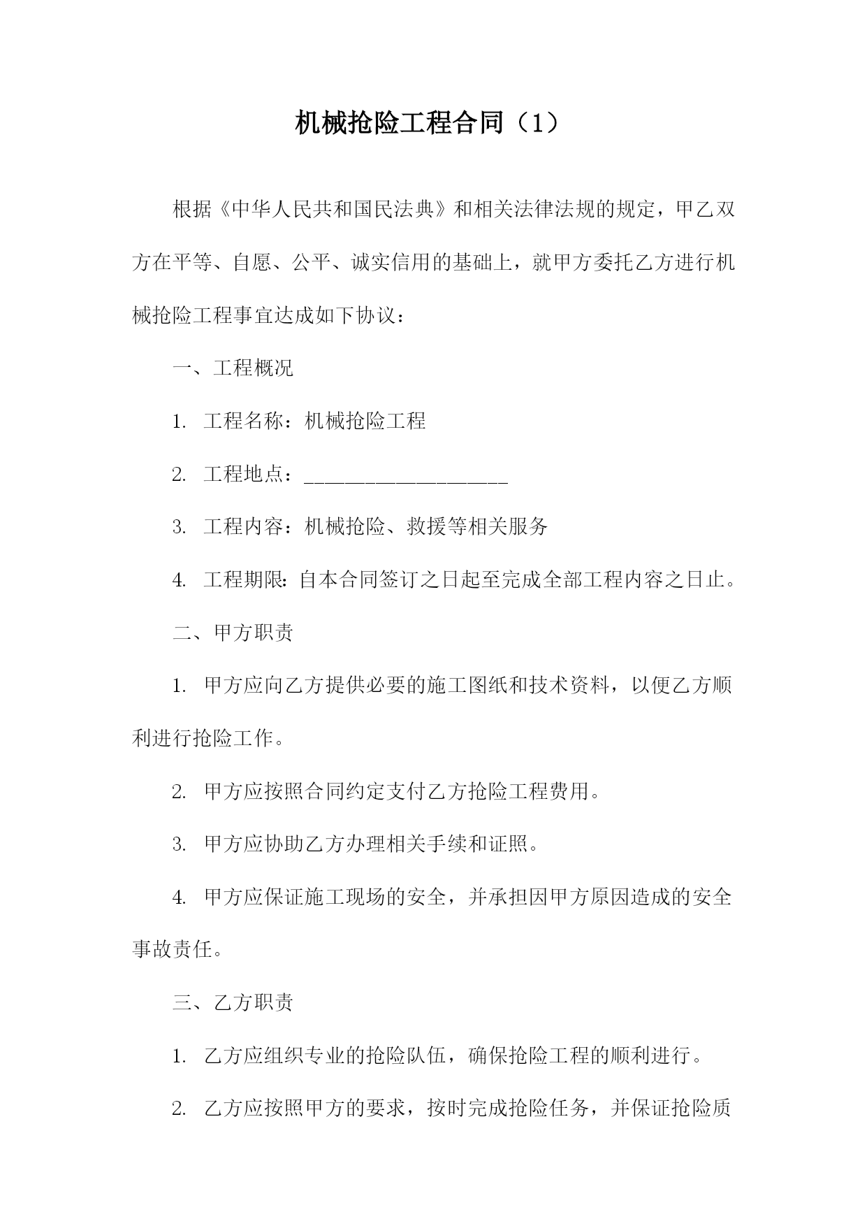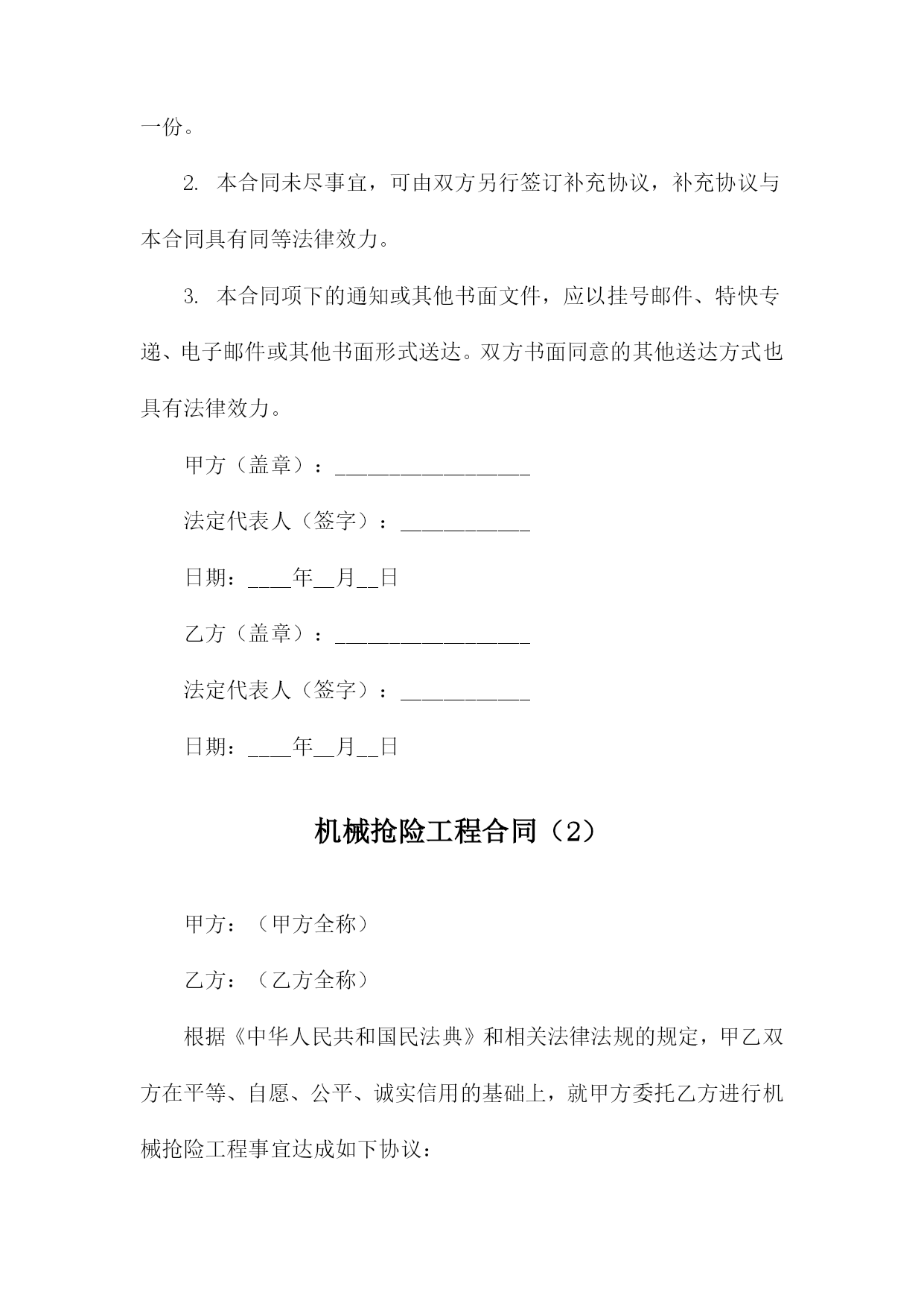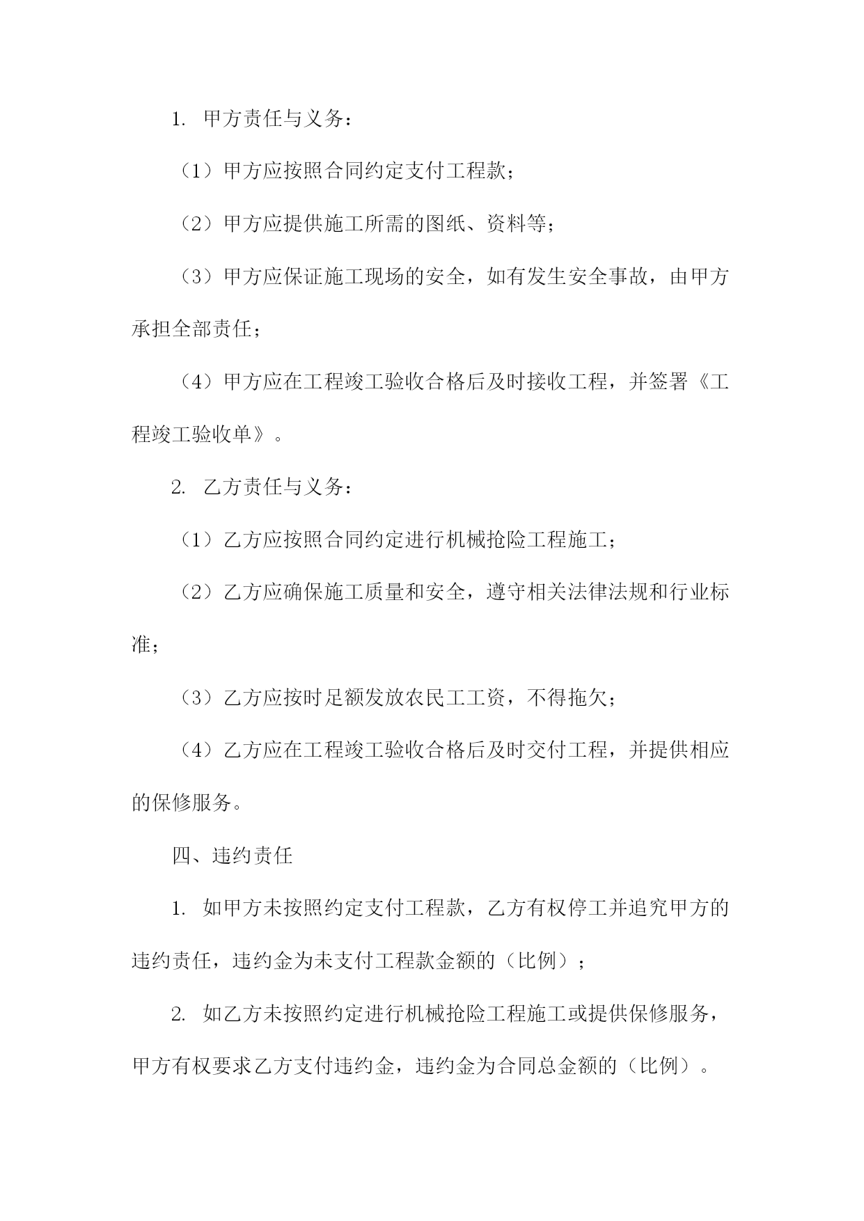 机械抢险工程合同甲方:(甲方全称)乙方:(乙方全称)根据《中华人民共和国民法典》和相关法律法规的规定,甲乙双方在平等、自愿、公平、诚实信用的基础上,就甲方委托乙方进行机械抢险工程事宜达成如下协议:一、工程概况1.工程名称:(工程名称)2.工程地点:(工程地点)3.工程内容:(工程内容描述)4.工程期限:自本合同签订之日起计算,至工程完成之日止。二、工程造价与支付方式1.工程造价:人民币(金额)元整(大写:(金额大写))。2.支付方式:甲方在合同签订后(支付比例)内支付预付款,剩余款项在工程完成后(支付比例)内付清。3.付款进度:甲方应按期支付工程款,否则乙方有权停工并追究甲方的违约责任。三、双方责任与义务1.甲方责任与义务:(1)甲方应按照合同约定支付工程款;(2)甲方应提供施工所需的图纸、资料等;(3)甲方应保证施工现场的安全,如有发生安全事故,由甲方承担全部责任;(4)甲方应在工程竣工验收合格后及时接收工程,并签署《工程竣工验收单》。2.乙方责任与义务:(1)乙方应按照合同约定进行机械抢险工程施工;(2)乙方应确保施工质量和安全,遵守相关法律法规和行业标准;(3)乙方应按时足额发放农民工工资,不得拖欠;(4)乙方应在工程竣工验收合格后及时交付工程,并提供相应的保修服务。四、违约责任1.如甲方未按照约定支付工程款,乙方有权停工并追究甲方的违约责任,违约金为未支付工程款金额的(比例);2.如乙方未按照约定进行机械抢险工程施工或提供保修服务,甲方有权要求乙方支付违约金,违约金为合同总金额的(比例)。五、争议解决如双方在合同履行过程中发生争议,应首先协商解决;协商不成的,任何一方均有权向(管辖法院)提起诉讼。六、其他事项1.本合同自双方签字(盖章)之日起生效,一式两份甲乙双方各执一份;2.未尽事宜,可另行签订补充协议,补充协议与本合同具有同等法律效力;3.本合同未尽事宜,可由甲乙双方协商补充,并作为本合同的组成部分;4.本合同项下的通知或其他书面文件,应以挂号邮件、特快专递、电子邮件或其他书面形式送达。双方书面同意的其他送达方式也具有法律效力。甲方(盖章):(甲方公章)法定代表人(签字):(甲方手写签名)日期:XXXX年XX月XX日乙方(盖章):(乙方公章)法定代表人(签字):(乙方手写签名)日期:XXXX年XX月XX日机械抢险工程合同(1)根据《中华人民共和国民法典》和相关法律法规的规定,甲乙双方在平等、自愿、公平、诚实信用的基础上,就甲方委托乙方进行机械抢险工程事宜达成如下协议:一、工程概况1.工程名称:机械抢险工程2.工程地点:____________________3.工程内容:机械抢险、救援等相关服务4.工程期限:自本合同签订之日起至完成全部工程内容之日止。二、甲方职责1.甲方应向乙方提供必要的施工图纸和技术资料,以便乙方顺利进行抢险工作。2.甲方应按照合同约定支付乙方抢险工程费用。3.甲方应协助乙方办理相关手续和证照。4.甲方应保证施工现场的安全,并承担因甲方原因造成的安全事故责任。三、乙方职责1.乙方应组织专业的抢险队伍,确保抢险工程的顺利进行。2.乙方应按照甲方的要求,按时完成抢险任务,并保证抢险质量。3.乙方应严格遵守国家法律法规和行业规范,确保抢险工程的安全。4.乙方应保守甲方商业秘密,不得泄露给任何第三方。四、工程费用及支付方式1.工程费用根据实际工程量和工作内容,双方协商确定。2.甲方应按合同约定支付乙方工程费用,支付方式为银行转账。3.工程完成后,甲方应在7个工作日内完成工程费用的结算。五、违约责任1.如甲方未按照约定支付工程费用,乙方有权暂停施工,并要求甲方支付违约金。2.如乙方未能按照约定完成抢险任务,甲方有权要求乙方支付违约金,并赔偿因此造成的损失。3.如因一方违约给另一方造成损失的,违约方应承担赔偿责任。六、争议解决如双方在合同履行过程中发生争议,应首先协商解决;协商不成的,任何一方均有权向合同签订地人民法院提起诉讼。七、其他事项1.本合同自双方签字盖章之日起生效,一式两份甲乙双方各执一份。2.本合同未尽事宜,可由双方另行签订补充协议,补充协议与本合同具有同等法律效力。3.本合同项下的通知或其他书面文件,应以挂号邮件、特快专递、电子邮件或其他书面形式送达。双方书面同意的其他送达方式也具有法律效力。甲方(盖章):__________________法定代表人(签字):____________日期:____年__月__日乙方(盖章):__________________法定代表人(签字):____________日期:____年__月__日机械抢险工