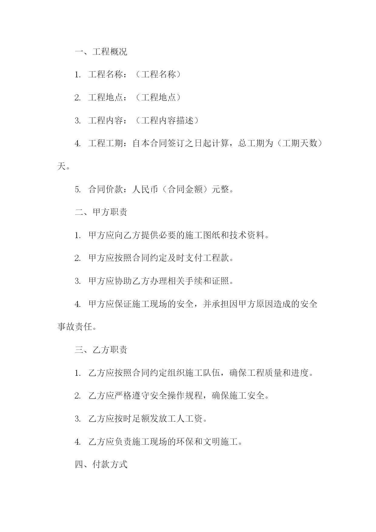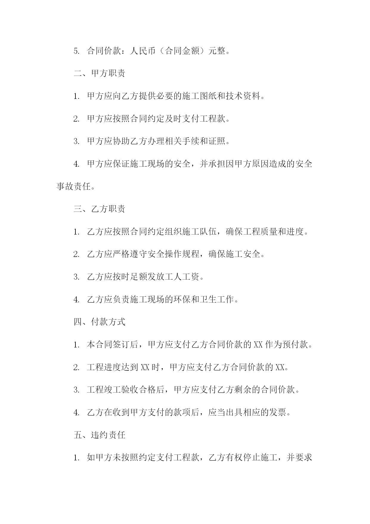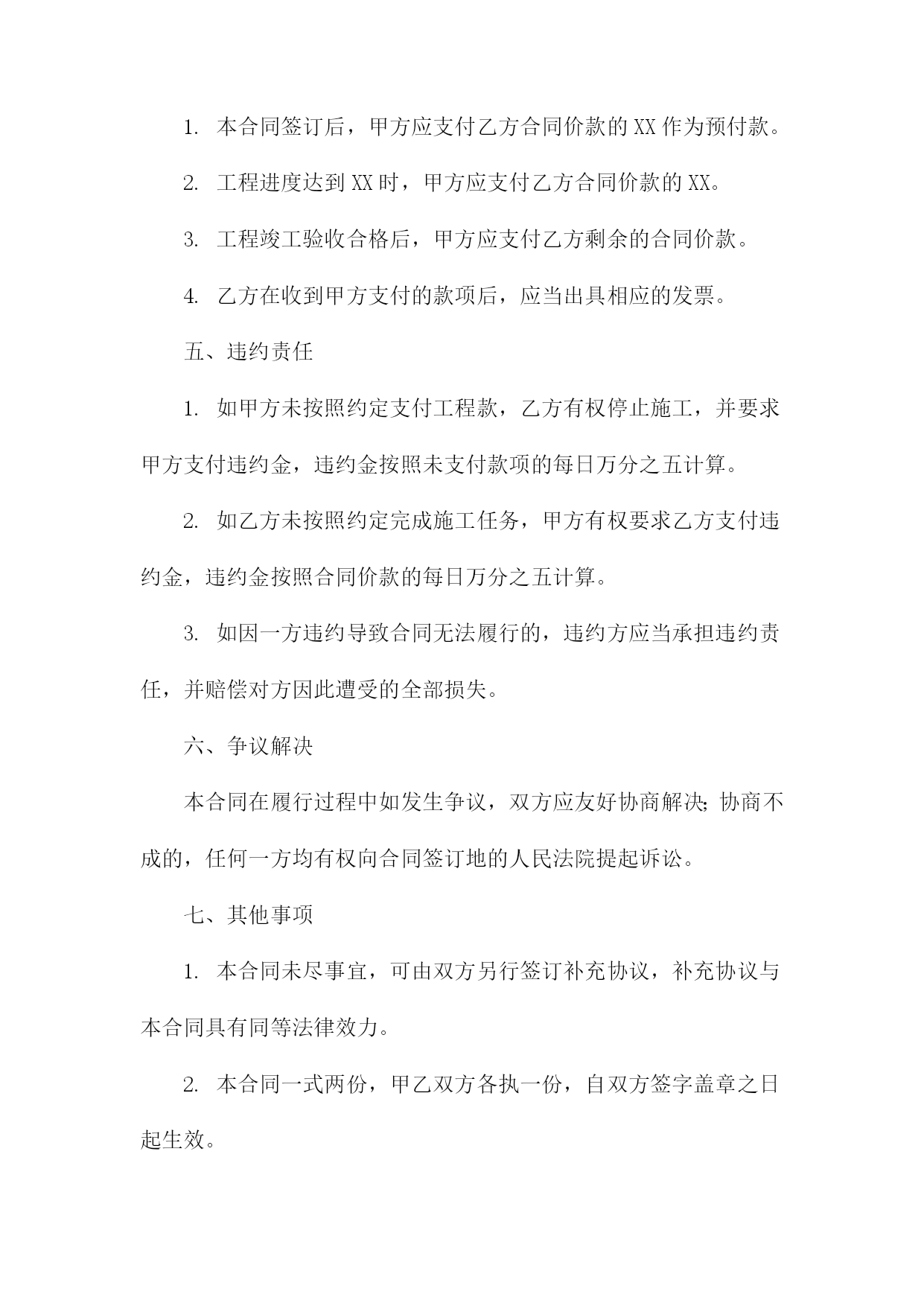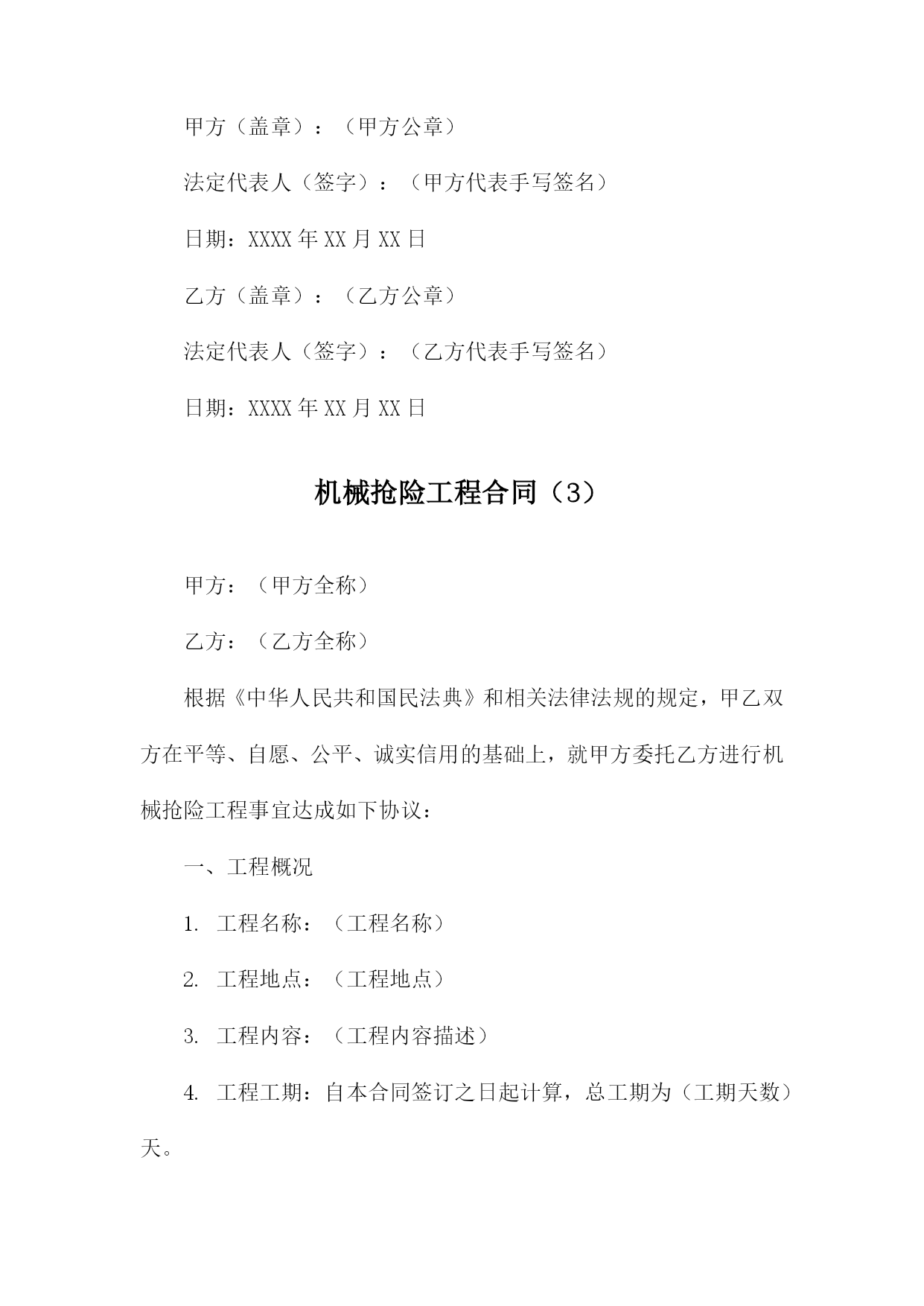 机械抢险工程合同甲方:(甲方全称)乙方:(乙方全称)根据《中华人民共和国民法典》和相关法律法规的规定,甲乙双方在平等、自愿、公平、诚实信用的基础上,就甲方委托乙方进行机械抢险工程事宜达成如下协议:一、工程概况1.工程名称:(工程名称)2.工程地点:(工程地点)3.工程内容:(工程内容描述)4.工程期限:自本合同签订之日起计算,至工程完成之日止。二、工程造价与支付方式1.工程造价:人民币(金额)元整(大写:(金额大写))。2.支付方式:甲方在合同签订后(支付比例)内支付预付款,剩余款项在工程完成后(支付比例)内付清。3.付款进度:甲方应按期支付工程款,否则乙方有权停工并追究甲方的违约责任。三、双方责任与义务1.甲方责任与义务:(1)甲方应按照合同约定支付工程款;(2)甲方应提供施工所需的图纸、资料等;(3)甲方应保证施工现场的安全,如有发生安全事故,由甲方承担全部责任;(4)甲方应在工程竣工验收合格后及时接收工程,并签署《工程竣工验收单》。2.乙方责任与义务:(1)乙方应按照合同约定进行机械抢险工程施工;(2)乙方应确保施工质量和安全,遵守相关法律法规和行业标准;(3)乙方应按时足额发放农民工工资,不得拖欠;(4)乙方应在工程竣工验收合格后及时交付工程,并提供相应的保修服务。四、违约责任1.如甲方未按照约定支付工程款,乙方有权停工并追究甲方的违约责任,违约金为未支付工程款金额的(比例);2.如乙方未按照约定进行机械抢险工程施工或提供保修服务,甲方有权要求乙方支付违约金,违约金为合同总金额的(比例)。五、争议解决如双方在合同履行过程中发生争议,应首先协商解决;协商不成的,任何一方均有权向(管辖法院)提起诉讼。六、其他事项1.本合同自双方签字(盖章)之日起生效,一式两份甲乙双方各执一份;2.未尽事宜,可另行签订补充协议,补充协议与本合同具有同等法律效力;3.本合同未尽事宜,可由甲乙双方协商补充,并作为本合同的组成部分;4.本合同项下的通知或其他书面文件,应以挂号邮件、特快专递、电子邮件或其他书面形式送达。双方书面同意的其他送达方式也具有法律效力。甲方(盖章):(甲方公章)法定代表人(签字):(甲方手写签名)日期:XXXX年XX月XX日乙方(盖章):(乙方公章)法定代表人(签字):(乙方手写签名)日期:XXXX年XX月XX日机械抢险工程合同(1)根据《中华人民共和国民法典》和相关法律法规的规定,甲乙双方在平等、自愿、公平、诚实信用的基础上,就甲方委托乙方进行机械抢险工程事宜达成如下协议:一、工程概况1.工程名称:机械抢险工程2.工程地点:____________________3.工程内容:机械抢险、救援等相关服务4.工程期限:自本合同签订之日起至完成全部工程内容之日止。二、甲方职责1.甲方应向乙方提供必要的施工图纸和技术资料,以便乙方顺利进行抢险工作。2.甲方应按照合同约定支付乙方抢险工程费用。3.甲方应协助乙方办理相关手续和证照。4.甲方应保证施工现场的安全,并承担因甲方原因造成的安全事故责任。三、乙方职责1.乙方应组织专业的抢险队伍,确保抢险工程的顺利进行。2.乙方应按照甲方的要求,按时完成抢险任务,并保证抢险质量。3.乙方应严格遵守国家法律法规和行业规范,确保抢险工程的安全。4.乙方应保守甲方商业秘密,不得泄露给任何第三方。四、工程费用及支付方式1.工程费用根据实际工程量和工作内容,双方协商确定。2.甲方应按合同约定支付乙方工程费用,支付方式为银行转账。3.工程完成后,甲方应在7个工作日内完成工程费用的结算。五、违约责任1.如甲方未按照约定支付工程费用,乙方有权暂停施工,并要求甲方支付违约金。2.如乙方未能按照约定完成抢险任务,甲方有权要求乙方支付违约金,并赔偿因此造成的损失。3.如因一方违约给另一方造成损失的,违约方应承担赔偿责任。六、争议解决如双方在合同履行过程中发生争议,应首先协商解决;协商不成的,任何一方均有权向合同签订地人民法院提起诉讼。七、其他事项1.本合同自双方签字盖章之日起生效,一式两份甲乙双方各执一份。2.本合同未尽事宜,可由双方另行签订补充协议,补充协议与本合同具有同等法律效力。3.本合同项下的通知或其他书面文件,应以挂号邮件、特快专递、电子邮件或其他书面形式送达。双方书面同意的其他送达方式也具有法律效力。甲方(盖章):__________________法定代表人(签字):____________日期:____年__月__日乙方(盖章):__________________法定代表人(签字):____________日期:____年__月__日机械抢险工