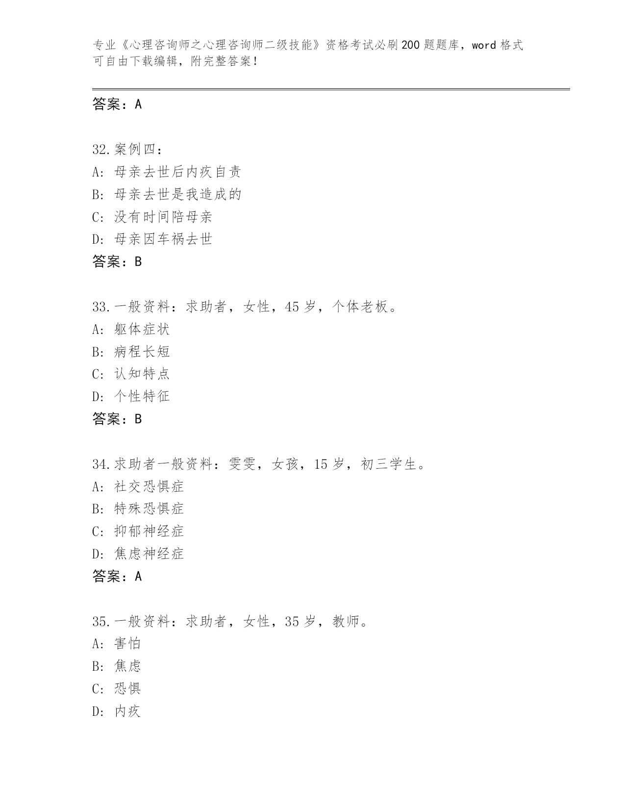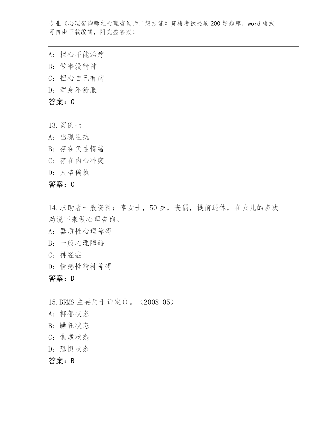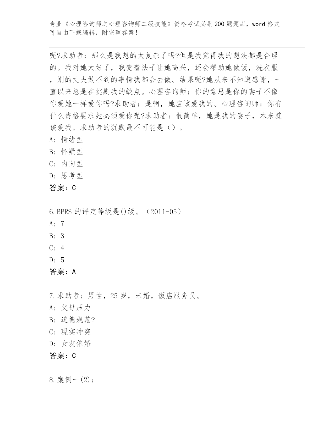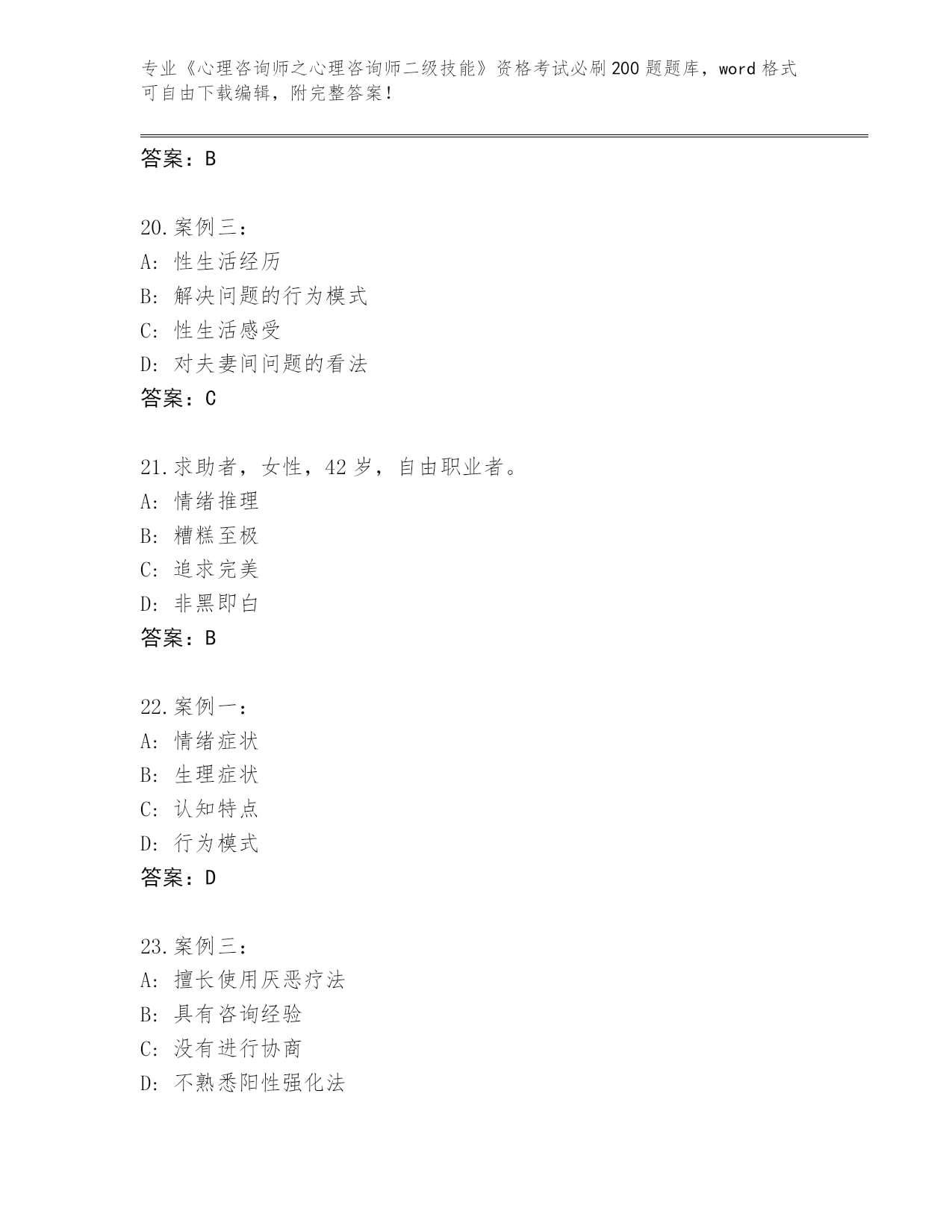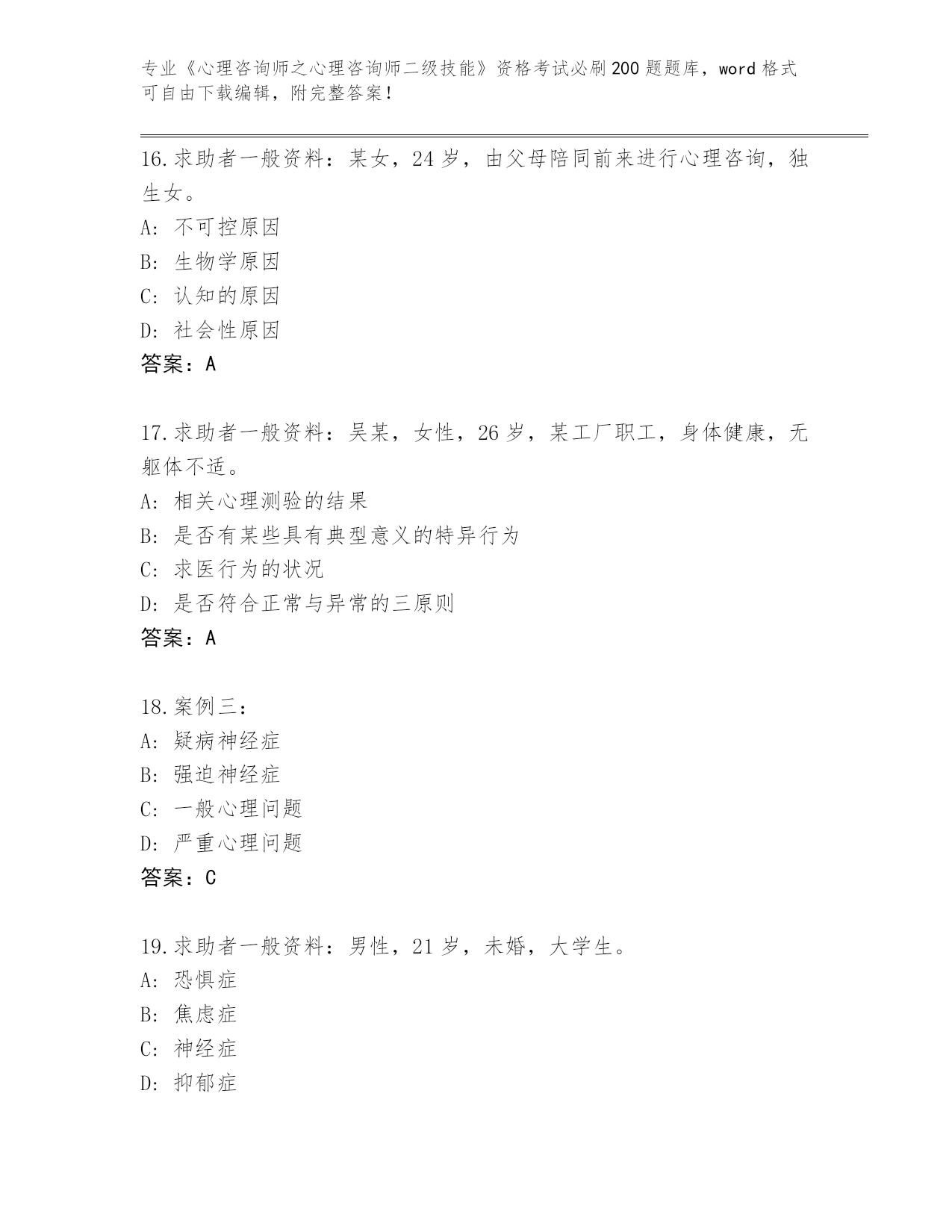 完整版陕西省眉县《心理咨询师之心理咨询师二级技能》考试必刷200题真题题库答案下载