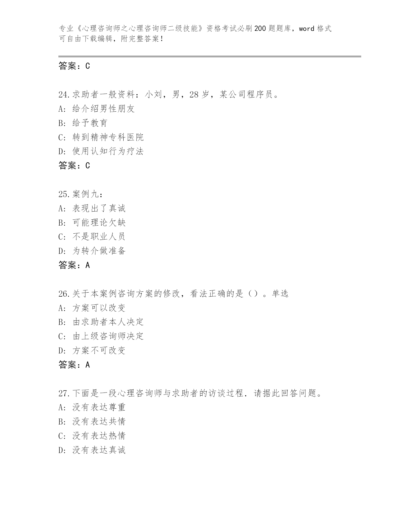 湖北省2024《心理咨询师之心理咨询师二级技能》考试必刷200题真题及答案下载