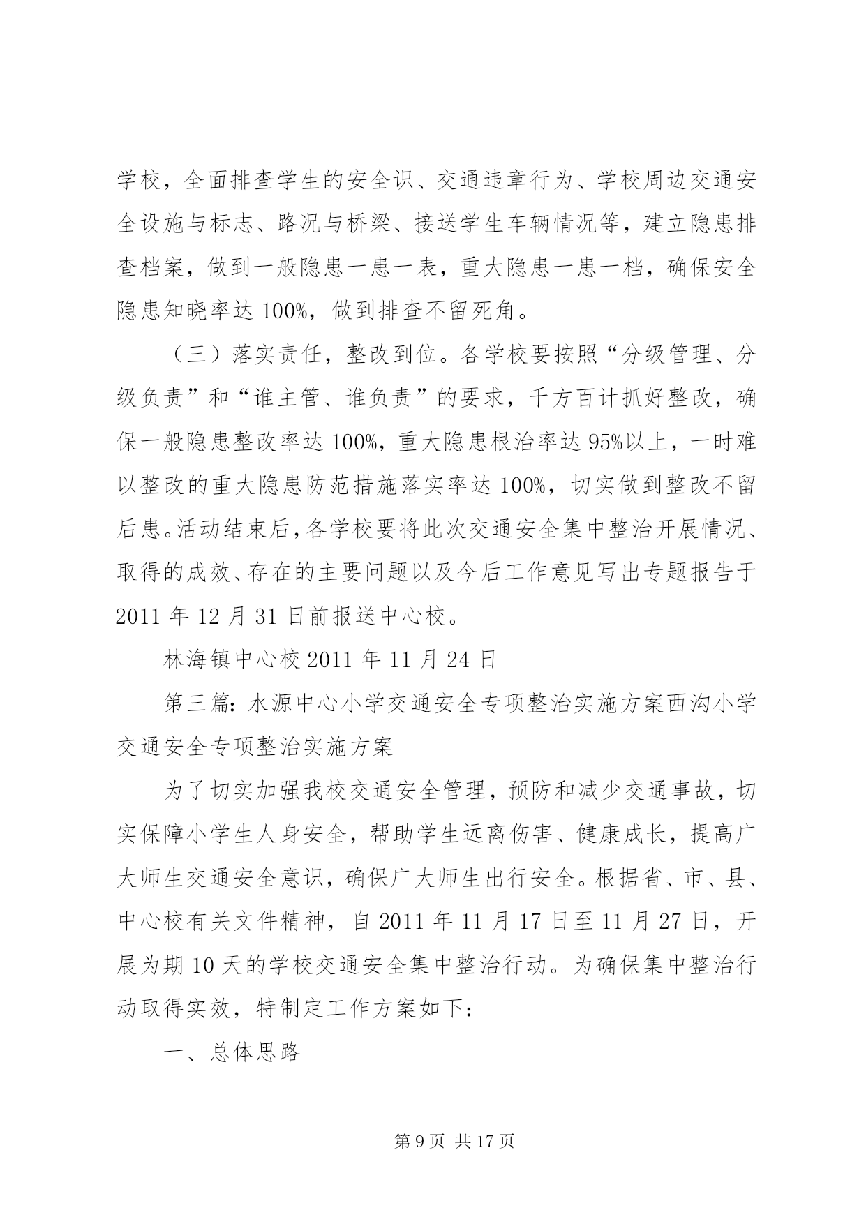 第PAGE\*Arabic\*MERGEFORMAT17页共NUMPAGES\*MERGEFORMAT17页小学交通安全整治实施方案一、立即开展学生上下学乘车安全情况大排查、大整改。从周一开始,学校由甄东升校长带领,班主任具体负责开展了学生上下学各类乘车安全情况进行排查。对学生上下学乘车情况进行全面检查了解,对存在安全隐患的超员、超速车辆,三轮车、拖拉机等无安全保障的问题车辆,召开相关责任人会议,及时消除安全隐患。二、立即集中进行一次家长及接送学生车辆驾驶员交通安全教育。一立即召开乘坐车辆上下学学生家长会。对学生家长开展一次学生乘车安全教育,教育家长时刻关注孩子乘车安全,教育要求家长坚决不让孩子乘坐超员、超速、酒后驾驶车辆,不乘坐三轮车、拖拉机等无安全保障的问题车辆。再次落实乘坐车辆学生家长(监护人)交通安全承诺责任书签字活动,举行签名仪式,进一步增强家长的交通安全意识和责任。二立即召开学生主题班会,进一步加强对学生的安全教育宣传活动,要求学生坚决不乘坐超员、超速、酒后驾驶车辆,三轮车、拖拉机等无安全保障的问题车辆。三、严格落实学校对交通安全管理责任。学校从管好学生、教育家长入手做好工作。安排老师负责对接送学生车辆每天每次运载学生的情况、车况及安全性能进行查验,发现超员或其他交通违法行为,坚决不让学生乘坐,并通知家长及时解决问题。四、制定极端天气应对方案。学校根据要求制定了应对极端天气交通安全措施,防范冬季大雾、降雪及路面结冰对学生上下学交通安全的不利影响。明确驾驶人员按照雪、雾天气安全驾驶要求,使之时刻牢记安全第一,严禁超载、超速,确保交通安全。在学生交通安全专项整治活动期间,由学校安全工作领导小组负责,加大对接送学生车辆的督查整治力度,一旦发现接送学生的超员、超速、酒后驾驶及存在安全隐患车辆,立即向相关部门进行举报。朱家庄小学2012.10.17第二篇:交通安全专项整治实施方案林海镇中心校交通安全专项整治实施方案为切实加强交通安全管理,提高广大师生的交通安全法治意识、安全意识、文明意识,进一步有效预防和减少交通事故,特别是重特大交通事故,保障交通安全有序畅通和人民群众生命财产安全,根据县XX县区教育局《关于加强中小学、幼儿园上下学乘车安全工作的通知》(梨教字【2011】77号)精神,经研究决定从11月22日开始,至12月30日,在全镇小学范围内开展交通安全专项整治活动。现制定如下实施方案:一、目标任务按照“统一领导、部门协作、齐抓共管、综合治理”的道路交通安全管理工作格局,将交通安全纳入本系统常规管理;经常性地对学生和教职员工进行交通安全教育,提高他们的交通安全意识;交通安全责任制得到有效落实,建立健全长效管理机制,形成交通安全综合治理格局;全镇小学、幼儿园交通安全隐患得到根本性治理,交通安全条件充分改善;师生、家长及驾驶人员交通安全意识得到普遍增强;学生接送车辆超员、超速问题得到有效遏制;杜绝拖拉机、三轮车、农用车、载货车、报废车接送学生以及酒后驾驶和严重违规接送学生;学生接送车辆实现制度化、规范化管理。有效减少学生和教职员工的交通事故;杜绝重特大交通事故。二、工作步骤(一)成立组织,宣传发动阶段(11月22日——11月25日)各学校要坚持“预防为主、标本兼治、强化主体、综合治理”的工作思路,成立交通安全集中整治行动领导小组,负责本校区道路交通安全集中整治工作。充分利用标语、横幅、板报、公开信等多种形式,大力宣传交通安全专项整治行动,营造浓厚的氛围,做到人人知晓,个个参与。(二)调查摸底,排查隐患阶段(11月28日——12月2日)各学校对本校区交通安全隐患进行拉网式排查,并建立隐患排查档案。着重排查以下几种情况:1、有无12周岁以下学生骑自行车情况;2、有无16周岁以下学生骑电动自行车情况;3、有无学生交通违章情况;4、教职工骑机动车情况,有无违章,特别是酒后驾车,不戴头盔等现象;5、单位自备车的驾驶员交通安全责任落实情况;6、学校门前交通安全设施情况;7、特别要充分依靠公安交巡警、交通、农机等部门,共同对接送学生车辆情况进行排查,掌握接送学生的机动车辆手续审查、定期检测、驾驶人员资质、乘坐机动车辆学生等相关情况。(三)制定措施,集中整治阶段(12月5日——12月9日)各学校要针对排查出来的交通安全隐患,实行分级负责、逐一整改,做到责任、措施、时间、预案“四落实”,确保安全无事故,创建交通安全示范学校。1、健全组织,明确职责。各学校要结合这次交通安全集中整治活动,完善安全组织,形成安全管理网络。“一把手”作为单位安全第一责任人,要充分认识交通安全管理的意义、措施和要求,迅速建立交通安全集中整治行动领导小组,制定方案,合理分工,明确职责,展开工作,严格落实。2、大力宣传,强化意识。各学校要针对排查