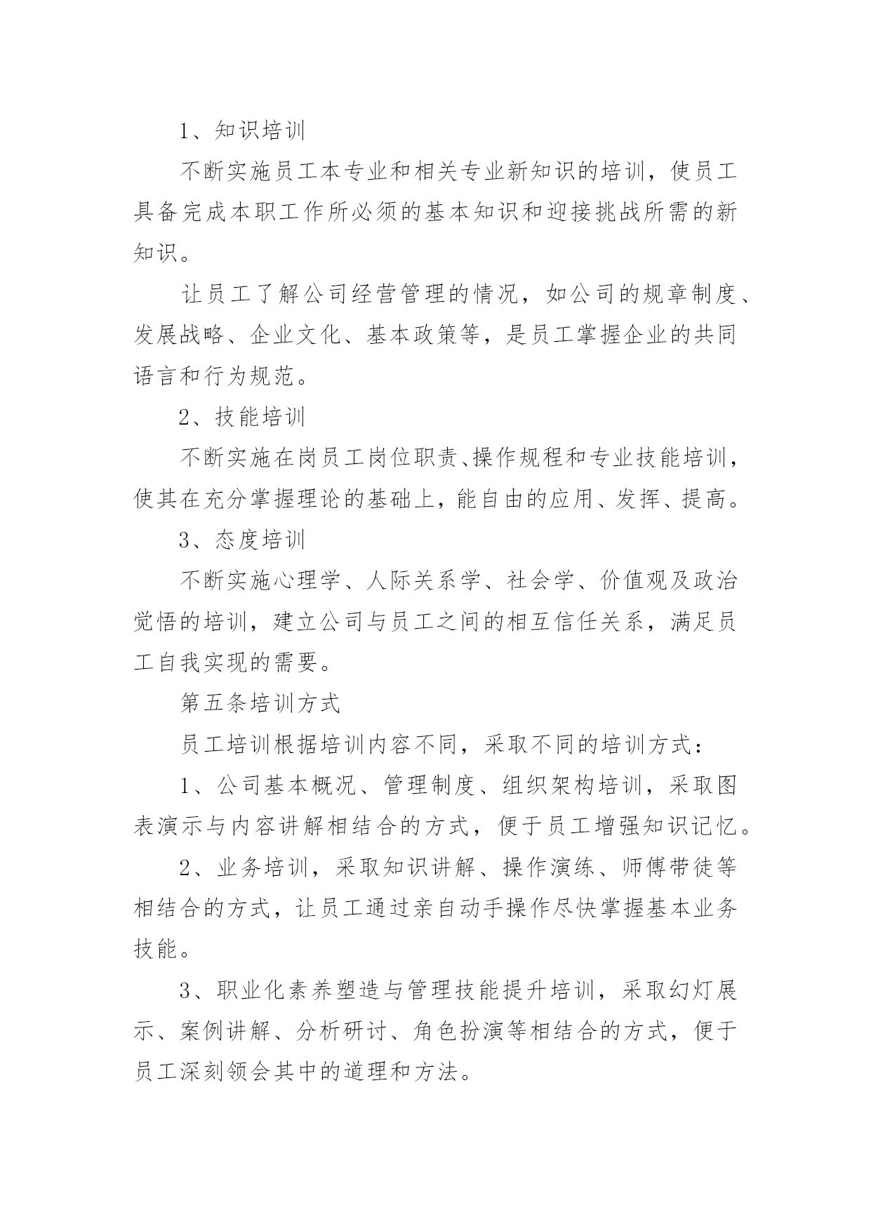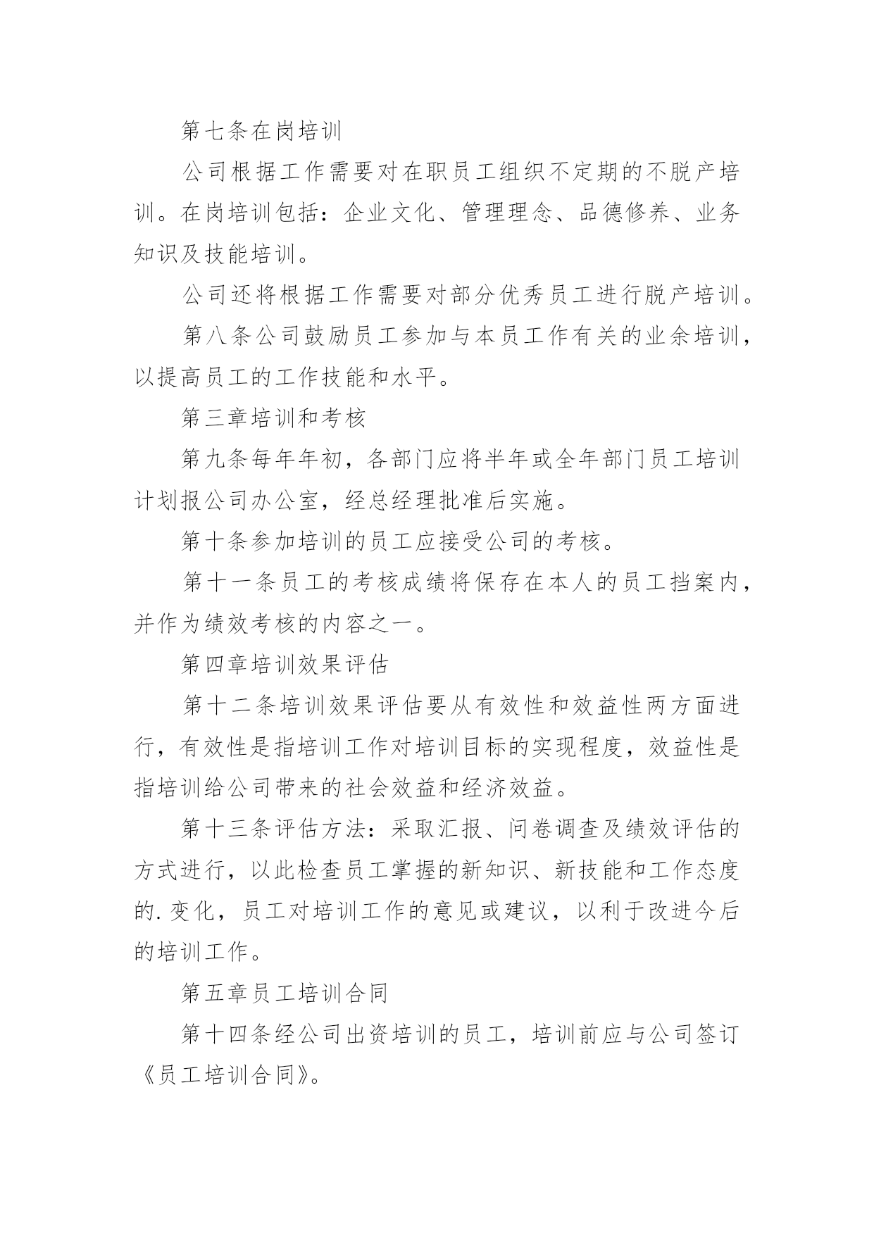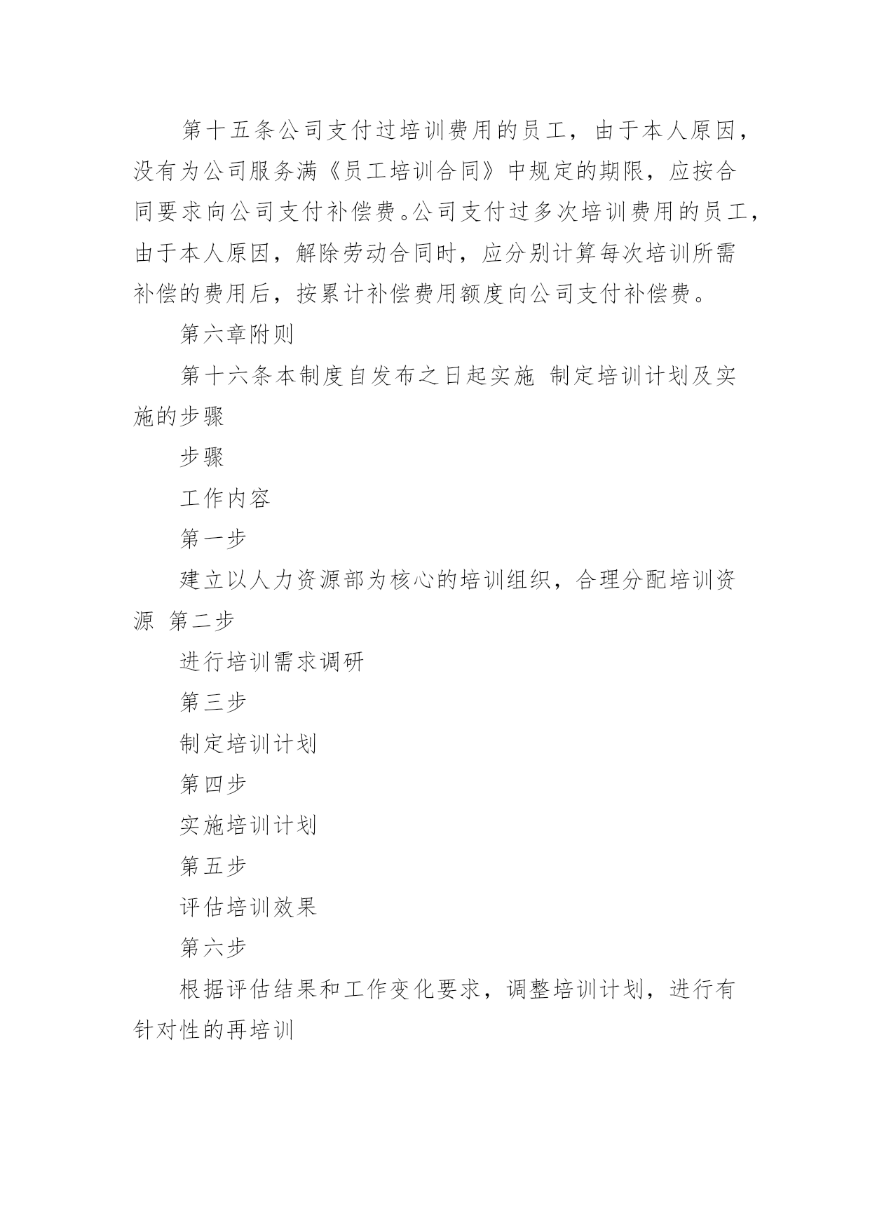 员工培训的规章制度在现实社会中,制度使用的情况越来越多,制度具有使我们知道,应该做什么,不应该做什么,惩恶扬善、维护公平的作用。那么什么样的制度才是有效的呢?下面是小编收集整理的员工培训的规章制度,希望对大家有所帮助。员工培训的规章制度1第一章总则第一条为满足公司发展需要,提高员工思想观念、道德品质、业务知识和工作技能,充分发挥员工潜力,不断为公司培养输送德才兼备的优秀人才,特制定本制度。第二条培训内容应与员工本岗位工作密切相关。第三条自学与公司有组织培训相结合,培训与考核相结合,因地制宜,注重效果。第二章培训内容和形式第四条培训内容包括:企业文化、管理理念、品德修养、业务知识及技能培训。培训形式:听讲座、学习分析资料、讨论、录音、录像播放、示范演练、图片展览、实地参观、案例研究、会议、上岗实习、拓展训练等。企业文化培训包括:一、公司的基本情况:公司的发展史;公司的核心价值观;公司的发展战略、经营规划及公司经营状况;二、公司的机构设置、人员配备及职责范围;三、公司的各项管理制度;四、公司的各项行政管理和业务工作程序。管理理念培训包括:一、现代管理知识和管理理念;二、成功企业及成功人物的先进经验;三、当今国内外同行业先进的学术科技成果。品德修养培训包括:一、礼仪知识(服饰、形体、待人接物);二、心理素质(心理承受能力和观察、判断、解决问题的能力);三、品德素质(责任感、工作态度)。业务知识及技能培训包括:一、公司业务涉及到的专业知识及相关知识;二、公司业务所涉及专业的发展前景及预测;三、当今国内外同行业相关的先进学术成果;四、专业技能。第五条培训形式分为岗前培训、在岗培训两种。在岗培训分为脱产培训和不脱产培训两种。第六条岗前培训一、被公司录取试用的员工上岗前必须接受公司组织的岗前培训;二、岗前培训包括企业文化培训和业务知识及技能培训两部分。第七条在岗培训公司根据工作需要对在职员工组织不定期的不脱产培训。在岗培训包括:企业文化、管理理念、品德修养、业务知识及技能培训。公司还将根据工作需要对部分优秀员工进行脱产培训。第八条公司鼓励员工参加与本员工作有关的业余培训,以提高员工的工作技能和水平。第三章培训和考核第九条每年年初,各部门应将半年或全年部门员工培训计划报公司办公室,经总经理批准后实施。第十条参加培训的员工应接受公司的考核。第十一条员工的考核成绩将保存在本人的员工挡案内,并作为绩效考核的内容之一。第四章培训效果评估第十二条培训效果评估要从有效性和效益性两方面进行,有效性是指培训工作对培训目标的实现程度,效益性是指培训给公司带来的社会效益和经济效益。第十三条评估方法:采取汇报、问卷调查及绩效评估的方式进行,以此检查员工掌握的新知识、新技能和工作态度的.变化,员工对培训工作的意见或建议,以利于改进今后的培训工作。第五章员工培训合同第十四条经公司出资培训的员工,培训前应与公司签订《员工培训合同》。第十五条公司支付过培训费用的员工,由于本人原因,没有为公司服务满《员工培训合同》中规定的期限,应按合同要求向公司支付补偿费。公司支付过多次培训费用的员工,由于本人原因,解除劳动合同时,应分别计算每次培训所需补偿的费用后,按累计补偿费用额度向公司支付补偿费。第六章附则第十六条本制度自发布之日起实施制定培训计划及实施的步骤步骤工作内容第一步建立以人力资源部为核心的培训组织,合理分配培训资源第二步进行培训需求调研第三步制定培训计划第四步实施培训计划第五步评估培训效果第六步根据评估结果和工作变化要求,调整培训计划,进行有针对性的再培训员工培训的规章制度2第一条培训目的1、配合公司的发展目标、业务方向,通过培训提高团队竞争力、战斗力,满足企业战略发展的需要;2、使员工不断适应公司发展,并且满足员工个人能力经验提升的需求,使员工达成个人发展目标;3、加强对公司培训工作的组织领导,规范培训管理,提高培训质量,在竞争中保持人力资源优势。第二条原则和政策1、公司培训按照“有效、实用、针对”的原则,采取人员分层化、方法多样化、内容丰富化的培训政策。1)有效性原则:员工培训后能达到培训的目的:学到某方面的知识、提升某方面的技能或养成某方面的习惯;2)实用性原则:员工通过培训掌握的知识或提升的技能能用于实际工作中,有效提高工作效率;3)针对性原则:根据性质不同对岗位分层分类,实行侧重点不同、内容不同、方式不同的针对性强的培训2、员工的`专业化培训和脱产外出培训坚持“机会均等、公平竞争”的原则,员工通过突出的业绩和工作表现获得激励性培训和发展机会。第三条适用范围本制度适用于公司所有正式员工。第四条培训内容培训内容包括知识培训、技能培训和态度培训。1、知识培训不断实施员工本专业和相关专业新知识的培训,使员工具备完成本职工作所必须的基本知识和迎接挑战所需的新知识。让员