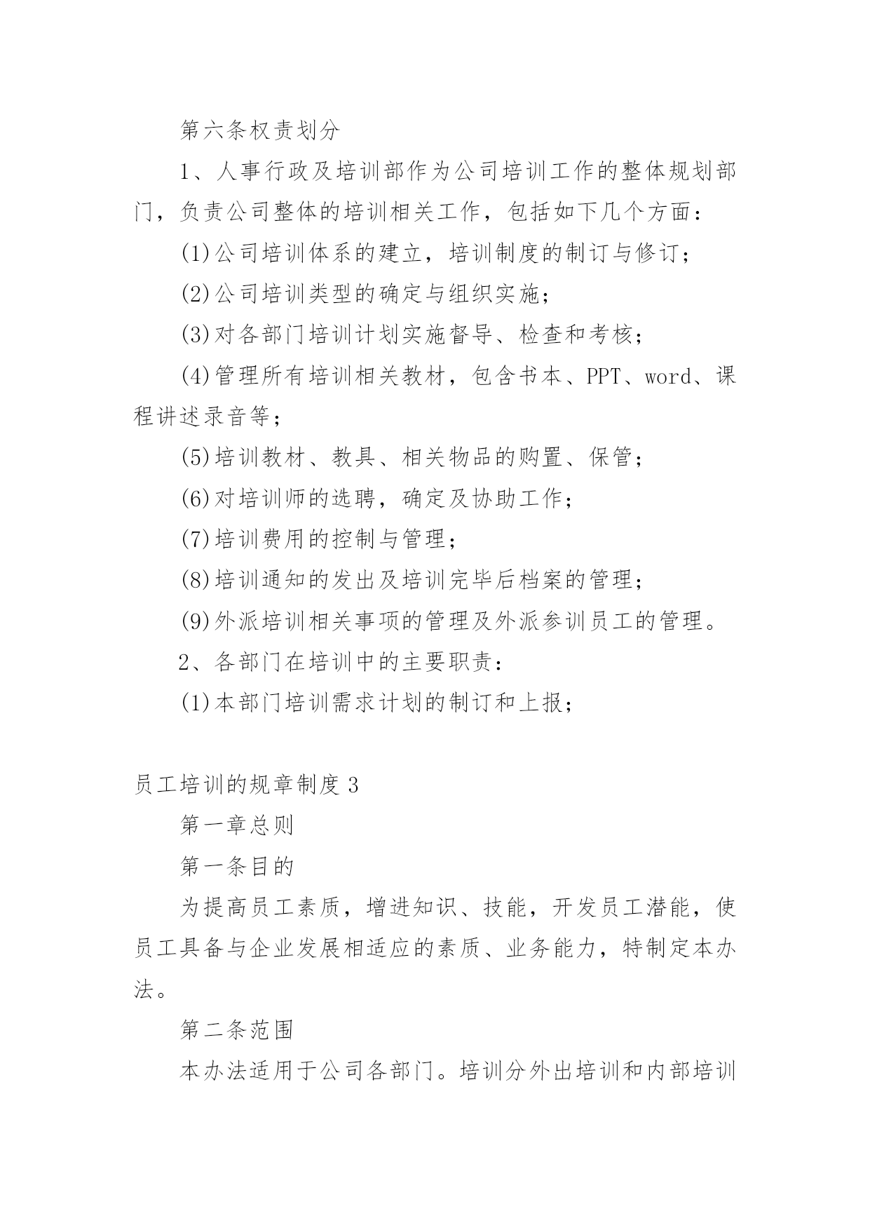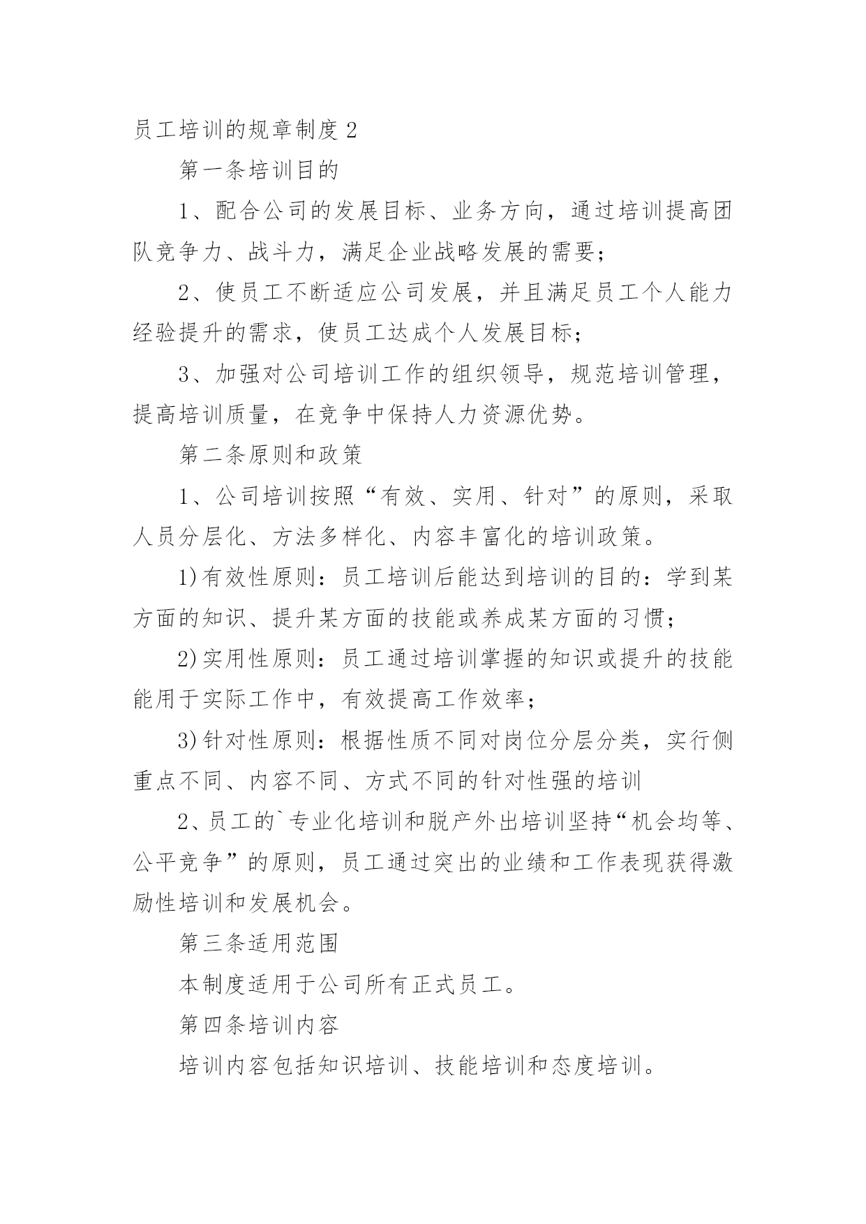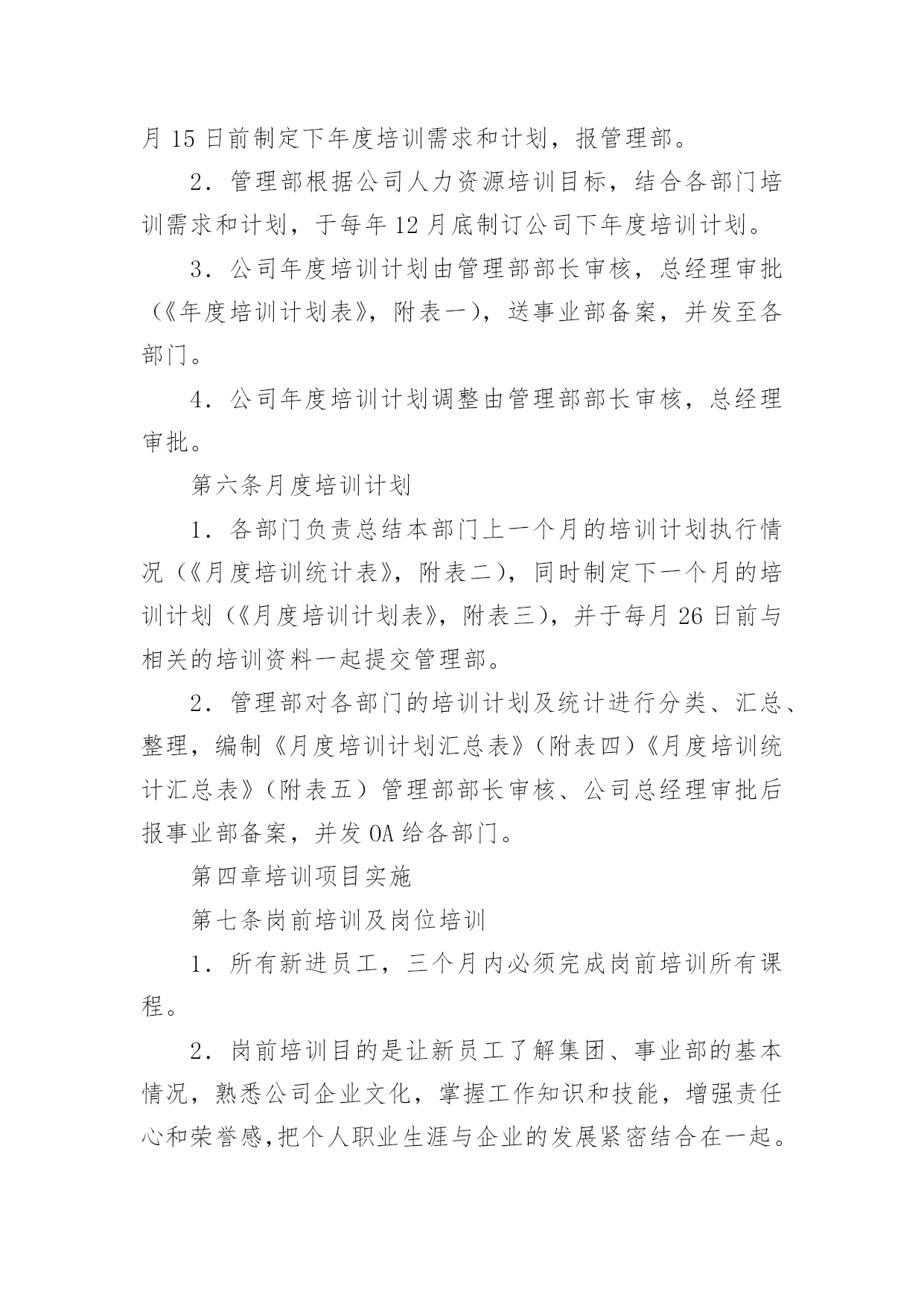 员工培训的规章制度在现实社会中,制度使用的情况越来越多,制度具有使我们知道,应该做什么,不应该做什么,惩恶扬善、维护公平的作用。那么什么样的制度才是有效的呢?下面是小编收集整理的员工培训的规章制度,希望对大家有所帮助。员工培训的规章制度1第一章总则第一条为满足公司发展需要,提高员工思想观念、道德品质、业务知识和工作技能,充分发挥员工潜力,不断为公司培养输送德才兼备的优秀人才,特制定本制度。第二条培训内容应与员工本岗位工作密切相关。第三条自学与公司有组织培训相结合,培训与考核相结合,因地制宜,注重效果。第二章培训内容和形式第四条培训内容包括:企业文化、管理理念、品德修养、业务知识及技能培训。培训形式:听讲座、学习分析资料、讨论、录音、录像播放、示范演练、图片展览、实地参观、案例研究、会议、上岗实习、拓展训练等。企业文化培训包括:一、公司的基本情况:公司的发展史;公司的核心价值观;公司的发展战略、经营规划及公司经营状况;二、公司的机构设置、人员配备及职责范围;三、公司的各项管理制度;四、公司的各项行政管理和业务工作程序。管理理念培训包括:一、现代管理知识和管理理念;二、成功企业及成功人物的先进经验;三、当今国内外同行业先进的学术科技成果。品德修养培训包括:一、礼仪知识(服饰、形体、待人接物);二、心理素质(心理承受能力和观察、判断、解决问题的能力);三、品德素质(责任感、工作态度)。业务知识及技能培训包括:一、公司业务涉及到的专业知识及相关知识;二、公司业务所涉及专业的发展前景及预测;三、当今国内外同行业相关的先进学术成果;四、专业技能。第五条培训形式分为岗前培训、在岗培训两种。在岗培训分为脱产培训和不脱产培训两种。第六条岗前培训一、被公司录取试用的员工上岗前必须接受公司组织的岗前培训;二、岗前培训包括企业文化培训和业务知识及技能培训两部分。第七条在岗培训公司根据工作需要对在职员工组织不定期的不脱产培训。在岗培训包括:企业文化、管理理念、品德修养、业务知识及技能培训。公司还将根据工作需要对部分优秀员工进行脱产培训。第八条公司鼓励员工参加与本员工作有关的业余培训,以提高员工的工作技能和水平。第三章培训和考核第九条每年年初,各部门应将半年或全年部门员工培训计划报公司办公室,经总经理批准后实施。第十条参加培训的员工应接受公司的考核。第十一条员工的考核成绩将保存在本人的员工挡案内,并作为绩效考核的内容之一。第四章培训效果评估第十二条培训效果评估要从有效性和效益性两方面进行,有效性是指培训工作对培训目标的实现程度,效益性是指培训给公司带来的社会效益和经济效益。第十三条评估方法:采取汇报、问卷调查及绩效评估的方式进行,以此检查员工掌握的新知识、新技能和工作态度的.变化,员工对培训工作的意见或建议,以利于改进今后的培训工作。第五章员工培训合同第十四条经公司出资培训的员工,培训前应与公司签订《员工培训合同》。第十五条公司支付过培训费用的员工,由于本人原因,没有为公司服务满《员工培训合同》中规定的期限,应按合同要求向公司支付补偿费。公司支付过多次培训费用的员工,由于本人原因,解除劳动合同时,应分别计算每次培训所需补偿的费用后,按累计补偿费用额度向公司支付补偿费。第六章附则第十六条本制度自发布之日起实施制定培训计划及实施的步骤步骤工作内容第一步建立以人力资源部为核心的培训组织,合理分配培训资源第二步进行培训需求调研第三步制定培训计划第四步实施培训计划第五步评估培训效果第六步根据评估结果和工作变化要求,调整培训计划,进行有针对性的再培训员工培训的规章制度2第一条培训目的1、配合公司的发展目标、业务方向,通过培训提高团队竞争力、战斗力,满足企业战略发展的需要;2、使员工不断适应公司发展,并且满足员工个人能力经验提升的需求,使员工达成个人发展目标;3、加强对公司培训工作的组织领导,规范培训管理,提高培训质量,在竞争中保持人力资源优势。第二条原则和政策1、公司培训按照“有效、实用、针对”的原则,采取人员分层化、方法多样化、内容丰富化的培训政策。1)有效性原则:员工培训后能达到培训的目的:学到某方面的知识、提升某方面的技能或养成某方面的习惯;2)实用性原则:员工通过培训掌握的知识或提升的技能能用于实际工作中,有效提高工作效率;3)针对性原则:根据性质不同对岗位分层分类,实行侧重点不同、内容不同、方式不同的针对性强的培训2、员工的`专业化培训和脱产外出培训坚持“机会均等、公平竞争”的原则,员工通过突出的业绩和工作表现获得激励性培训和发展机会。第三条适用范围本制度适用于公司所有正式员工。第四条培训内容培训内容包括知识培训、技能培训和态度培训。1、知识培训不断实施员工本专业和相关专业新知识的培训,使员工具备完成本职工作所必须的基本知识和迎接挑战所需的新知识。让员