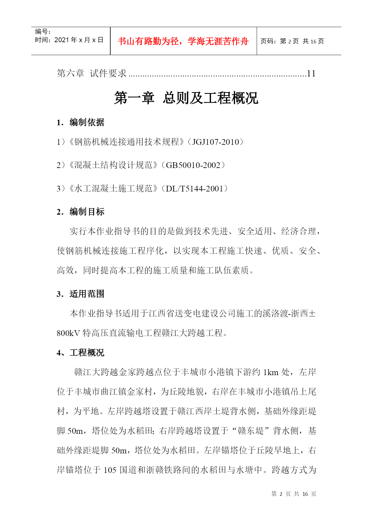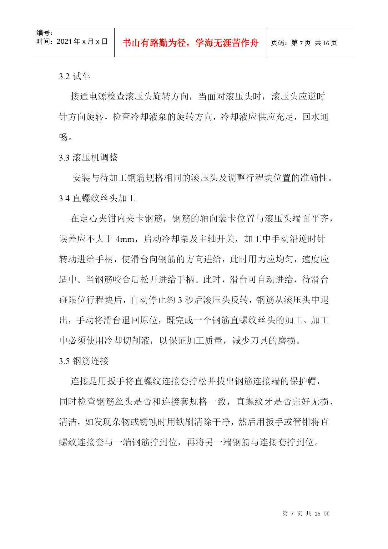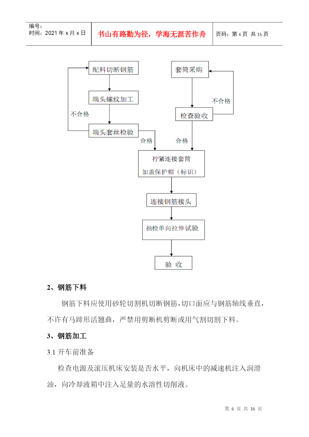 编号:时间:2021年x月x日书山有路勤为径,学海无涯苦作舟页码:第PAGE15页共NUMPAGES16页第PAGE\*MERGEFORMAT15页共NUMPAGES\*MERGEFORMAT16页目录TOC\o"1-3"\h\z\u第一章总则及工程概况21.编制依据22.编制目标23.适用范围24、工程概况2第二章钢筋机械连接工艺介绍31、钢筋机械连接施工简介32、人员要求33、原材要求3第三章钢筋机械连接操作步骤51.、钢筋连接流程图52、钢筋下料53、钢筋加工5第四章钢筋机械连接质量要求71、钢筋接头加工质量要求72、钢筋丝头加工质量要求73、套筒质量要求84、钢筋接头的安装质量要求85、套筒挤压钢筋接头的安装质量要求9第五章钢筋机械连接安全及环保要求10第六章试件要求11第一章总则及工程概况1.编制依据1)《钢筋机械连接通用技术规程》(JGJ107-2010)2)《混凝土结构设计规范》(GB50010-2002)3)《水工混凝土施工规范》(DL/T5144-2001)2.编制目标实行本作业指导书的目的是做到技术先进、安全适用、经济合理,使钢筋机械连接施工程序化,以实现本工程施工快速、优质、安全、高效,同时提高本工程的施工质量和施工队伍素质。3.适用范围本作业指导书适用于江西省送变电建设公司施工的溪洛渡-浙西±800kV特高压直流输电工程赣江大跨越工程。4、工程概况赣江大跨越金家跨越点位于丰城市小港镇下游约1km处,左岸位于丰城市曲江镇金家村,为丘陵地貌,右岸在丰城市小港镇吊上尾村,为平地。左岸跨越塔设置于赣江西岸土堤背水侧,基础外缘距堤脚50m,塔位处为水稻田;右岸跨越塔设置于“赣东堤”背水侧,基础外缘距堤脚50m,塔位处为水稻田。左岸锚塔位于丘陵旱地上,右岸锚塔位于105国道和浙赣铁路间的水稻田与水塘中。跨越方式为“耐-直-直-耐”,档距分布为“470m-1476m-500m”,铁塔呼高为“39m-163m-163m-39m”。第二章钢筋机械连接工艺介绍1、钢筋机械连接施工简介机械连接是通过钢筋与连接件的机械咬合作用或钢筋端面的承压作用,将一根钢筋中的力传递至另一根钢筋的连接方法。本工程使用的机械连接接头的类型是套筒连连接式:通过机械力使连接件钢套筒与带肋钢筋紧密咬台形成的接头;2、人员要求加工钢筋技术人员必须按该技术交底进行培训,经考核合格后方可进行上岗操作,人员应相对稳定。3、原材要求3.1、钢筋原材所有钢筋原材进场后,必须对到场钢筋的质量保证书、出厂合格证等进行复核,并按不同批次、规格、炉号及不同厂家的原材进行外观和物理性能的检测。(每批数量不得大于60t)。其中,外观检测,重点检查钢筋表面不得出现裂纹、结疤和折叠;表面的凸块和其他缺陷的深度和高度不得大于所在部位尺寸的偏差,并测量本批钢筋的直径偏差。对外观检查合格的每批钢筋中任选三根钢筋,对其母材质物理性能分别做拉伸和冷弯实验。实验合格之后才能使用。严禁使用不符合要求的原材。3.2、连接套(套筒)钢筋连接直螺纹套筒为定型产品。套筒母材质为45#钢。每批套筒进场时须核实其产品合格证,两端有保护套进行保护,经材料管理员复核合格后方可用于施工,钢筋直螺纹加工必须有检验记录。按照钢筋连接技术规程JGJ107-2010之相关要求,使用前分别对每种形式、级别、规格的连接接头进行型式检验。本工程桩基主筋采用衡水科源钢筋连接设备有限公司提供的设备及产品进行机械连接。经生产厂家所提供的产品检测报告,采用的套管规格如下:请材料加工部门按照以上表格进行开箱检测,如有不合格产品拒绝进入本工程使用。第三章钢筋机械连接操作步骤1.、钢筋连接流程图2、钢筋下料钢筋下料应使用砂轮切割机切断钢筋,切口面应与钢筋轴线垂直,不许有马蹄形活翘曲,严禁用剪断机剪断或用气割切割下料。3、钢筋加工3.1开车前准备检查电源及滚压机床安装是否水平,向机床中的减速机注入润滑油,向冷却液箱中注入足量的水溶性切削液。3.2试车接通电源检查滚压头旋转方向,当面对滚压头时,滚压头应逆时针方向旋转,检查冷却液泵的旋转方向,冷却液应供应充足,回水通畅。3.3滚压机调整安装与待加工钢筋规格相同的滚压头及调整行程块位置的准确性。3.4直螺纹丝头加工在定心夹钳内夹卡钢筋,钢筋的轴向装卡位置与滚压头端面平齐,误差应不大于4mm,启动冷却泵及主轴开关,加工中手动沿逆时针转动进给手柄,使滑台向钢筋的方向进给,此时用力应均匀,速度应适中。当钢筋咬合后松开进给手柄。此时,滑台可自动进给,待滑台碰限位行程块后,自动停止约3秒后滚压头反转