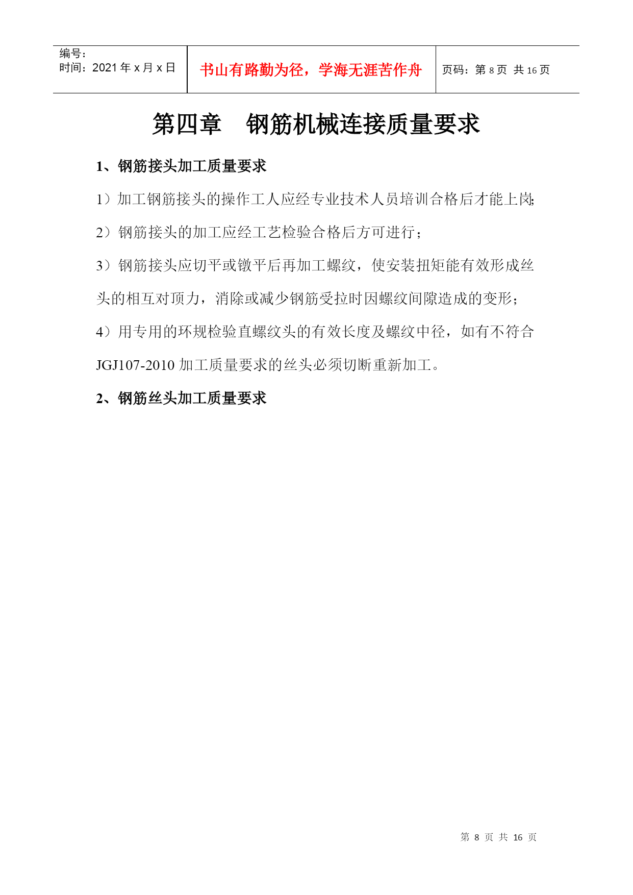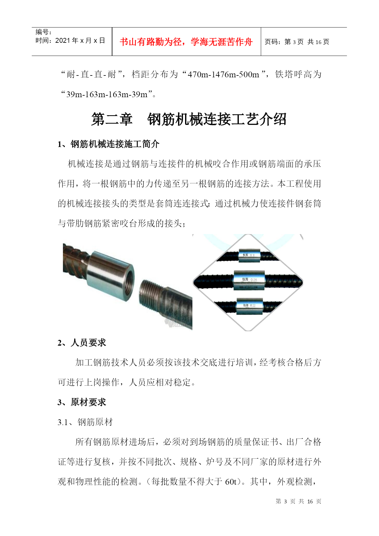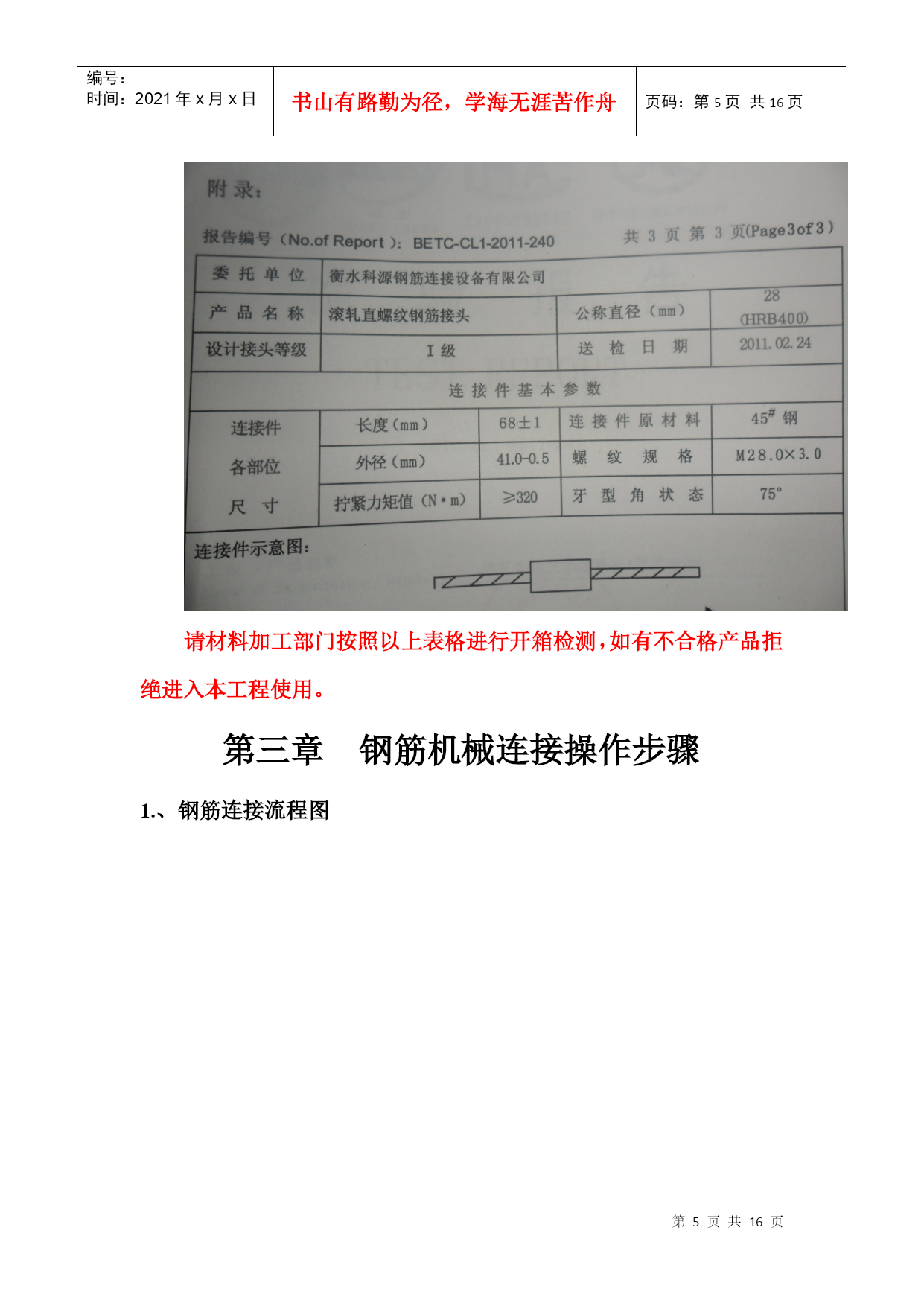 编号:时间:2021年x月x日书山有路勤为径,学海无涯苦作舟页码:第PAGE15页共NUMPAGES16页第PAGE\*MERGEFORMAT15页共NUMPAGES\*MERGEFORMAT16页目录TOC\o"1-3"\h\z\u第一章总则及工程概况21.编制依据22.编制目标23.适用范围24、工程概况2第二章钢筋机械连接工艺介绍31、钢筋机械连接施工简介32、人员要求33、原材要求3第三章钢筋机械连接操作步骤51.、钢筋连接流程图52、钢筋下料53、钢筋加工5第四章钢筋机械连接质量要求71、钢筋接头加工质量要求72、钢筋丝头加工质量要求73、套筒质量要求84、钢筋接头的安装质量要求85、套筒挤压钢筋接头的安装质量要求9第五章钢筋机械连接安全及环保要求10第六章试件要求11第一章总则及工程概况1.编制依据1)《钢筋机械连接通用技术规程》(JGJ107-2010)2)《混凝土结构设计规范》(GB50010-2002)3)《水工混凝土施工规范》(DL/T5144-2001)2.编制目标实行本作业指导书的目的是做到技术先进、安全适用、经济合理,使钢筋机械连接施工程序化,以实现本工程施工快速、优质、安全、高效,同时提高本工程的施工质量和施工队伍素质。3.适用范围本作业指导书适用于江西省送变电建设公司施工的溪洛渡-浙西±800kV特高压直流输电工程赣江大跨越工程。4、工程概况赣江大跨越金家跨越点位于丰城市小港镇下游约1km处,左岸位于丰城市曲江镇金家村,为丘陵地貌,右岸在丰城市小港镇吊上尾村,为平地。左岸跨越塔设置于赣江西岸土堤背水侧,基础外缘距堤脚50m,塔位处为水稻田;右岸跨越塔设置于“赣东堤”背水侧,基础外缘距堤脚50m,塔位处为水稻田。左岸锚塔位于丘陵旱地上,右岸锚塔位于105国道和浙赣铁路间的水稻田与水塘中。跨越方式为“耐-直-直-耐”,档距分布为“470m-1476m-500m”,铁塔呼高为“39m-163m-163m-39m”。第二章钢筋机械连接工艺介绍1、钢筋机械连接施工简介机械连接是通过钢筋与连接件的机械咬合作用或钢筋端面的承压作用,将一根钢筋中的力传递至另一根钢筋的连接方法。本工程使用的机械连接接头的类型是套筒连连接式:通过机械力使连接件钢套筒与带肋钢筋紧密咬台形成的接头;2、人员要求加工钢筋技术人员必须按该技术交底进行培训,经考核合格后方可进行上岗操作,人员应相对稳定。3、原材要求3.1、钢筋原材所有钢筋原材进场后,必须对到场钢筋的质量保证书、出厂合格证等进行复核,并按不同批次、规格、炉号及不同厂家的原材进行外观和物理性能的检测。(每批数量不得大于60t)。其中,外观检测,重点检查钢筋表面不得出现裂纹、结疤和折叠;表面的凸块和其他缺陷的深度和高度不得大于所在部位尺寸的偏差,并测量本批钢筋的直径偏差。对外观检查合格的每批钢筋中任选三根钢筋,对其母材质物理性能分别做拉伸和冷弯实验。实验合格之后才能使用。严禁使用不符合要求的原材。3.2、连接套(套筒)钢筋连接直螺纹套筒为定型产品。套筒母材质为45#钢。每批套筒进场时须核实其产品合格证,两端有保护套进行保护,经材料管理员复核合格后方可用于施工,钢筋直螺纹加工必须有检验记录。按照钢筋连接技术规程JGJ107-2010之相关要求,使用前分别对每种形式、级别、规格的连接接头进行型式检验。本工程桩基主筋采用衡水科源钢筋连接设备有限公司提供的设备及产品进行机械连接。经生产厂家所提供的产品检测报告,采用的套管规格如下:请材料加工部门按照以上表格进行开箱检测,如有不合格产品拒绝进入本工程使用。第三章钢筋机械连接操作步骤1.、钢筋连接流程图2、钢筋下料钢筋下料应使用砂轮切割机切断钢筋,切口面应与钢筋轴线垂直,不许有马蹄形活翘曲,严禁用剪断机剪断或用气割切割下料。3、钢筋加工3.1开车前准备检查电源及滚压机床安装是否水平,向机床中的减速机注入润滑油,向冷却液箱中注入足量的水溶性切削液。3.2试车接通电源检查滚压头旋转方向,当面对滚压头时,滚压头应逆时针方向旋转,检查冷却液泵的旋转方向,冷却液应供应充足,回水通畅。3.3滚压机调整安装与待加工钢筋规格相同的滚压头及调整行程块位置的准确性。3.4直螺纹丝头加工在定心夹钳内夹卡钢筋,钢筋的轴向装卡位置与滚压头端面平齐,误差应不大于4mm,启动冷却泵及主轴开关,加工中手动沿逆时针转动进给手柄,使滑台向钢筋的方向进给,此时用力应均匀,速度应适中。当钢筋咬合后松开进给手柄。此时,滑台可自动进给,待滑台碰限位行程块后,自动停止约3秒后滚压头反转