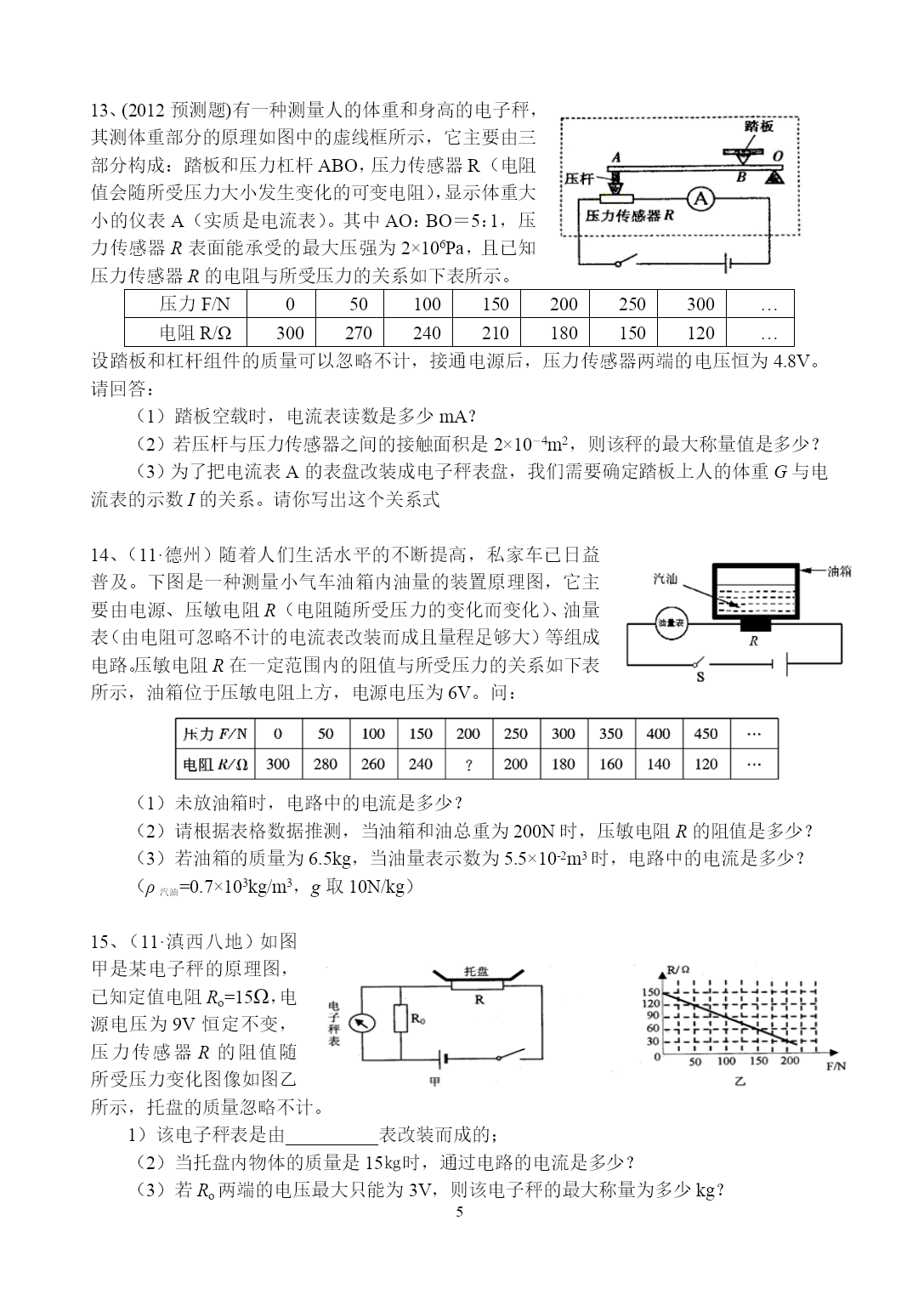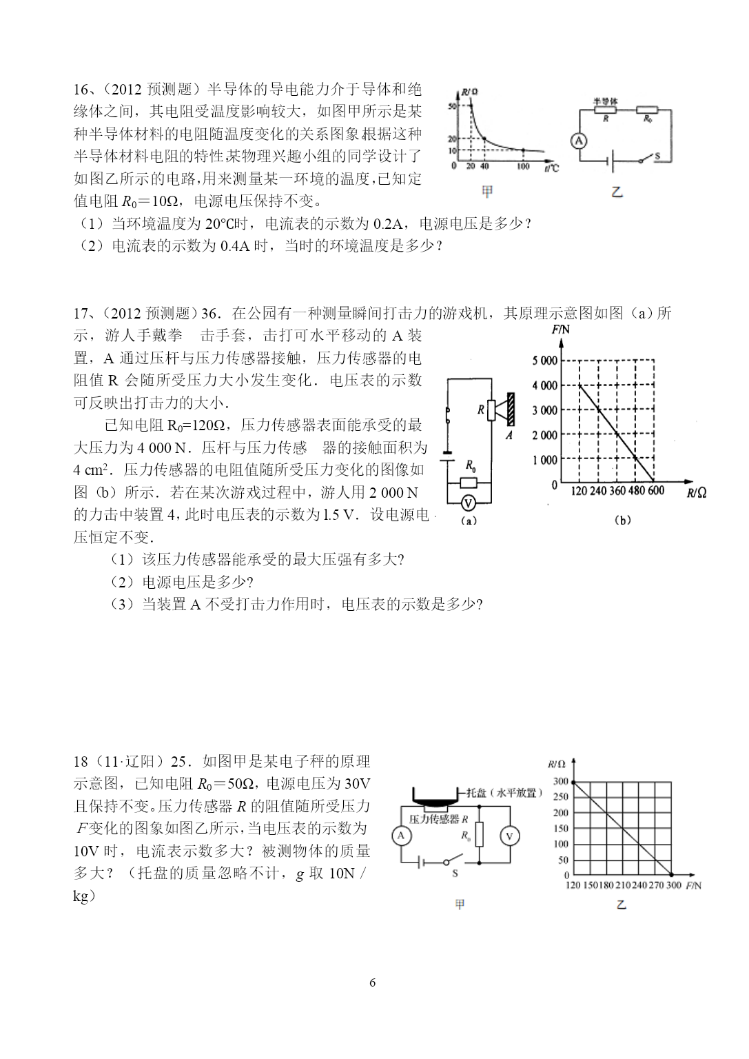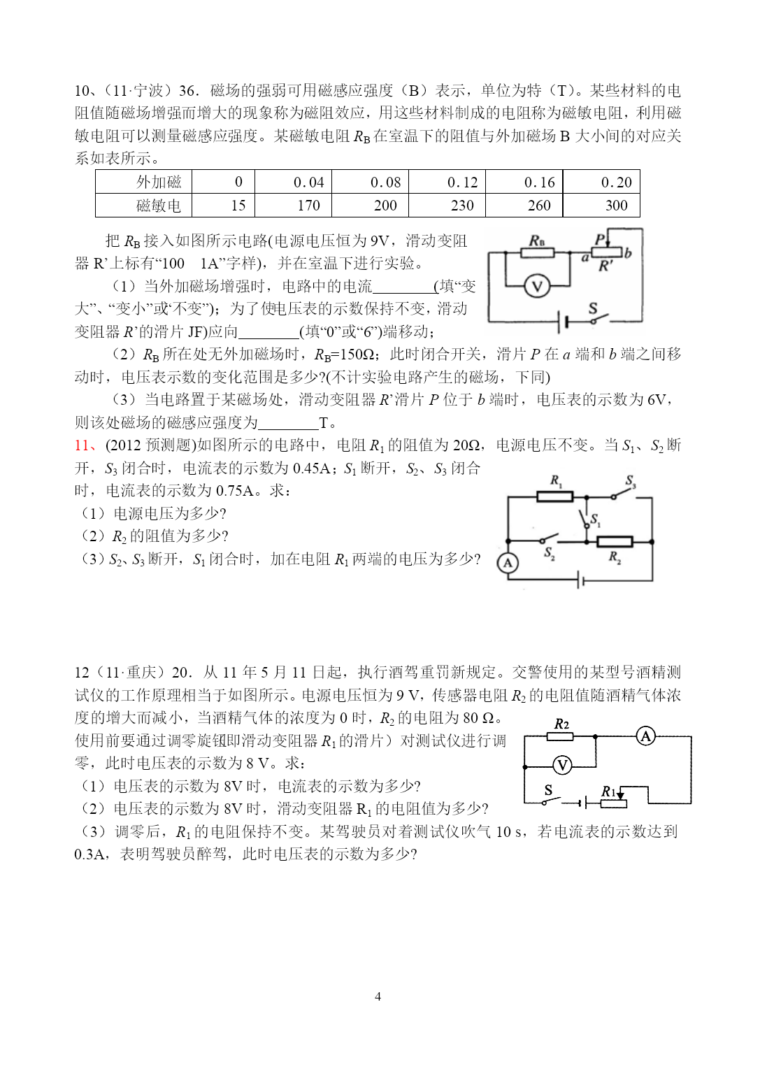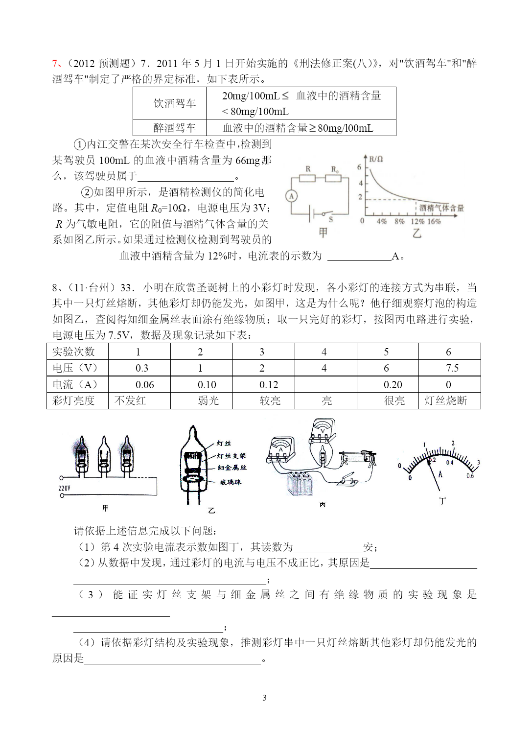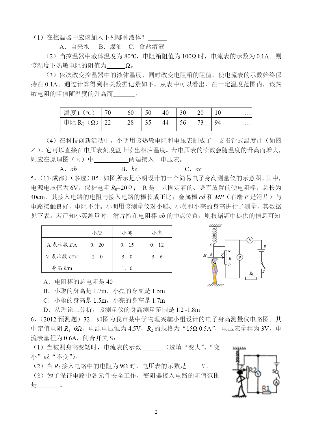 PAGEPAGE72012年科学中考复习——欧姆定律的综合应用1、(11·衡阳)12.如图所示,电源电压保持不变,闭合开关S1、S2,电压表示数为6V,电流表示数为0.6A,断开S2后,电压表示数变为2V,则R2的电阻和电源电压分别是A.10Ω、9VB.20Ω、6VC.20Ω、9VD.10Ω、6V2、(11·湖州)17.为了比较电阻R1和R2的大小,四位同学分别设计了如图所示的电路,其中不可行的是()3、(2012预测题)33.如图甲所示是小华同学设计的一种测定油箱内油量的装置,其中R0为定值电阻,R为压敏电阻,其阻值隧所受压力变化的图像如图乙所示.油量表由量程为0~3V的电压表改装而成。已知油箱重80N,压敏电阻R能够承受的最大压力为800N。电源电压保持6V不变.(g取10N/kg)(1)若压敏电阻与油箱的接触面积是4×10-4m2,则压敏电阻能承受的最大压强为多大?(2)若油箱内油的密度为0.8×103kg/m3,则此油箱最多可装多少立方米的油?(3)若压敏电阻受到最大压力时,电压表的示数达到最大值,则定值电阻R0的阻值为多大?(4)为了判断此油量表的刻度是否均匀,需了解R0两端电压U0与油量V的关系,请推导此关系式.4、(11·义乌)34.热敏电阻的阻值会随温度的改变而改变。小明同学用甲图所示的电路来探究热敏电阻RT的阻值与温度的关系。已知M为控温器,电源电压恒为12V,R为电阻箱(一种可以改变并读出阻值的变阻器)。(1)在控温器中应该加入下列哪种液体?A.自来水B.煤油C.食盐溶液(2)当控温器中液体温度为80℃,电阻箱阻值为100Ω时,电流表的示数为0.1A。则该温度下热敏电阻的阻值为Ω。(3)依次改变控温器中的液体温度,同时改变电阻箱的阻值,使电流表的示数始终保持在0.1A。通过计算得到相关数据记录如下。从表中可以看出,在一定温度范围内,该热敏电阻的阻值随温度的升高而。温度t(℃)70605040302010…电阻RT(Ω)22283544567394…(4)在科技创新活动中,小明用该热敏电阻和电压表制成了一支指针式温度计(如图乙)。它可以直接在电压表刻度盘上读出相应温度。若电压表的读数会随温度的升高而增大,则应在原理图(丙)中两端接入一电压表。A.abB.bcC.ac5、(11·成都)(多选)B5.如图所示是小明设计的一个简易电子身高测量仪的示意图。其中,电源电压恒为6V,保护电阻R0=20Ω;R是一只固定着的、竖直放置的硬电阻棒,总长为40cm,其接入电路的电阻与接入电路的棒长成正比;金属棒cd和MP(右端P是滑片)与电路接触良好,电阻不计。小明用该测量仪对小聪、小英和小亮的身高进行了测量,其数据见下表。若已知小英测量时,滑片恰在电阻棒ab的中点位置,则根据题中提供的信息可知小聪小英小亮A表示数I/A0.200.150.12V表示数U/V2.03.03.6身高h/m1.6A.电阻棒的总电阻是40B.小聪的身高是1.7m,小亮的身高是1.5mC.小聪的身高是1.5m,小亮的身高是1.7mD.从理论上分析,该测量仪的身高测量范围是1.2~1.8m6、(2012预测题)32.如图为我市某中学物理兴趣小组设计的电子身高测量仪电路图。其中定值电阻R1=6Ω,电源电压恒为4.5V,R2的规格为“15Ω0.5A”,电压表量程为3V,电流表量程为0.6A,闭合开关S:(1)当被测身高变矮时,电流表的示数_______(选填“变大”、“变小”或“不变”)。(2)当R2接入电路中的电阻为9Ω时,电压表的示数是_____V。(3)为了保证电路中各元件安全工作,变阻器接入电路的阻值范围是_______。7、(2012预测题)7.2011年5月1日开始实施的《刑法修正案(八)》,对"饮酒驾车"和"醉酒驾车"制定了严格的界定标准,如下表所示。饮酒驾车20mg/100mL血液中的酒精含量<80mg/100mL醉酒驾车血液中的酒精含量80mg/l00mL①内江交警在某次安全行车检查中,检测到某驾驶员100mL的血液中酒精含量为66mg,那么,该驾驶员属于。②如图甲所示,是酒精检测仪的简化电路。其中,定值电阻R0=10Ω,电源电压为3V;R为气敏电阻,它的阻值与酒精气体含量的关系如图乙所示。如果通过检测仪检测到驾驶员的血液中酒精含量为12%时,电流表的示数为A。8、(11·台州)33.小明在欣赏圣诞树上的小彩灯时发现,各小彩灯的连接方式为串联,当其中一只灯丝熔断,其他彩灯却仍能发光,如图甲,这是为什么呢?他仔细观察灯泡的构造如图乙,查阅得知细金属丝表面涂有绝缘物质;取一只完好的彩灯,按图丙电路进行实验,电源