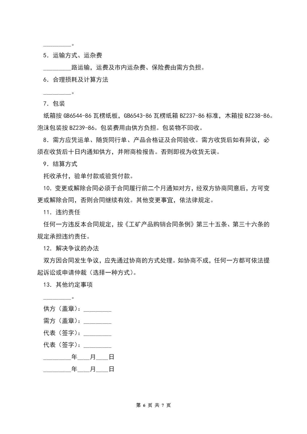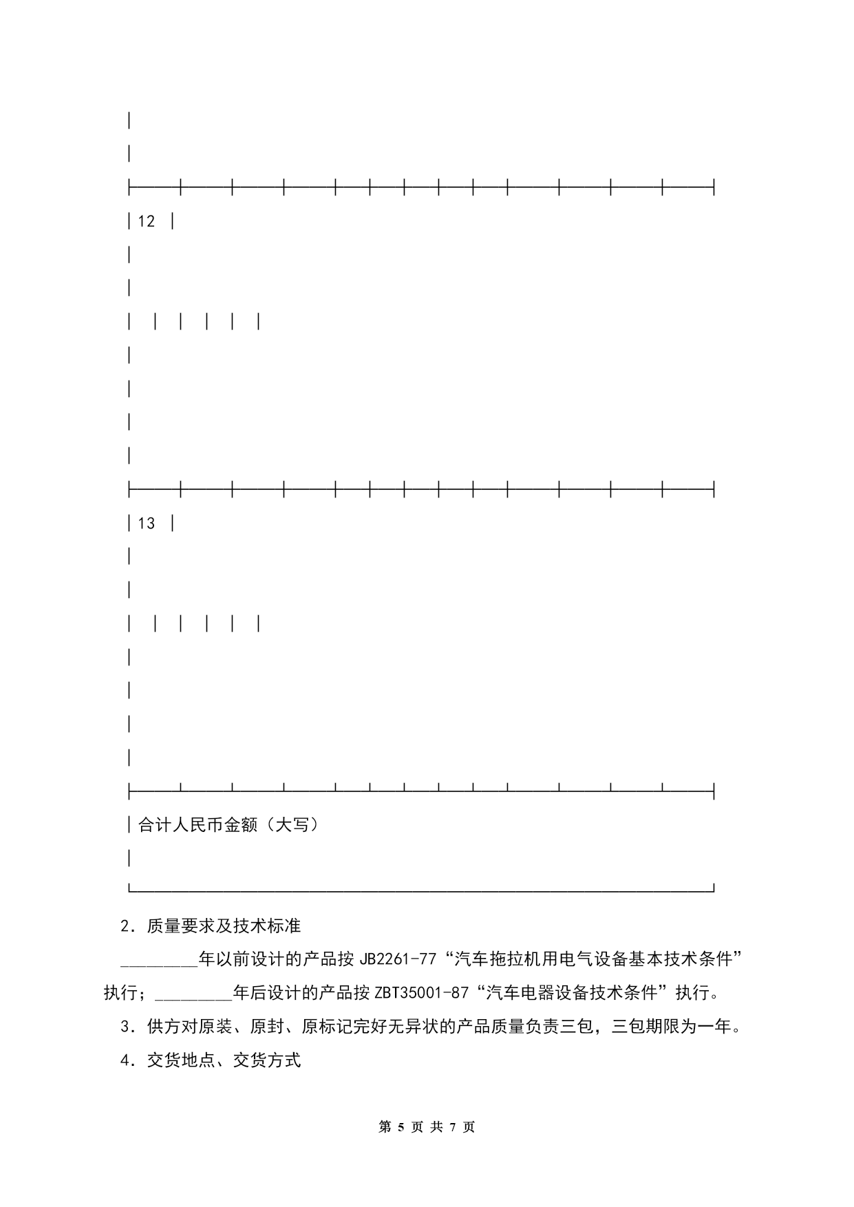 第PAGE\*MERGEFORMAT7页共NUMPAGES\*MERGEFORMAT7页汽车电机电器产品采购合同1.产品的规格、数量、价格┌──┬──┬──┬──┬─┬─┬─┬─┬─┬───────────┐│序││││牌│计││││交提货时间及数量│││产品│规格│适用│号│量│数│单│金├──┬──┬──┬──┤│号│名称│型号│车型│商│单│量│价│额│一季│二季│三季│四季││││││标│位││││度│度│度│度│├──┼──┼──┼──┼─┼─┼─┼─┼─┼──┼──┼──┼──┤│1│││││││││││││├──┼──┼──┼──┼─┼─┼─┼─┼─┼──┼──┼──┼──┤│2│││││││││││││├──┼──┼──┼──┼─┼─┼─┼─┼─┼──┼──┼──┼──┤│3│││││││││││││├──┼──┼──┼──┼─┼─┼─┼─┼─┼──┼──┼──┼──┤│4│││││││││││││├──┼──┼──┼──┼─┼─┼─┼─┼─┼──┼──┼──┼──┤│5│││││││││││││├──┼──┼──┼──┼─┼─┼─┼─┼─┼──┼──┼──┼──┤│6│││││││││││││├──┼──┼──┼──┼─┼─┼─┼─┼─┼──┼──┼──┼──┤│7│││││││││││││├──┼──┼──┼──┼─┼─┼─┼─┼─┼──┼──┼──┼──┤│8│││││││││││││├──┼──┼──┼──┼─┼─┼─┼─┼─┼──┼──┼──┼──┤│9│││││││││││││├──┼──┼──┼──┼─┼─┼─┼─┼─┼──┼──┼──┼──┤│10│││││││││││││├──┼──┼──┼──┼─┼─┼─┼─┼─┼──┼──┼──┼──┤│11│││││││││││││├──┼──┼──┼──┼─┼─┼─┼─┼─┼──┼──┼──┼──┤│12│││││││││││││├──┼──┼──┼──┼─┼─┼─┼─┼─┼──┼──┼──┼──┤│13│││││││││││││├──┴──┴──┴──┴─┴─┴─┴─┴─┴──┴──┴──┴──┤│合计人民币金额(大写)│└─────────────────────────────────┘2.质量要求及技术标准_________年以前设计的产品按JB2261-77“汽车拖拉机用电气设备基本技术条件”执行;_________年后设计的产品按ZBT35001-87“汽车电器设备技术条件”执行。3.供方对原装、原封、原标记完好无异状的产品质量负责三包,三包期限为一年。4.交货地点、交货方式_________。5.运输方式、运杂费_________路运输,运费及市内运杂费、保险费由需方负担。6.合理损耗及计算方法_________。7.包装纸箱按GB6544-86瓦楞纸板,GB6543-86瓦楞纸箱BZ237-86标准,木箱按BZ238-86。泡沫包装按BZ239-86。包装费用由供方负担。包装物不回收。8.需方应凭运单、随货同行单、产品合格证及合同验收。需方收货后如有异议,必须在收货后十日内通知供方,并附商检报告。否则即视为收货无误。9.结算方式托收承付,验单付款或验货付款。10.变更或解除合同必须于合同履行前二个月通知对方,经双方协商同意后,方可变更或解除合同,否则合同继续有效。其他变更事宜,依法律规定。11.违约责任任何一方违反本合同规定,按《工矿产品购销合同条例》第三十五条、第三十六条的规定承担违约责任。12.解决争议的办法双方因合同发生争议,应先通过协商的方式处理。如协商不成,任何一方都可依法提起诉讼或申请仲裁(选择一种方式)。13.其他约定事项_________。供方(盖章):_________需方(盖章):_________代表(签字):_________代表(签字):__________________年____月____日_________年____月____日