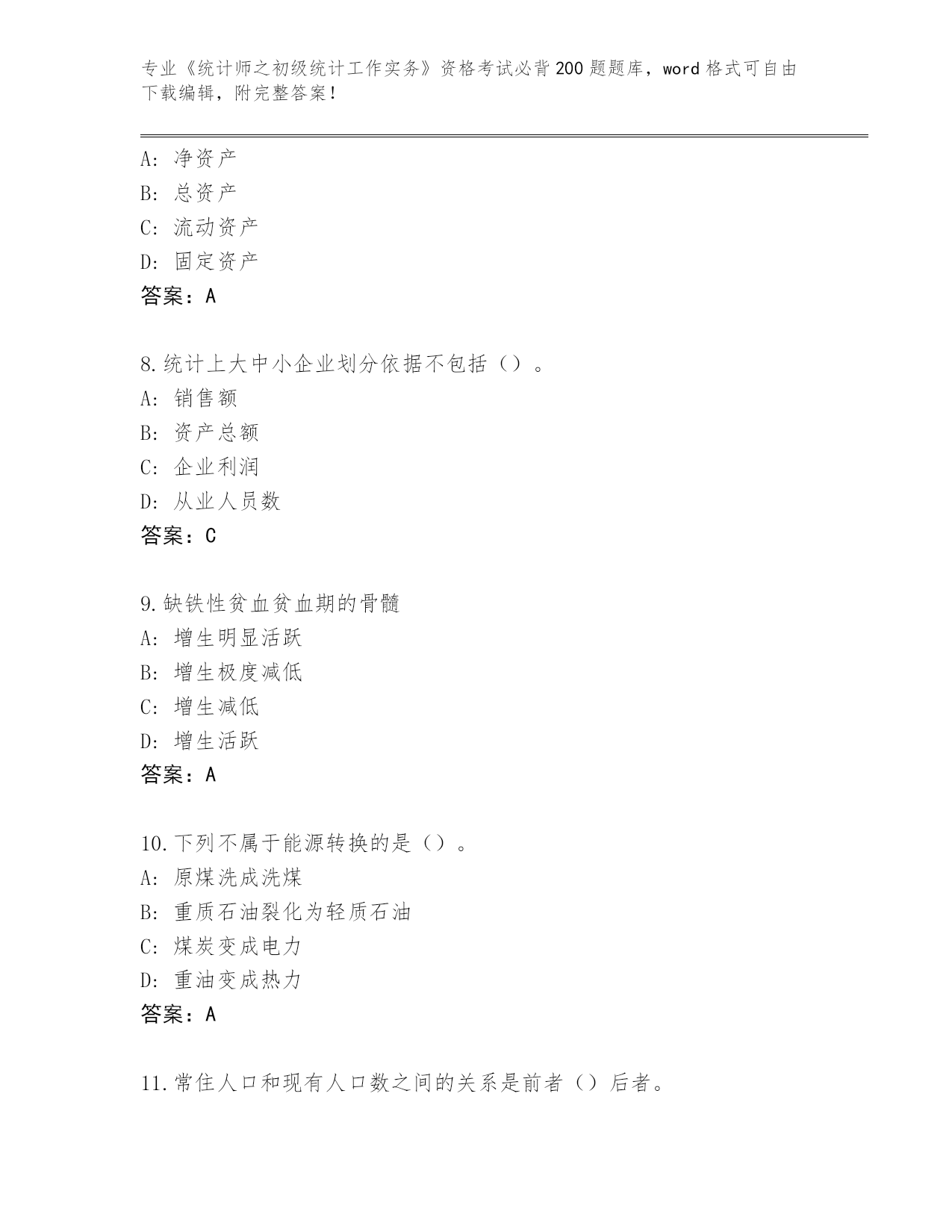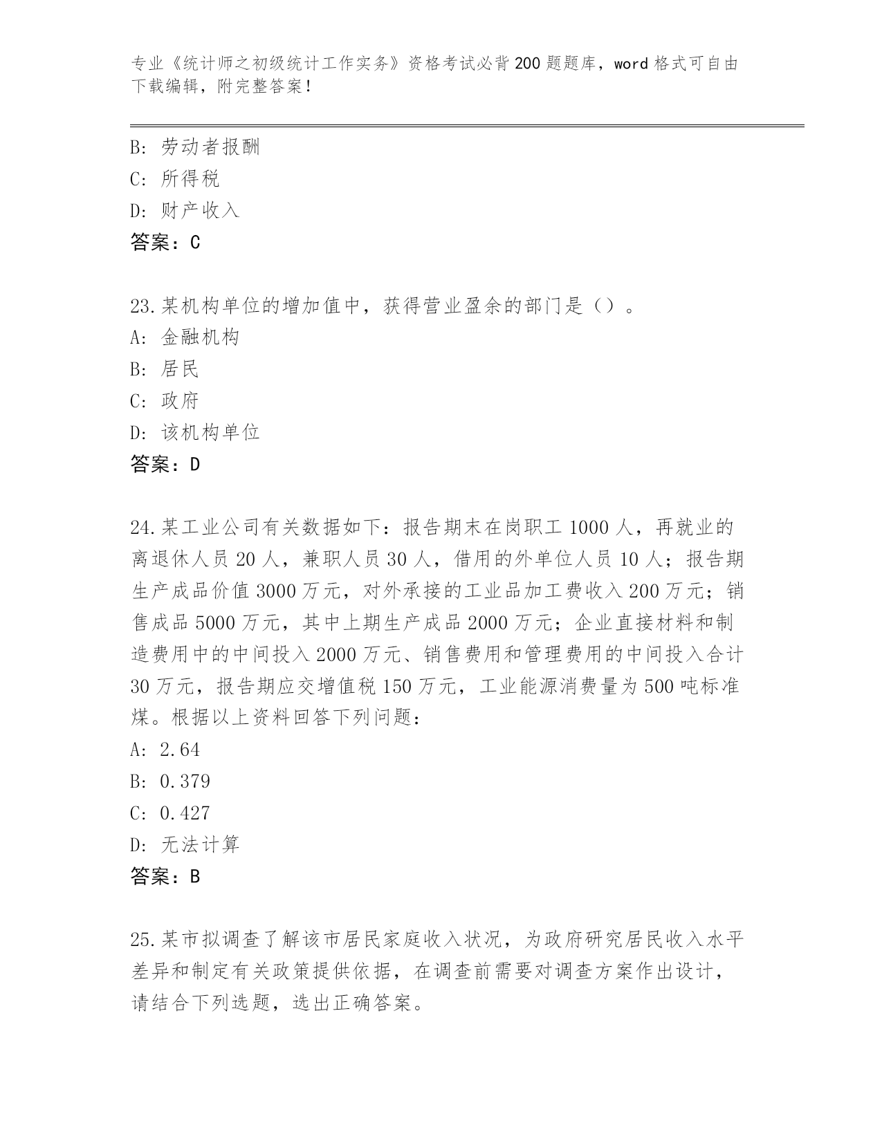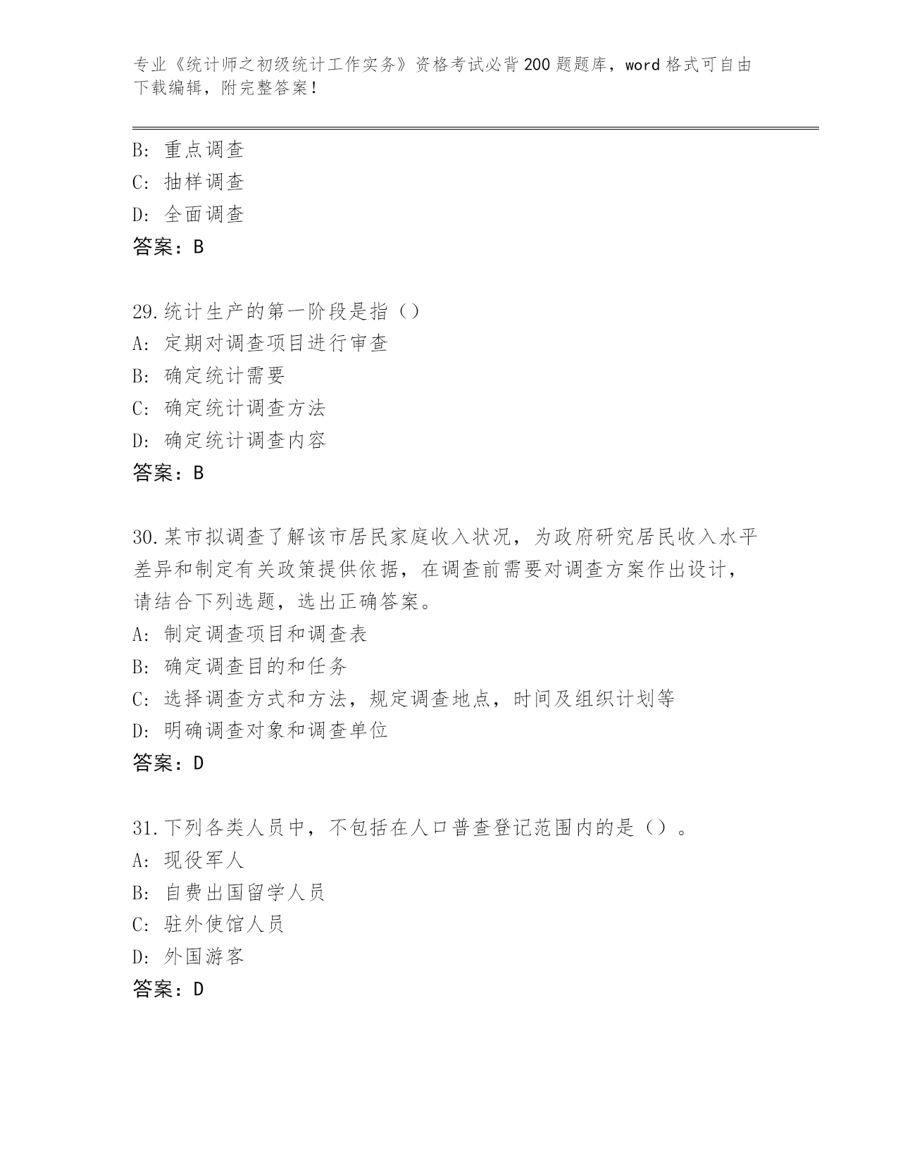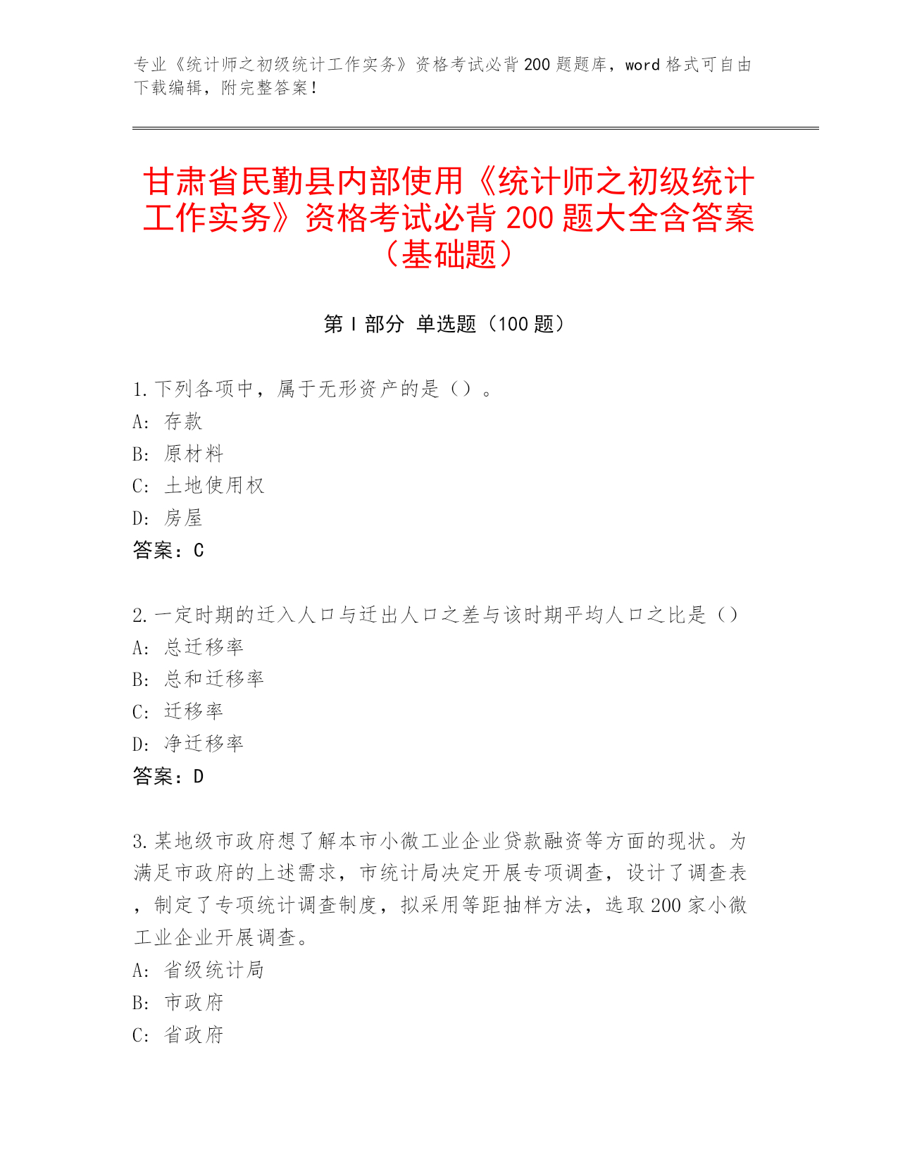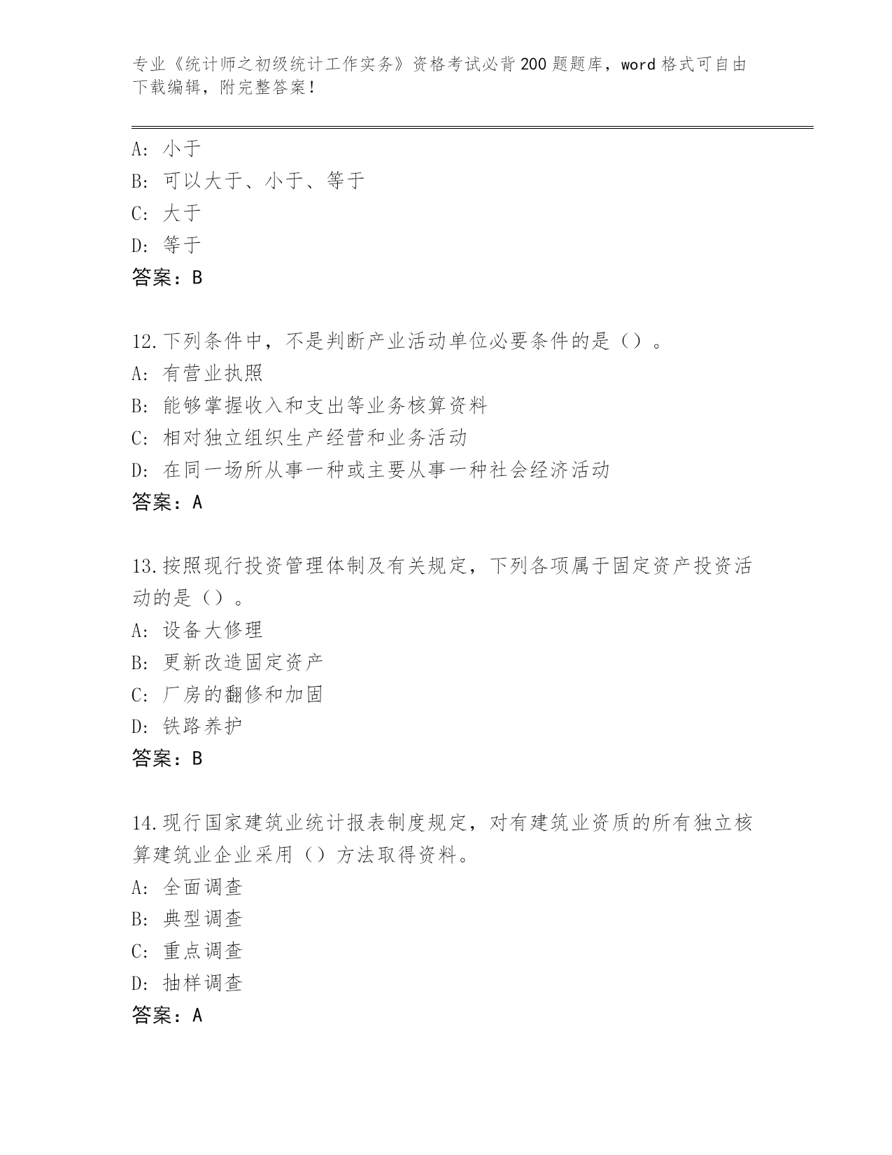 甘肃省民勤县内部使用《统计师之初级统计工作实务》资格考试必背200题大全含答案(基础题).docx