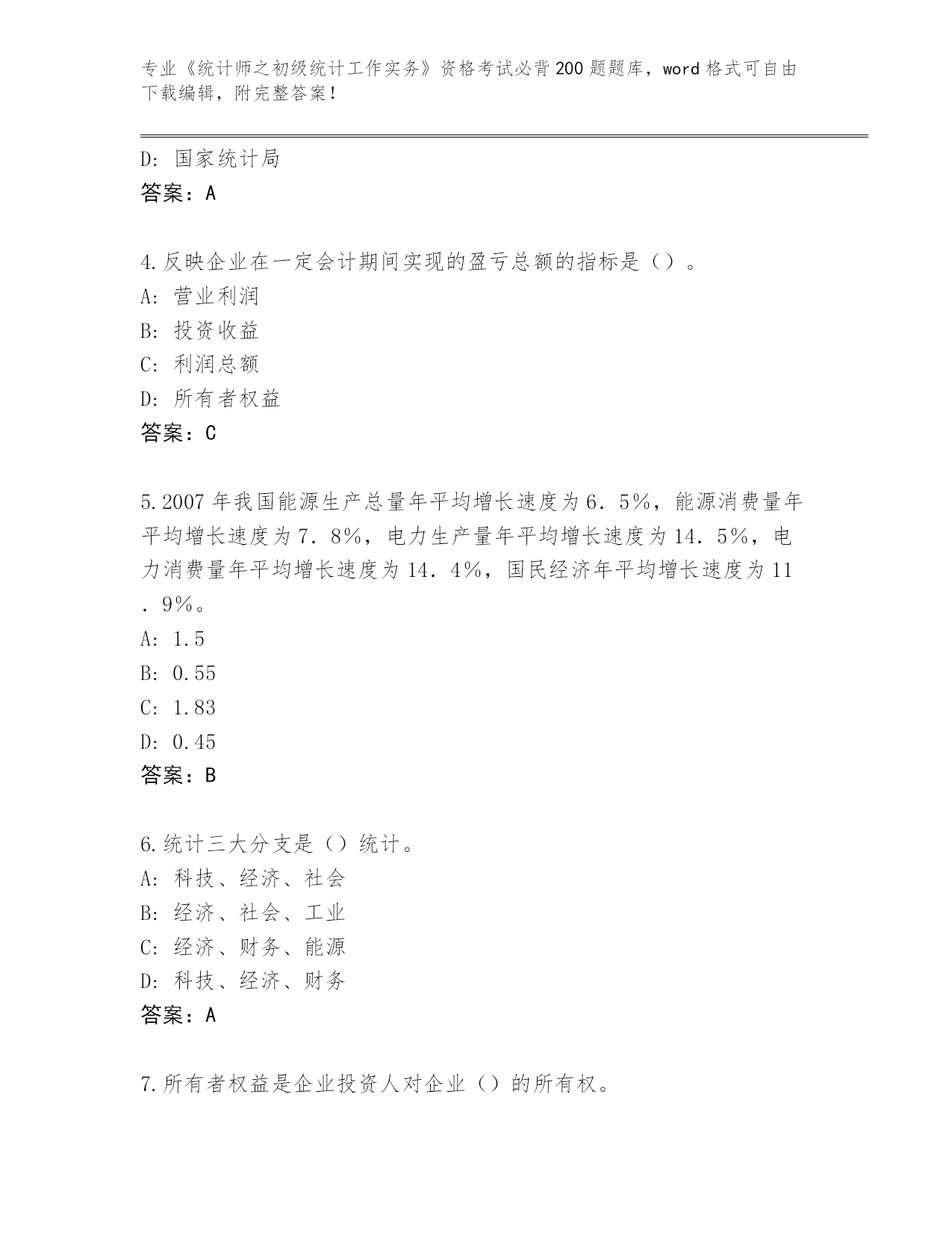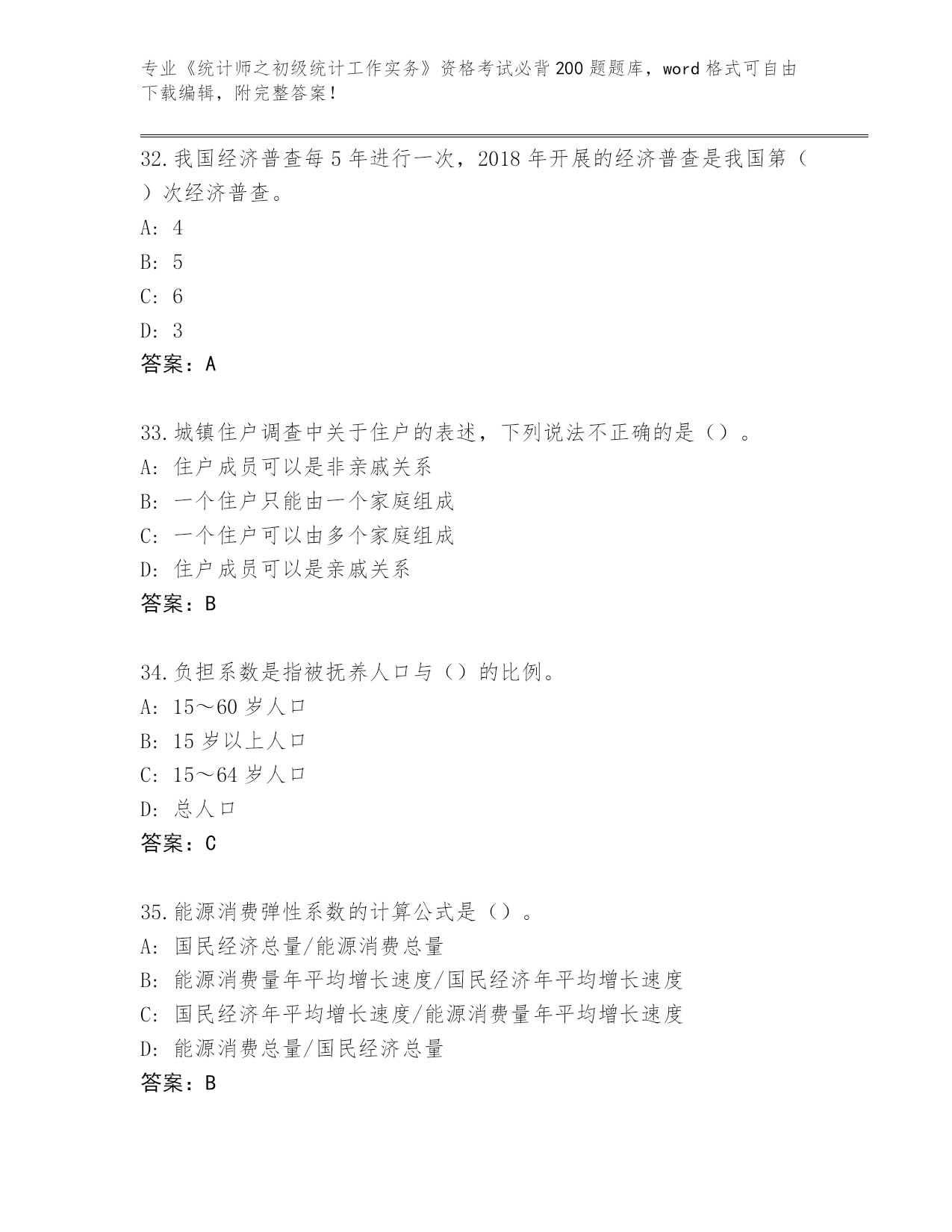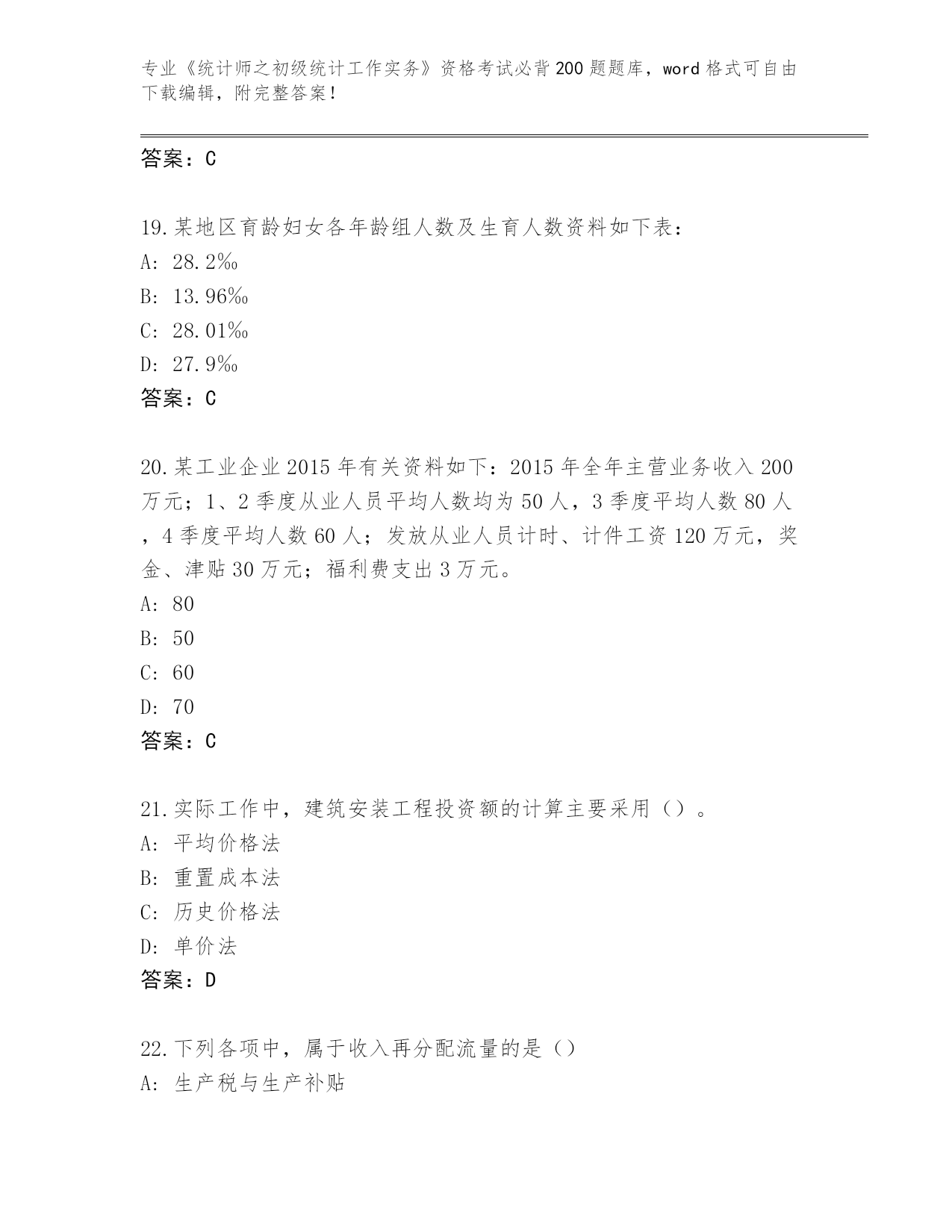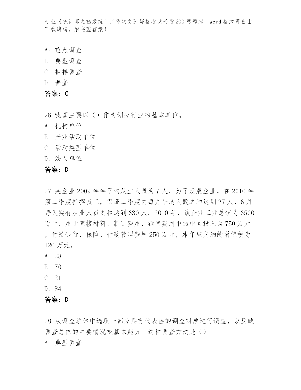 2024年安徽省泾县《统计师之初级统计工作实务》资格考试必背200题(必刷)